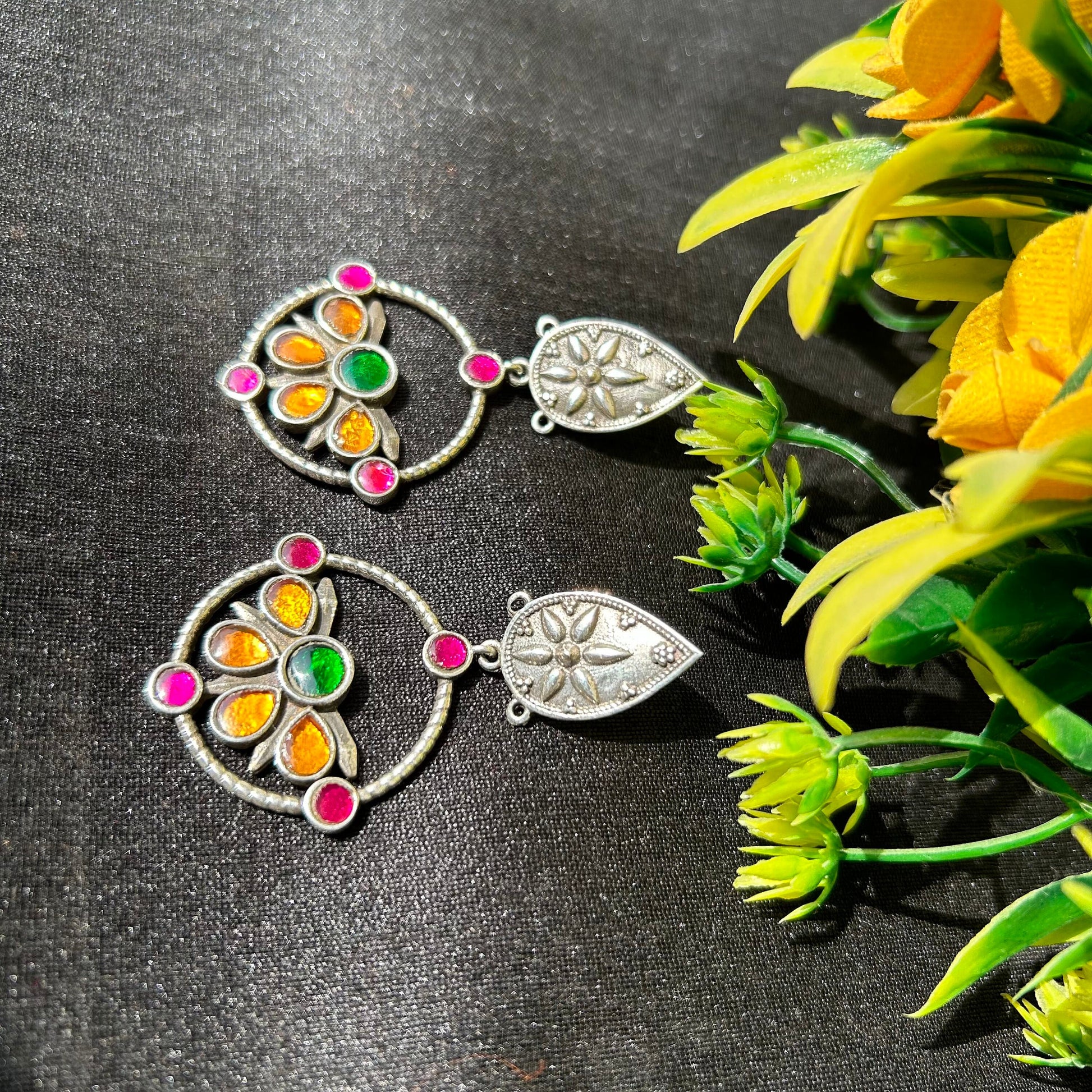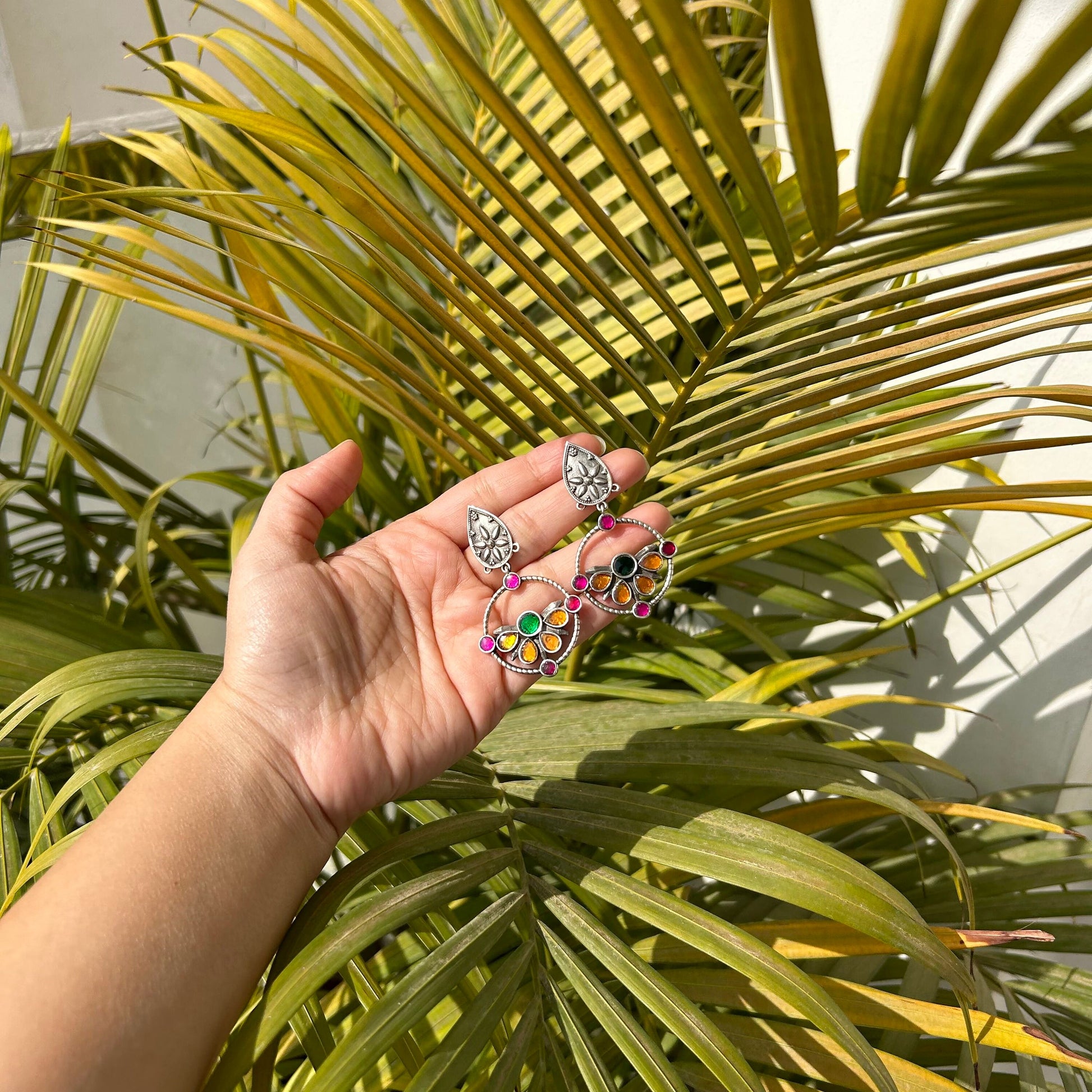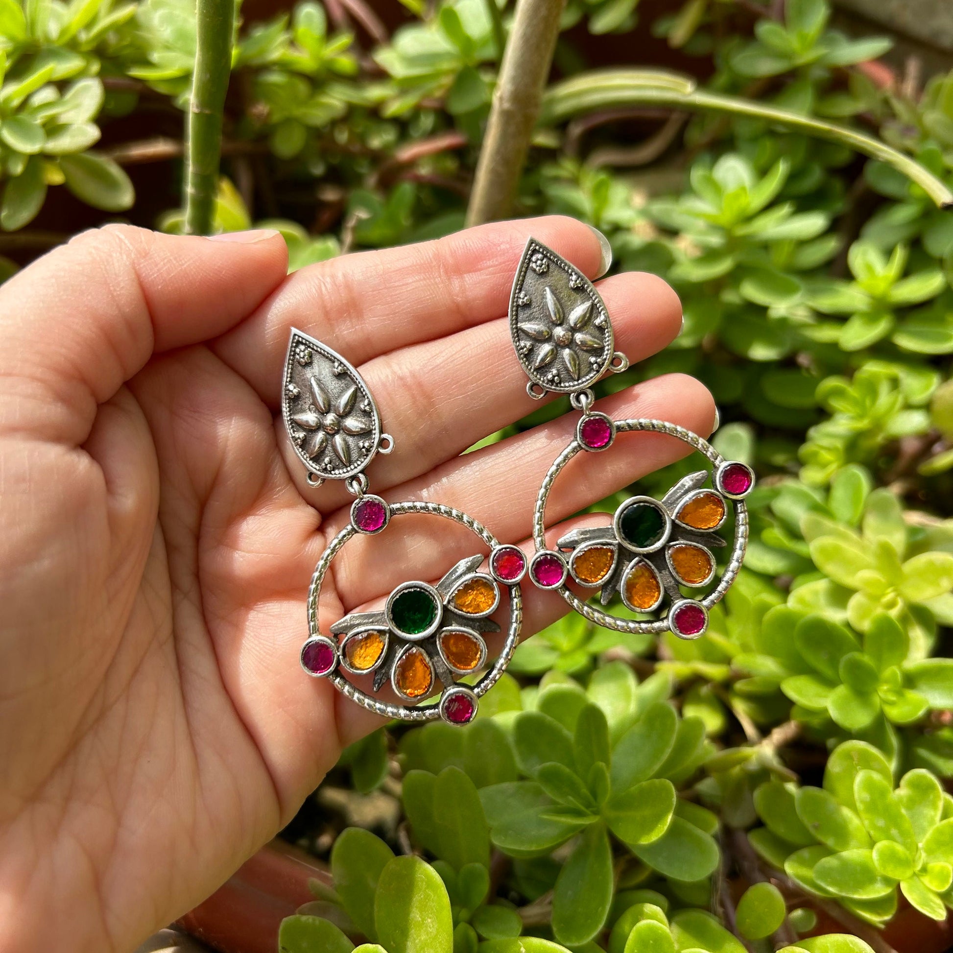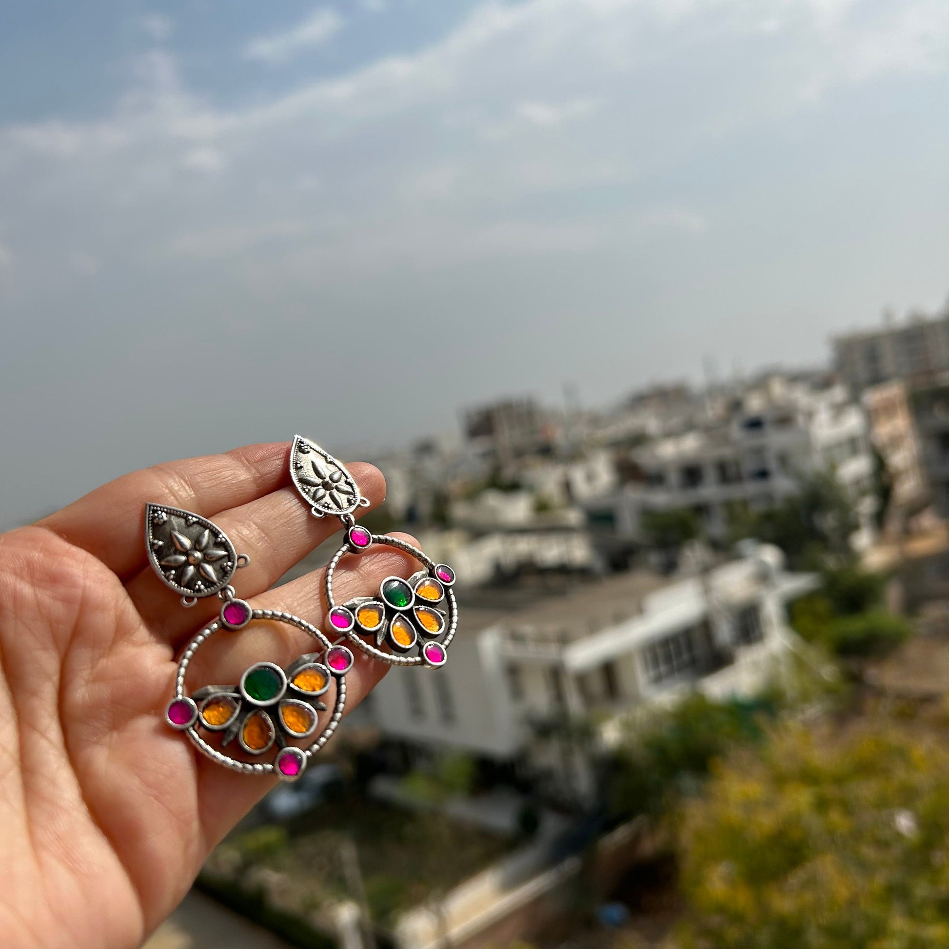 Embrace the grace of tradition with Sragvi, a pair of enchanting floral earrings adorned with vibrant, gem-like stones and a classic antique gold finish. Inspired by blooming garlands worn during celebrations, these earrings beautifully blend vivid colors, delicate petal designs, and timeless elegance.