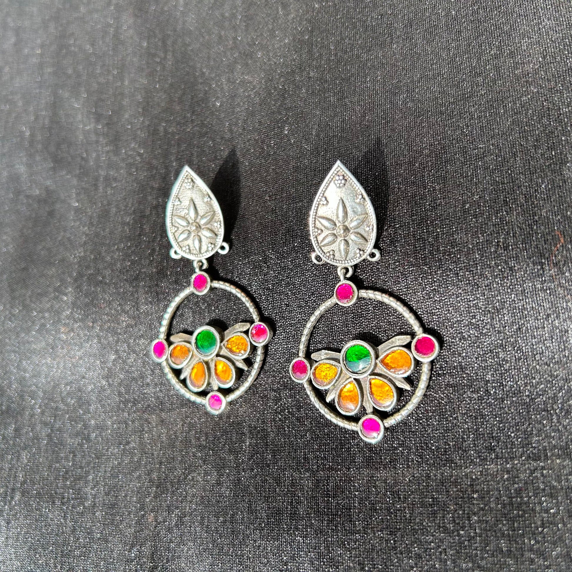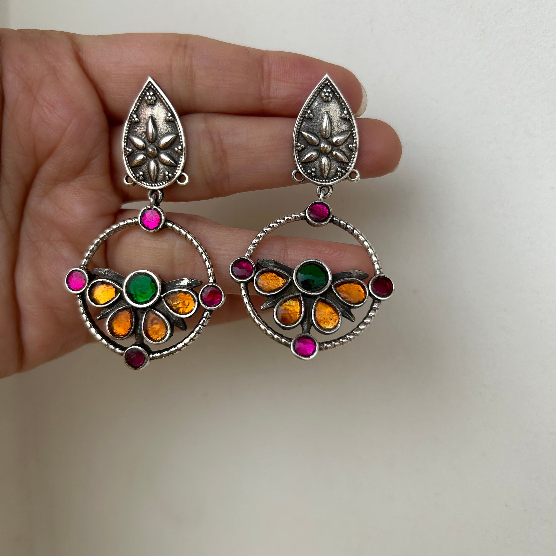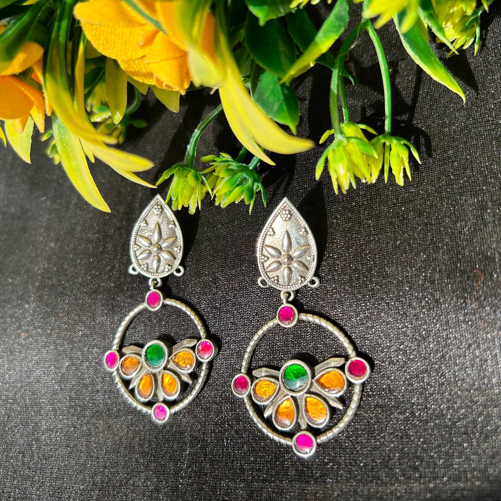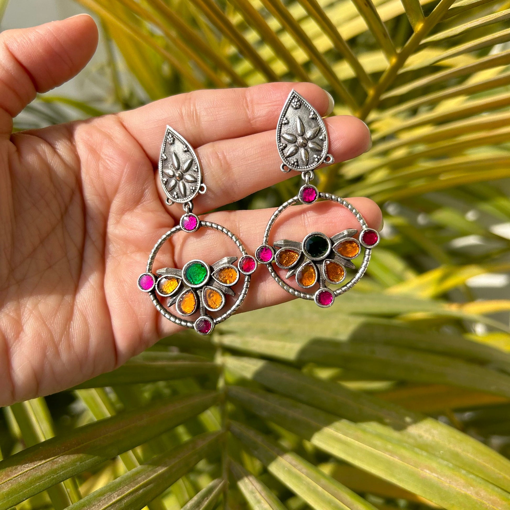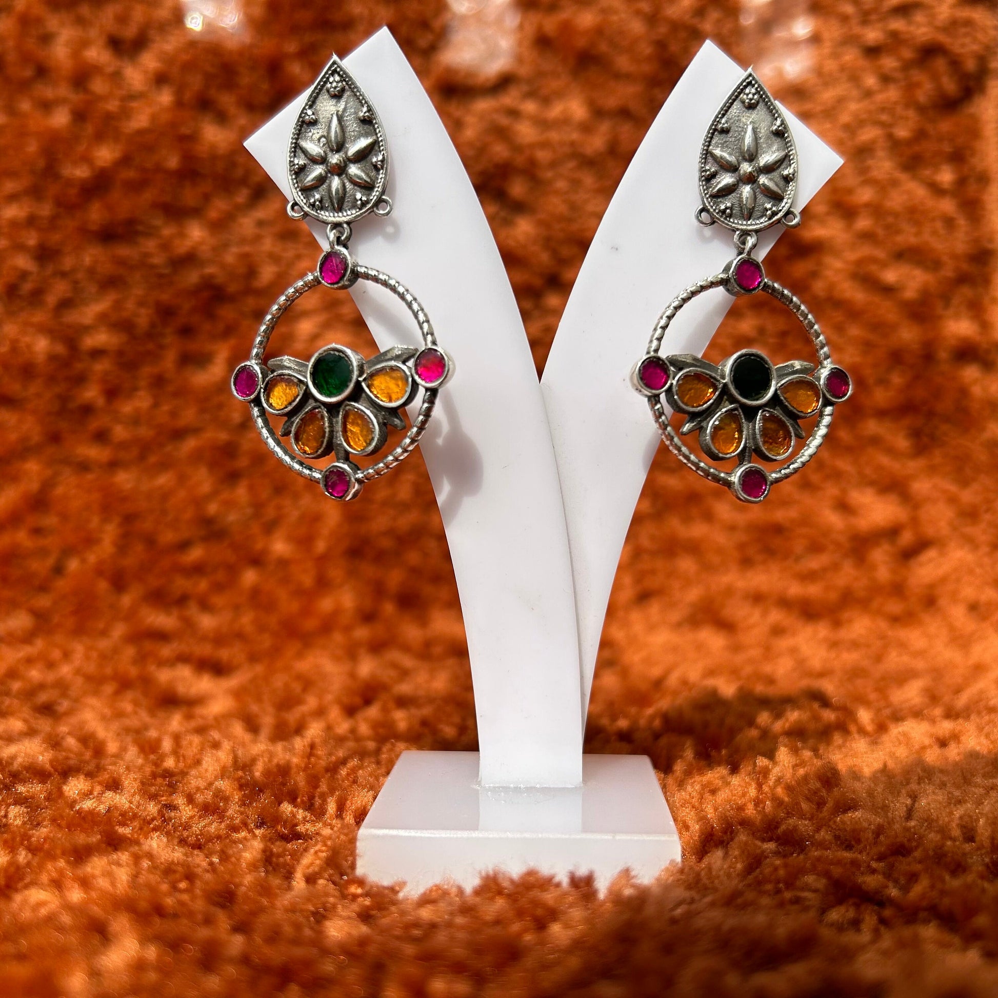 Embrace the grace of tradition with Sragvi, a pair of enchanting floral earrings adorned with vibrant, gem-like stones and a classic antique gold finish. Inspired by blooming garlands worn during celebrations, these earrings beautifully blend vivid colors, delicate petal designs, and timeless elegance.