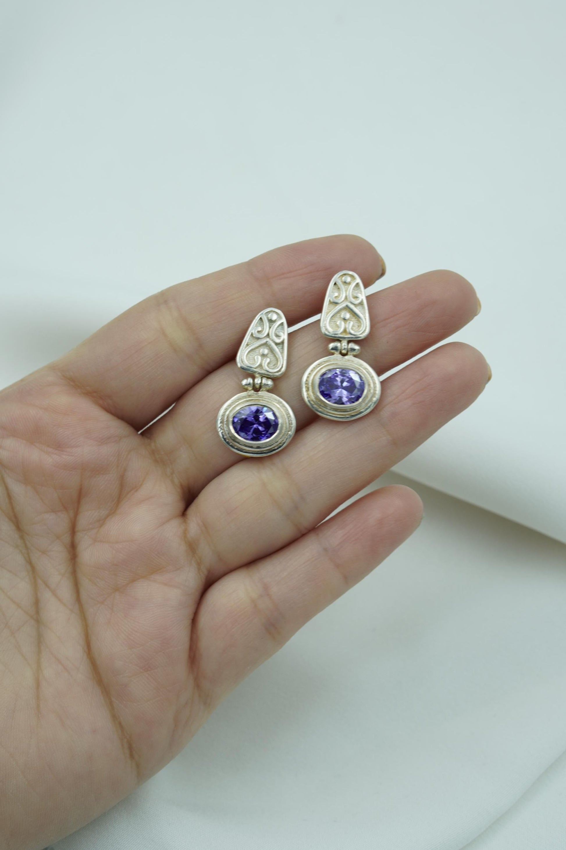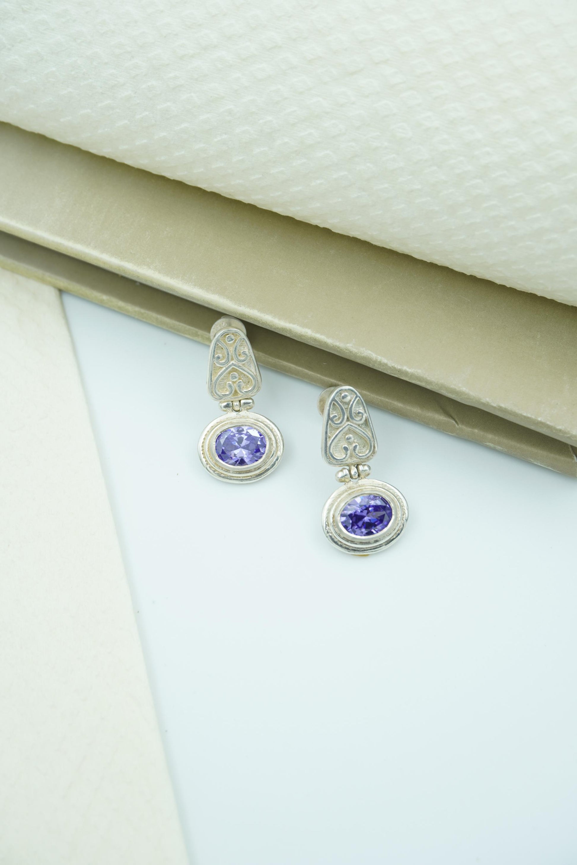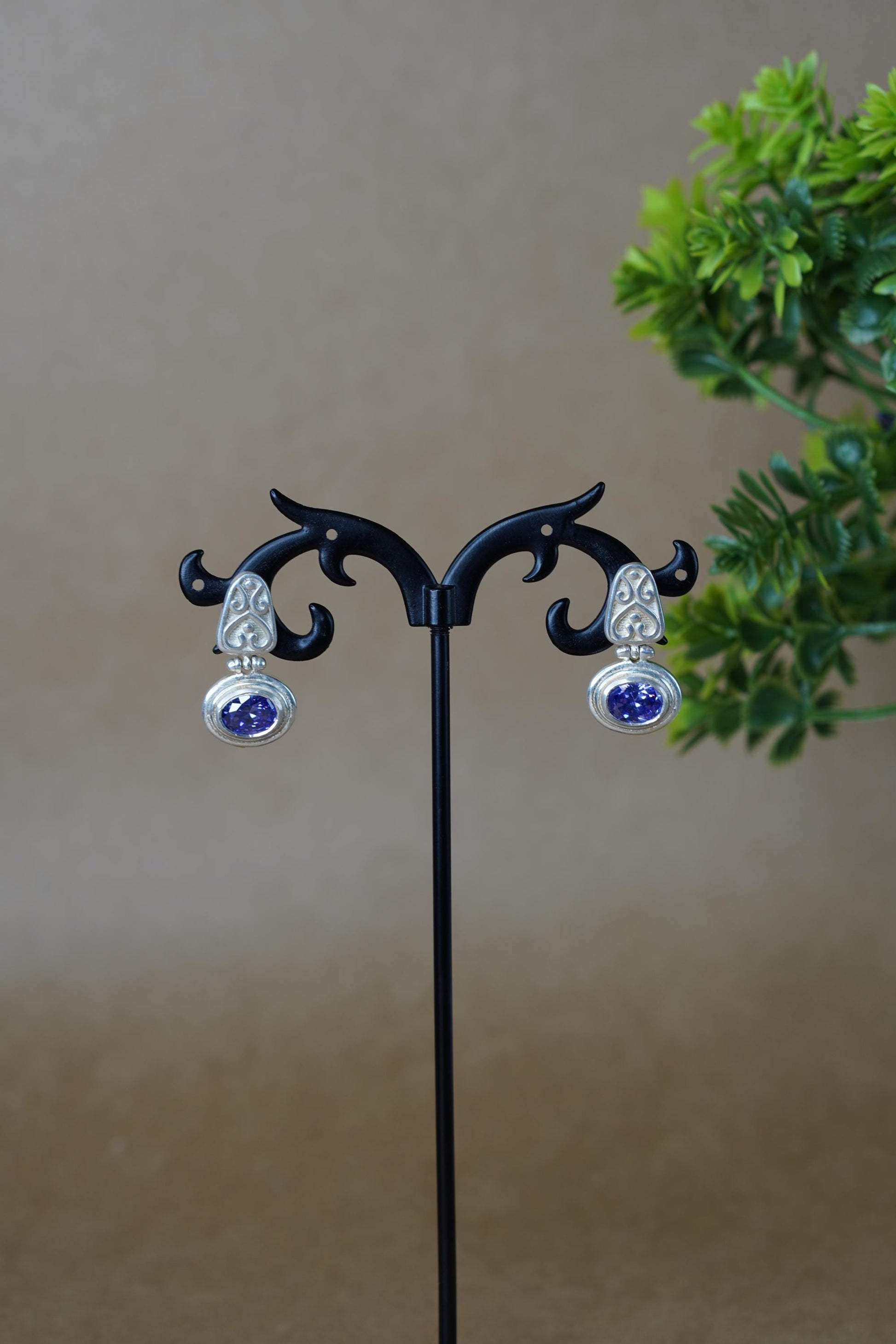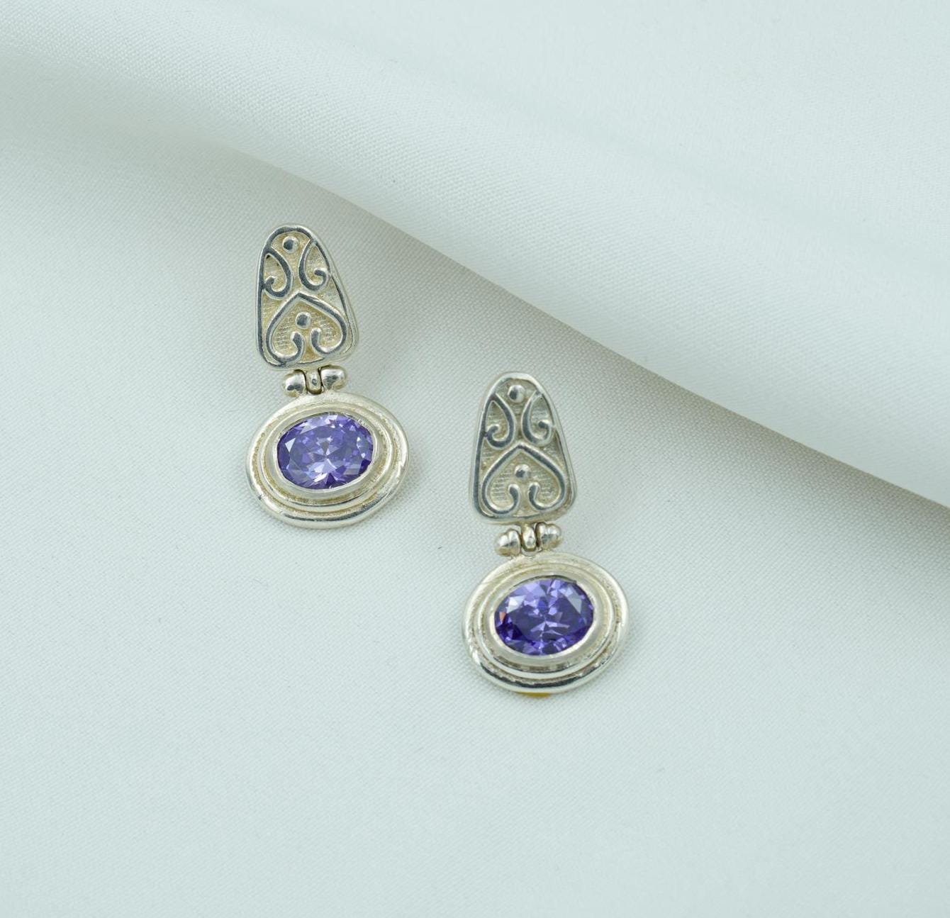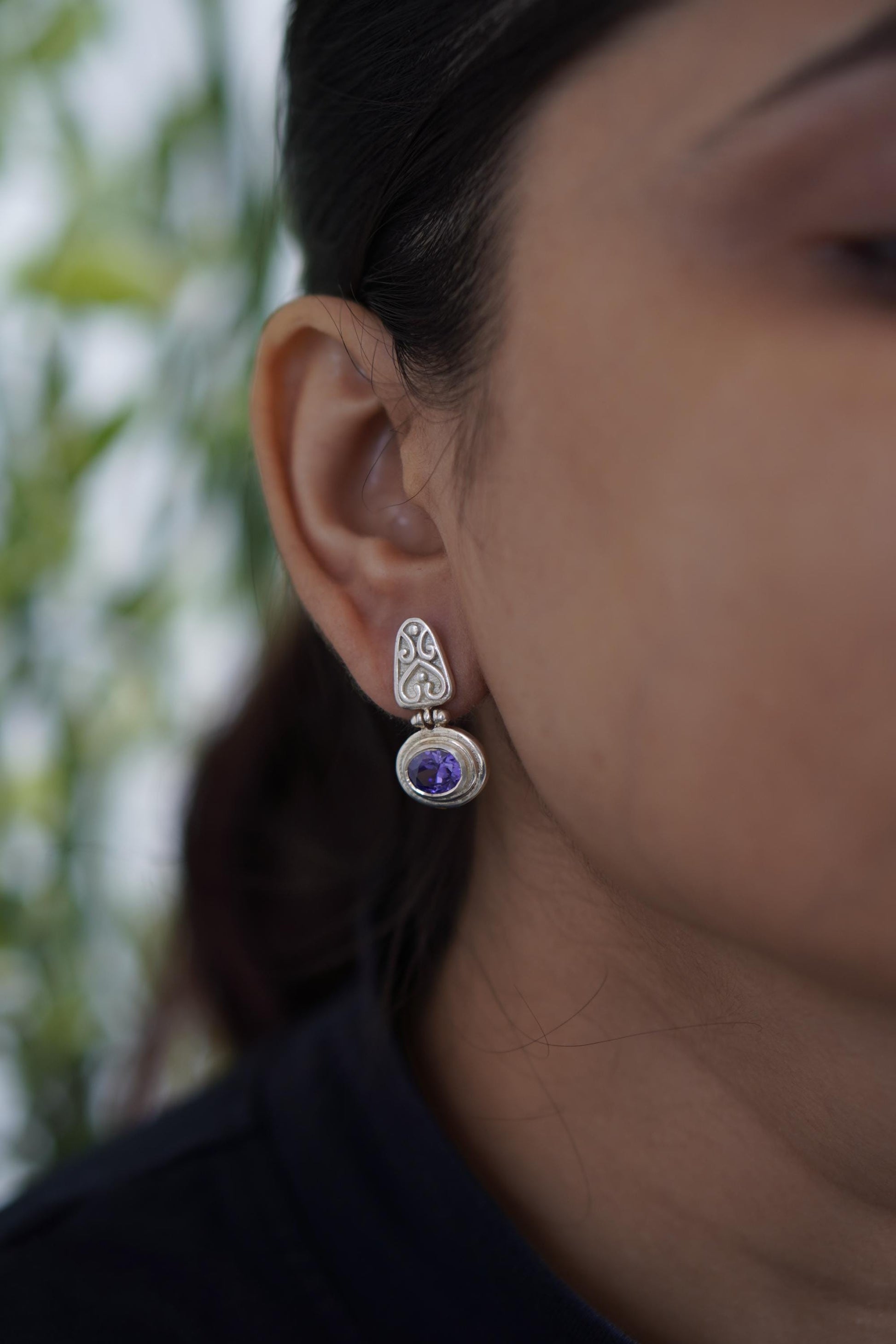 Elevate your elegance with Rati, a divine pair of earrings inspired by the grace and charm of the goddess of love. These handcrafted sterling silver earrings feature an intricately designed upper motif, paired with a radiant violet amethyst that captures light and attention alike. The rich purple gemstone symbolizes peace, wisdom, and spiritual strength qualities deeply associated with the essence of Rati.