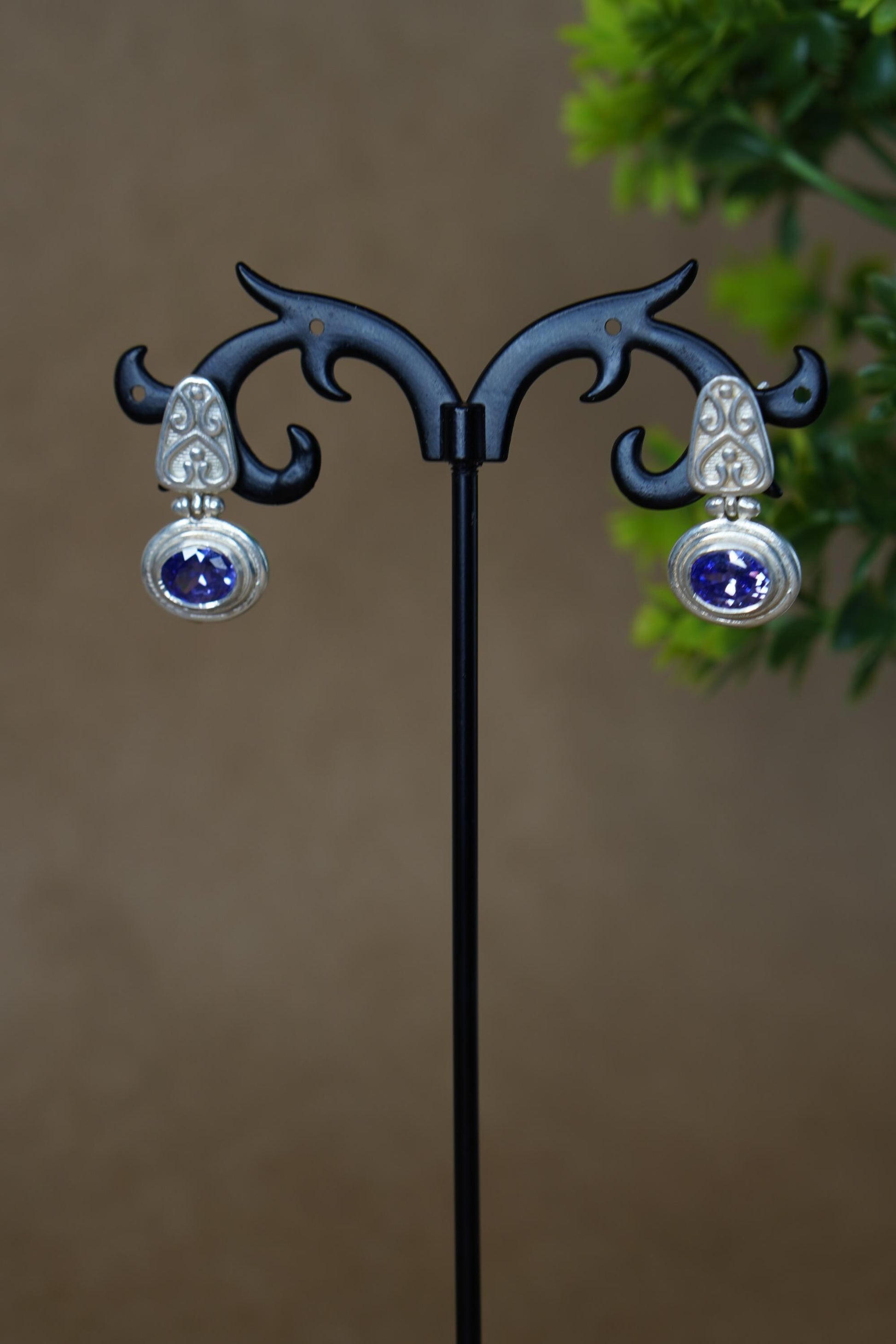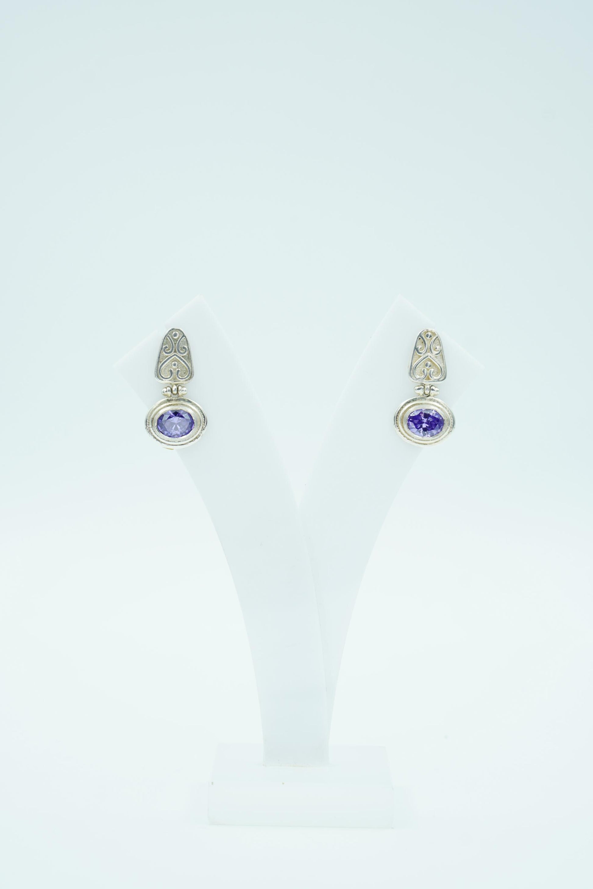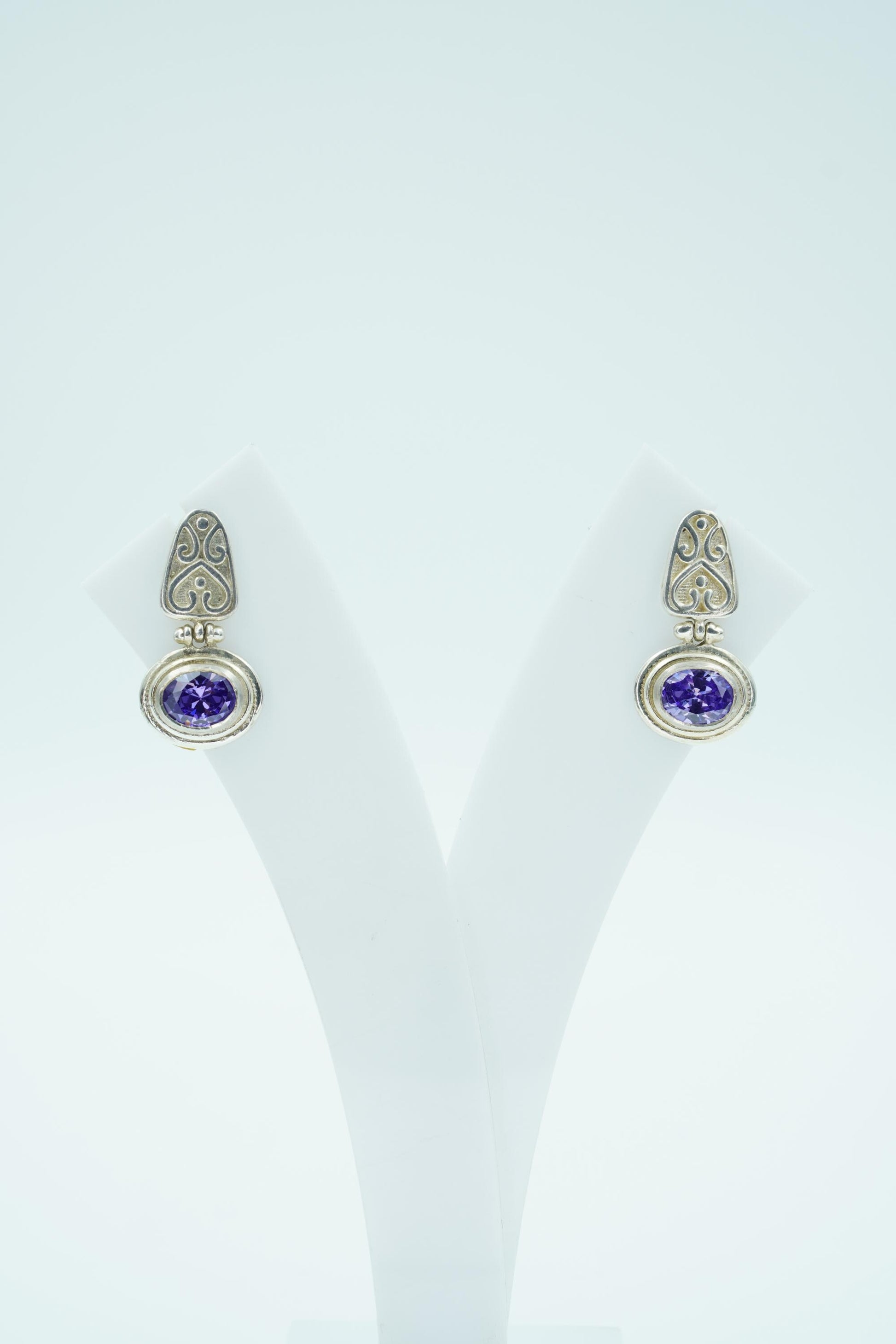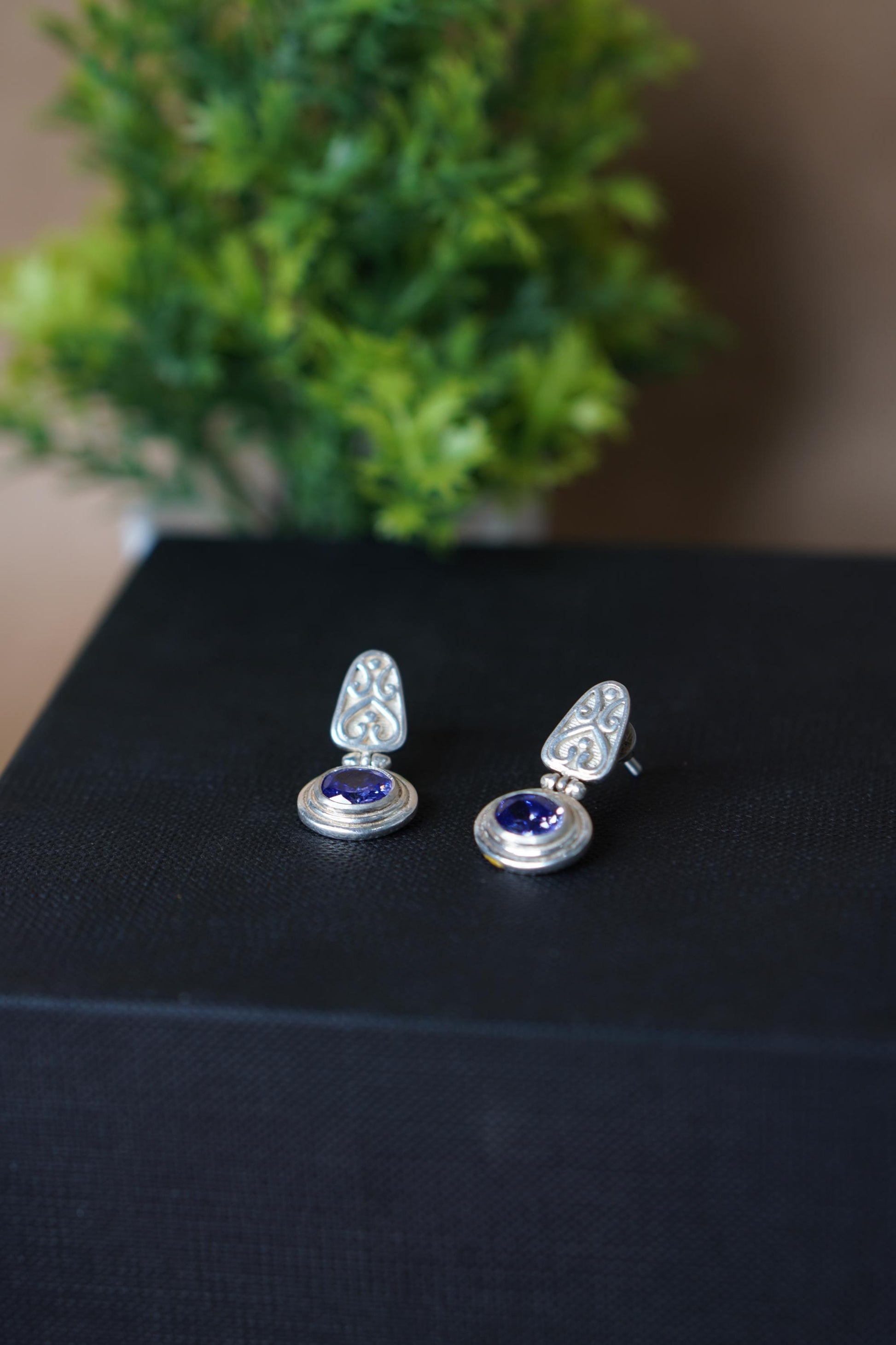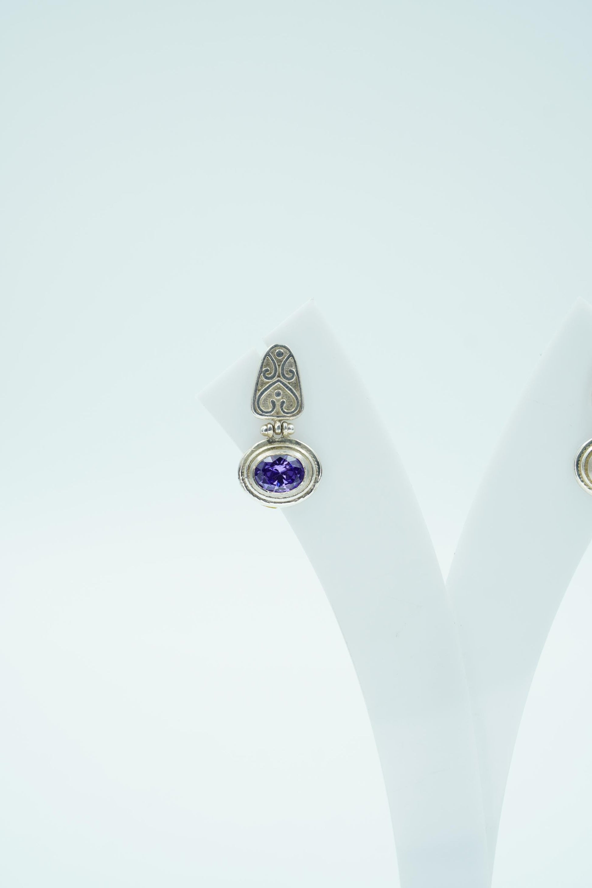 Elevate your elegance with Rati, a divine pair of earrings inspired by the grace and charm of the goddess of love. These handcrafted sterling silver earrings feature an intricately designed upper motif, paired with a radiant violet amethyst that captures light and attention alike. The rich purple gemstone symbolizes peace, wisdom, and spiritual strength qualities deeply associated with the essence of Rati.