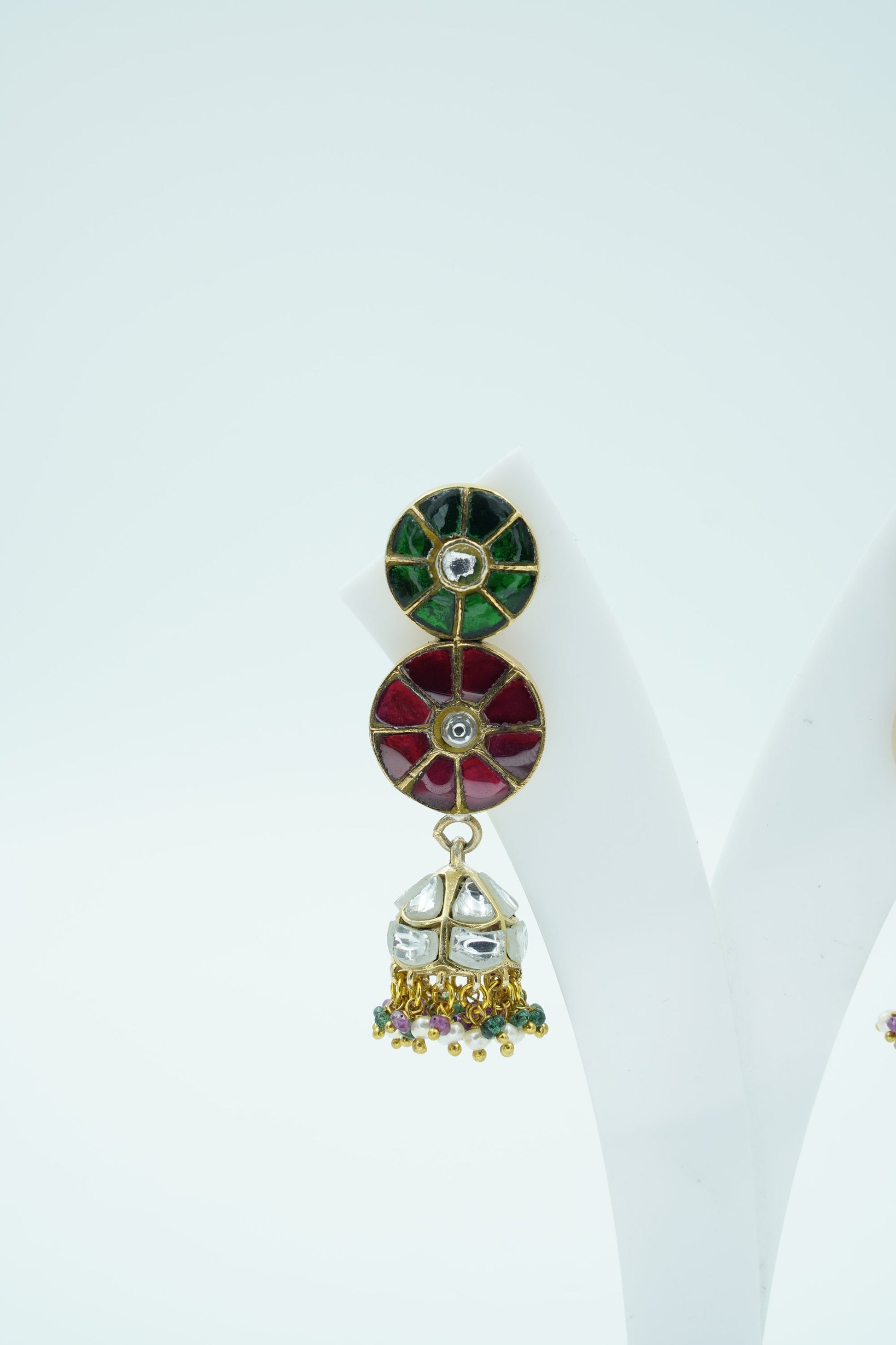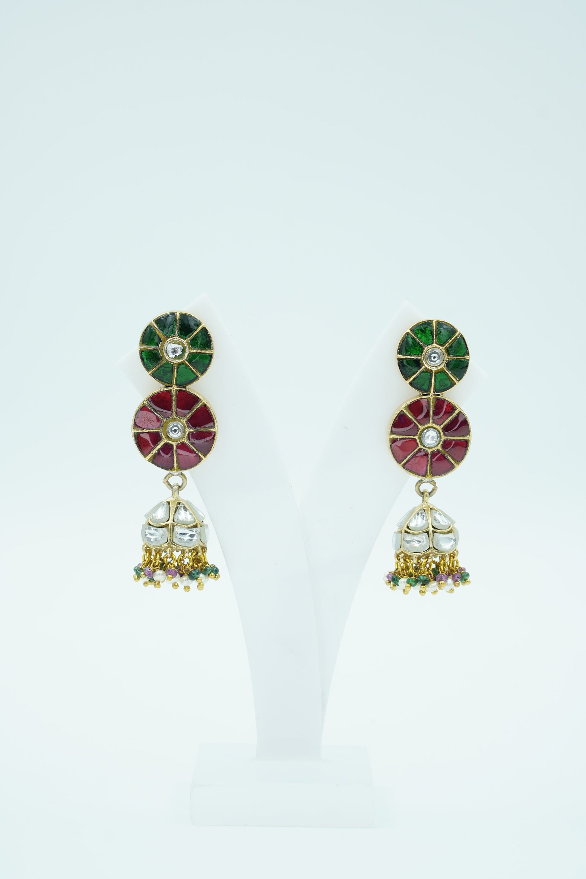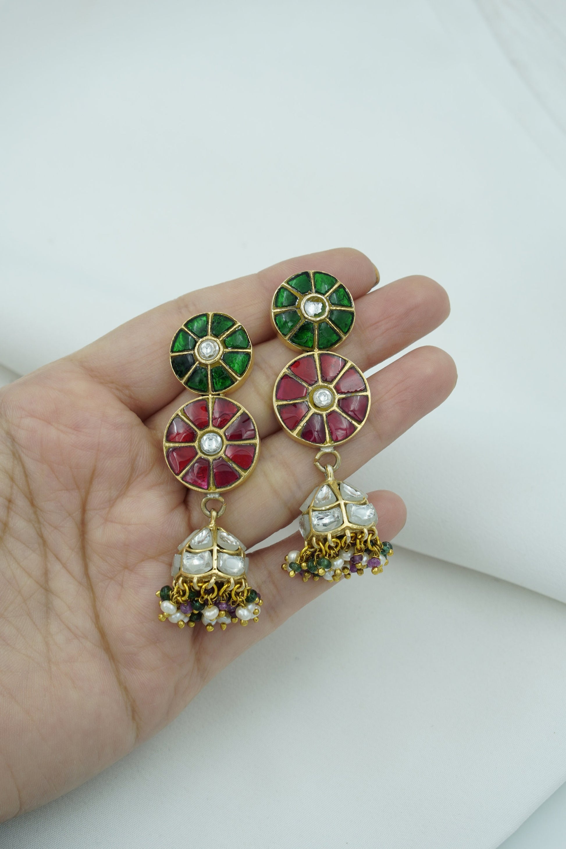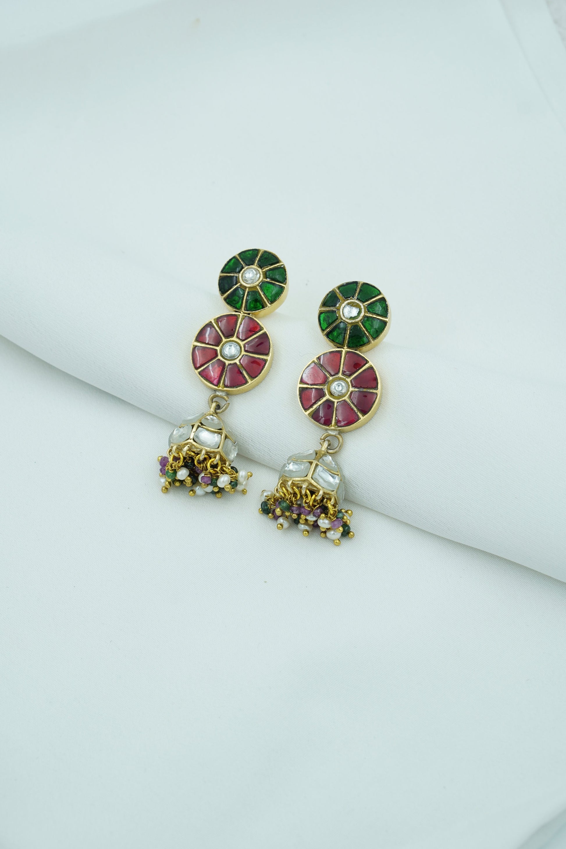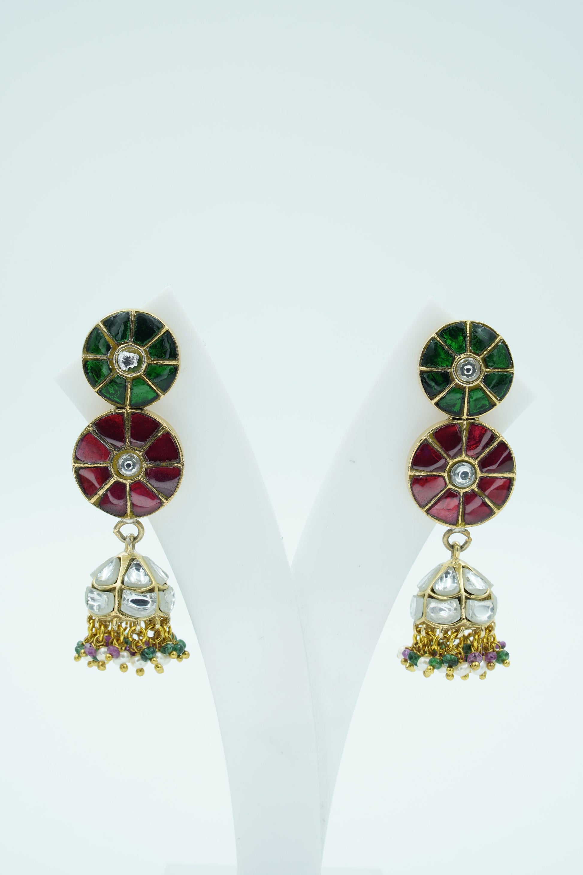 Celebrate color, culture, and craftsmanship with Raagdeep, a vibrant pair of jhumka earrings that dance with the elegance of classical rhythm. Featuring a double-disc design in rich green and red stonework with mirror-polished kundan at the center, the look gracefully transitions into silver-domed jhumkis adorned with multicolor bead tassels.