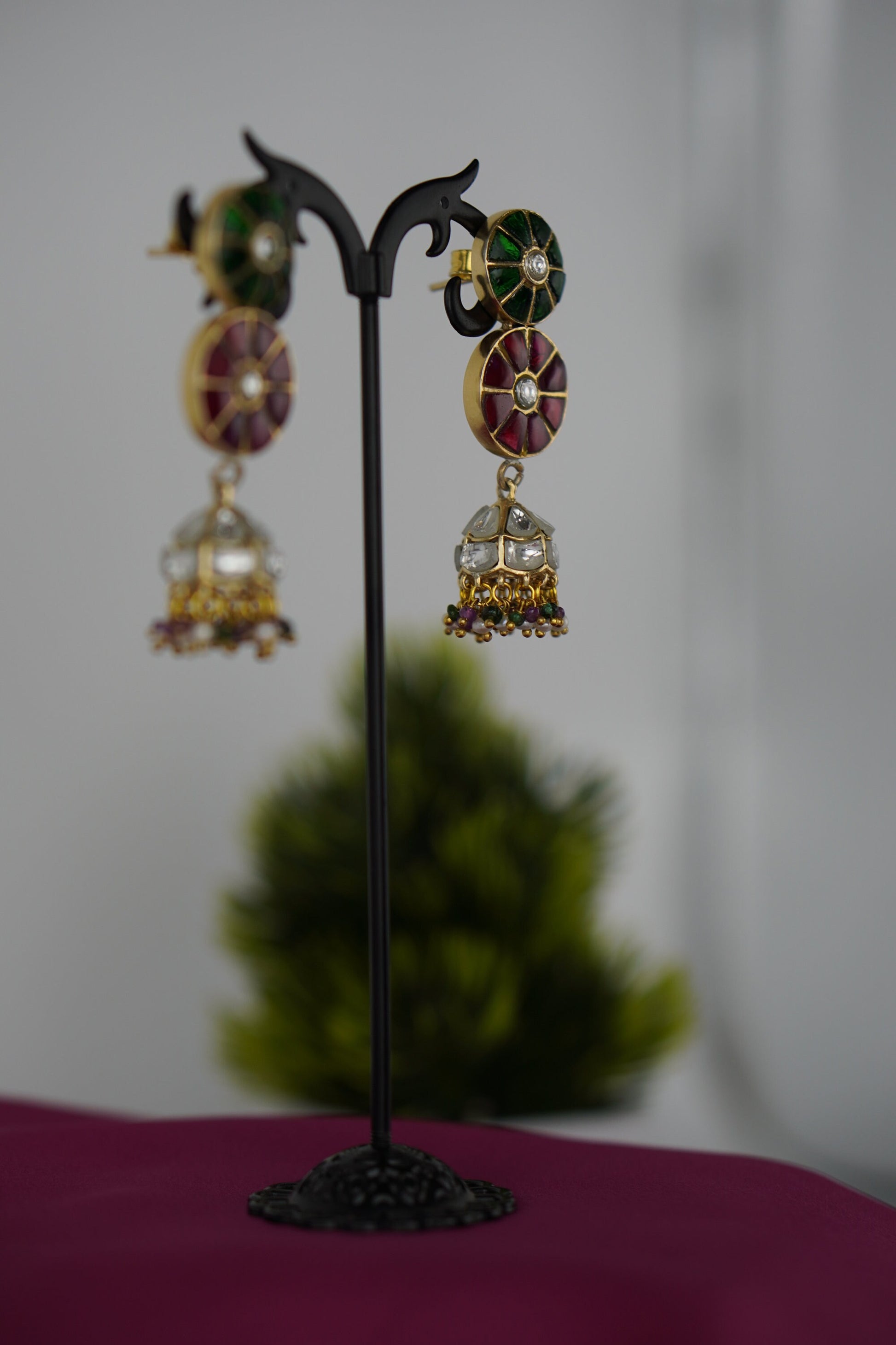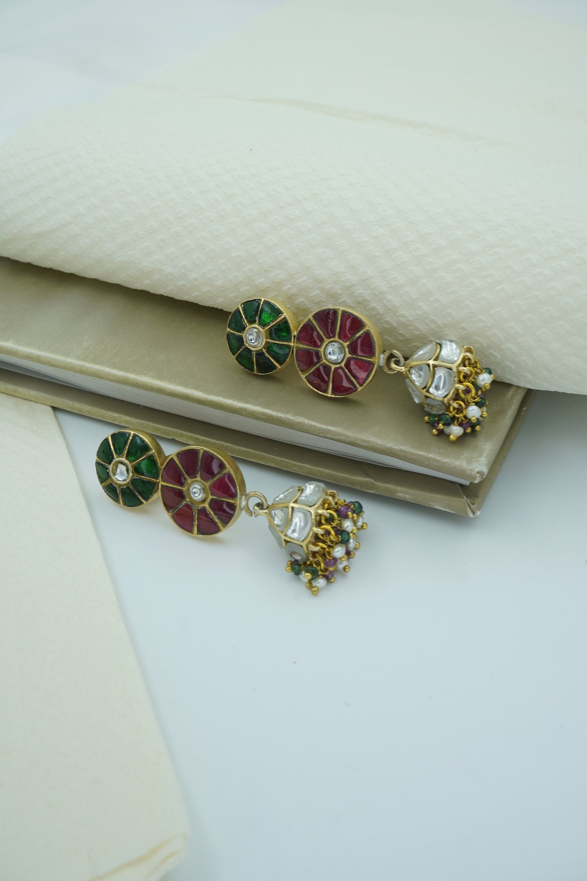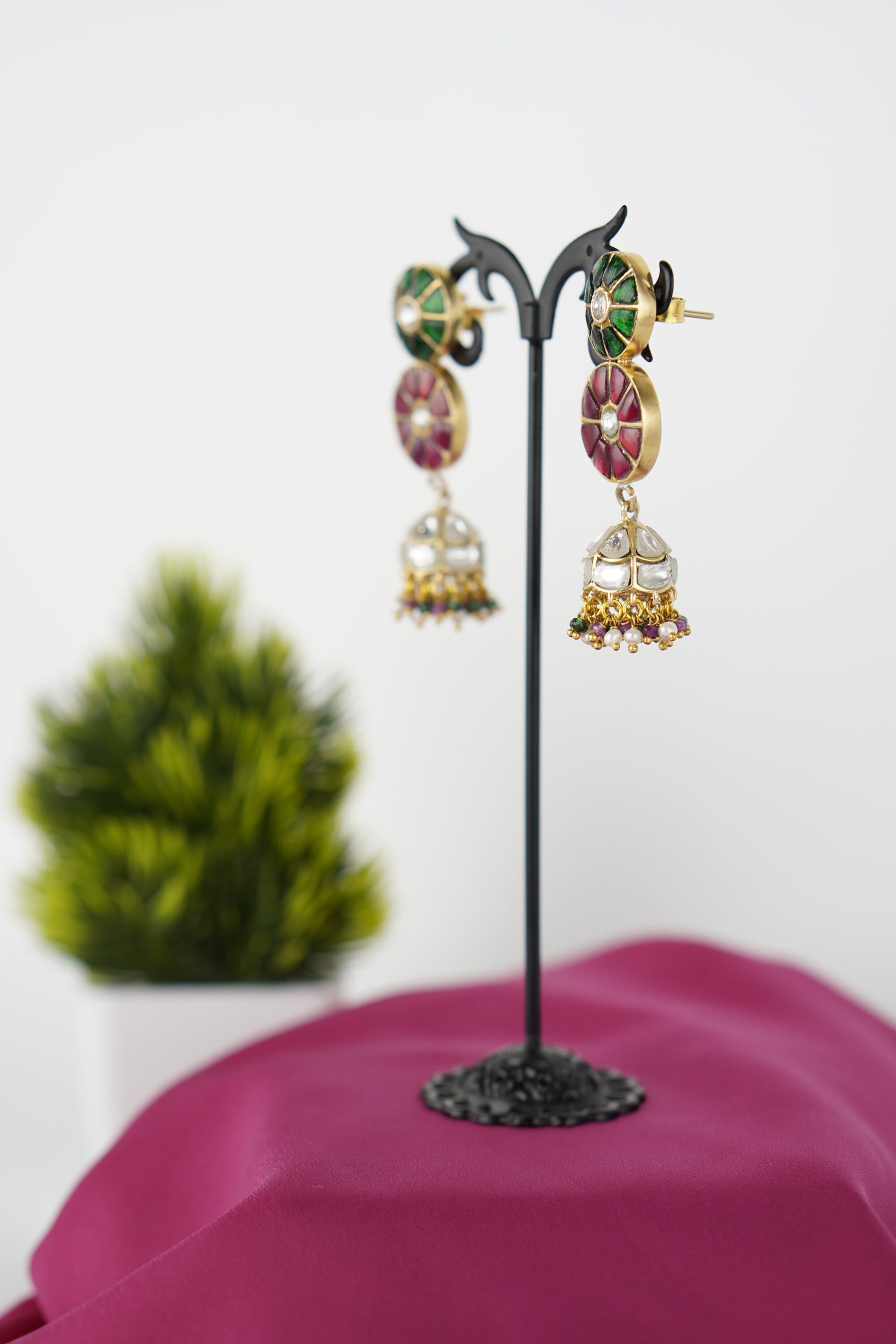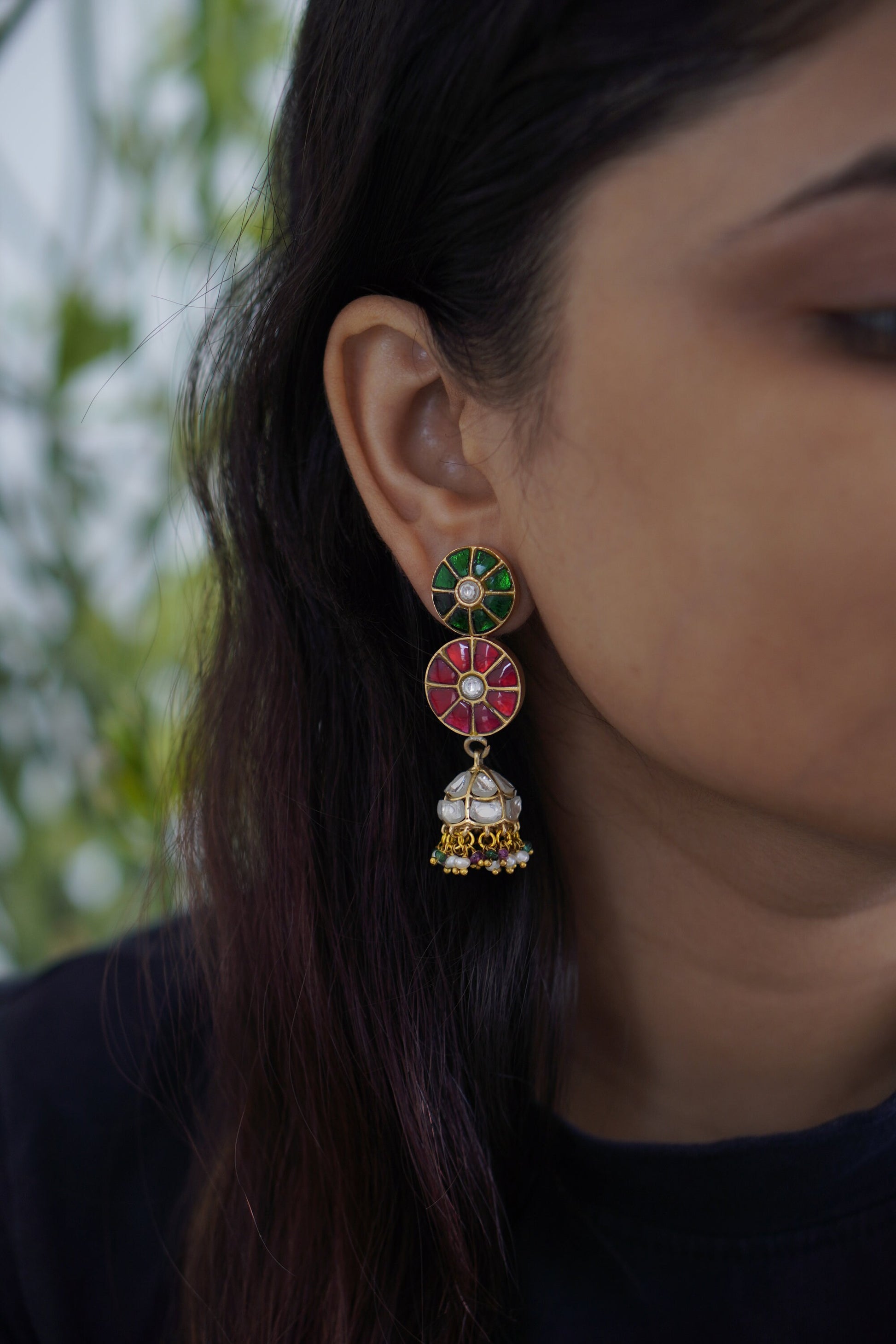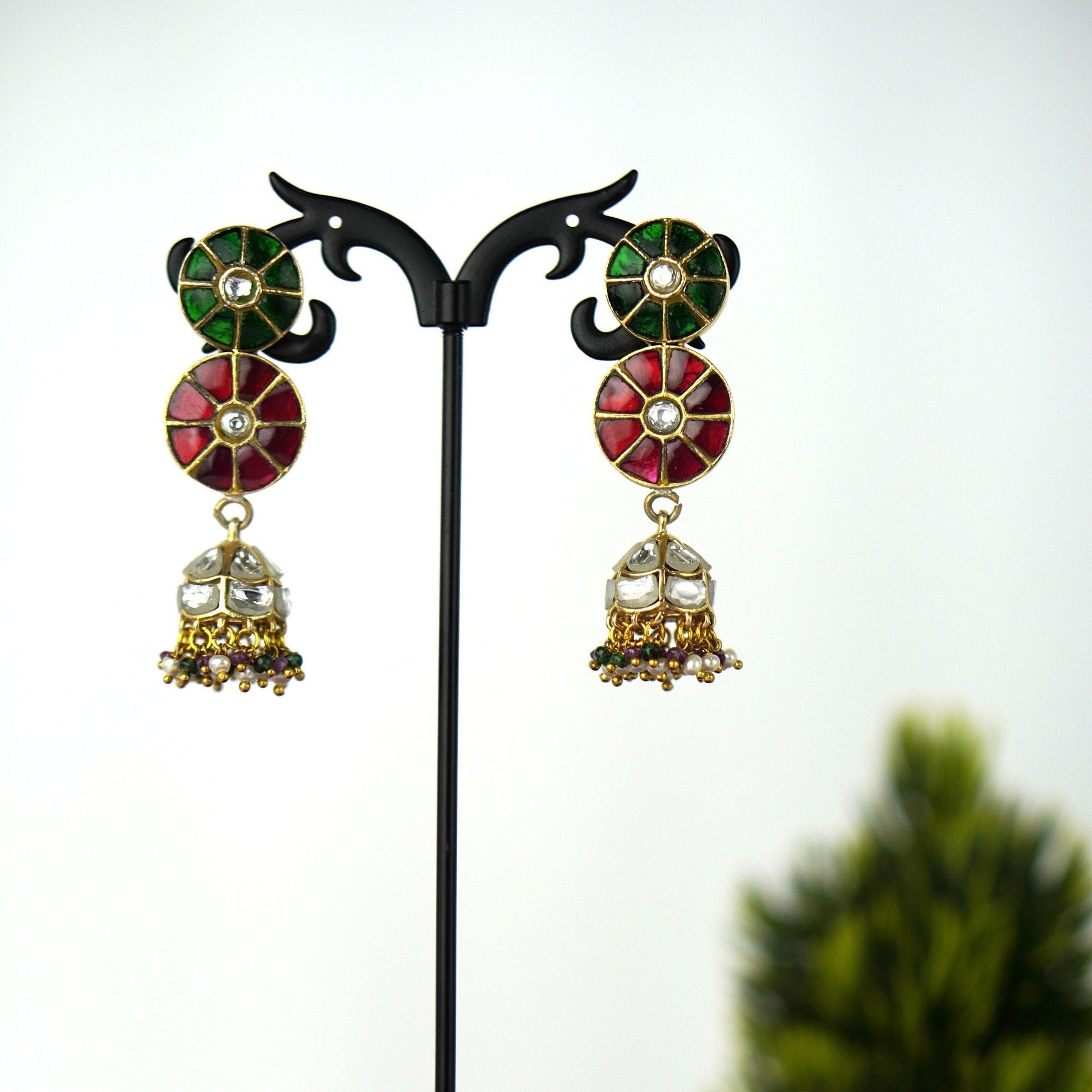 Celebrate color, culture, and craftsmanship with Raagdeep, a vibrant pair of jhumka earrings that dance with the elegance of classical rhythm. Featuring a double-disc design in rich green and red stonework with mirror-polished kundan at the center, the look gracefully transitions into silver-domed jhumkis adorned with multicolor bead tassels.
