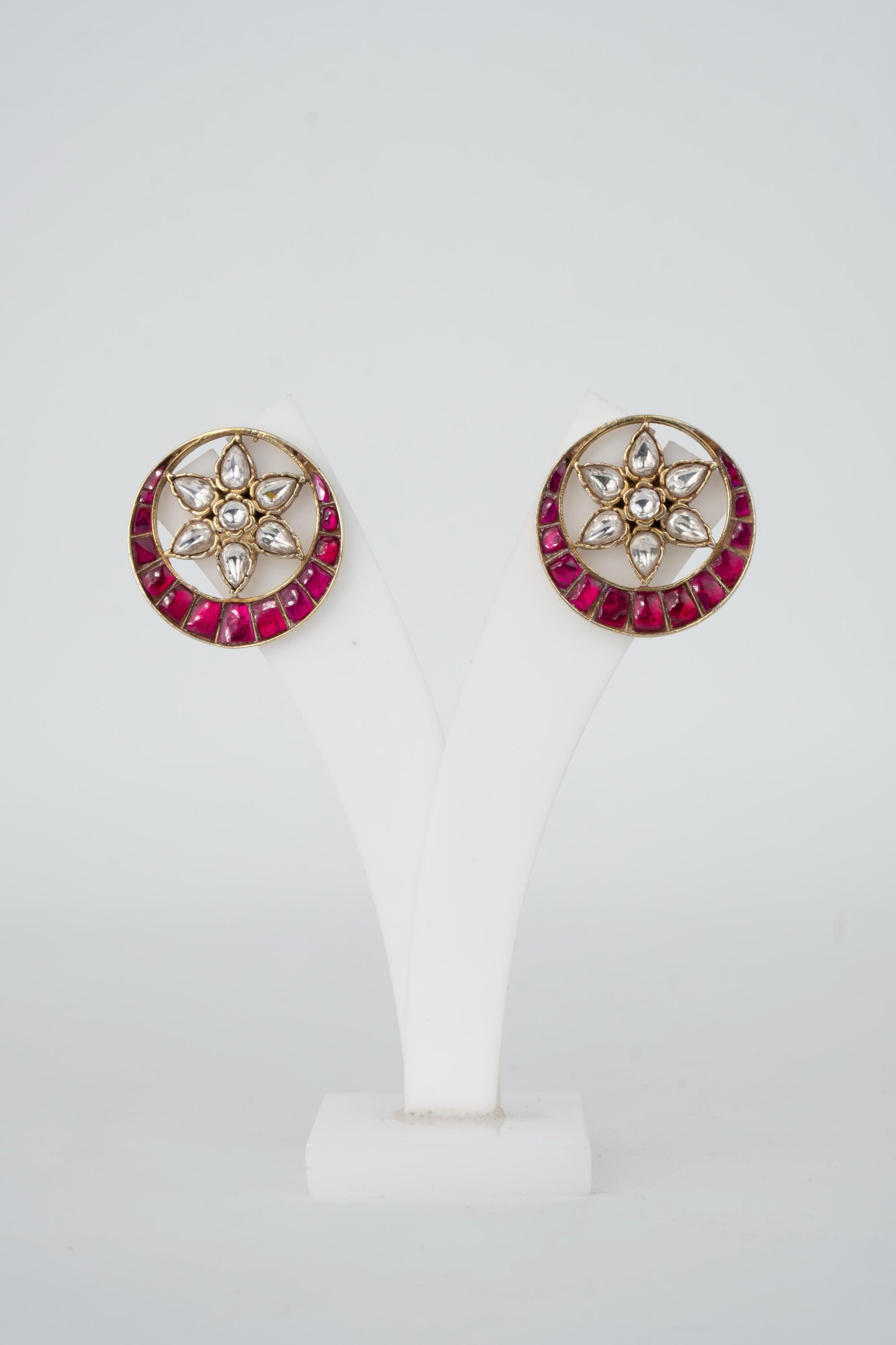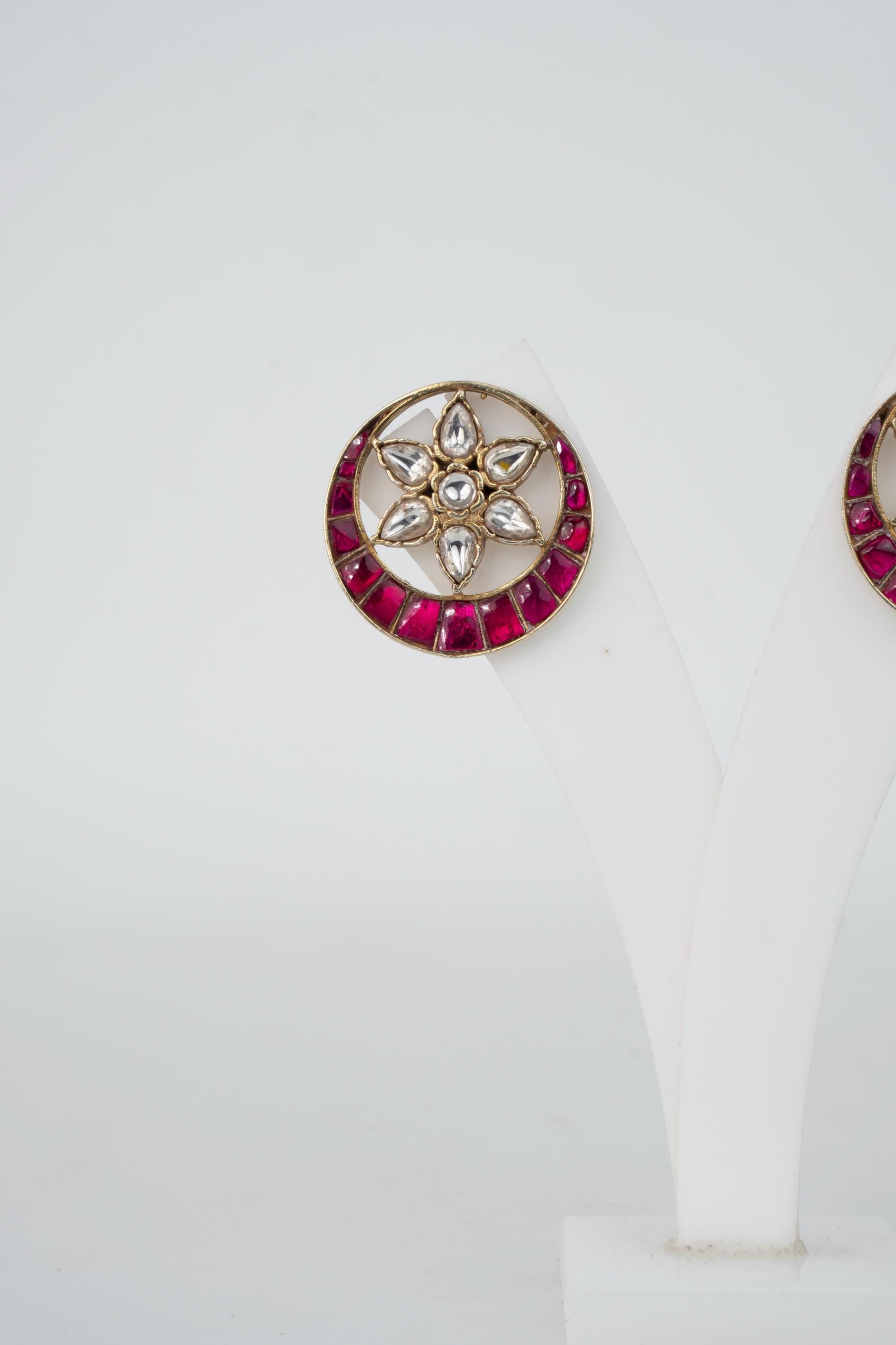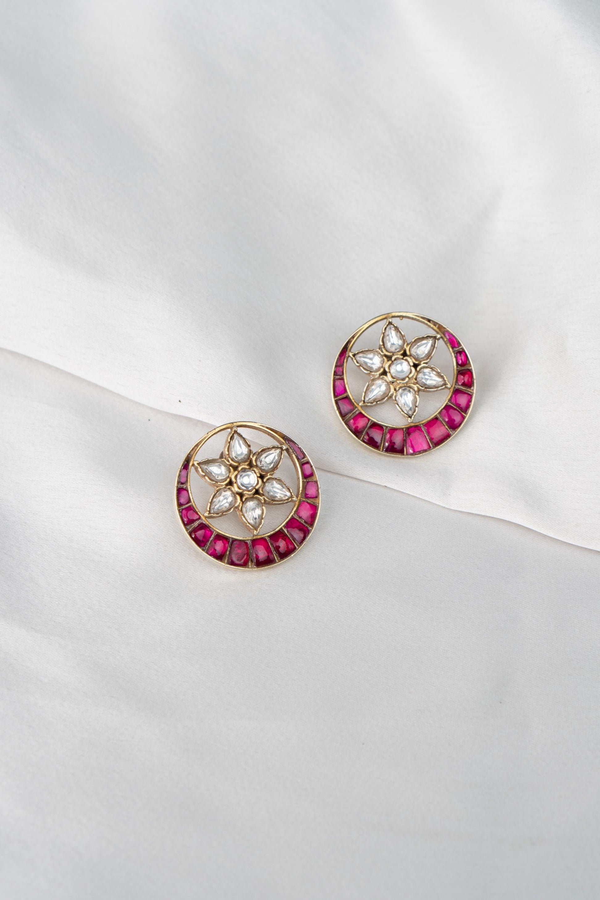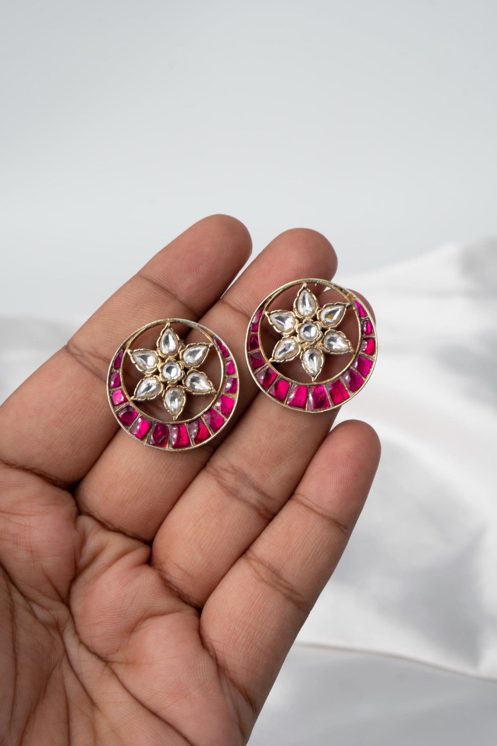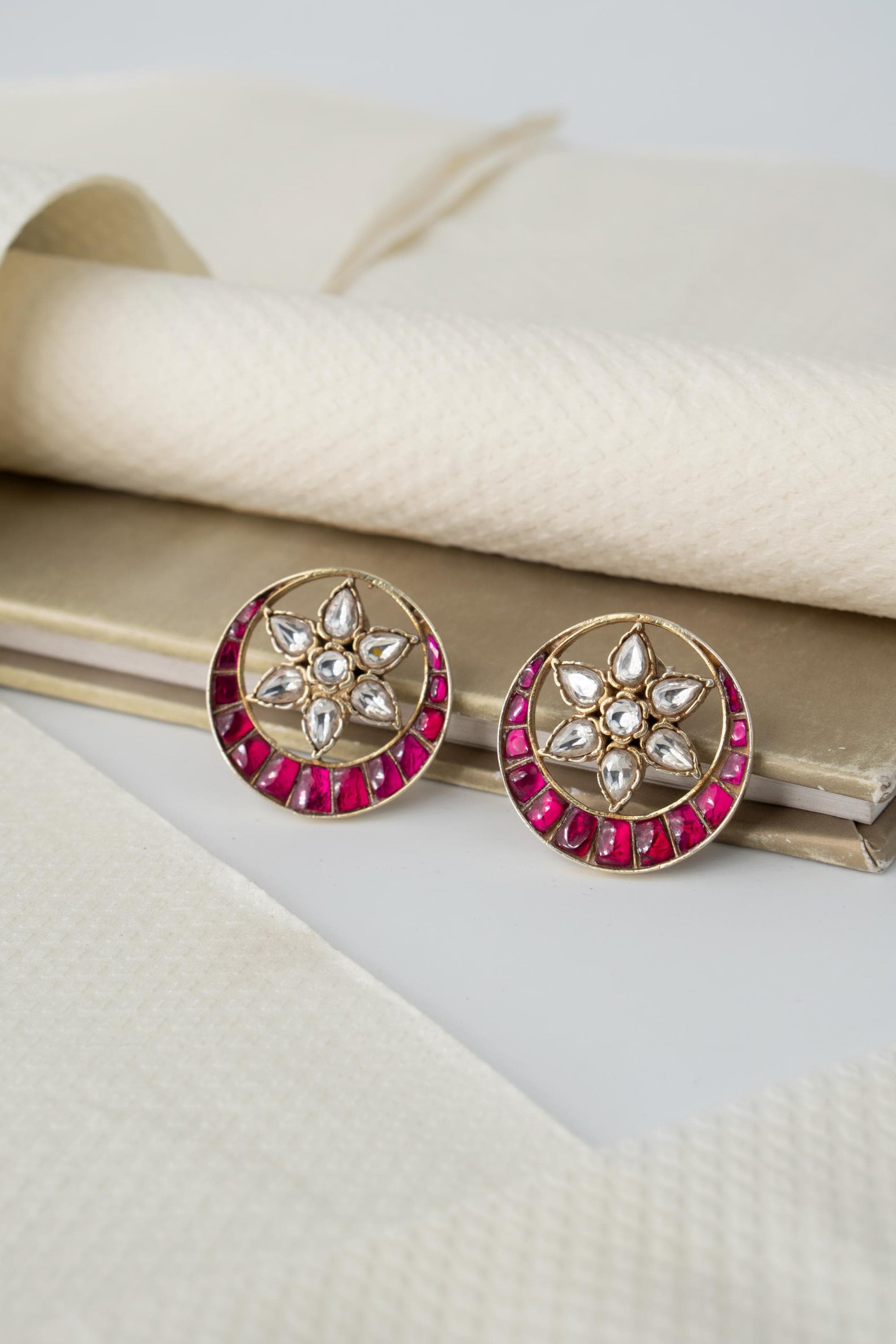 Elevate your traditional ensemble with Gulnoor, our exquisitely handcrafted ruby pink Kundan stud earrings. Set in a radiant floral design with mirror-cut Kundan stones and a semi-circle of deep ruby gems, these earrings are a timeless blend of heritage and minimal elegance.