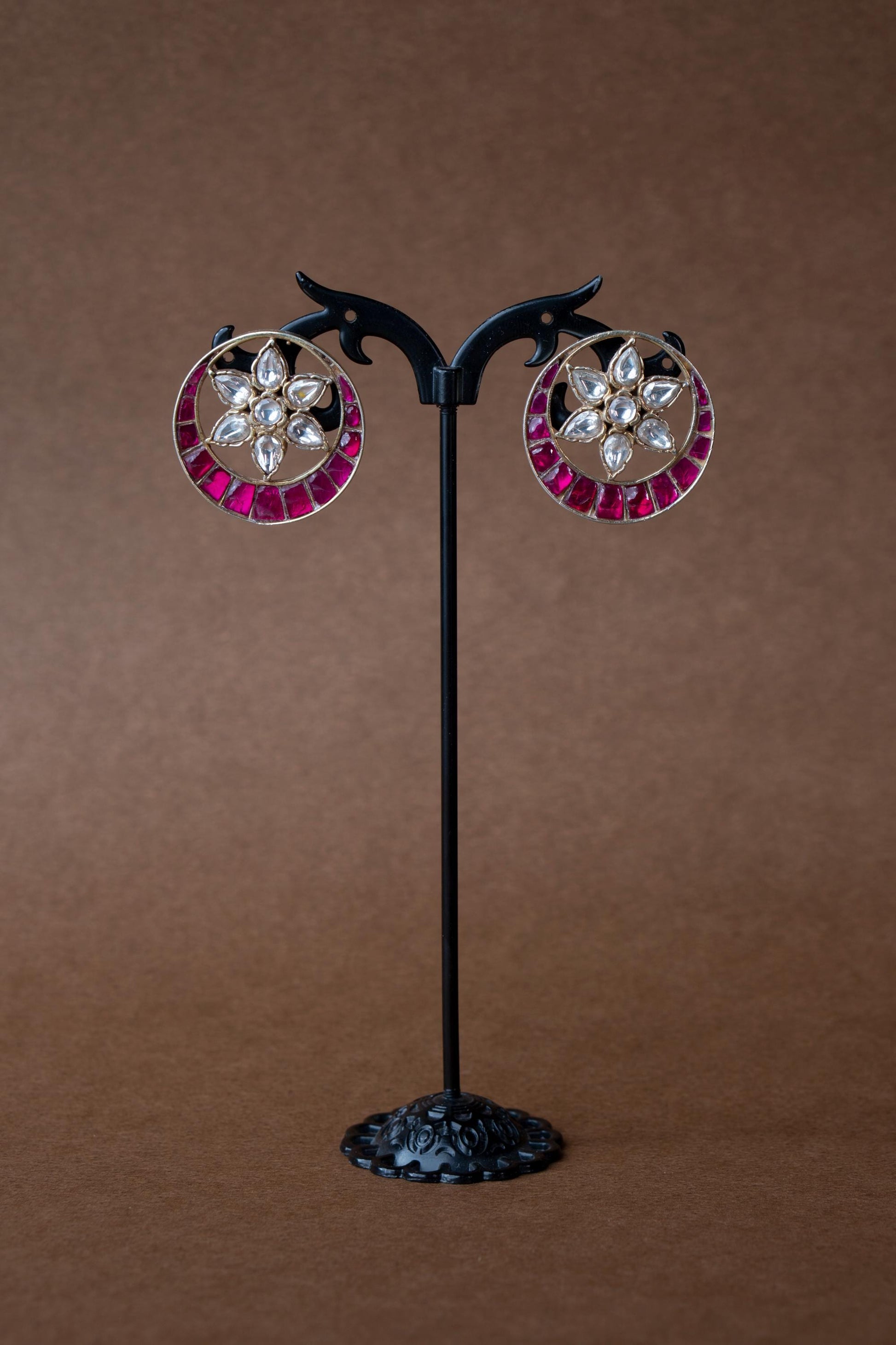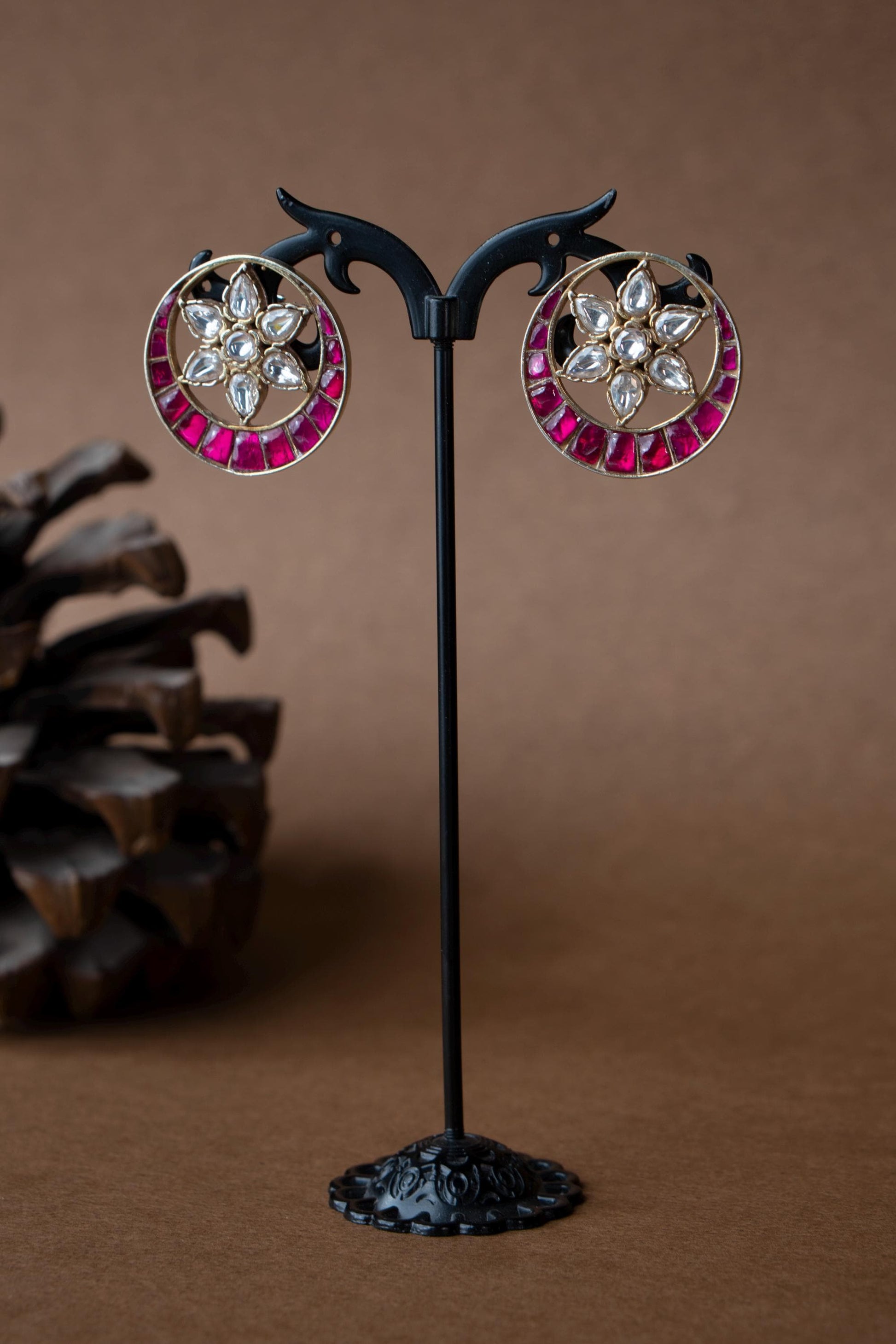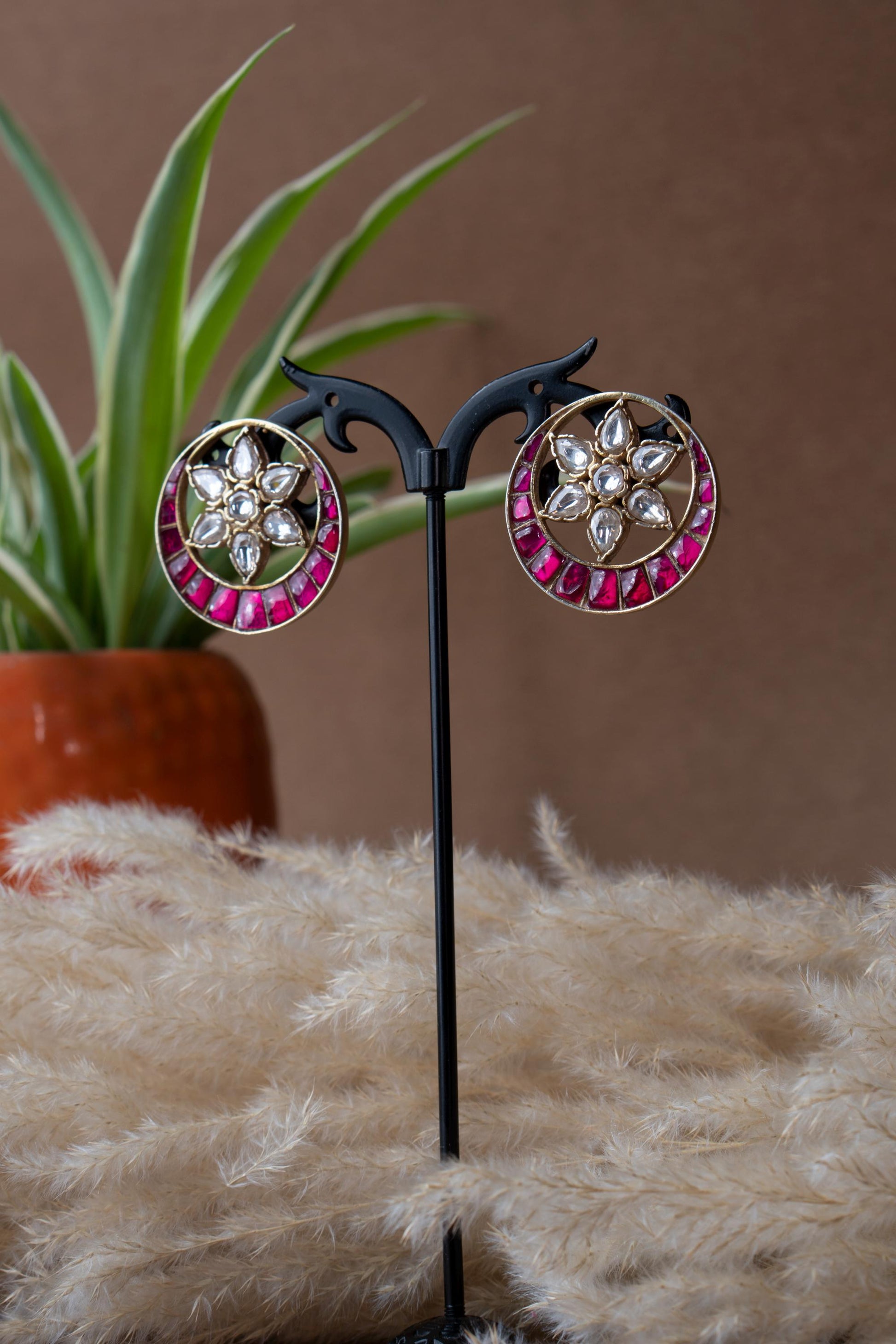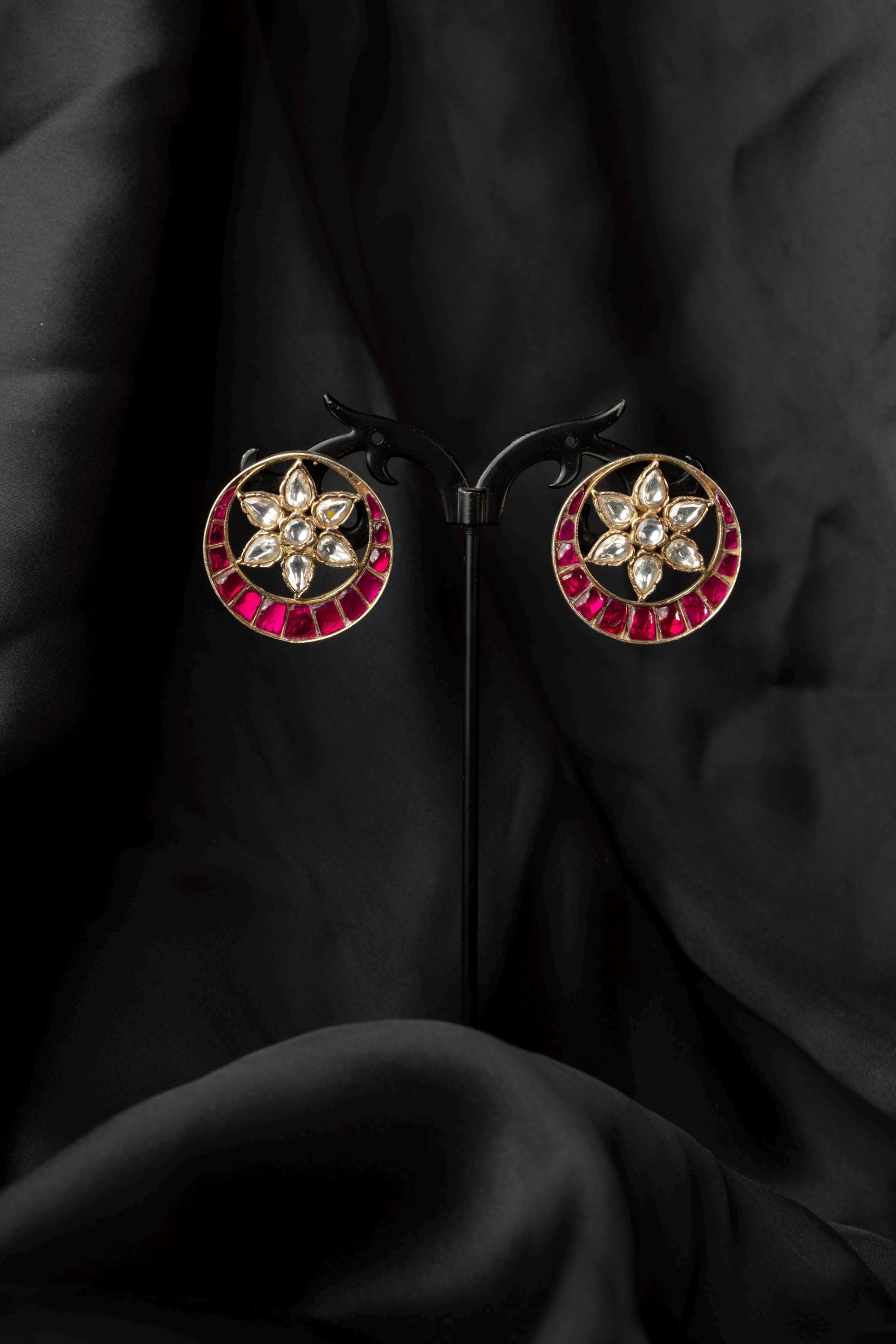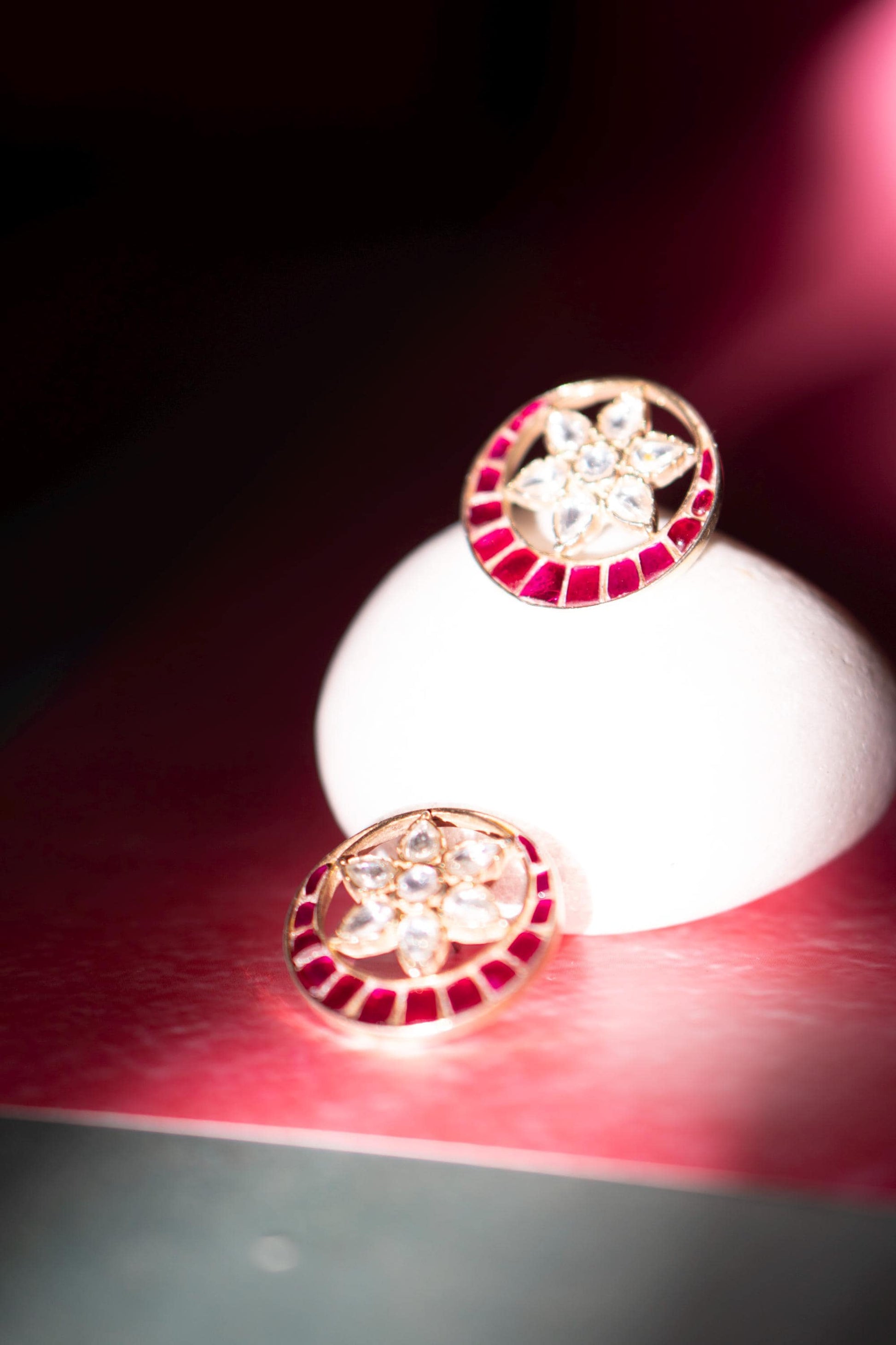 Elevate your traditional ensemble with Gulnoor, our exquisitely handcrafted ruby pink Kundan stud earrings. Set in a radiant floral design with mirror-cut Kundan stones and a semi-circle of deep ruby gems, these earrings are a timeless blend of heritage and minimal elegance.