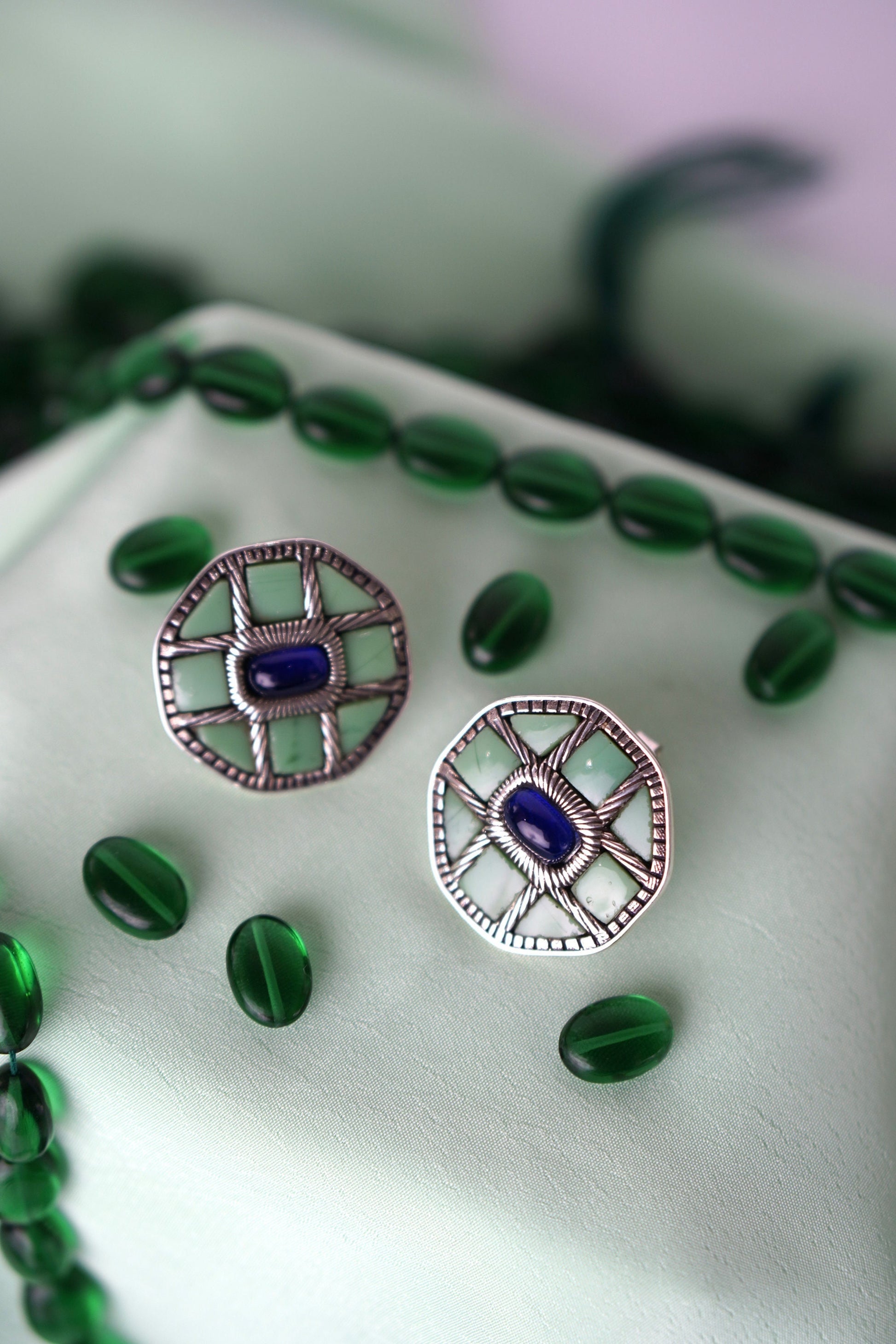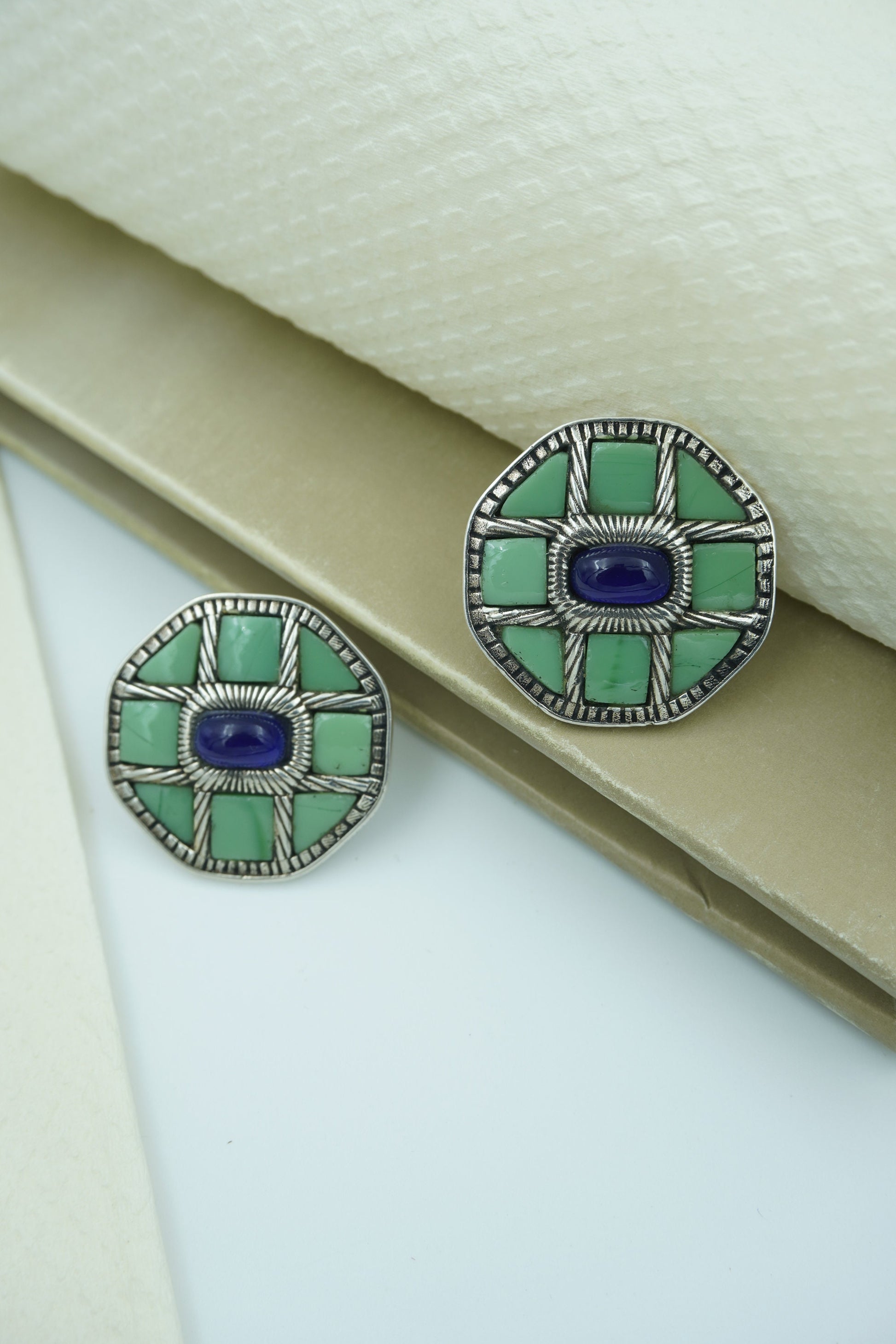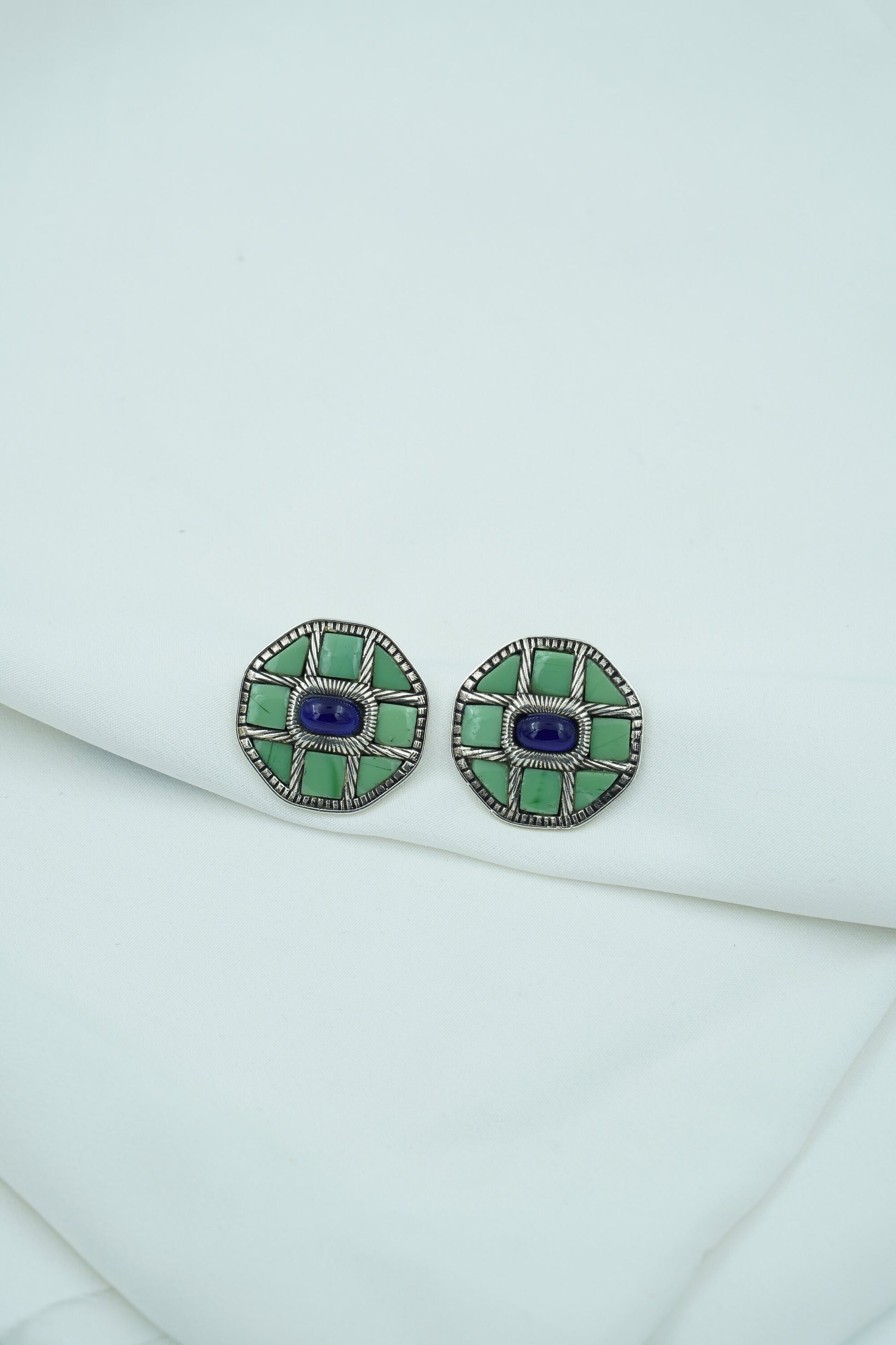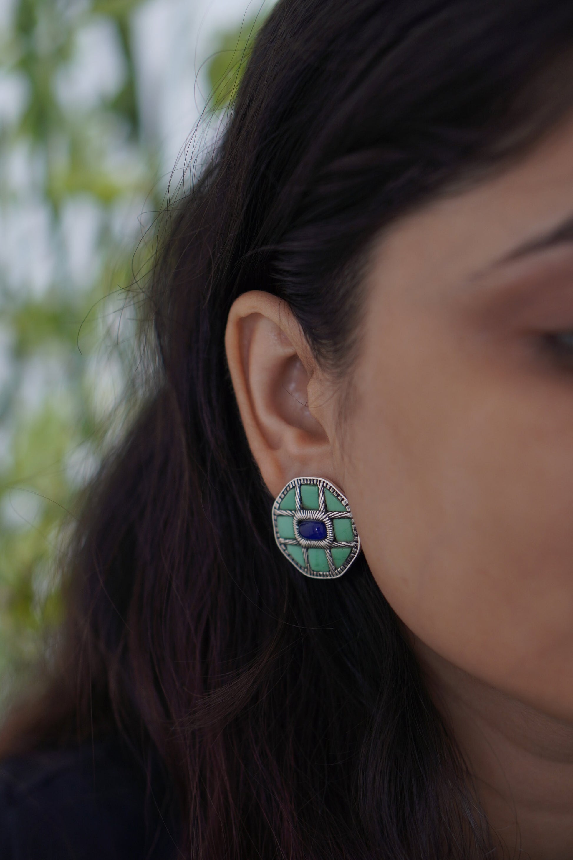 Varnika earrings are a celebration of bold structure and earthy hues. Crafted in a striking octagonal shape with mosaic-style stone and a contrasting deep blue center, these earrings speak volumes without saying a word. Inspired by nature and geometry, they are a statement of individuality and artful balance.