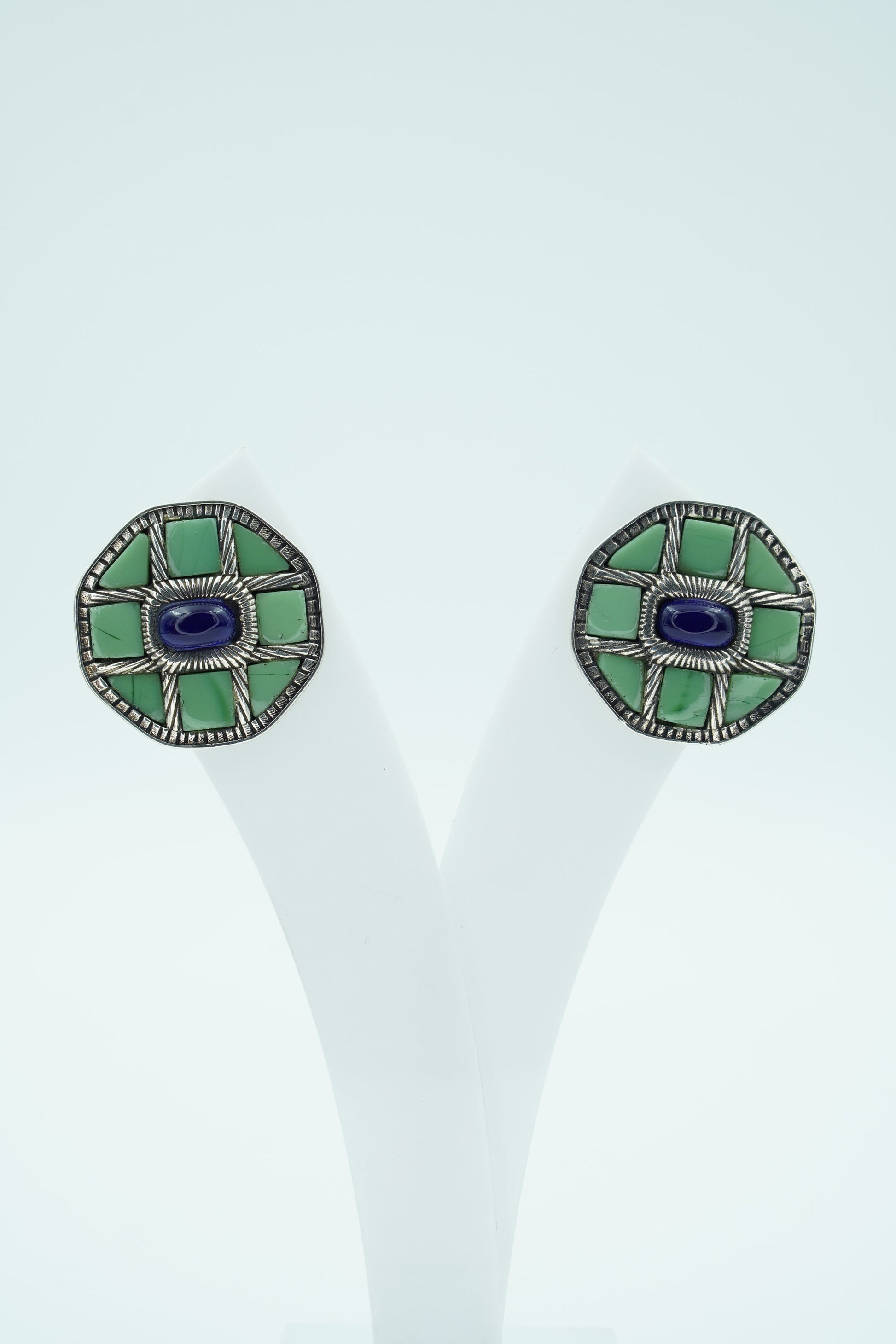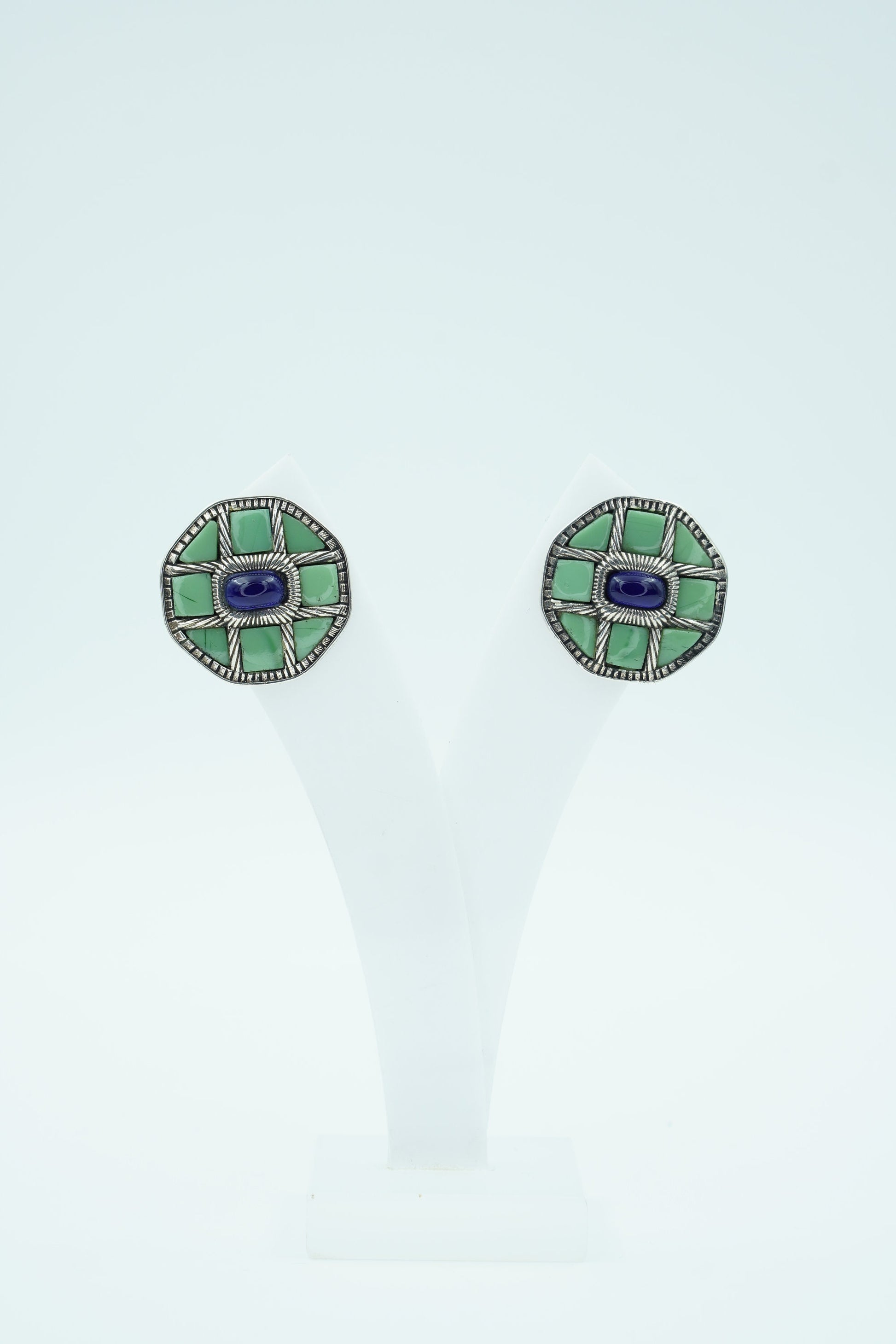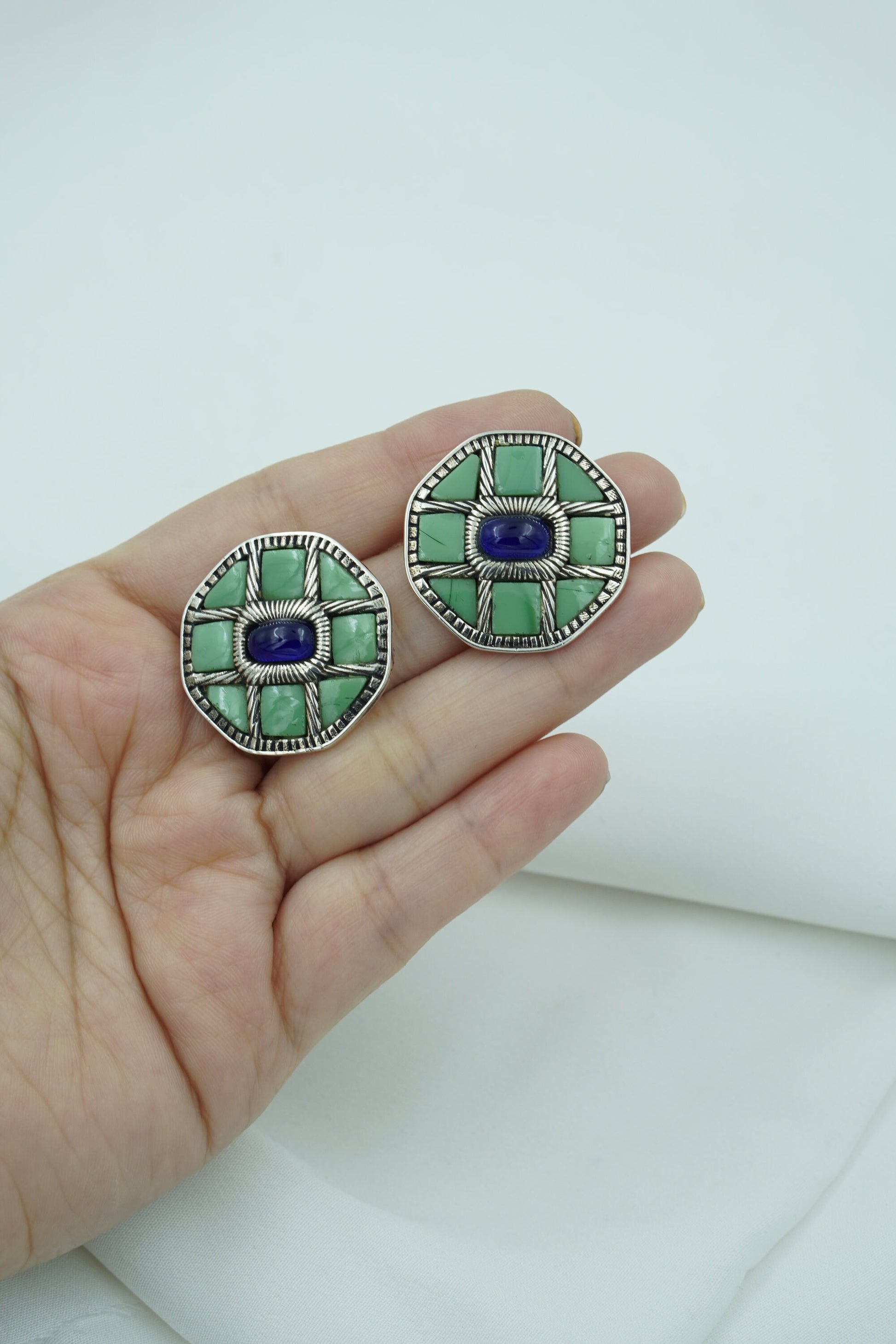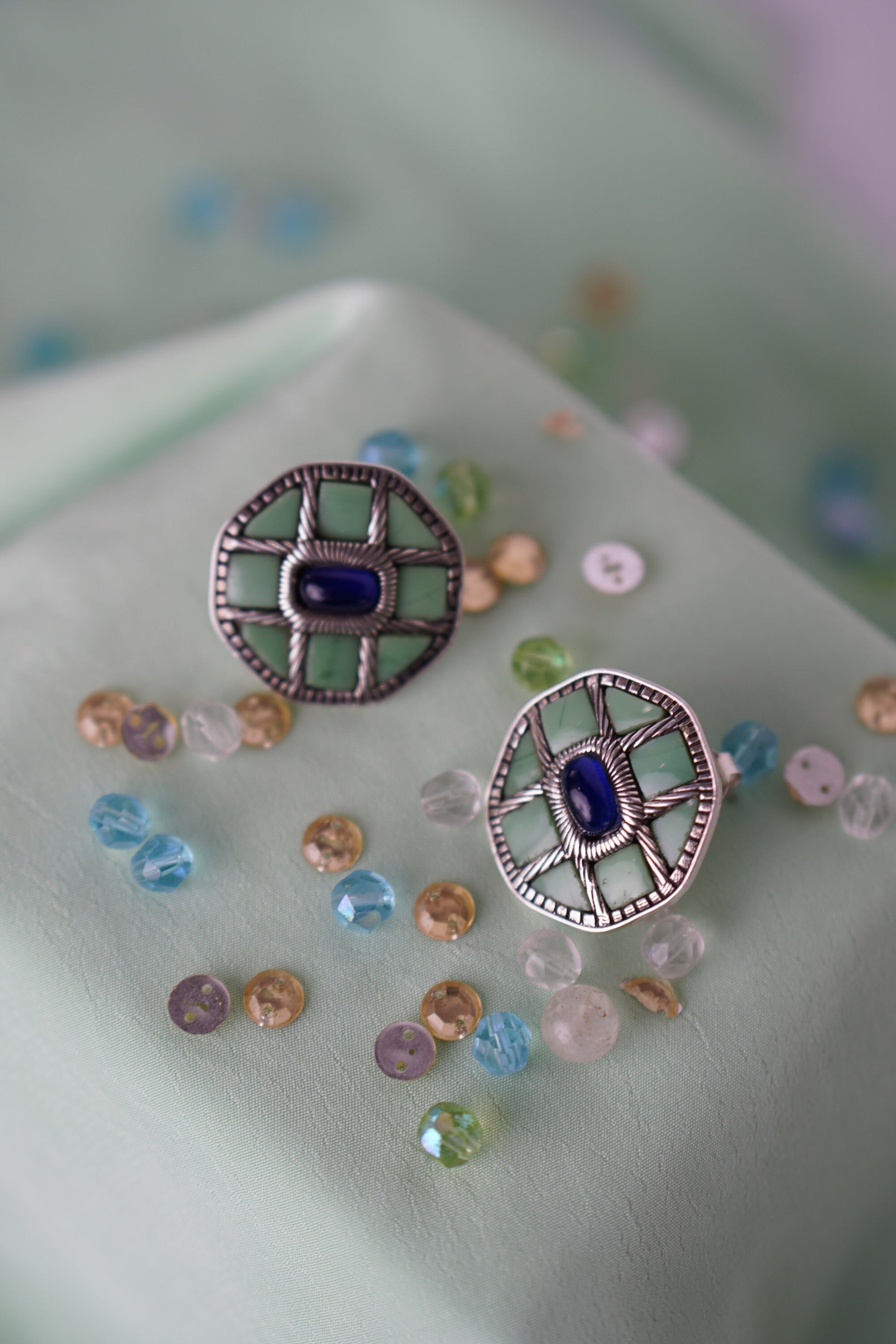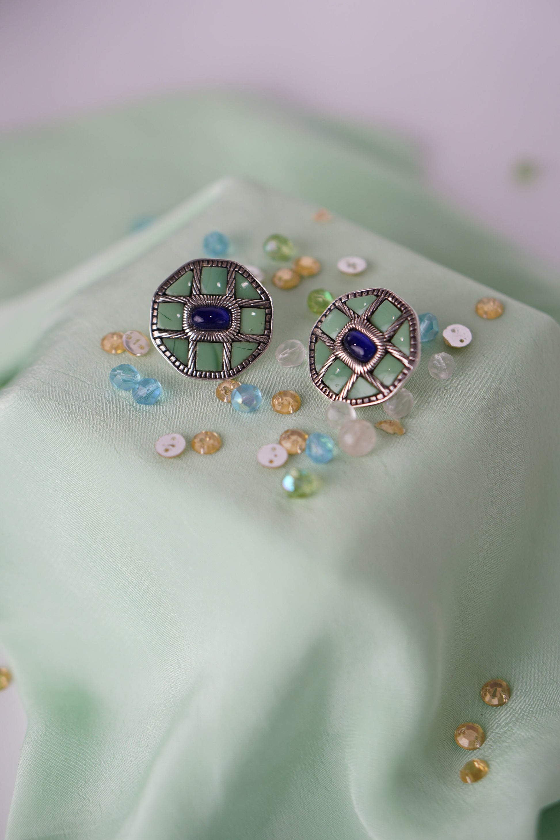 Varnika earrings are a celebration of bold structure and earthy hues. Crafted in a striking octagonal shape with mosaic-style stone and a contrasting deep blue center, these earrings speak volumes without saying a word. Inspired by nature and geometry, they are a statement of individuality and artful balance.