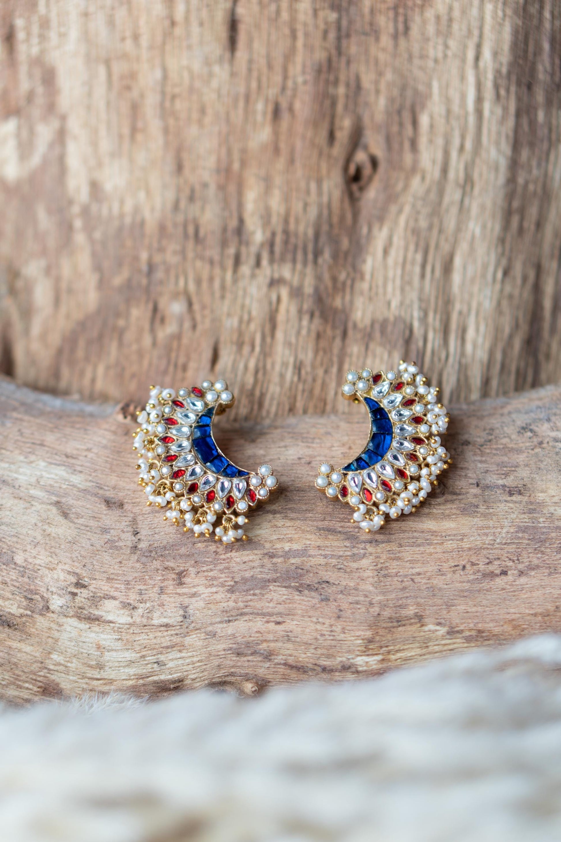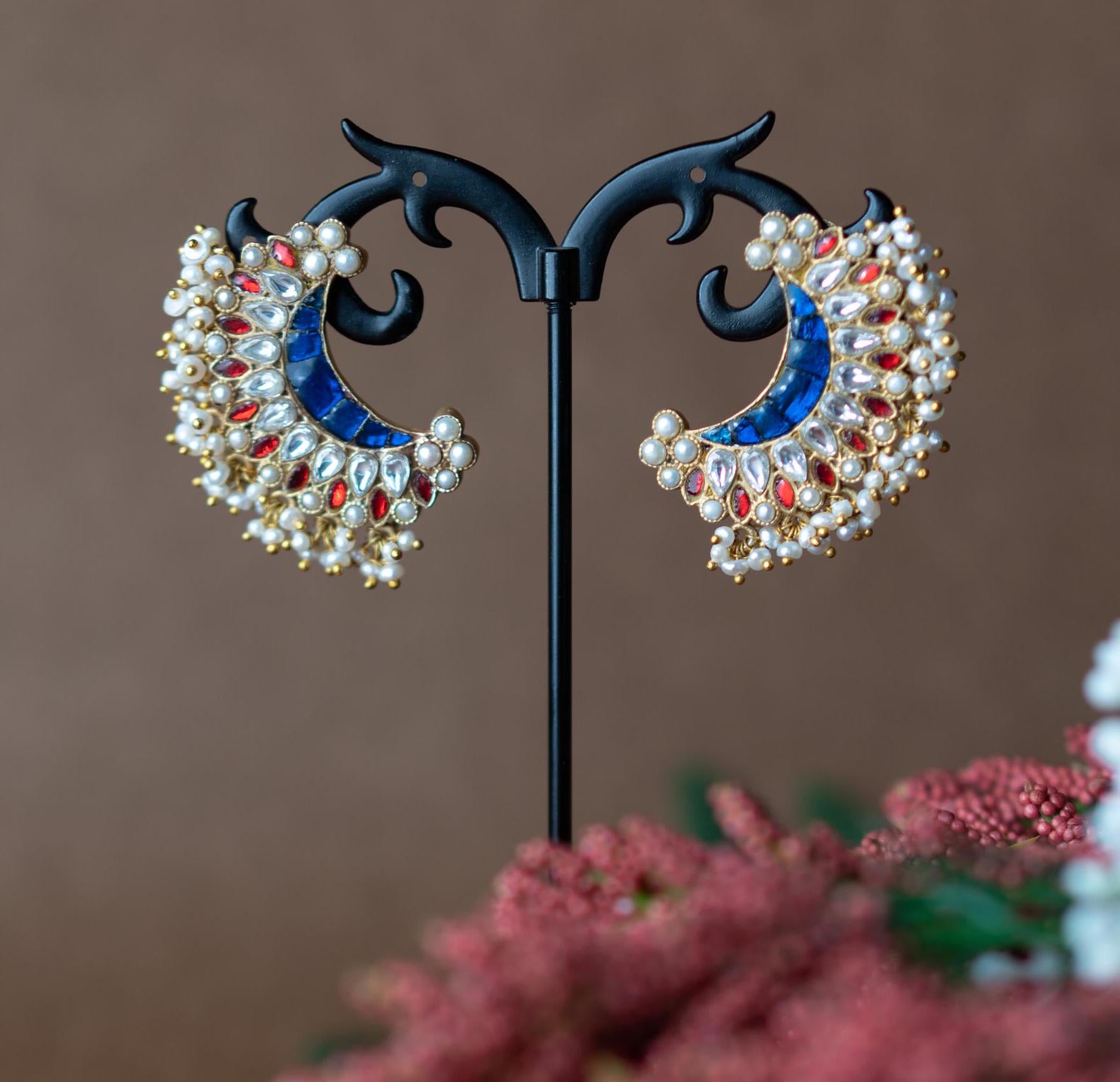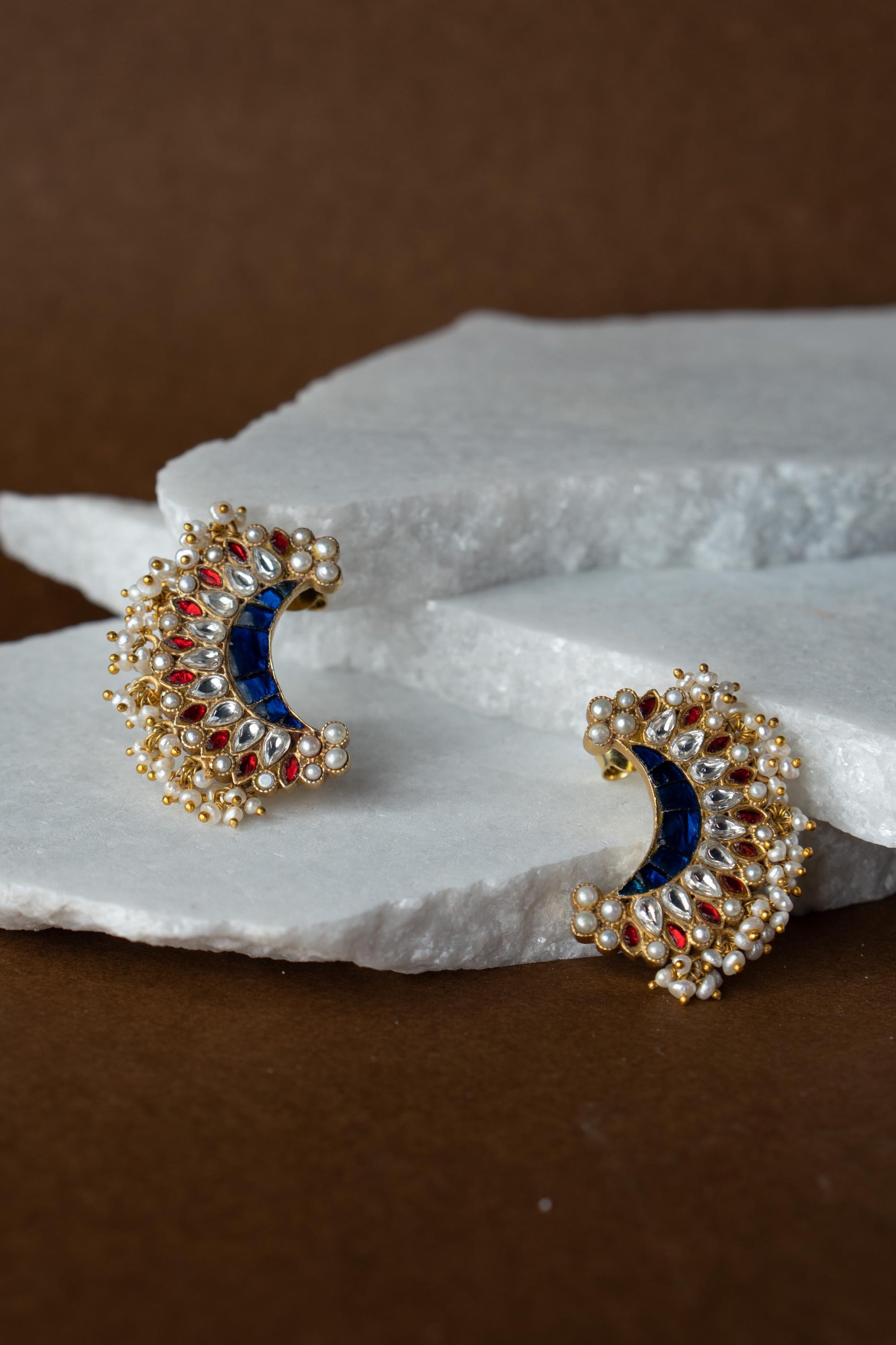 Radiate regal charm with Chandrika crescent-shaped earrings inspired by the luminous beauty of moonlight. Crafted with deep blue stone panels and framed by a constellation of ruby red and sparkling white kundan stones, these earrings are an ode to traditional grandeur. Miniature pearl clusters and gold-toned beads fringe the design, adding a festive shimmer with every movement.