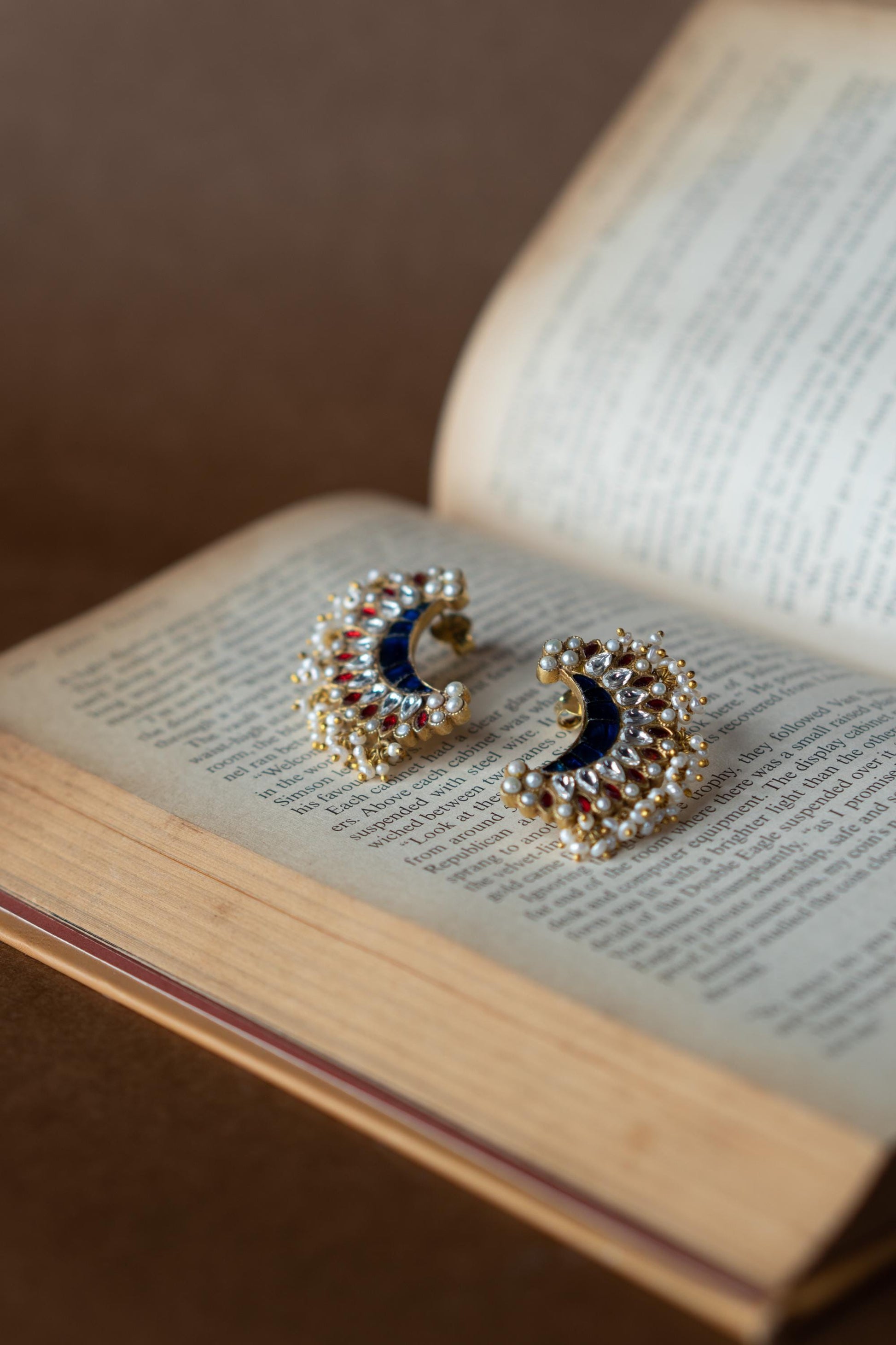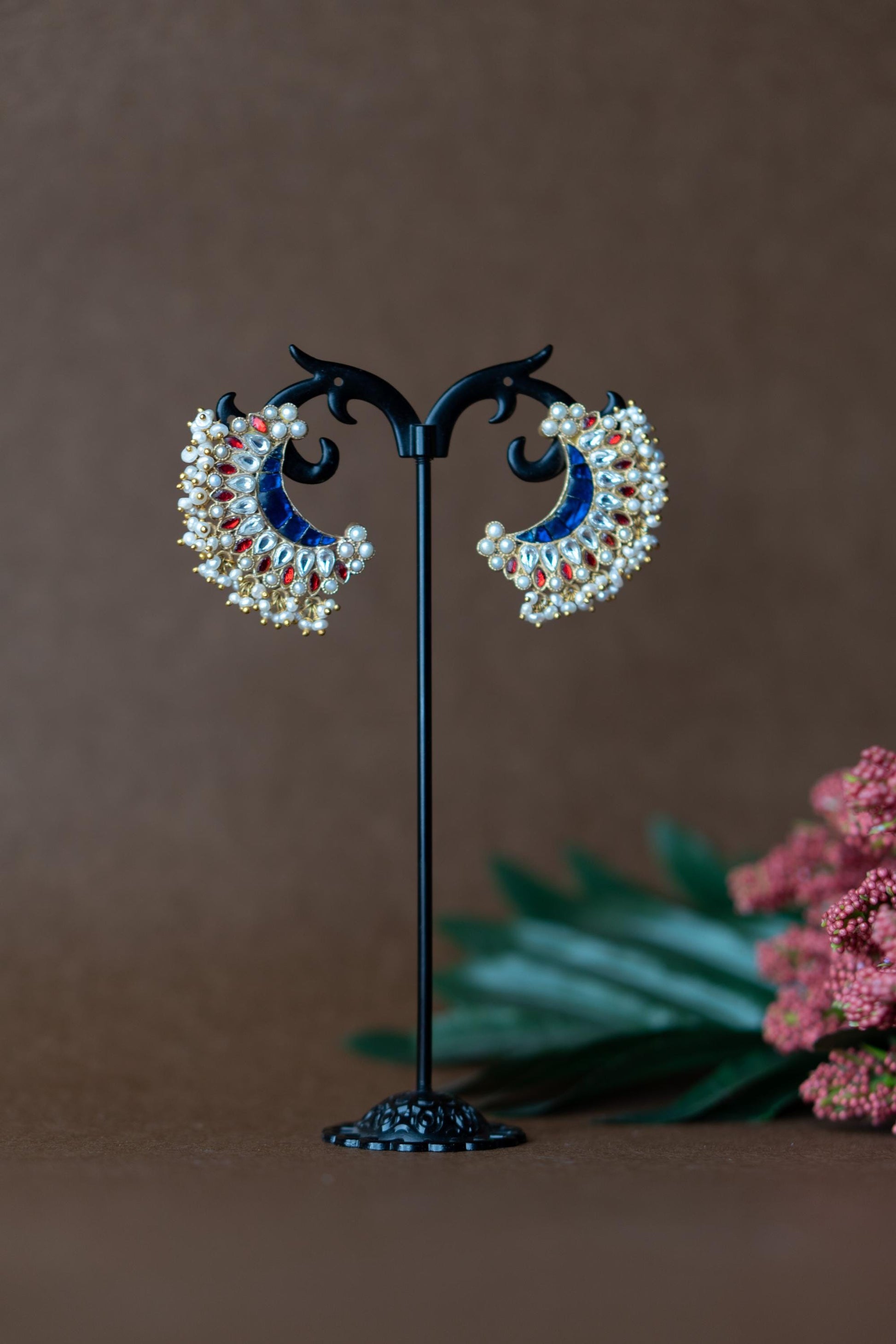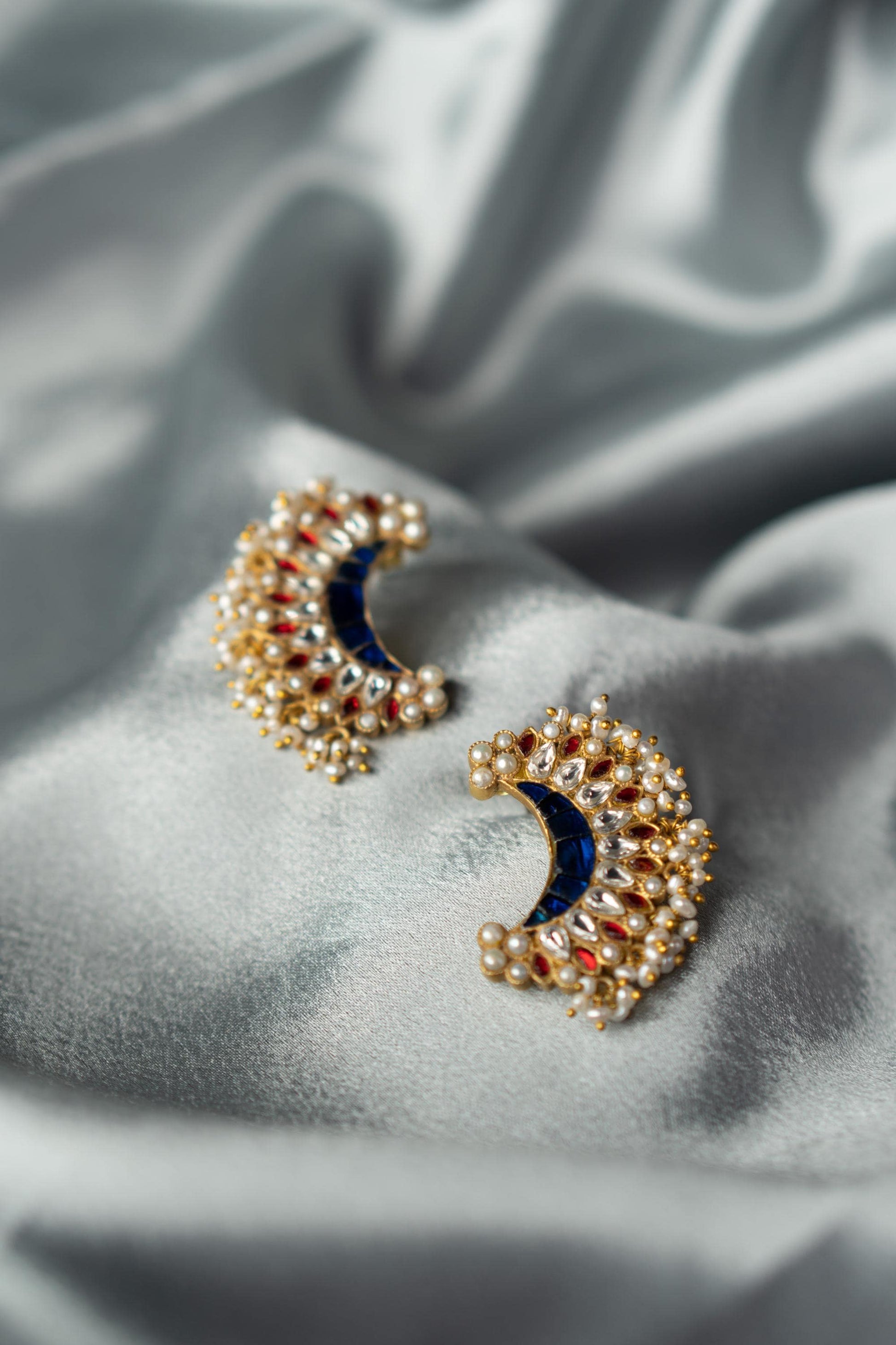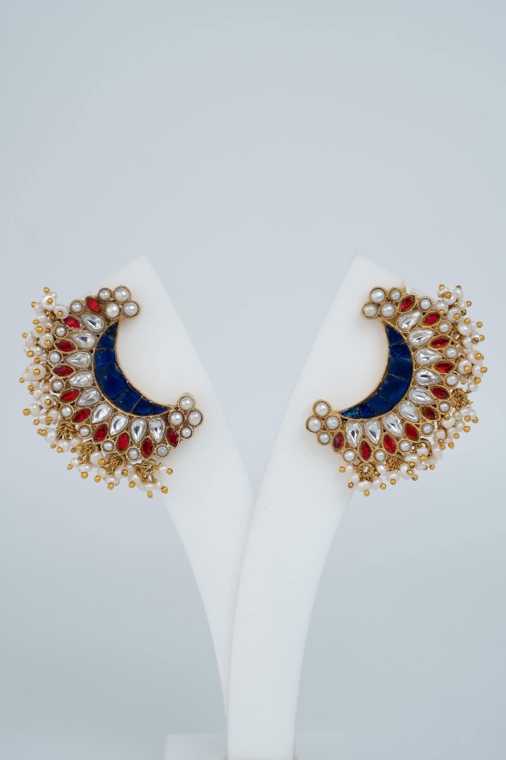 Radiate regal charm with Chandrika crescent-shaped earrings inspired by the luminous beauty of moonlight. Crafted with deep blue stone panels and framed by a constellation of ruby red and sparkling white kundan stones, these earrings are an ode to traditional grandeur. Miniature pearl clusters and gold-toned beads fringe the design, adding a festive shimmer with every movement.