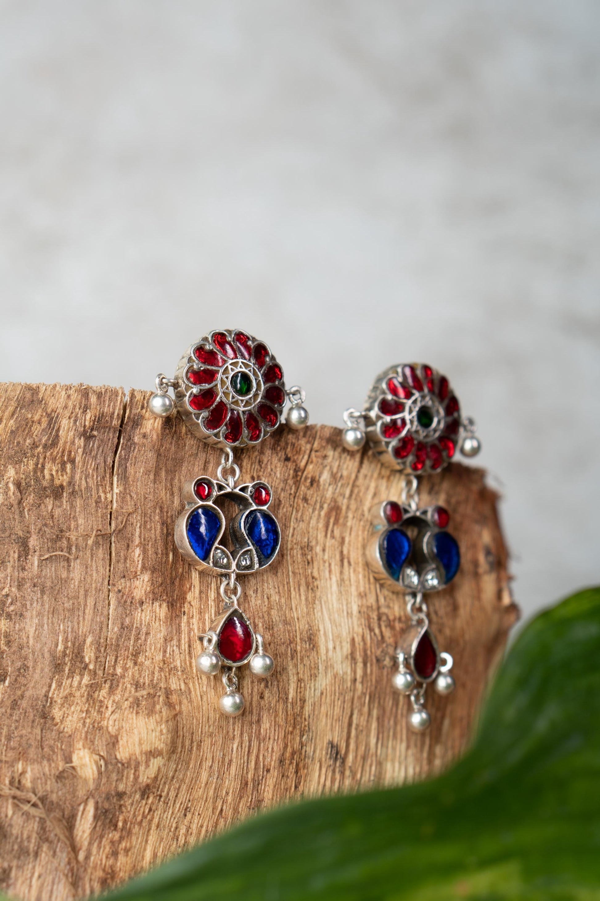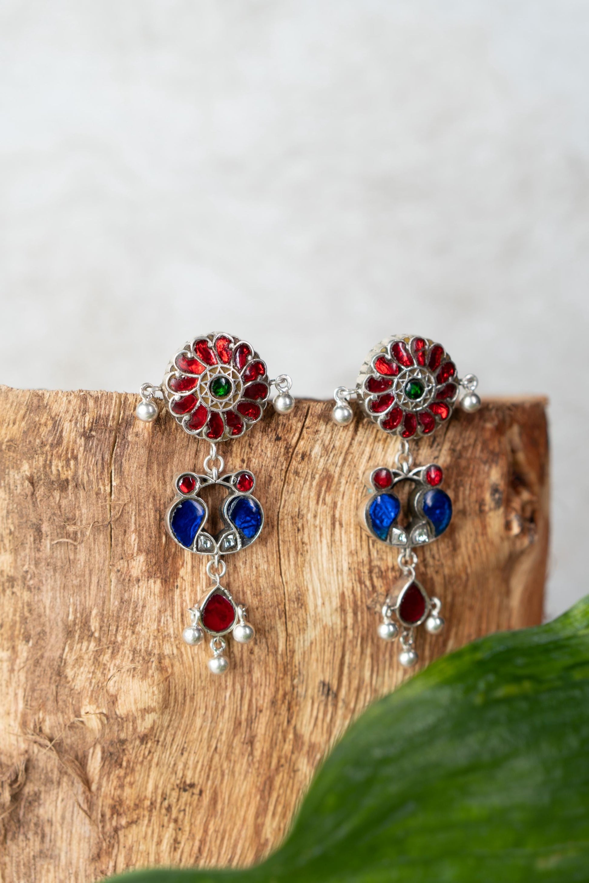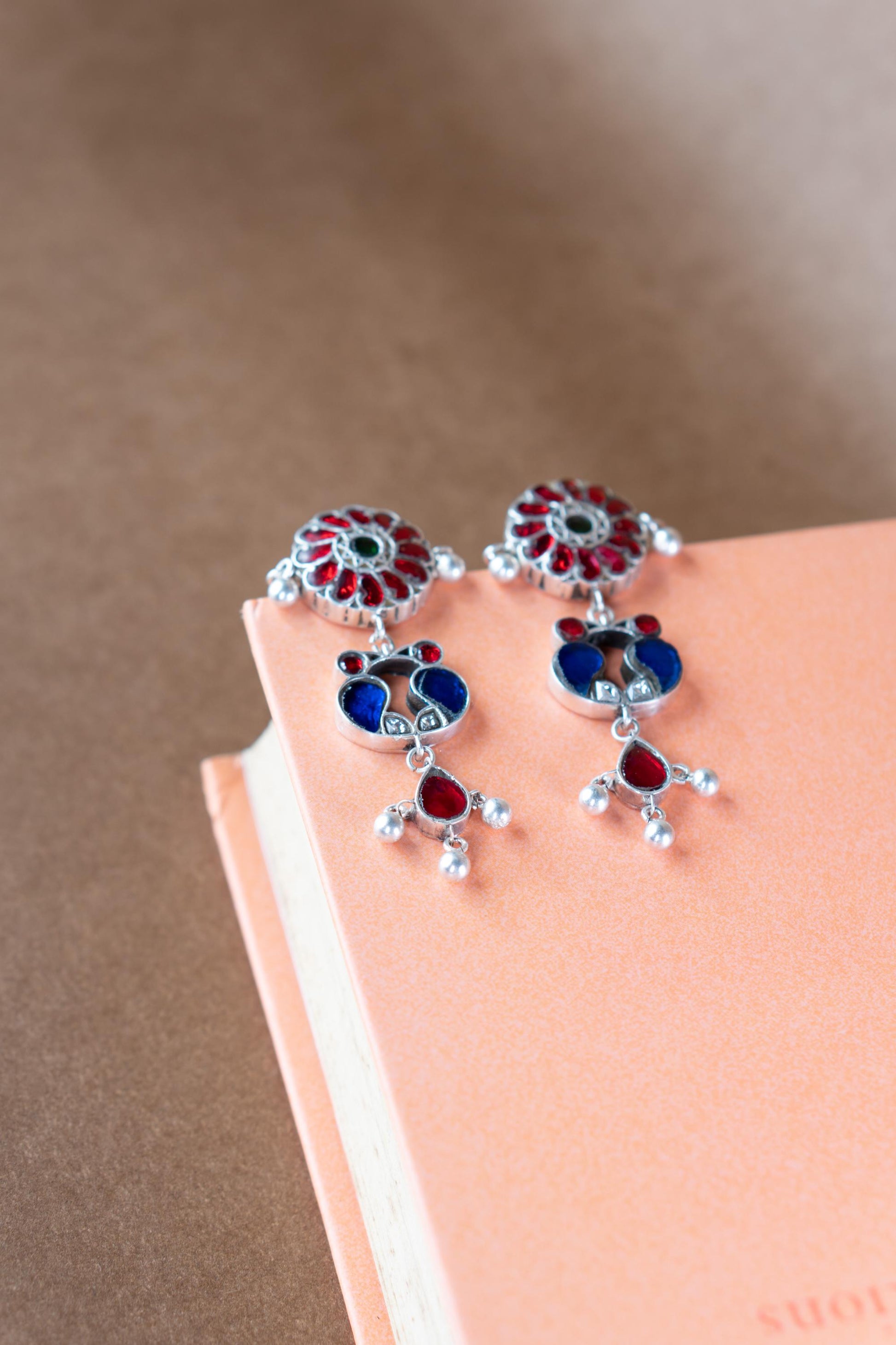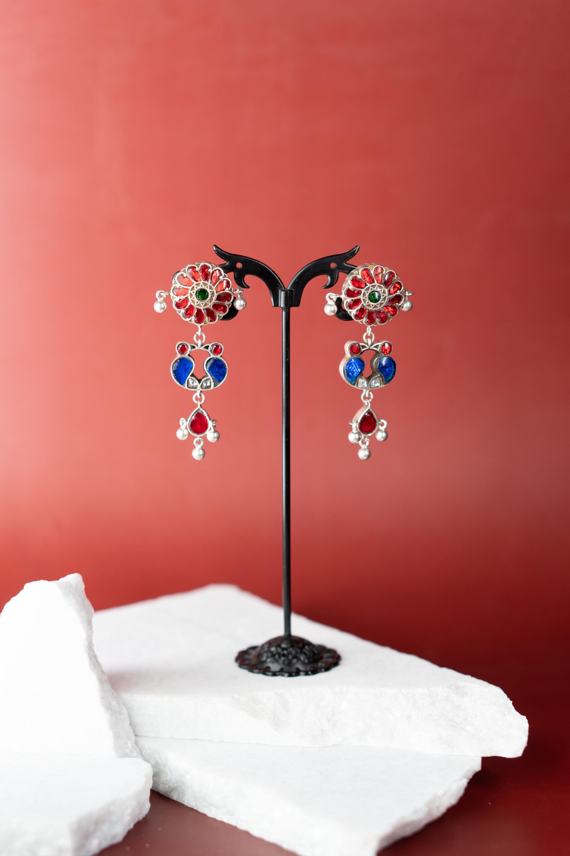 Neelika is a stunning blend of traditional charm and artistic detail. Crafted in sterling silver, these earrings feature a vibrant red floral top, a pair of enamelled peacocks in royal blue and crimson, and a drop-shaped red stone finale with delicate silver ghungroos. Every element is thoughtfully arranged to reflect cultural richness with a playful twist.
