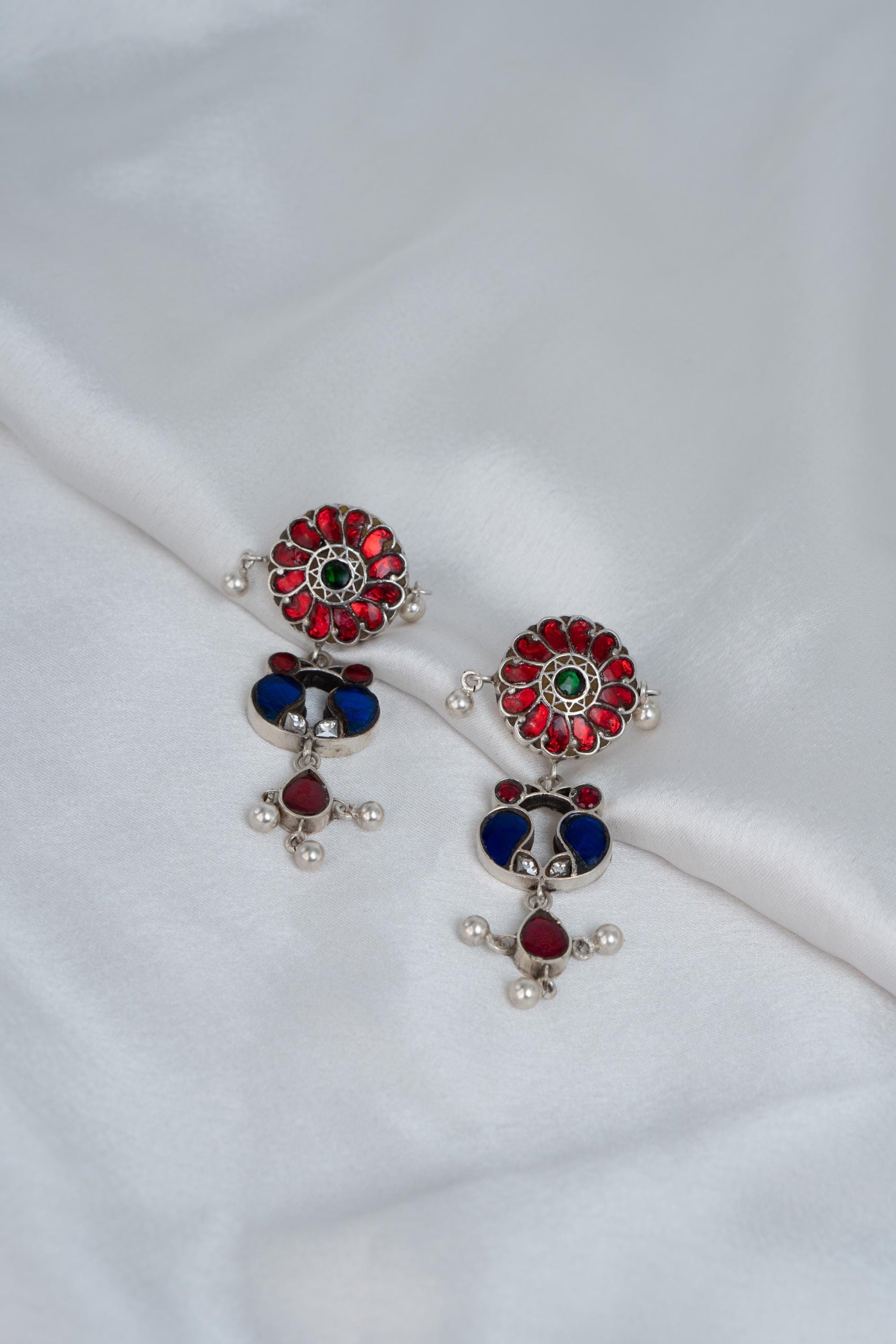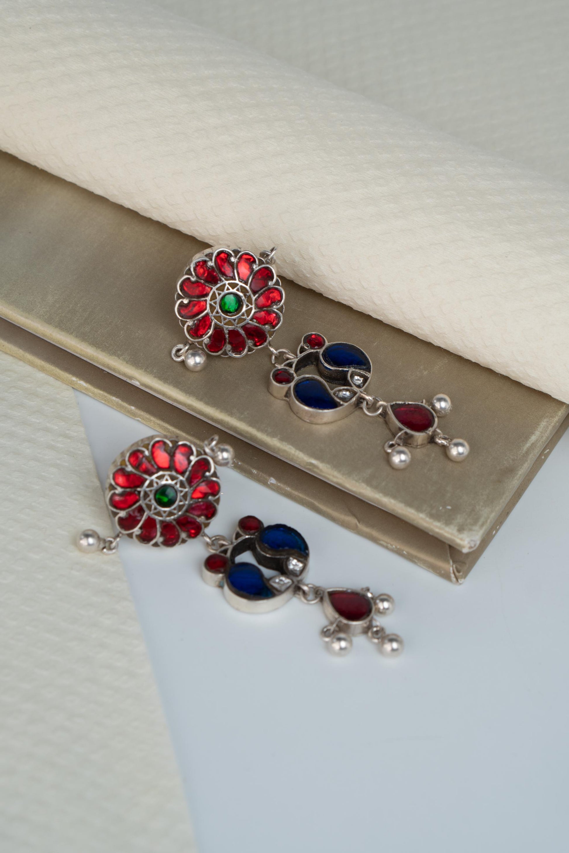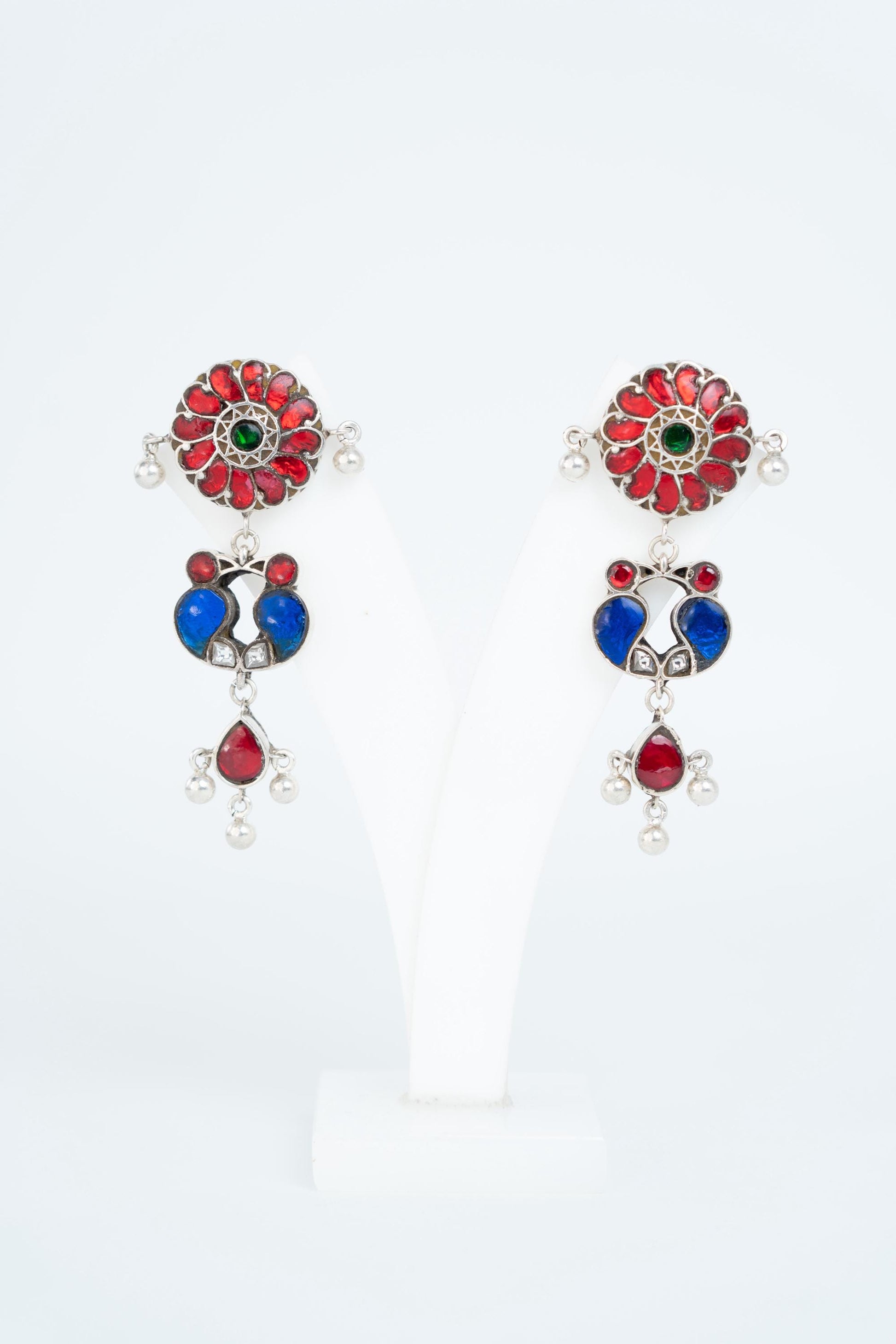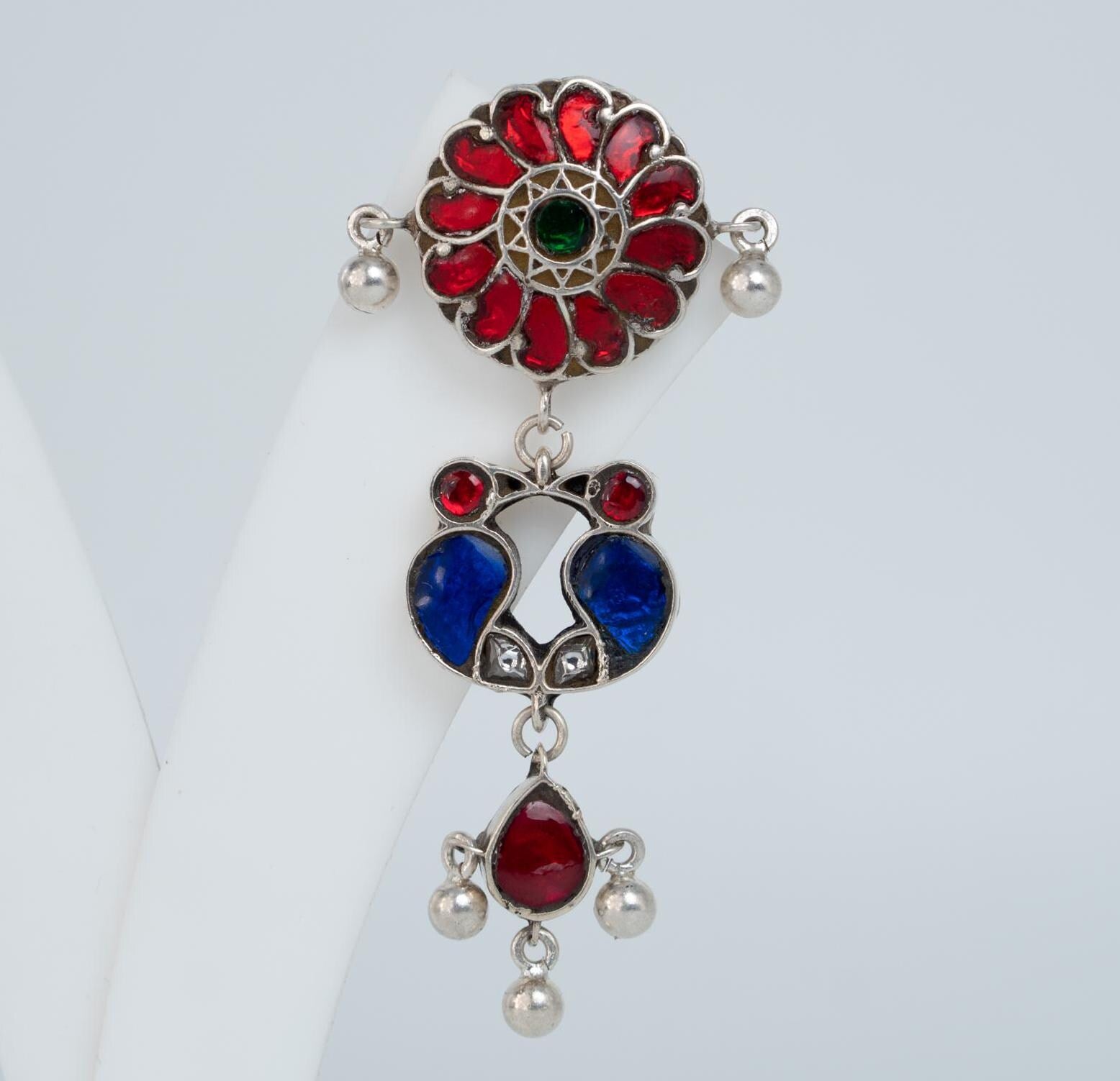 Neelika is a stunning blend of traditional charm and artistic detail. Crafted in sterling silver, these earrings feature a vibrant red floral top, a pair of enamelled peacocks in royal blue and crimson, and a drop-shaped red stone finale with delicate silver ghungroos. Every element is thoughtfully arranged to reflect cultural richness with a playful twist.