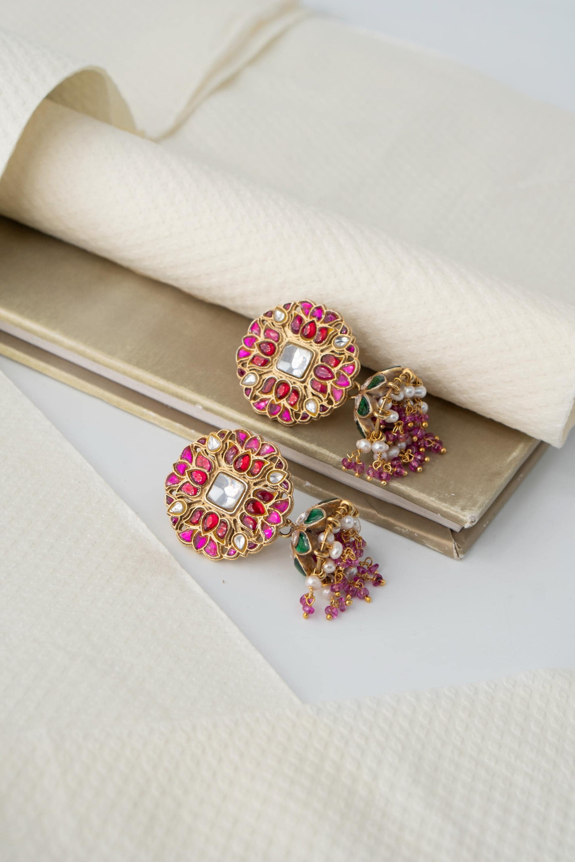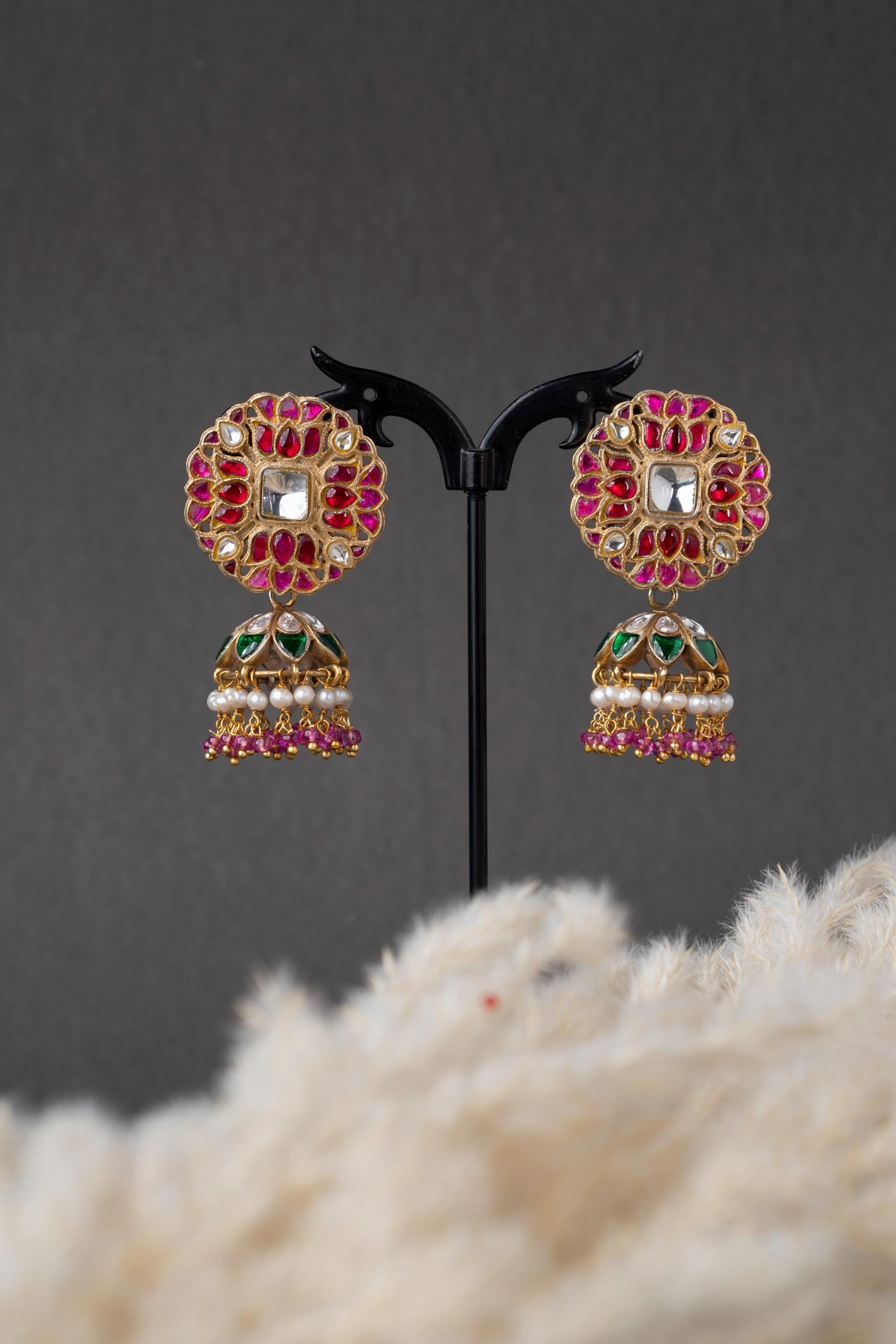 Celebrate tradition with Gulrangi, a dazzling pair of handcrafted earrings adorned with deep ruby hues, sparkling kundan stones, and a charming dome-shaped jhumki. Each piece is a work of art, bringing to life the rich colors and heritage of Indian craftsmanship.