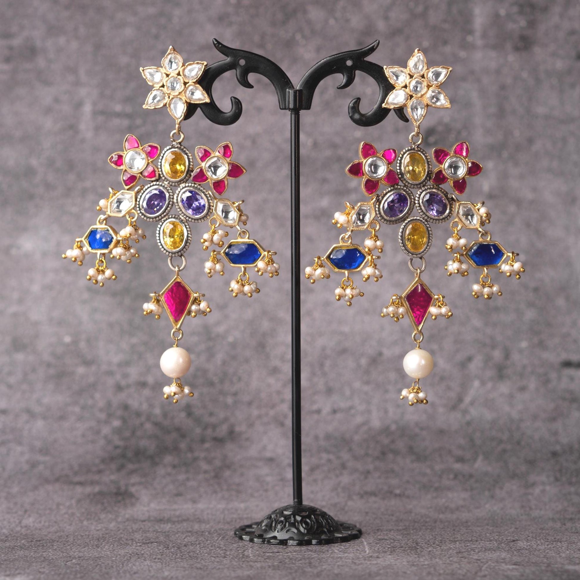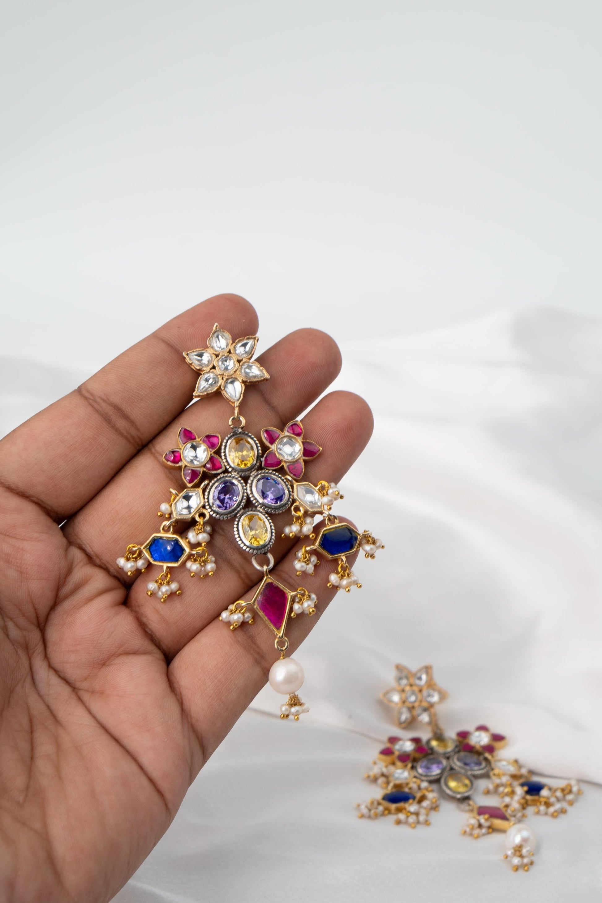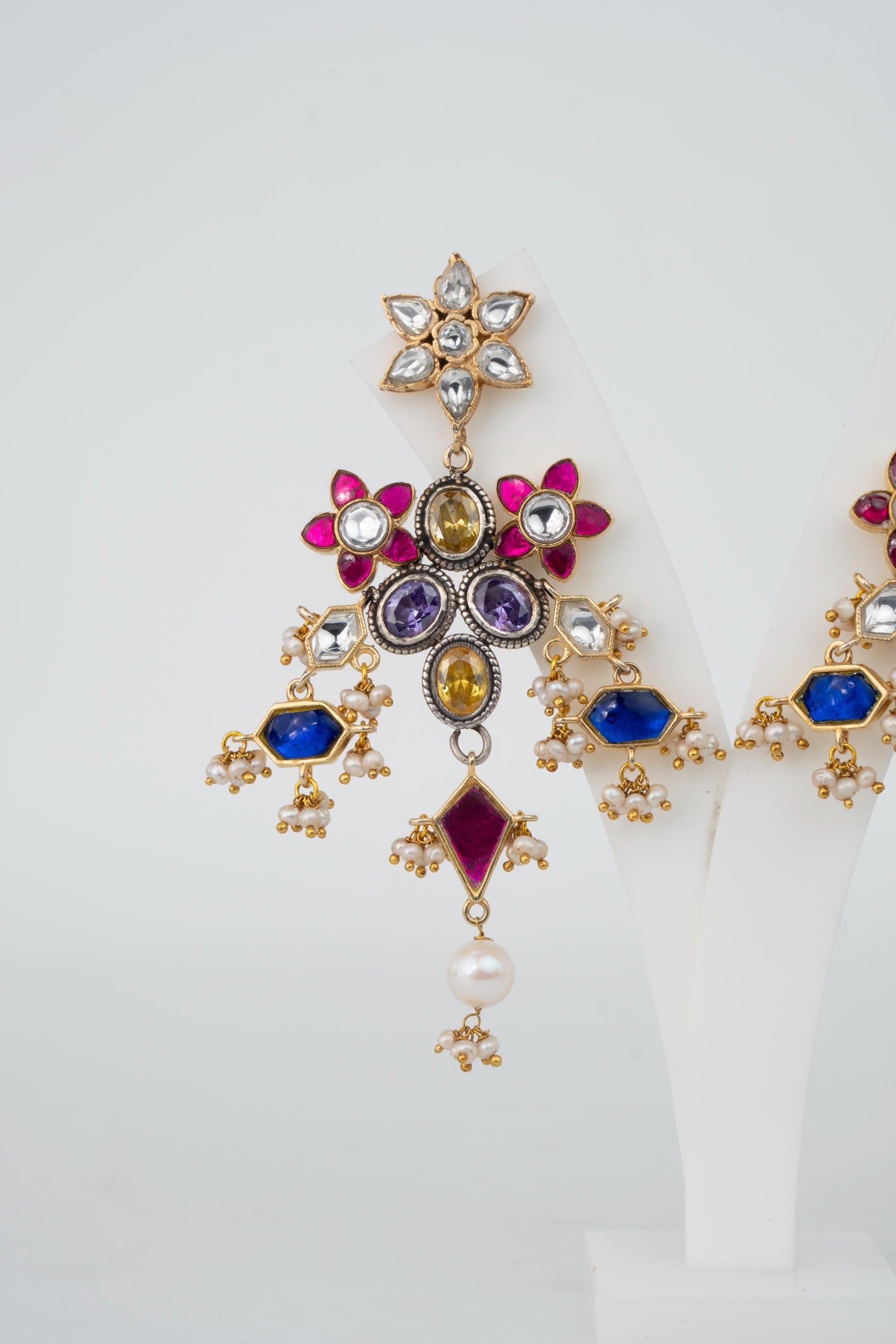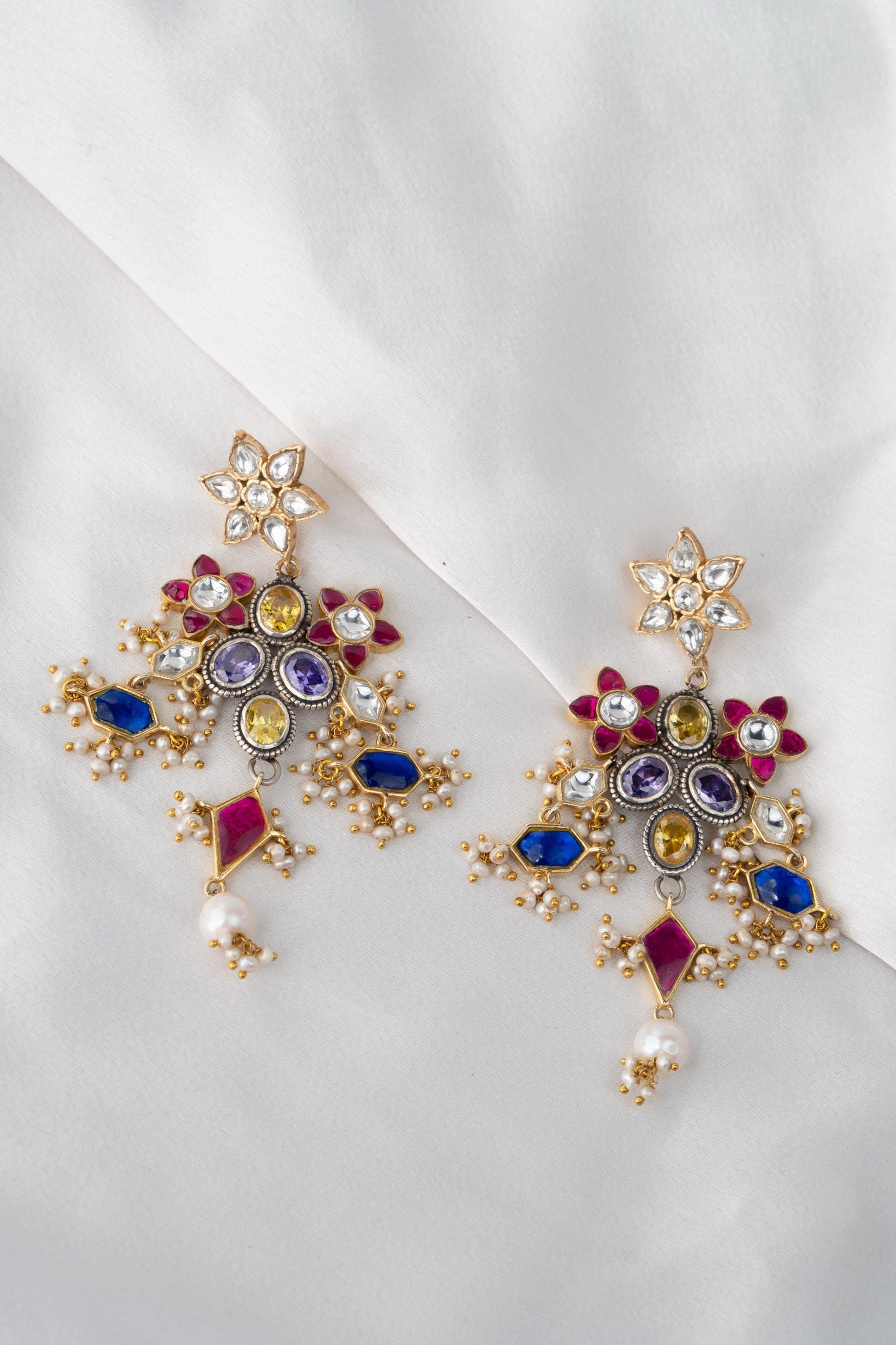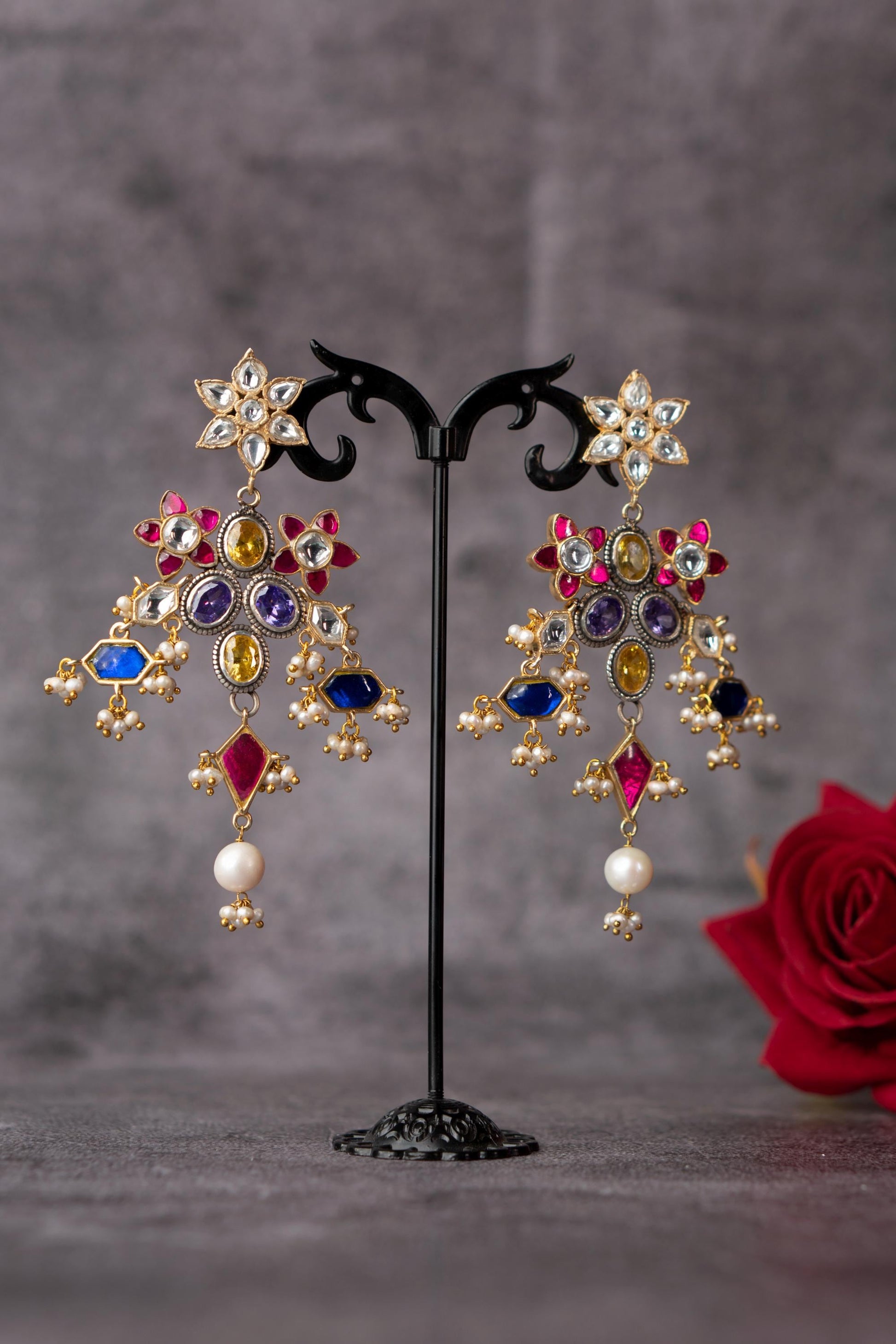 Make a royal statement with these Mughal style multicolor Kundan earrings, exquisitely handcrafted with vibrant ruby red, royal blue, violet, and golden yellow stones, accented by traditional Kundan work, faux pearls, and floral motifs. These bridal statement earrings are a true celebration of Indian heritage and craftsmanship.