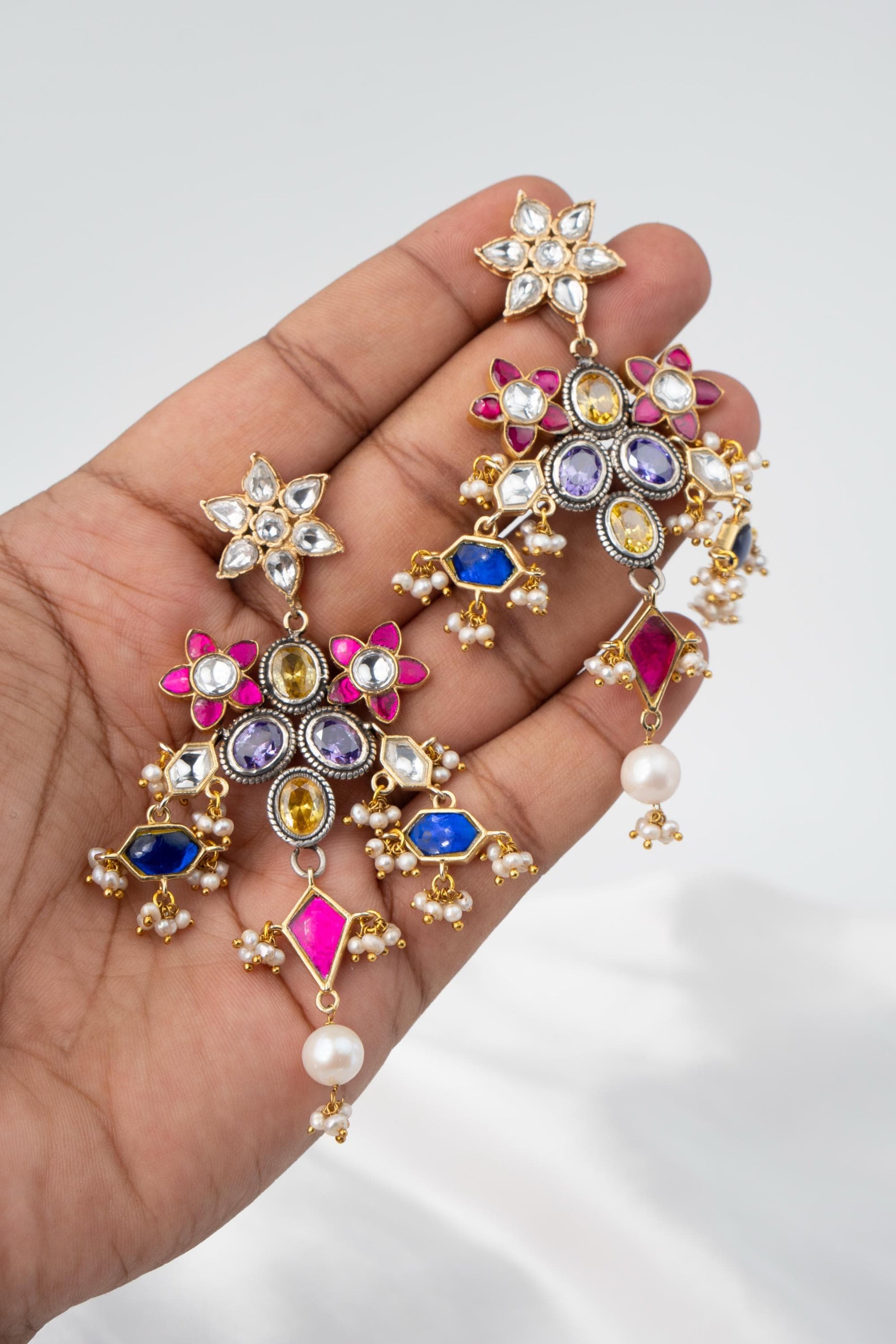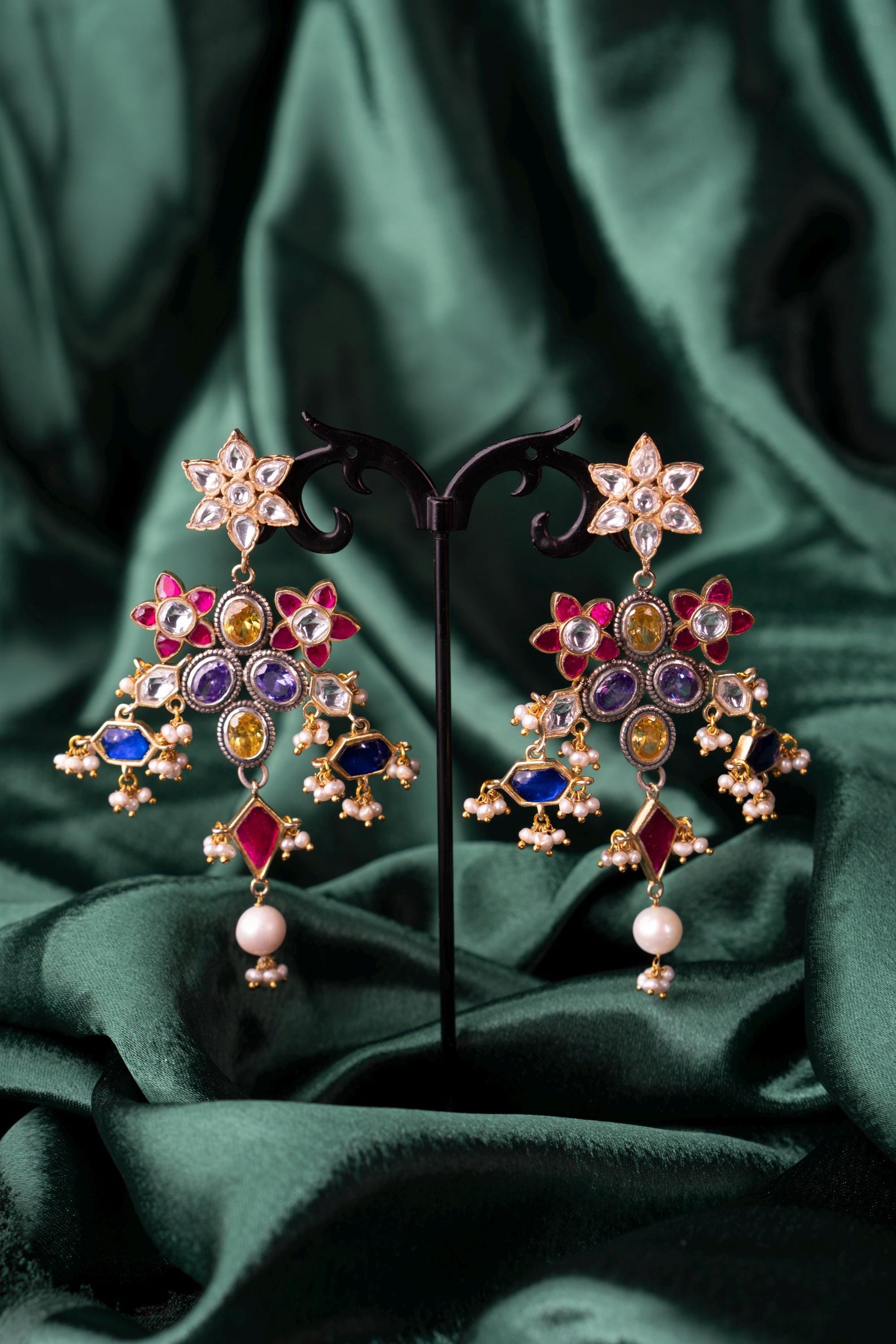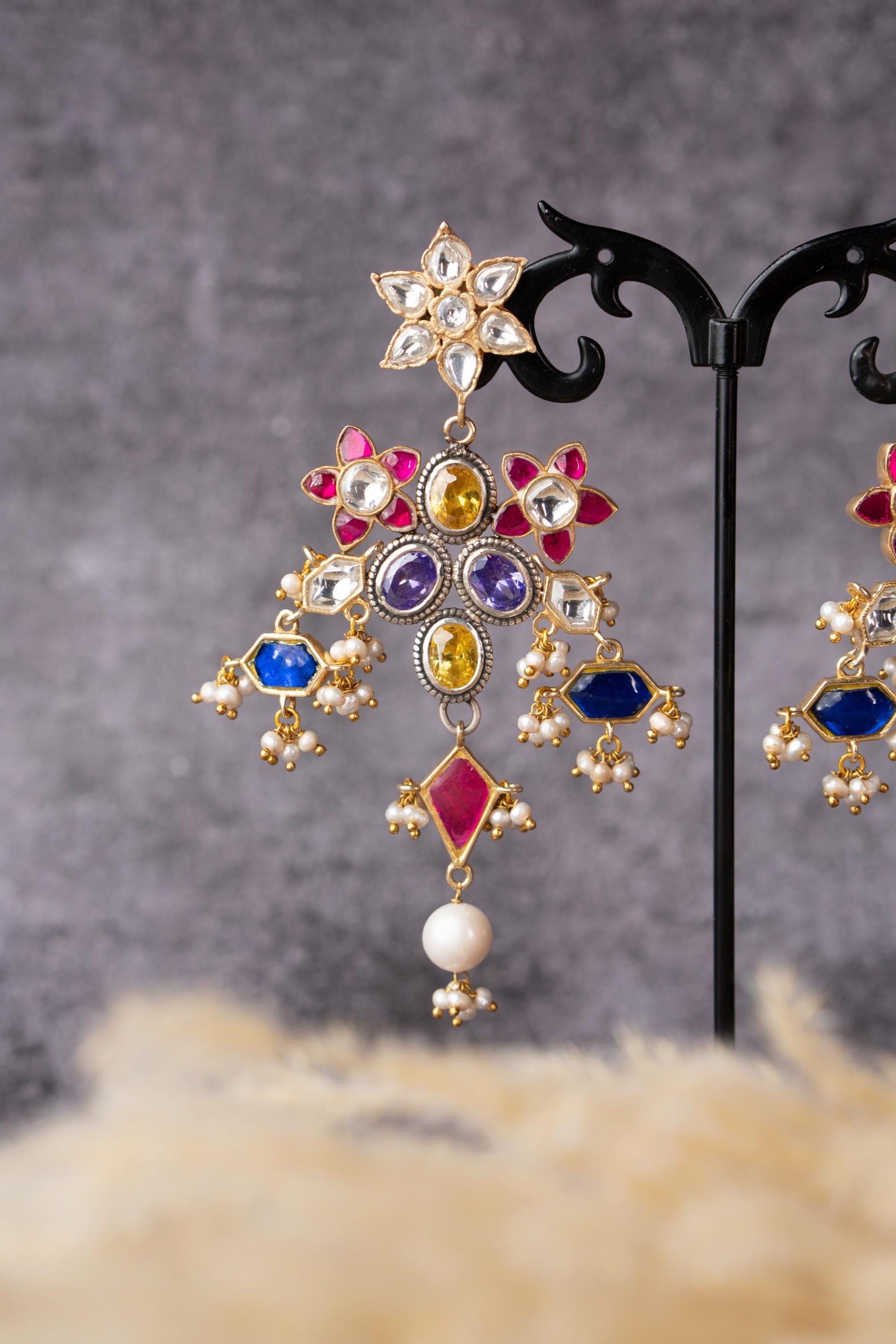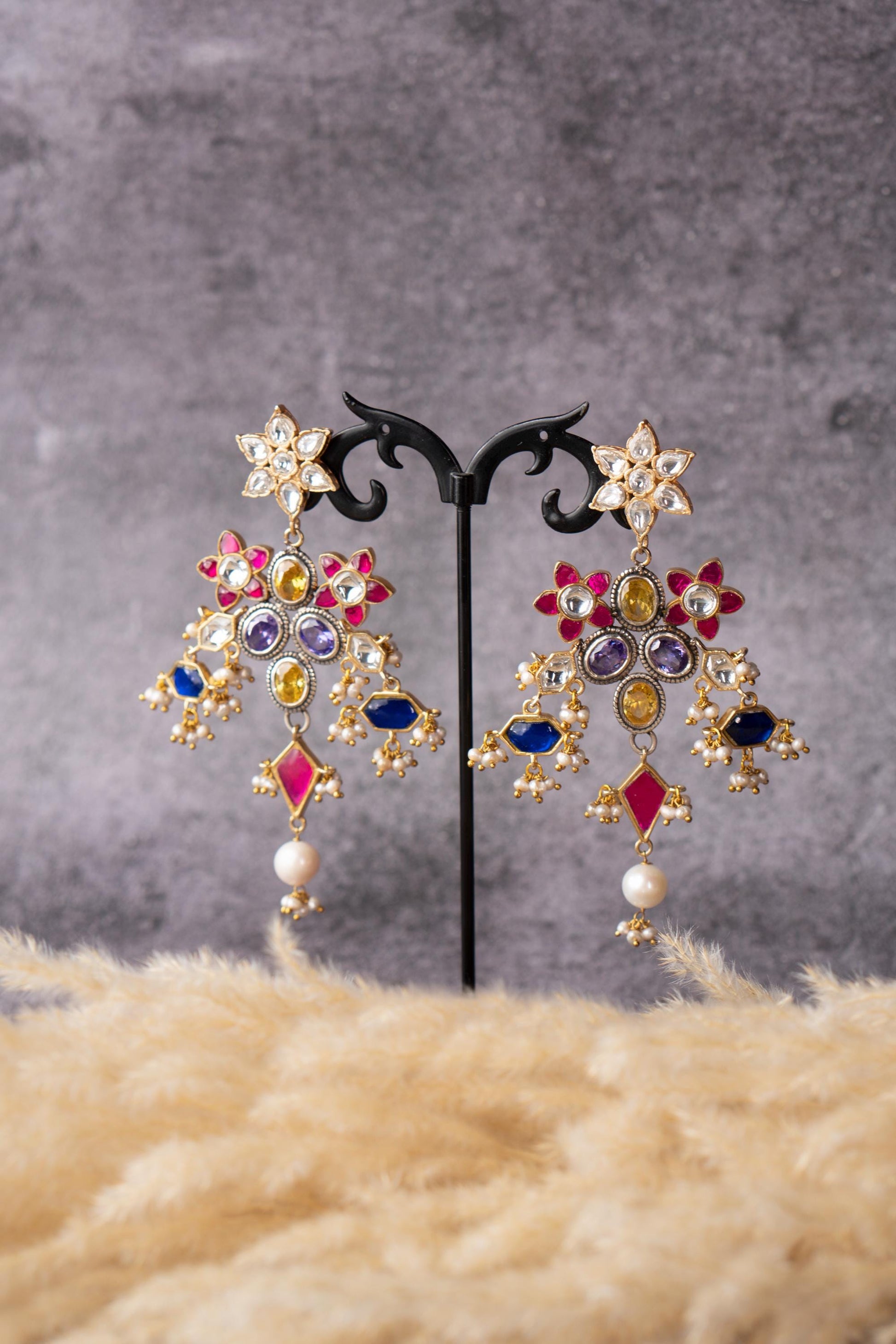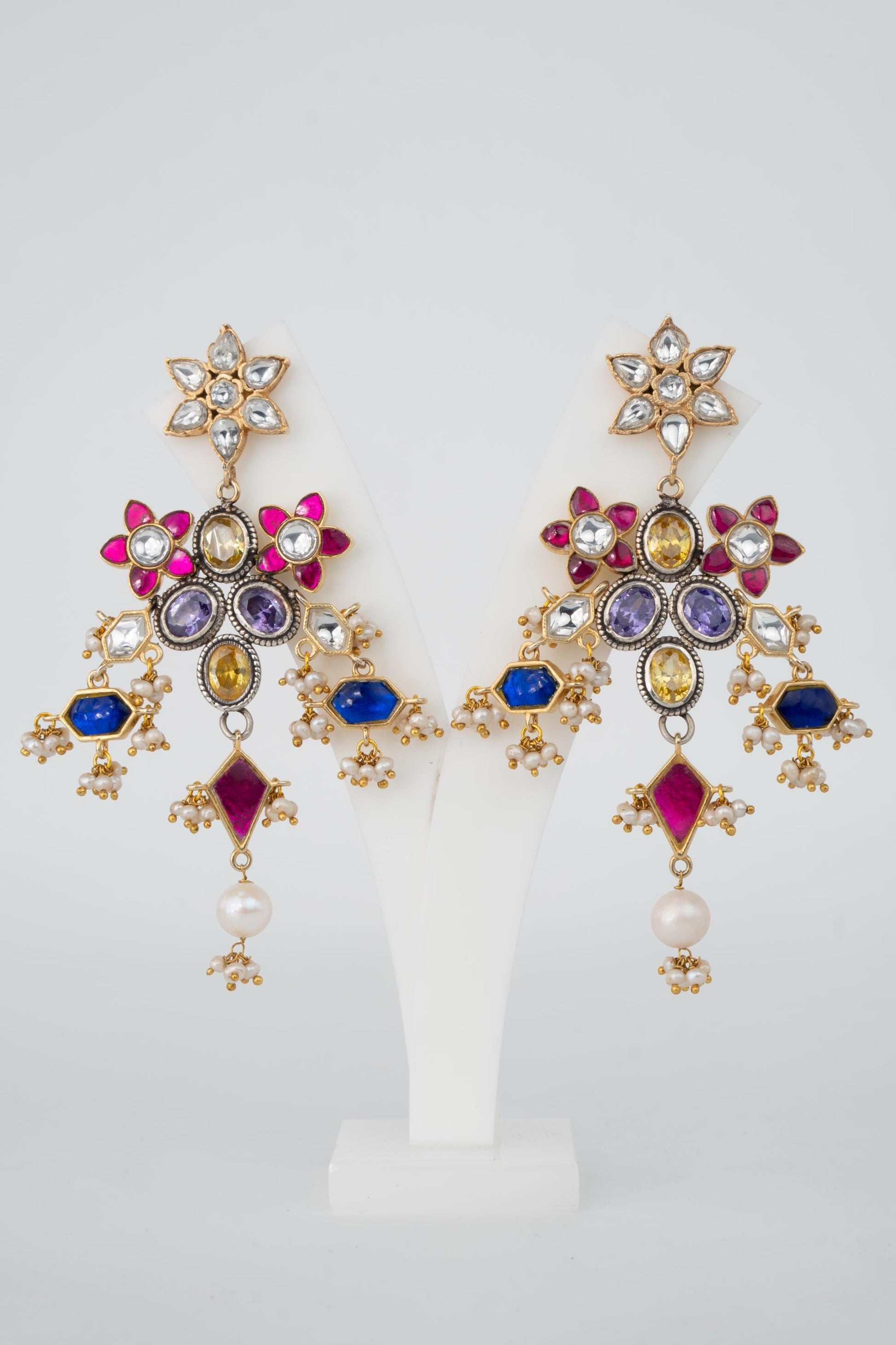Make a royal statement with these Mughal style multicolor Kundan earrings, exquisitely handcrafted with vibrant ruby red, royal blue, violet, and golden yellow stones, accented by traditional Kundan work, faux pearls, and floral motifs. These bridal statement earrings are a true celebration of Indian heritage and craftsmanship.