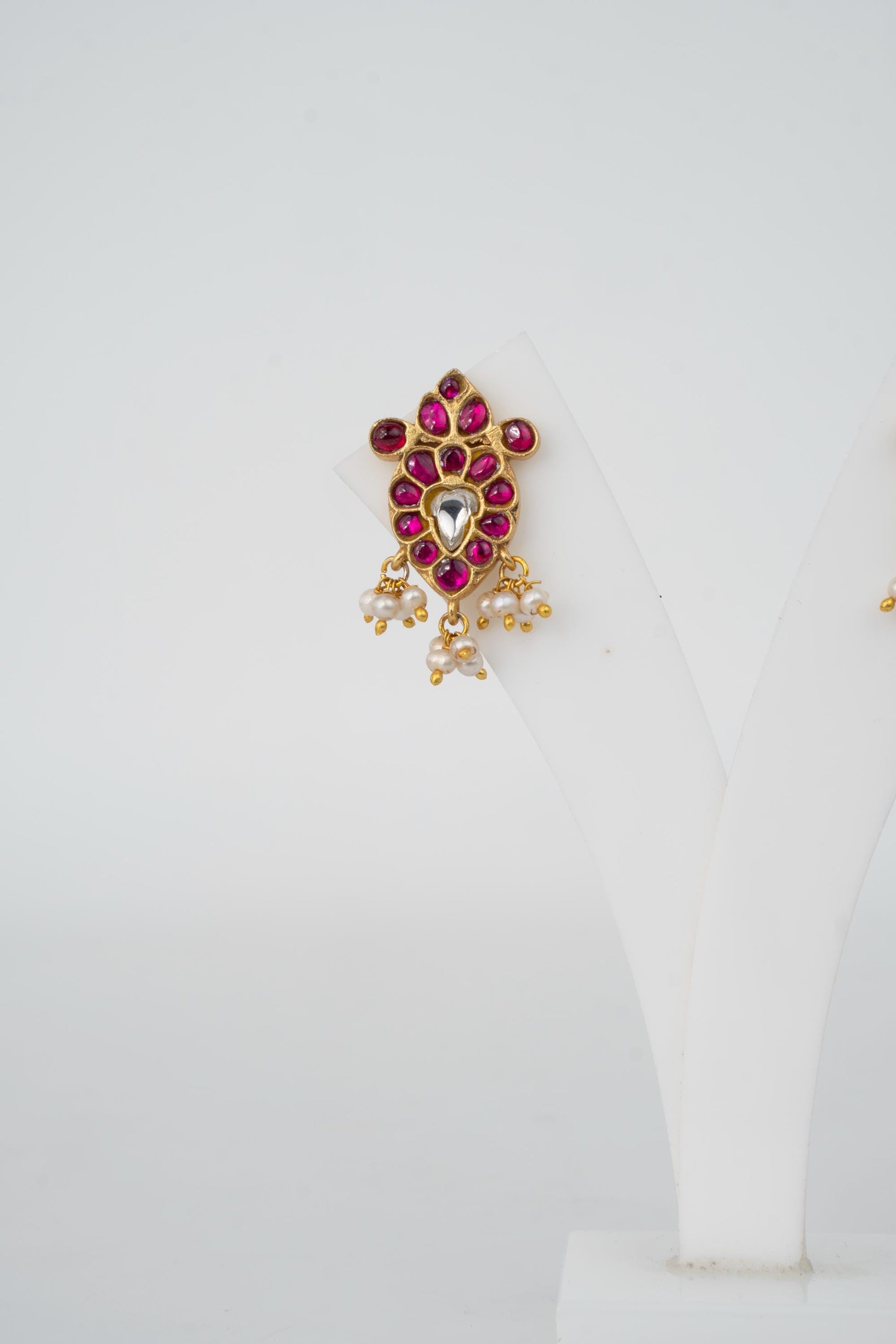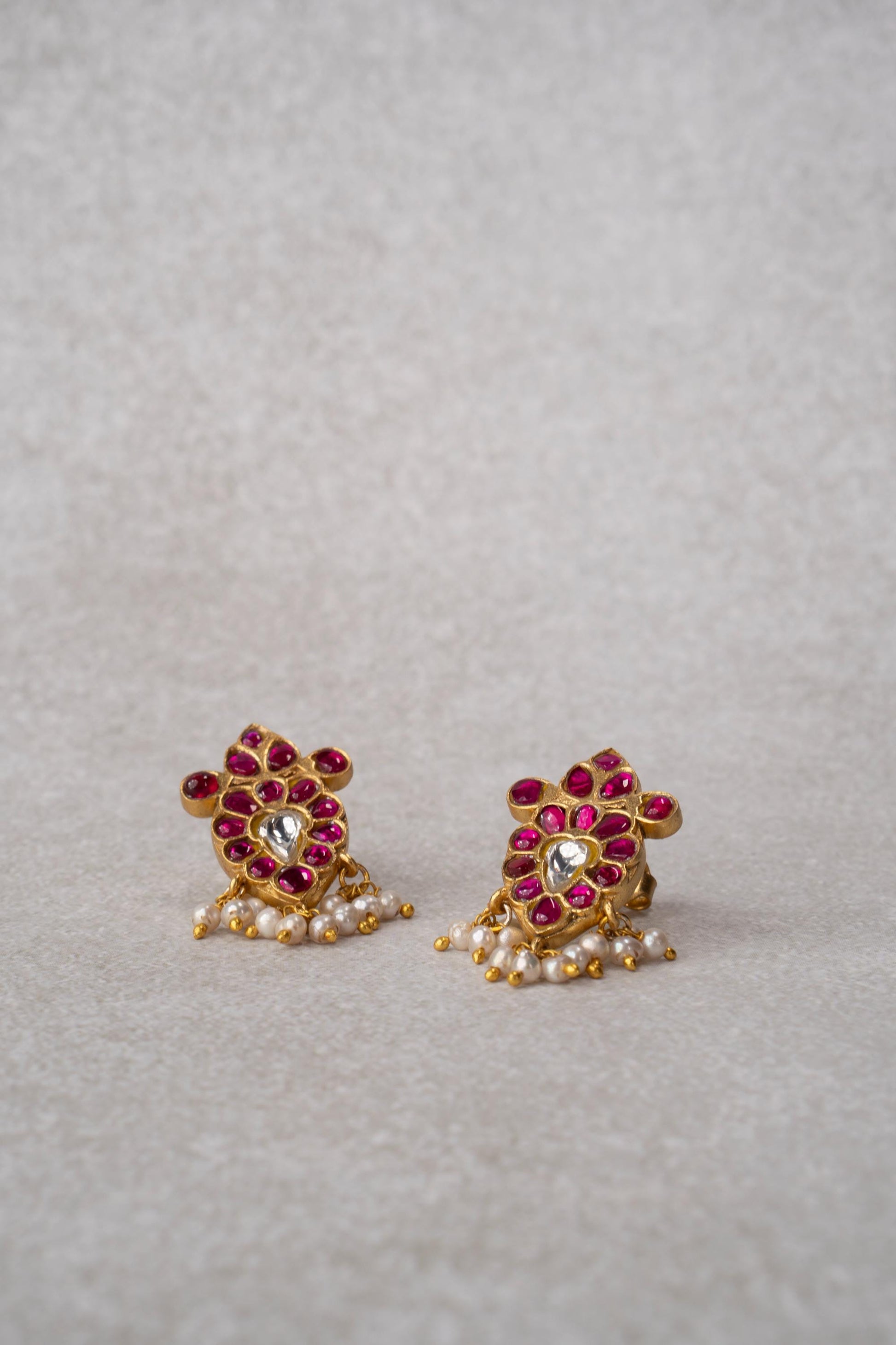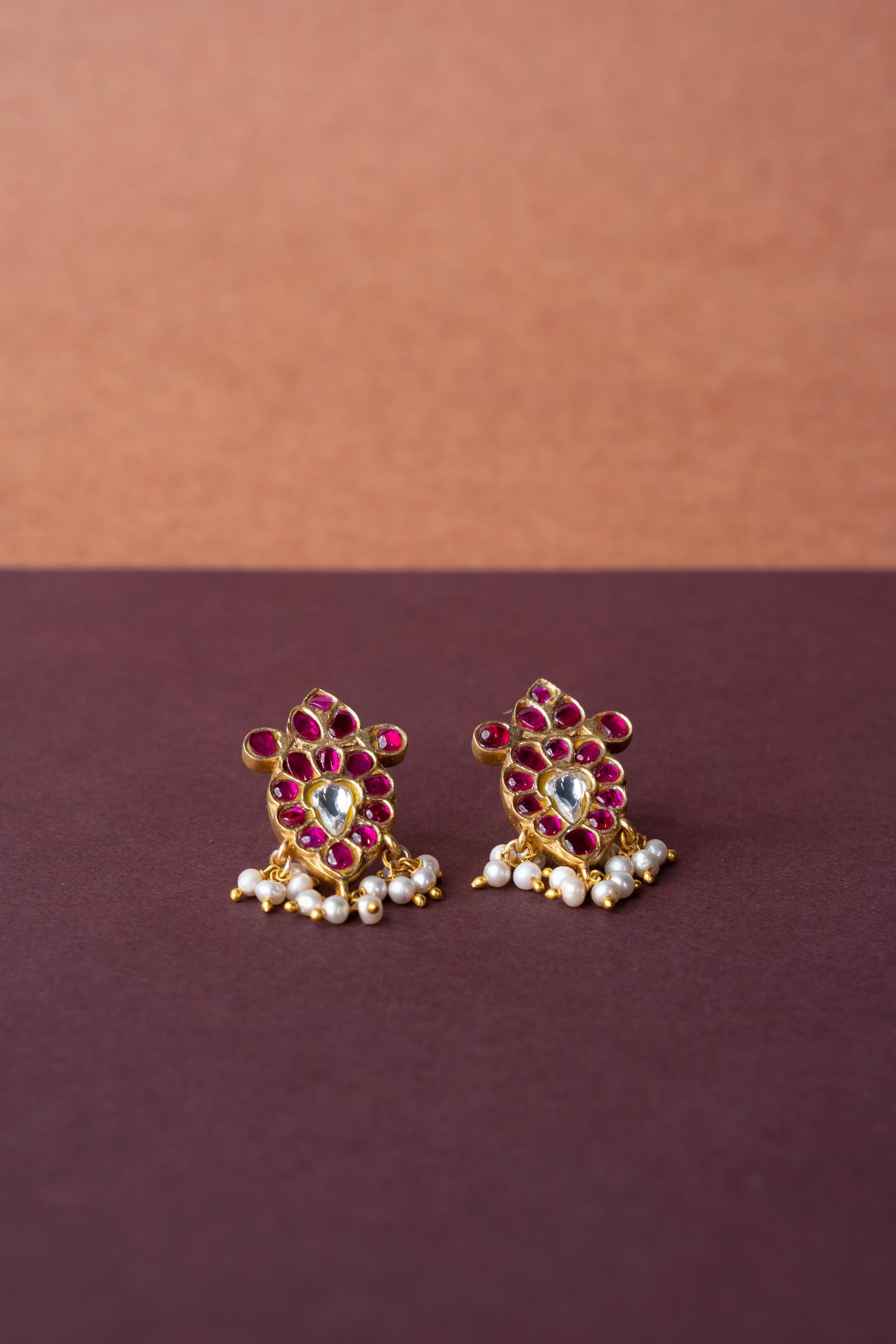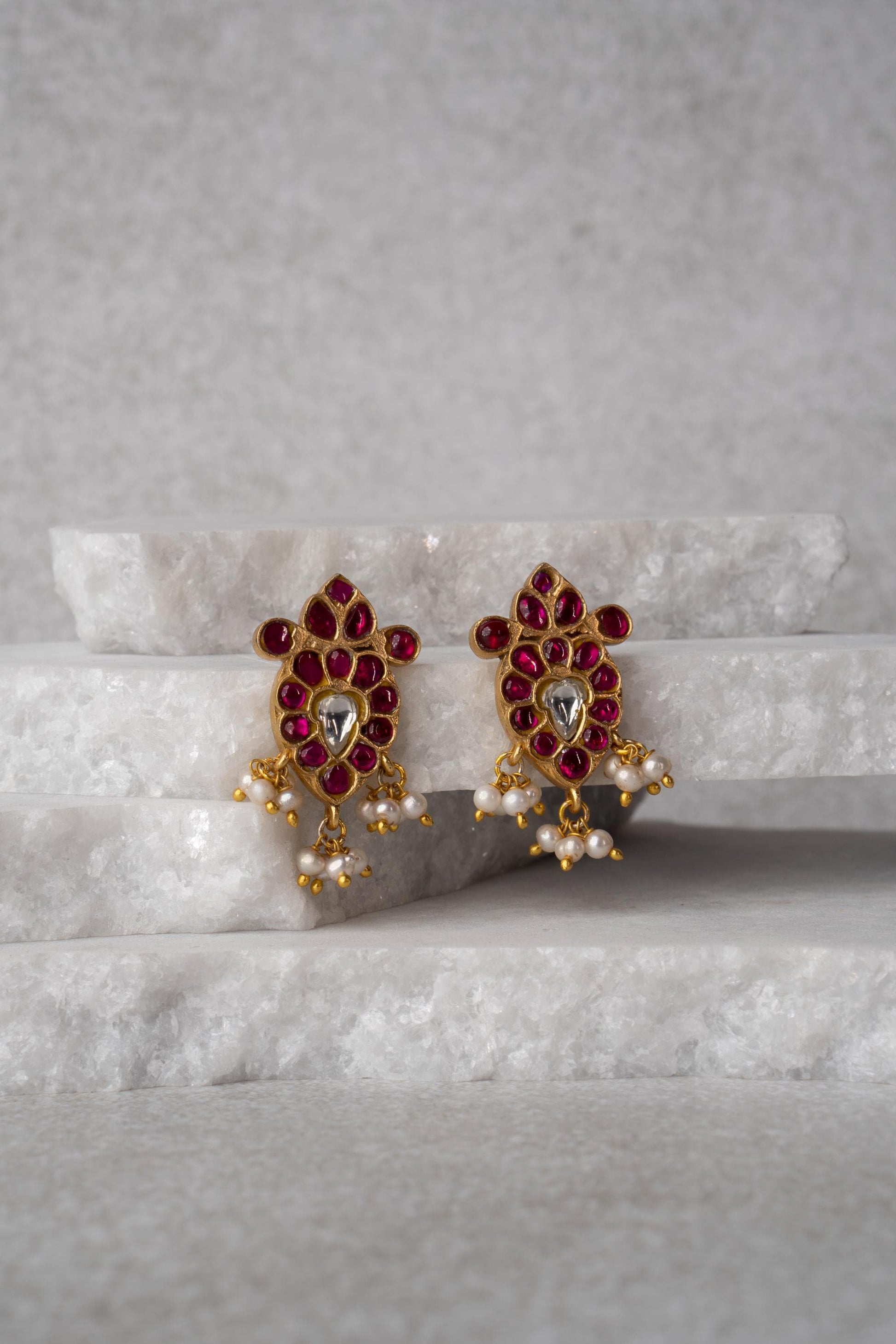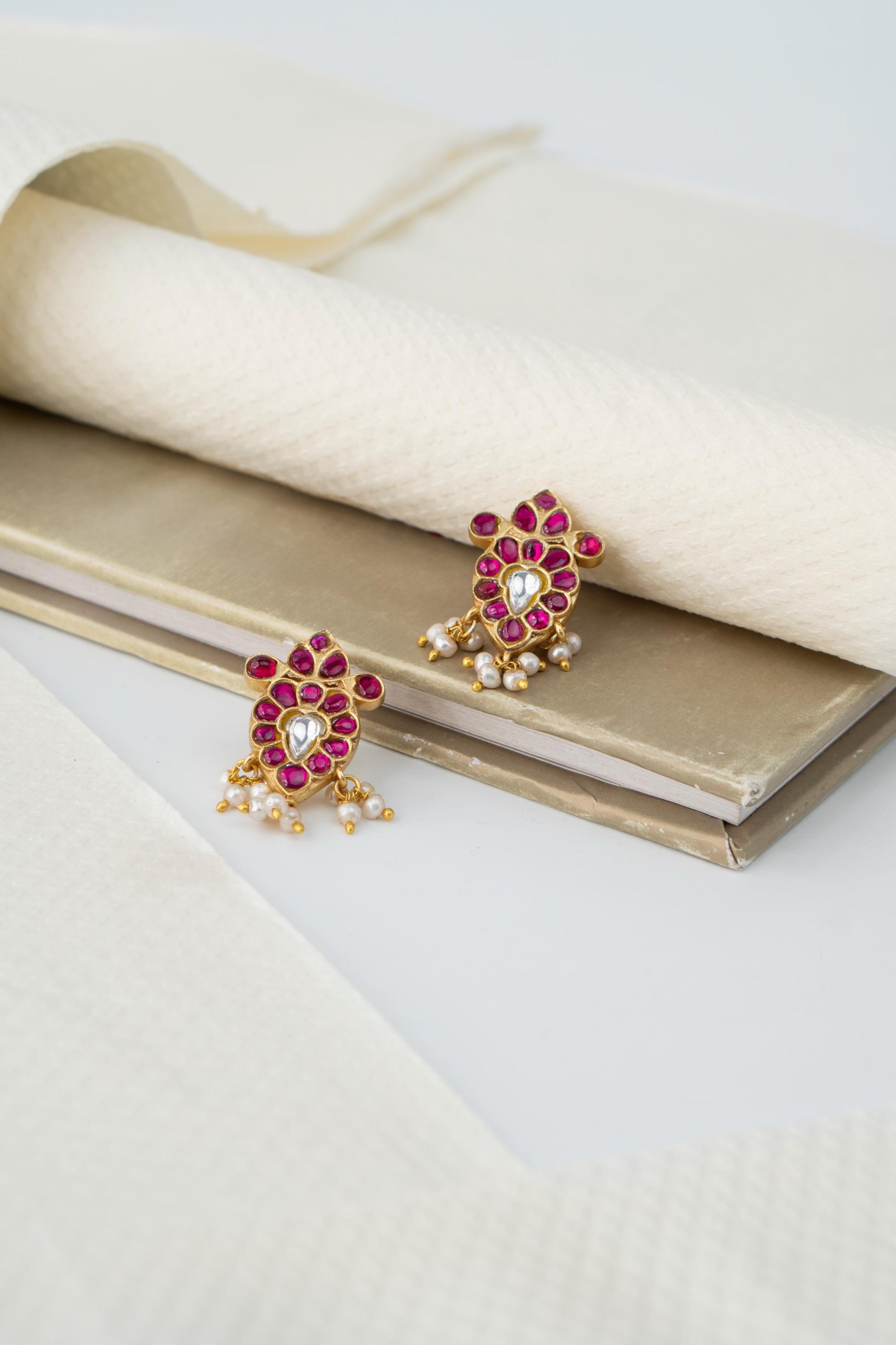 Unveil your royal charm with the Gulroj, a stunning pair of earrings adorned with deep ruby-red stones arranged in a petal pattern. A central teardrop-shaped kundan stone adds a radiant highlight, while delicate pearl danglers lend movement and grace. Perfect for weddings, festivities, or adding a touch of regal elegance to your look.