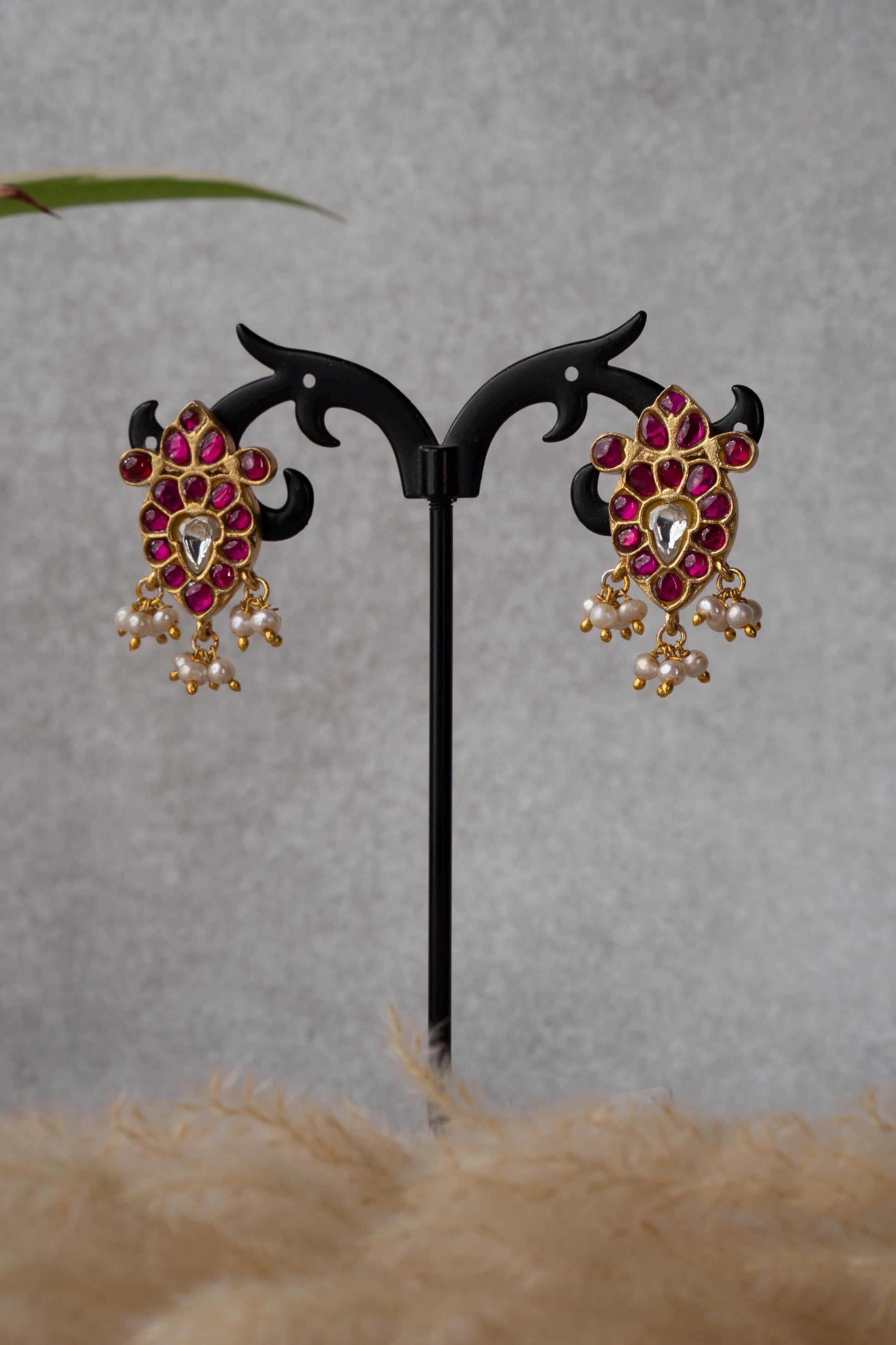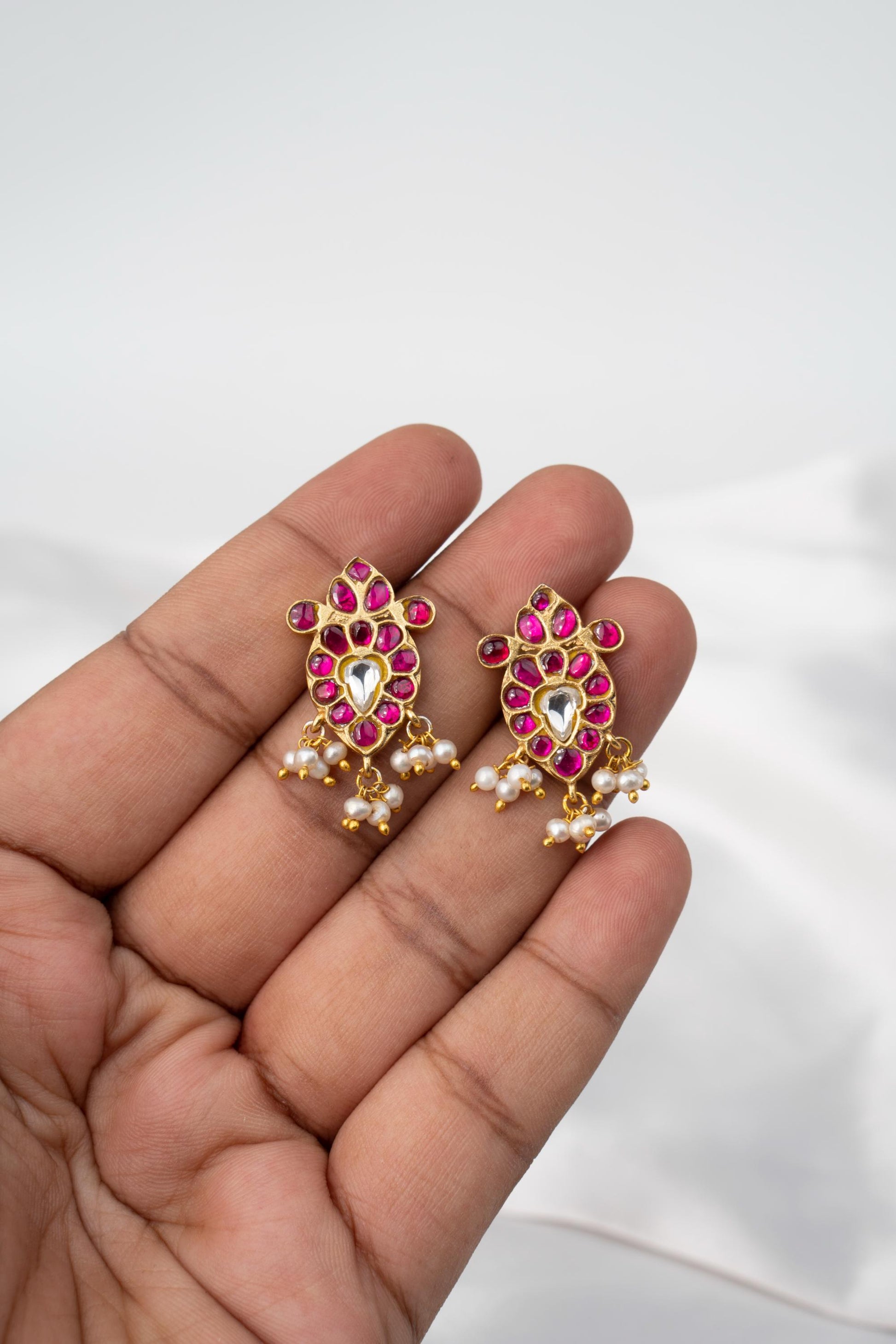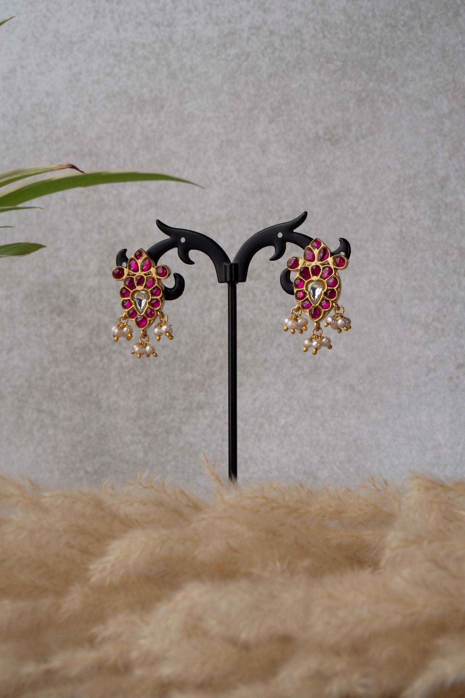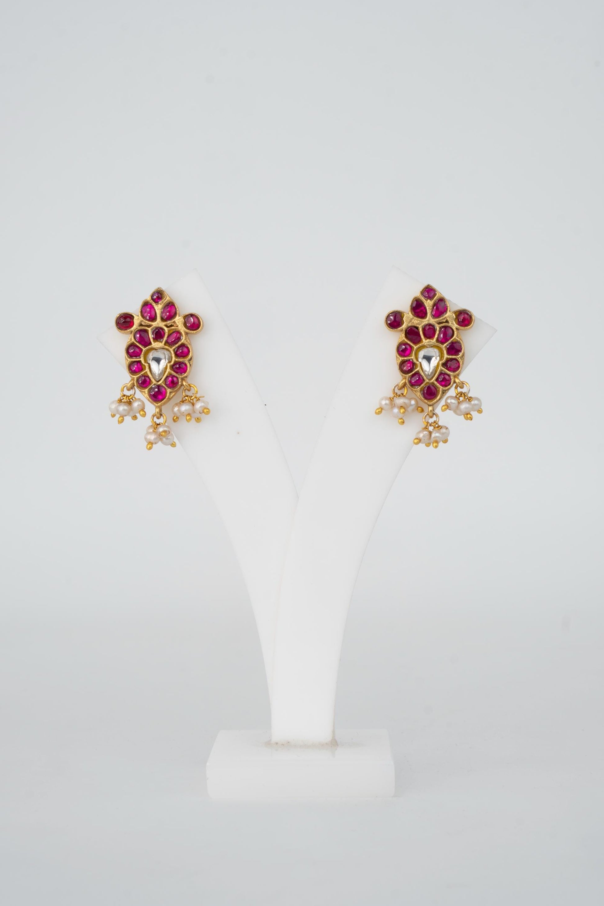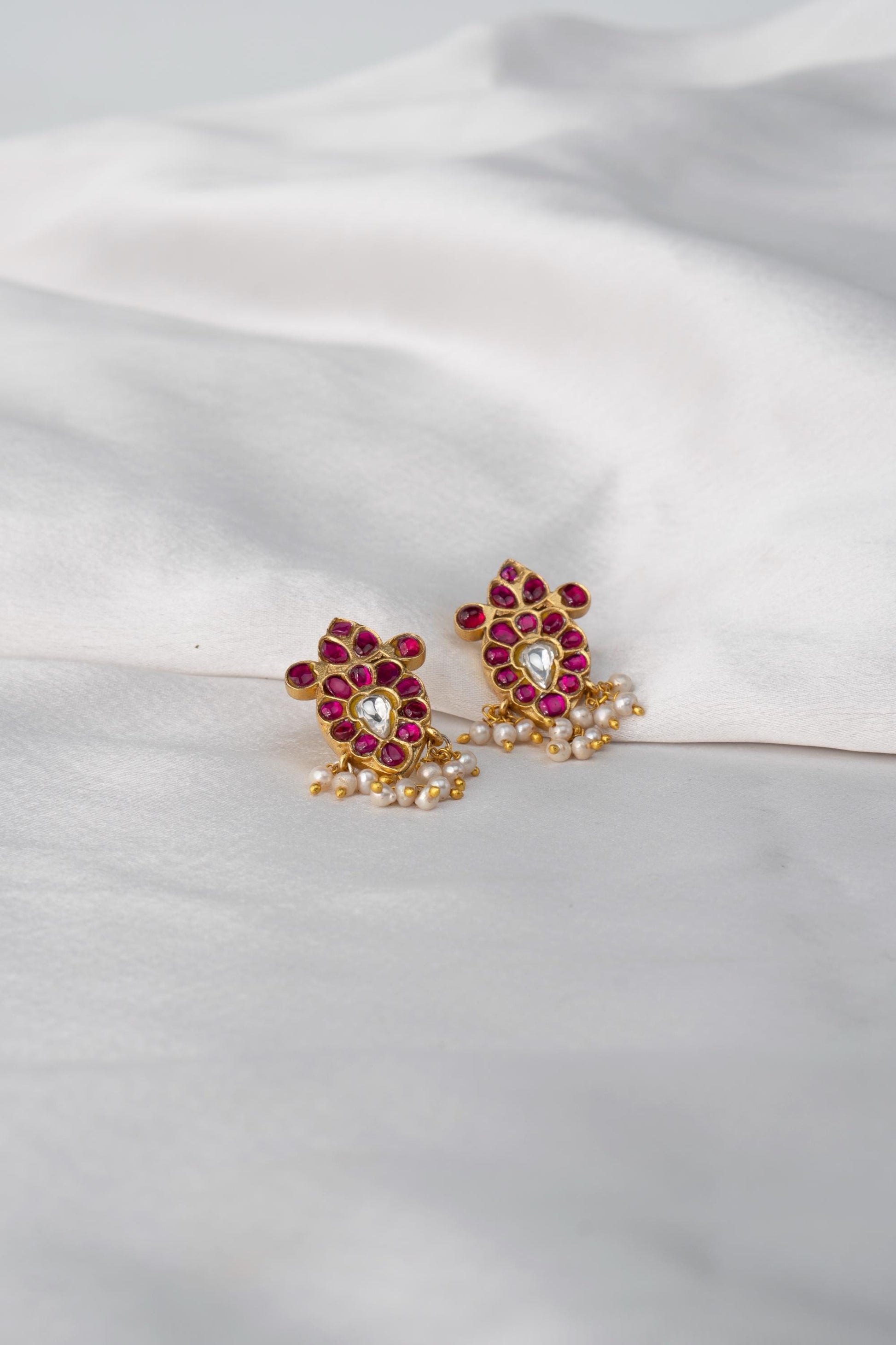 Unveil your royal charm with the Gulroj, a stunning pair of earrings adorned with deep ruby-red stones arranged in a petal pattern. A central teardrop-shaped kundan stone adds a radiant highlight, while delicate pearl danglers lend movement and grace. Perfect for weddings, festivities, or adding a touch of regal elegance to your look.