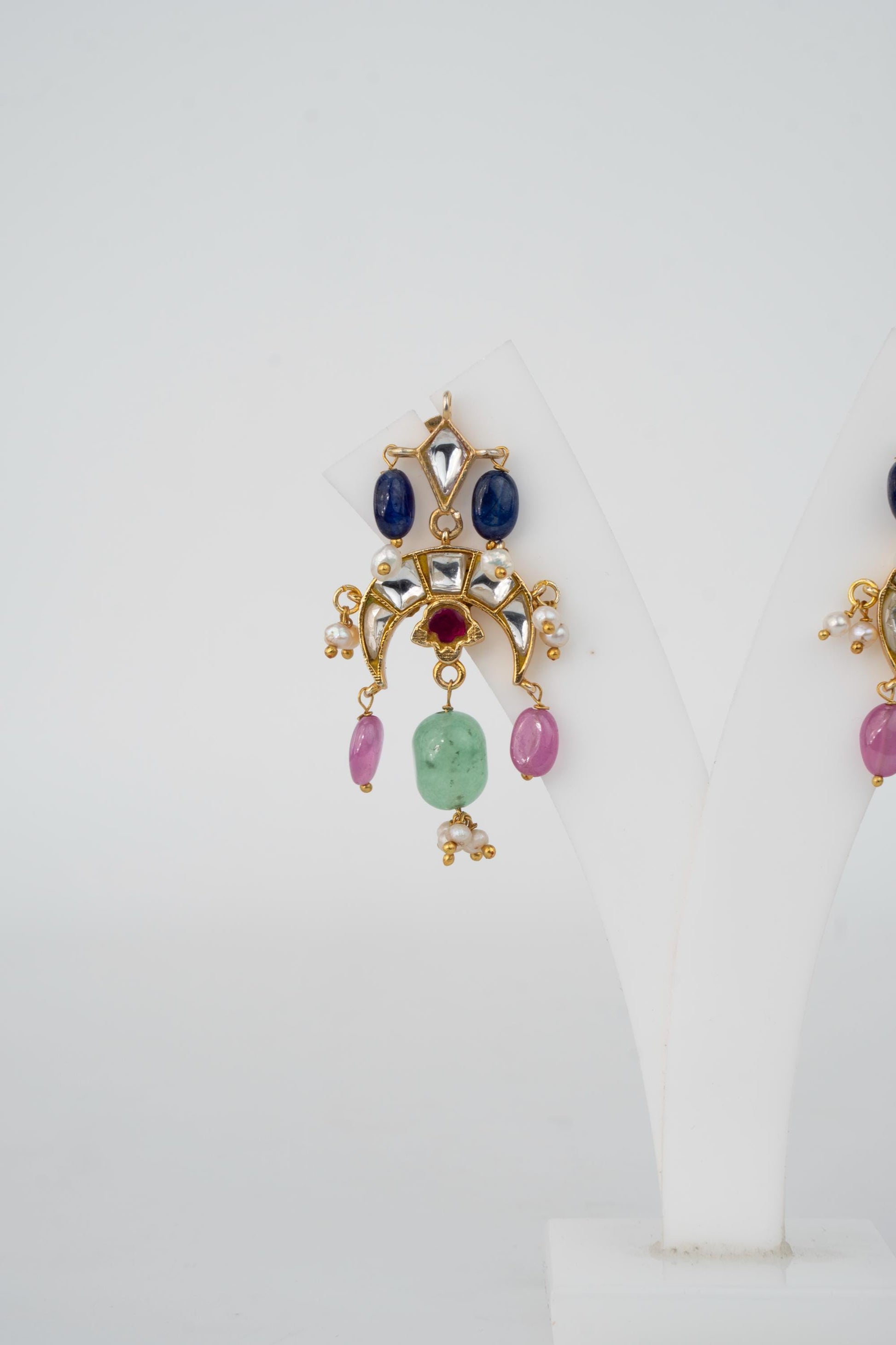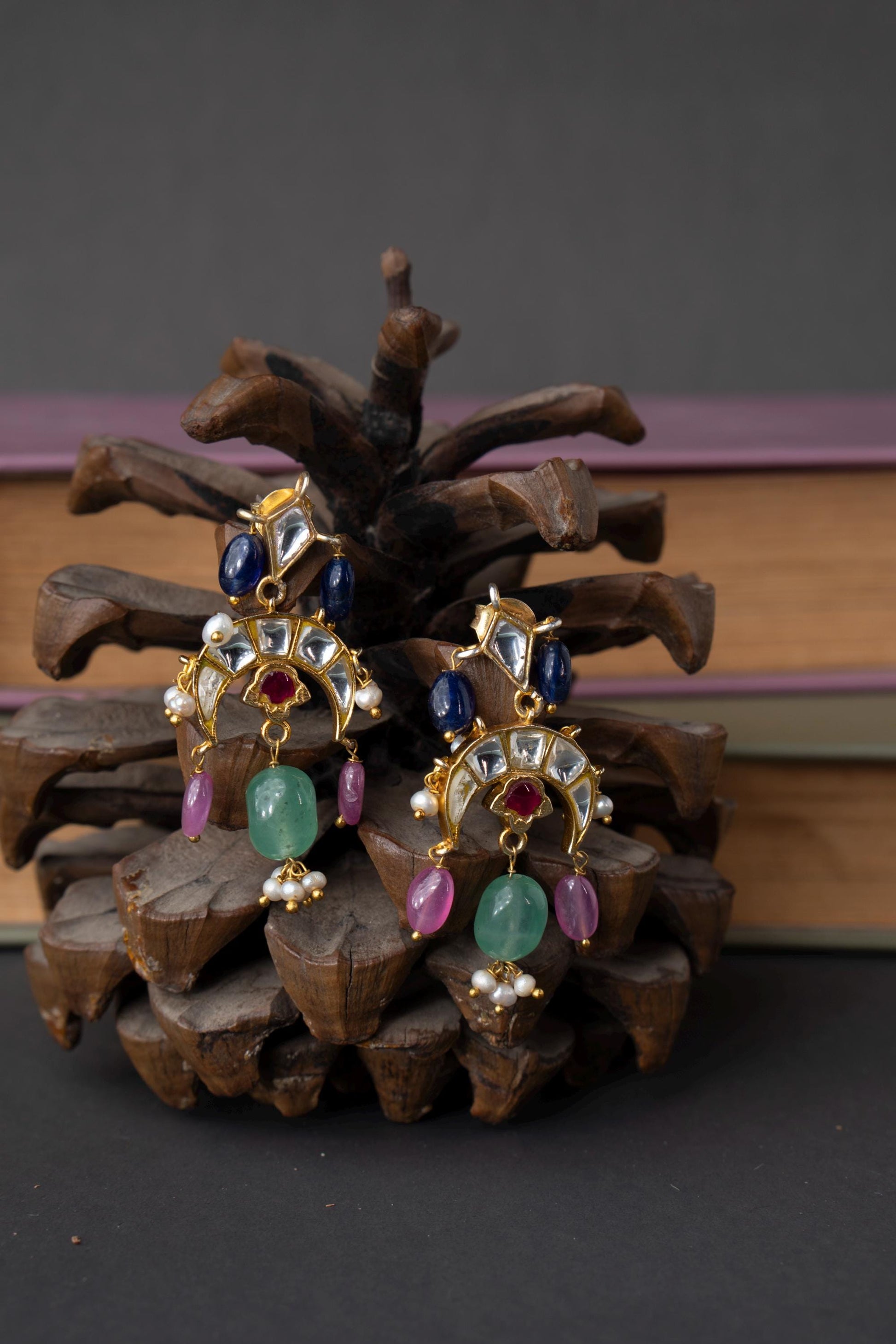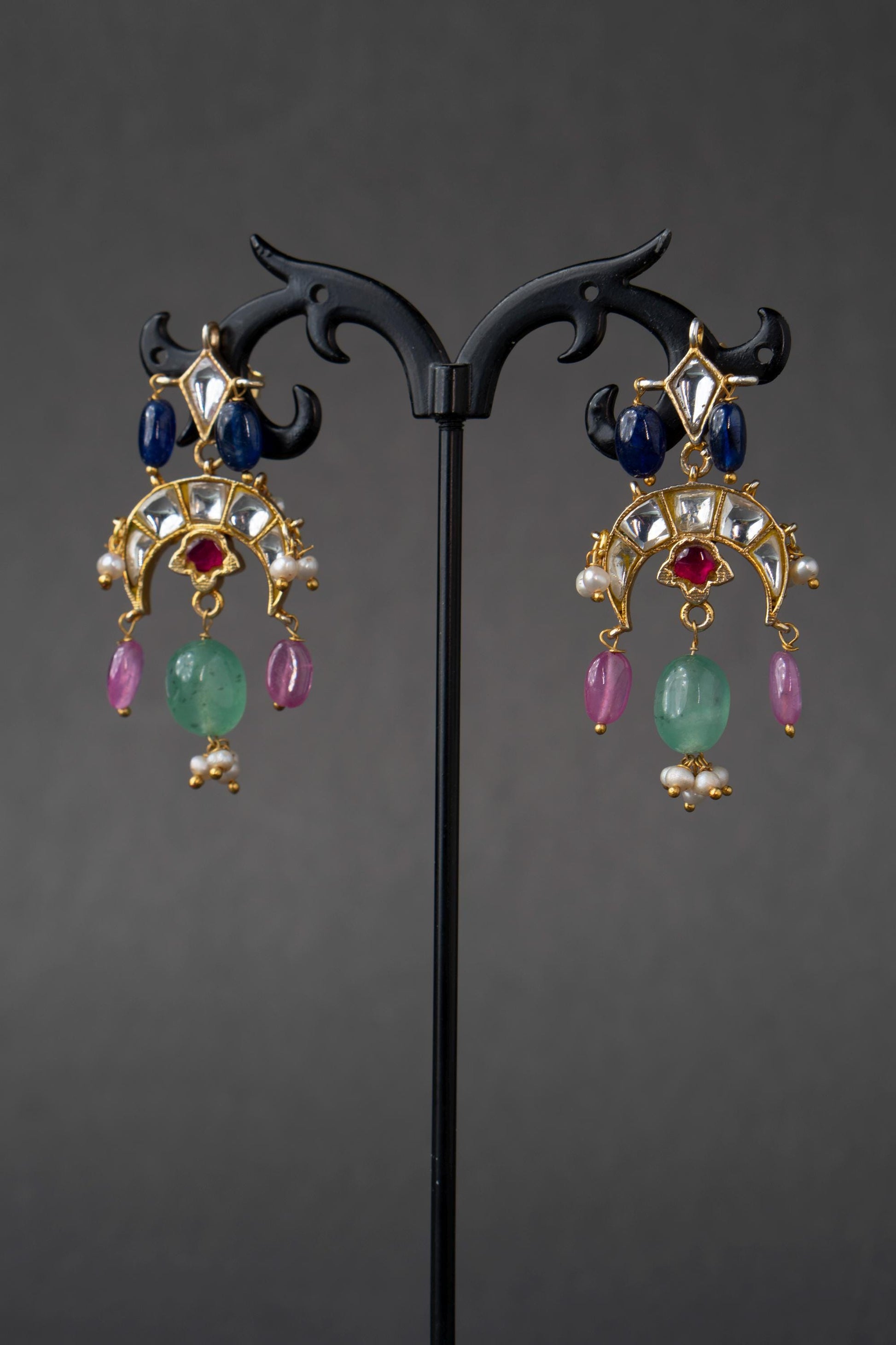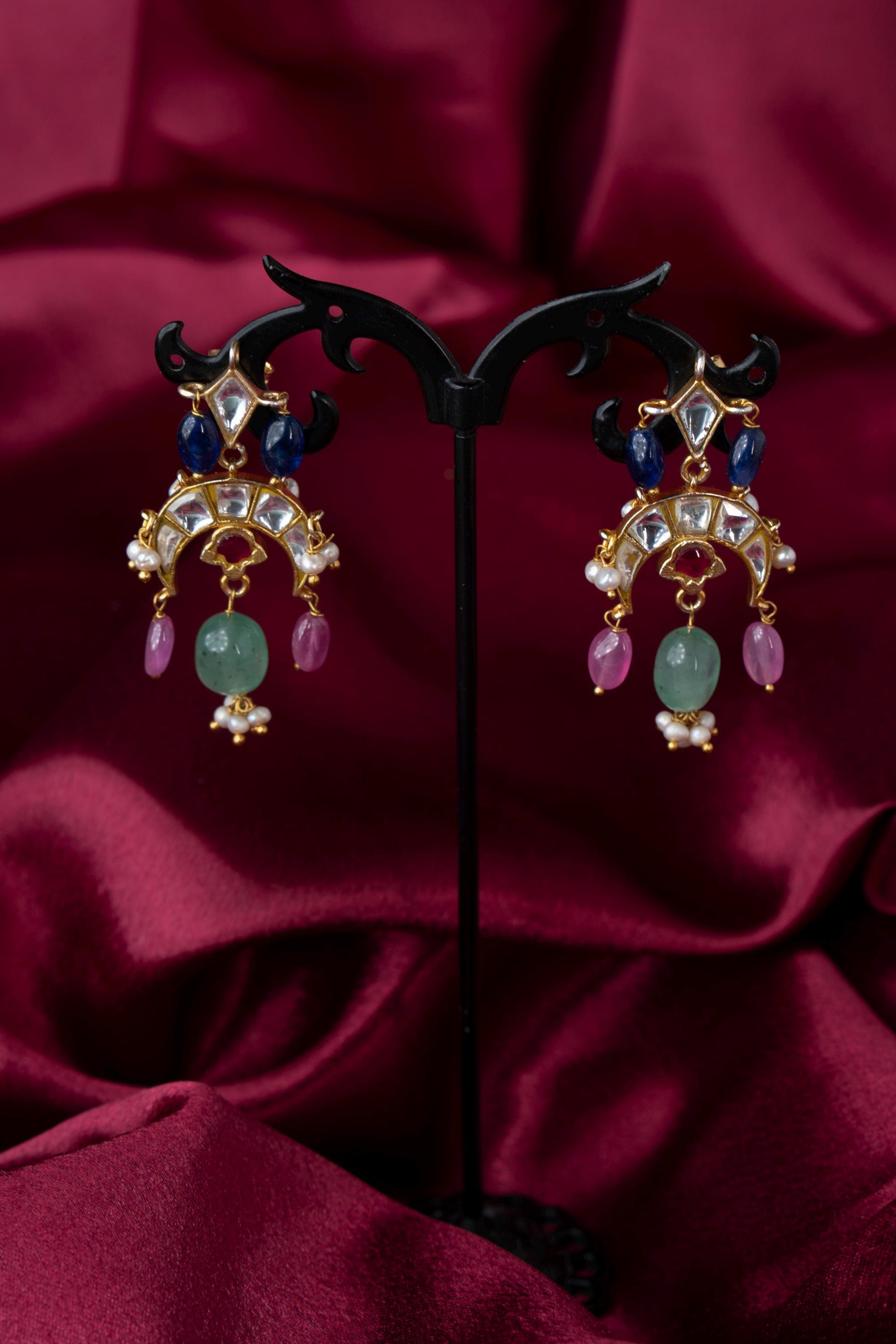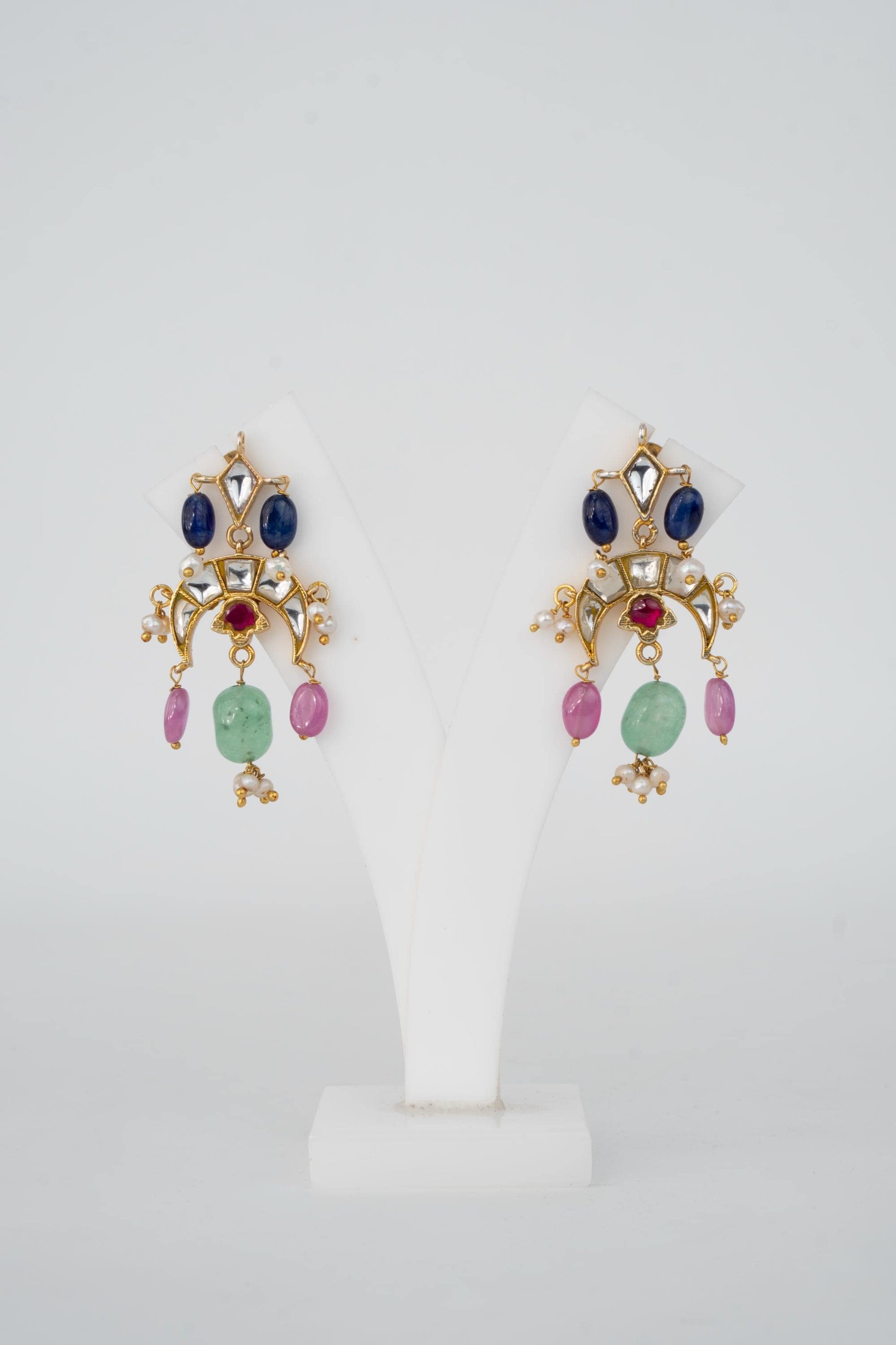 Manhar is a stunning pair of traditional kundan earrings that exudes royal elegance and vibrant charm. Crafted with precision, these earrings feature a beautifully balanced layout of deep blue sapphire-hued stones, triangular and hexagonal kundan glasswork, and a bold ruby centerpiece. Dangling below are green and pink gemstone beads that add a colorful, festive flair, along with dainty clusters of pearls for a luxurious finishing touch.