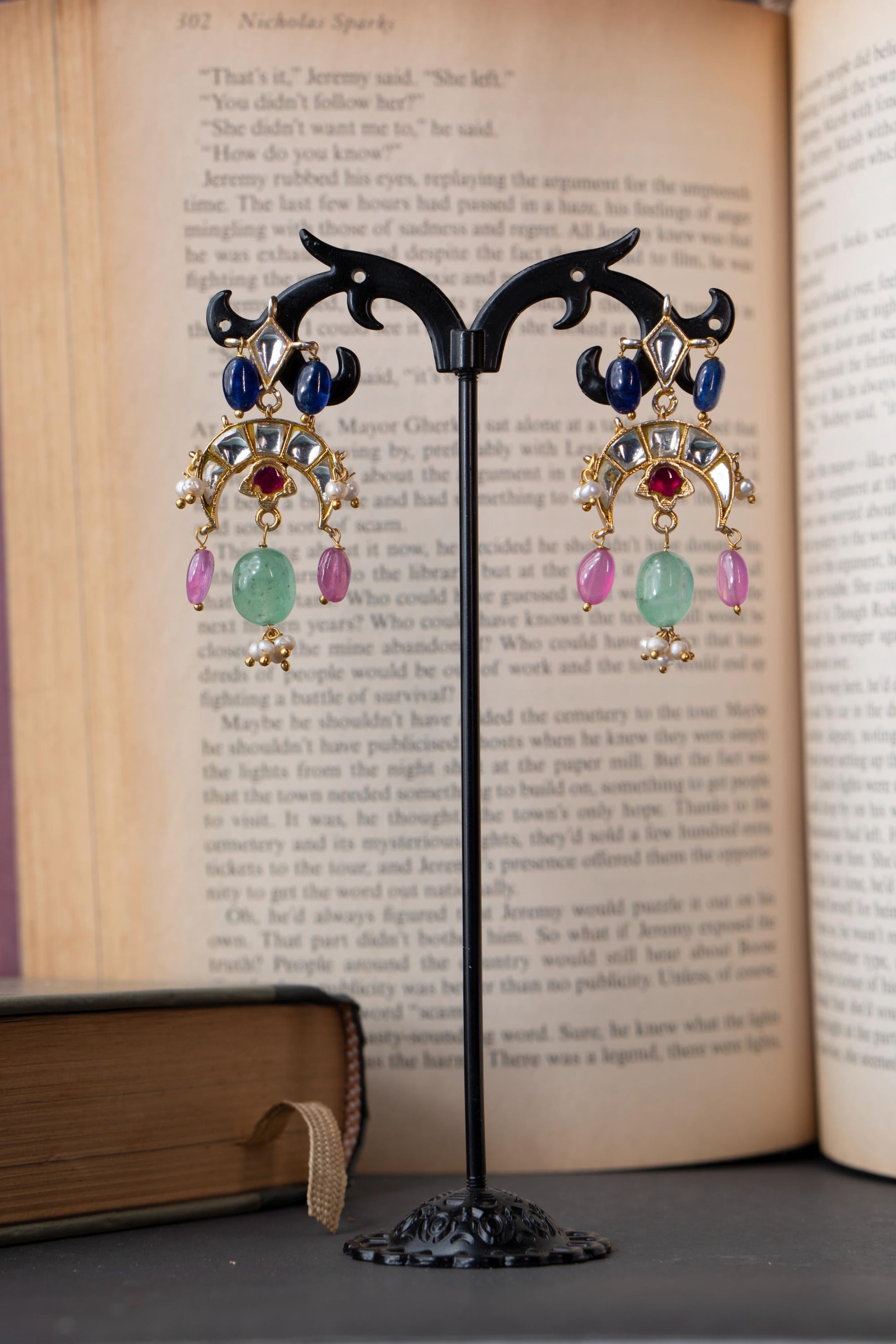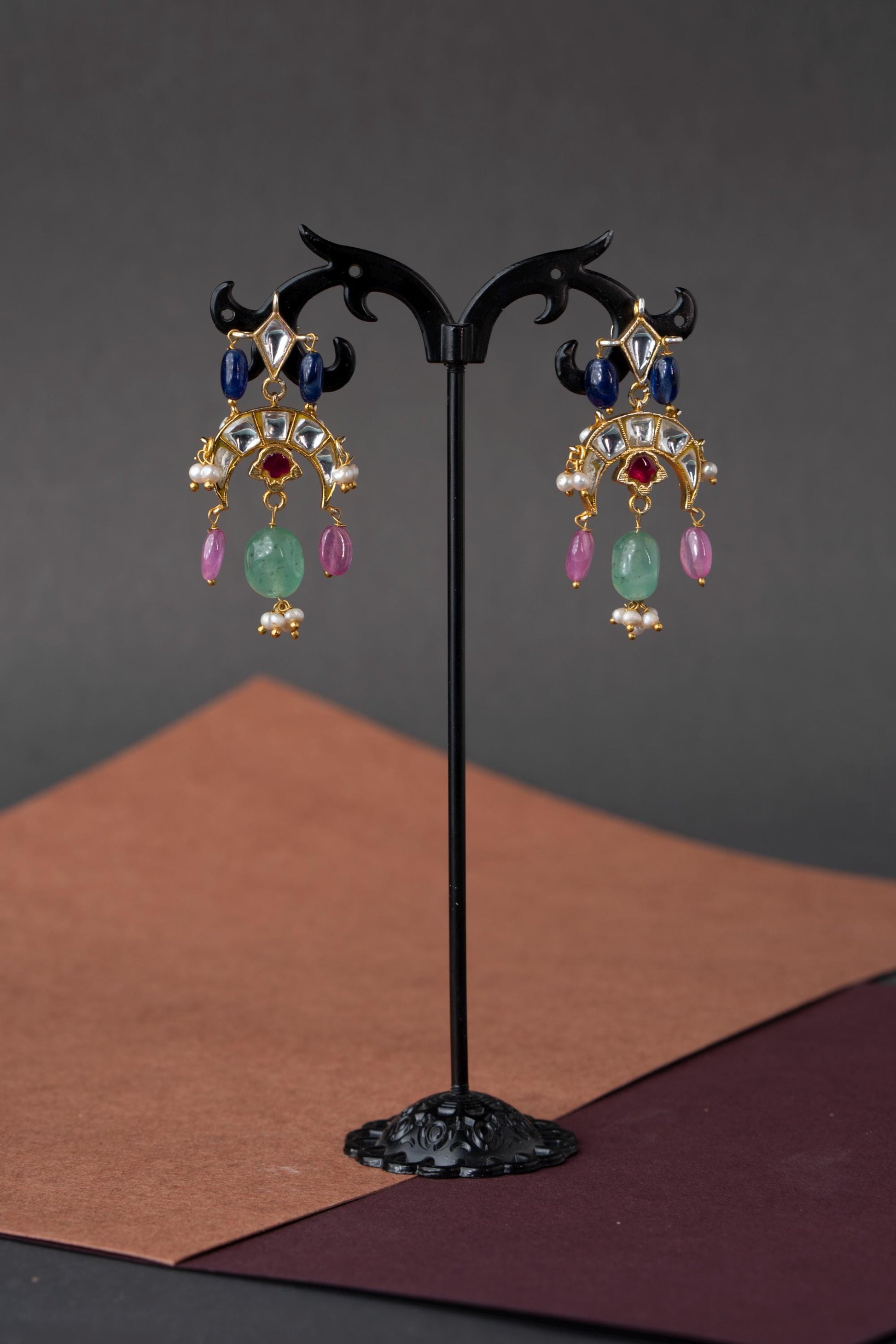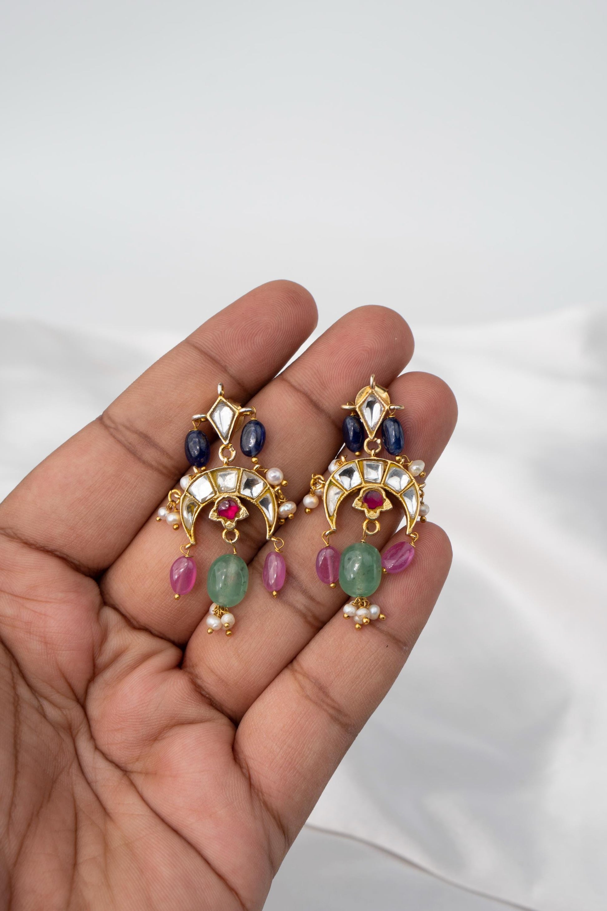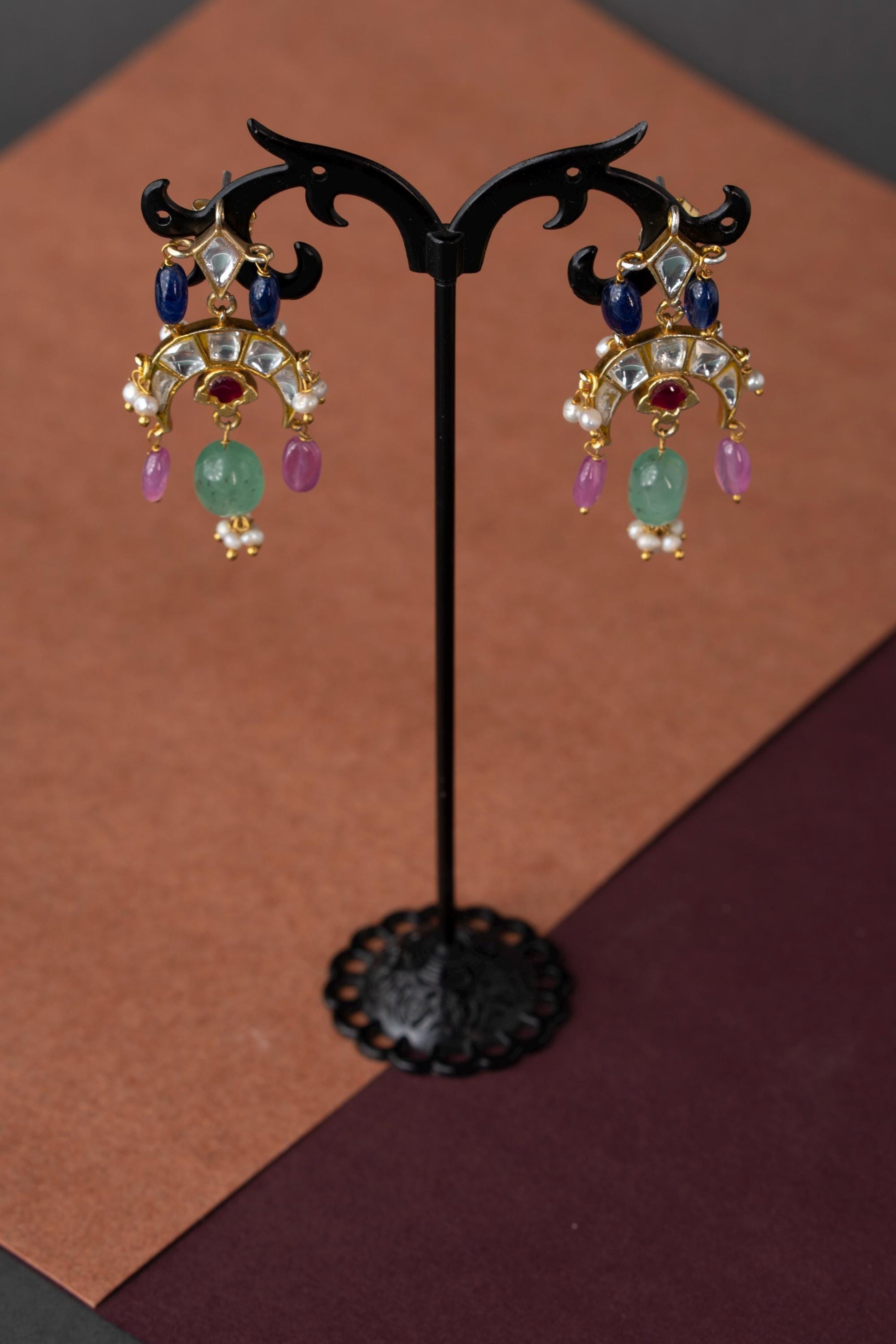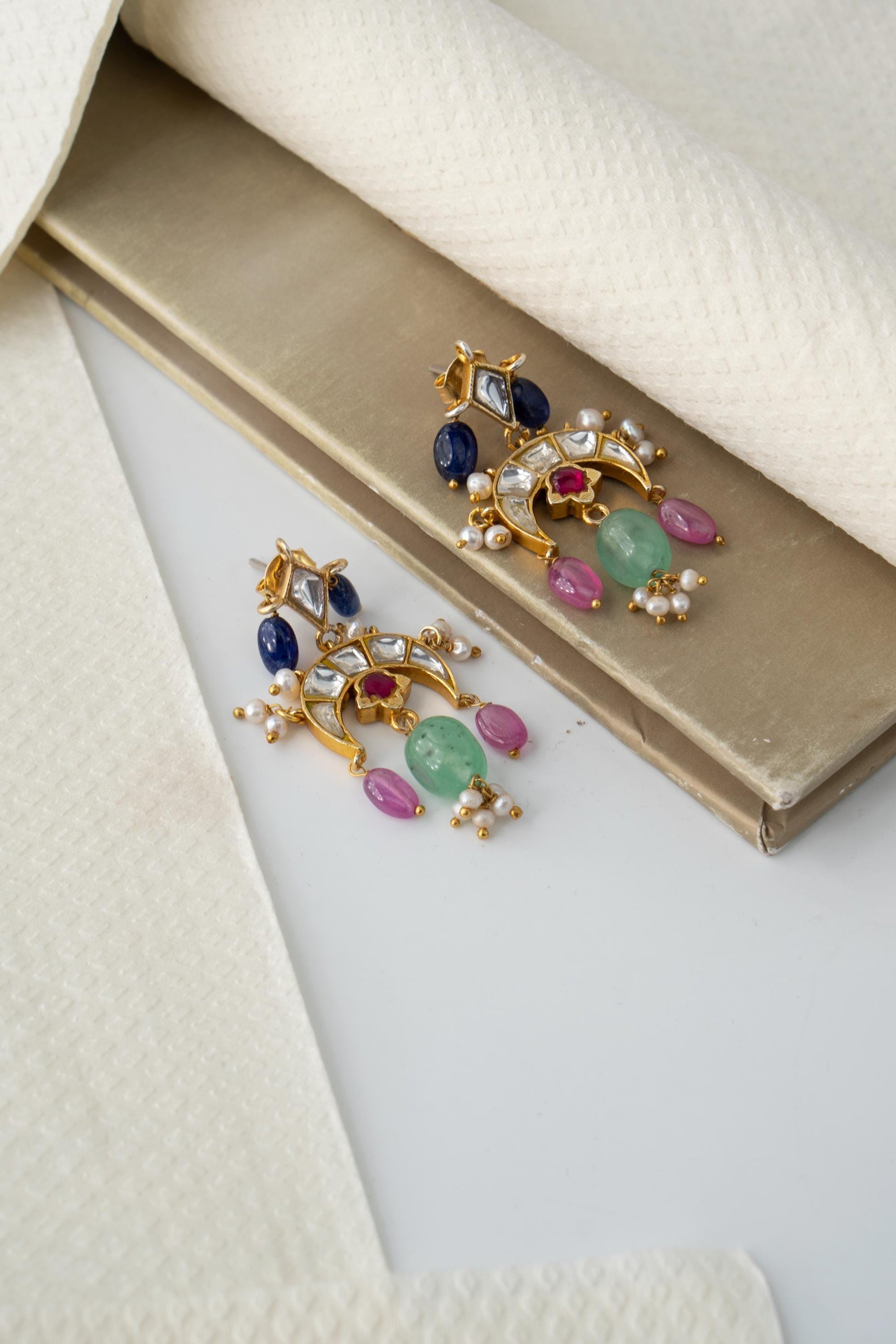 Manhar is a stunning pair of traditional kundan earrings that exudes royal elegance and vibrant charm. Crafted with precision, these earrings feature a beautifully balanced layout of deep blue sapphire-hued stones, triangular and hexagonal kundan glasswork, and a bold ruby centerpiece. Dangling below are green and pink gemstone beads that add a colorful, festive flair, along with dainty clusters of pearls for a luxurious finishing touch.