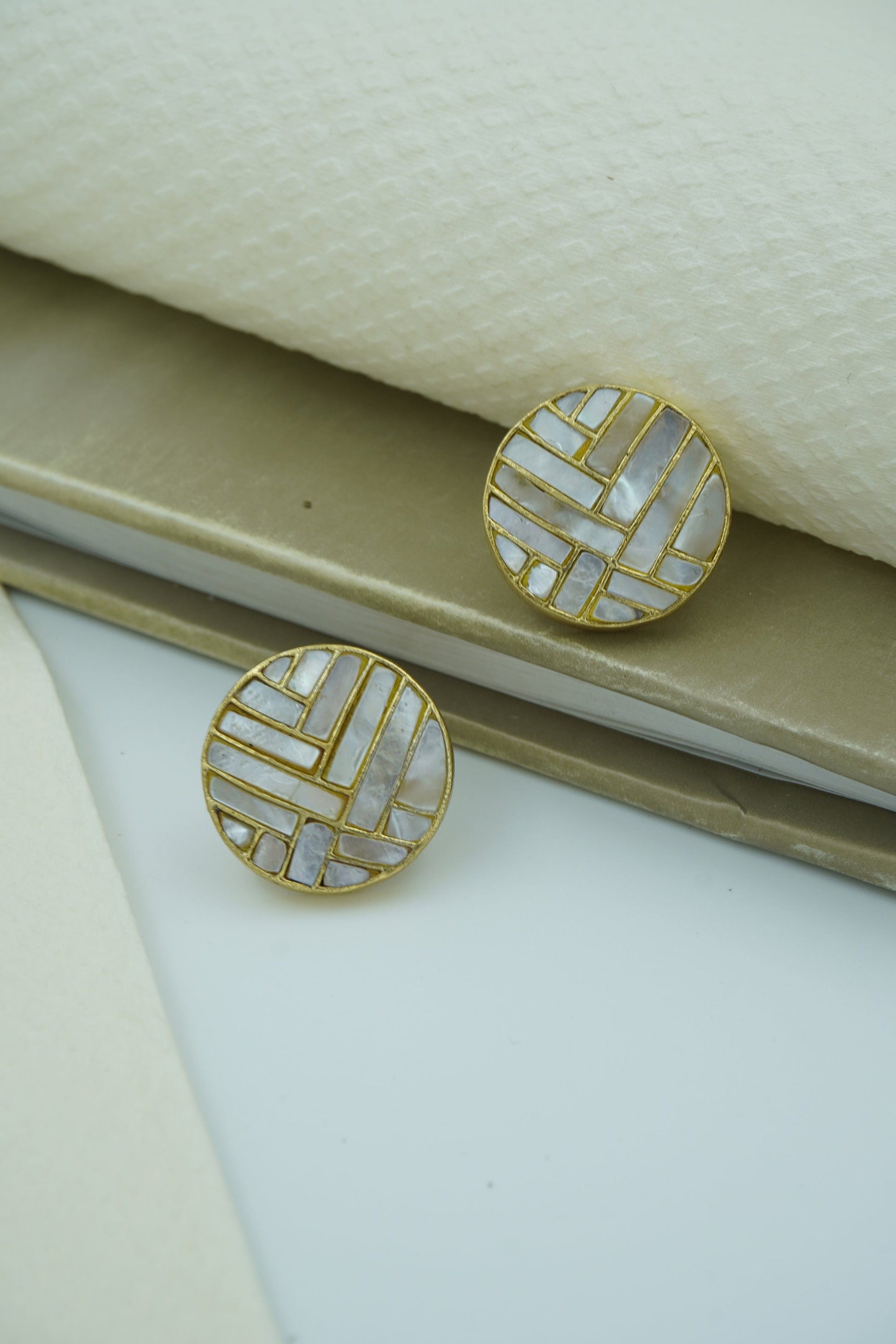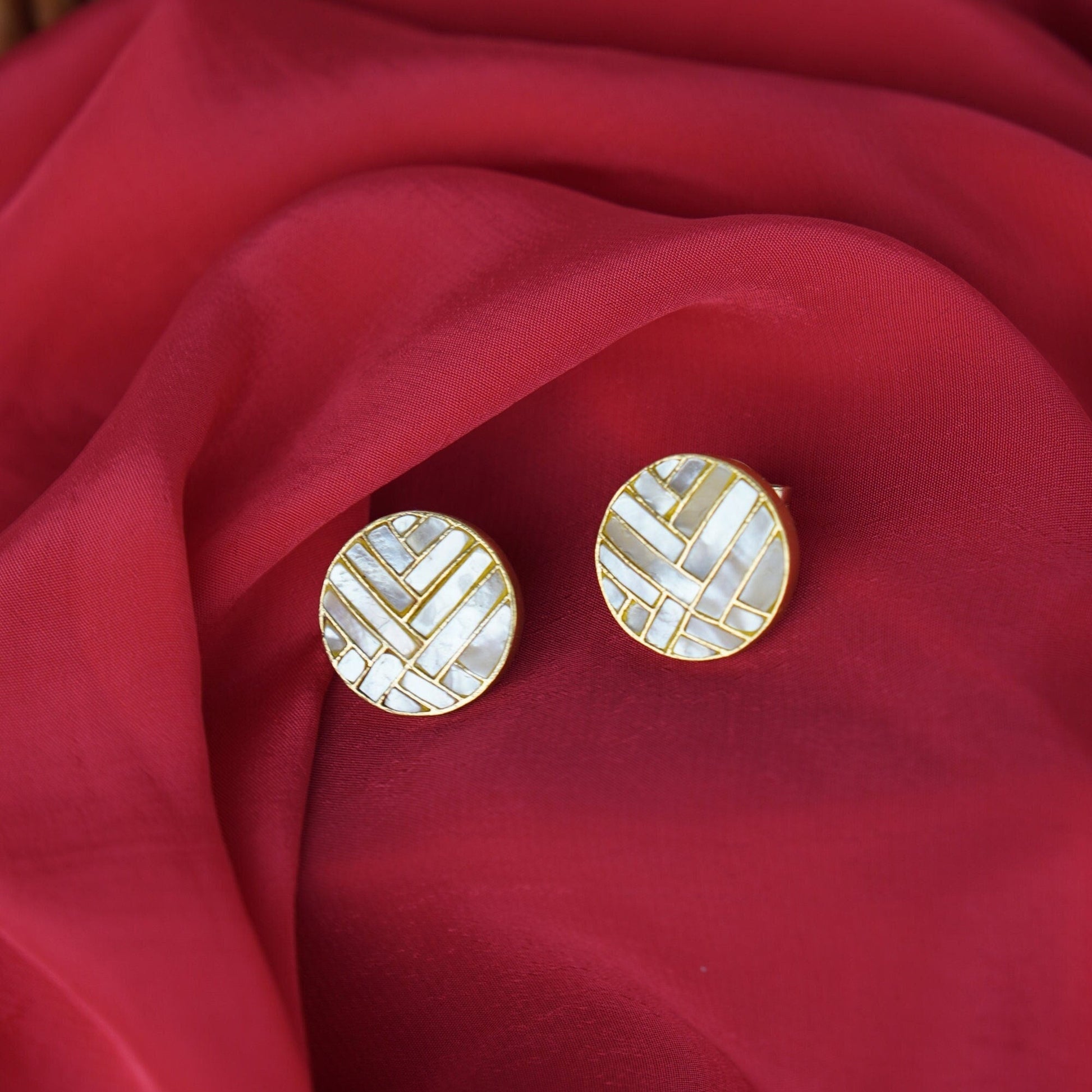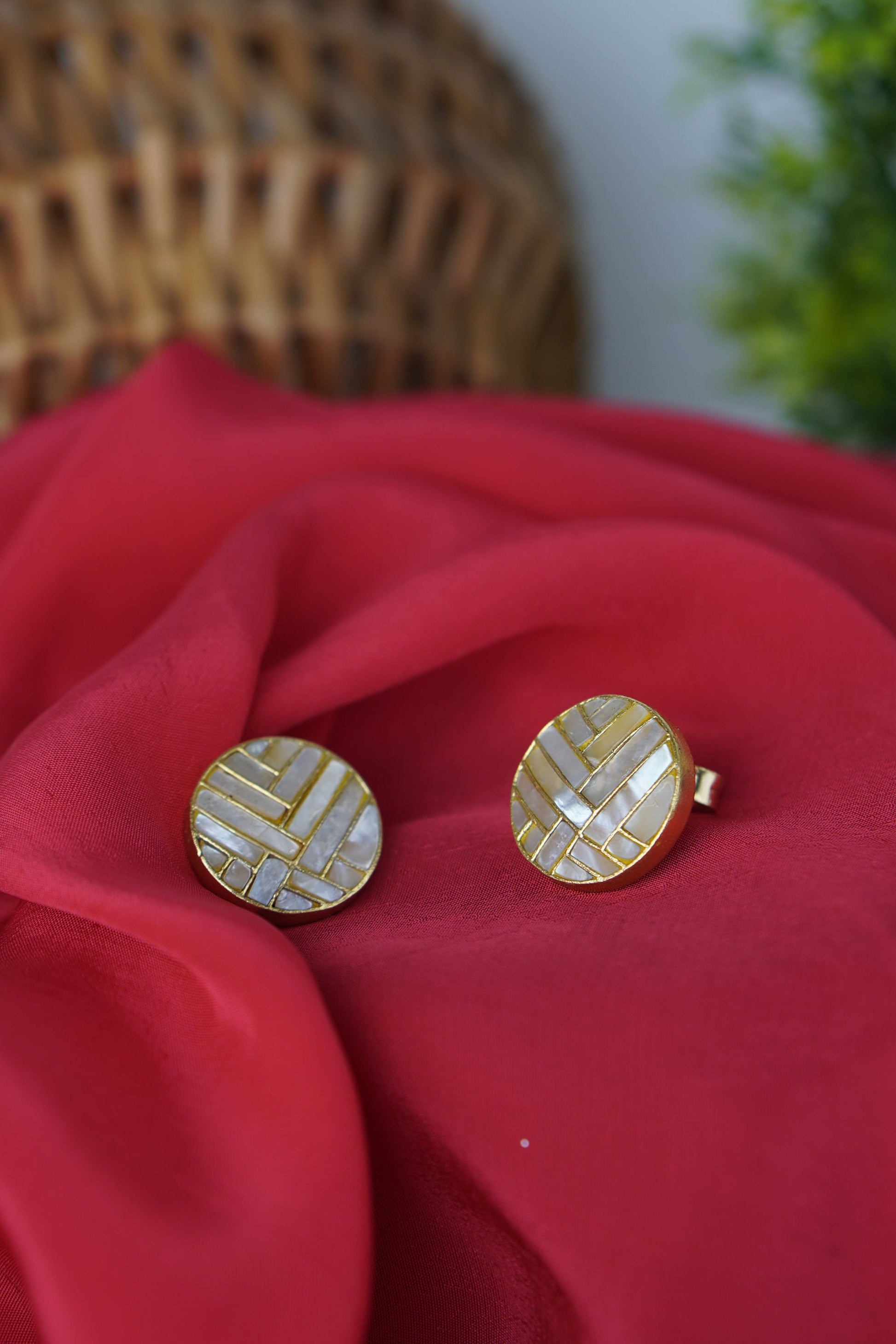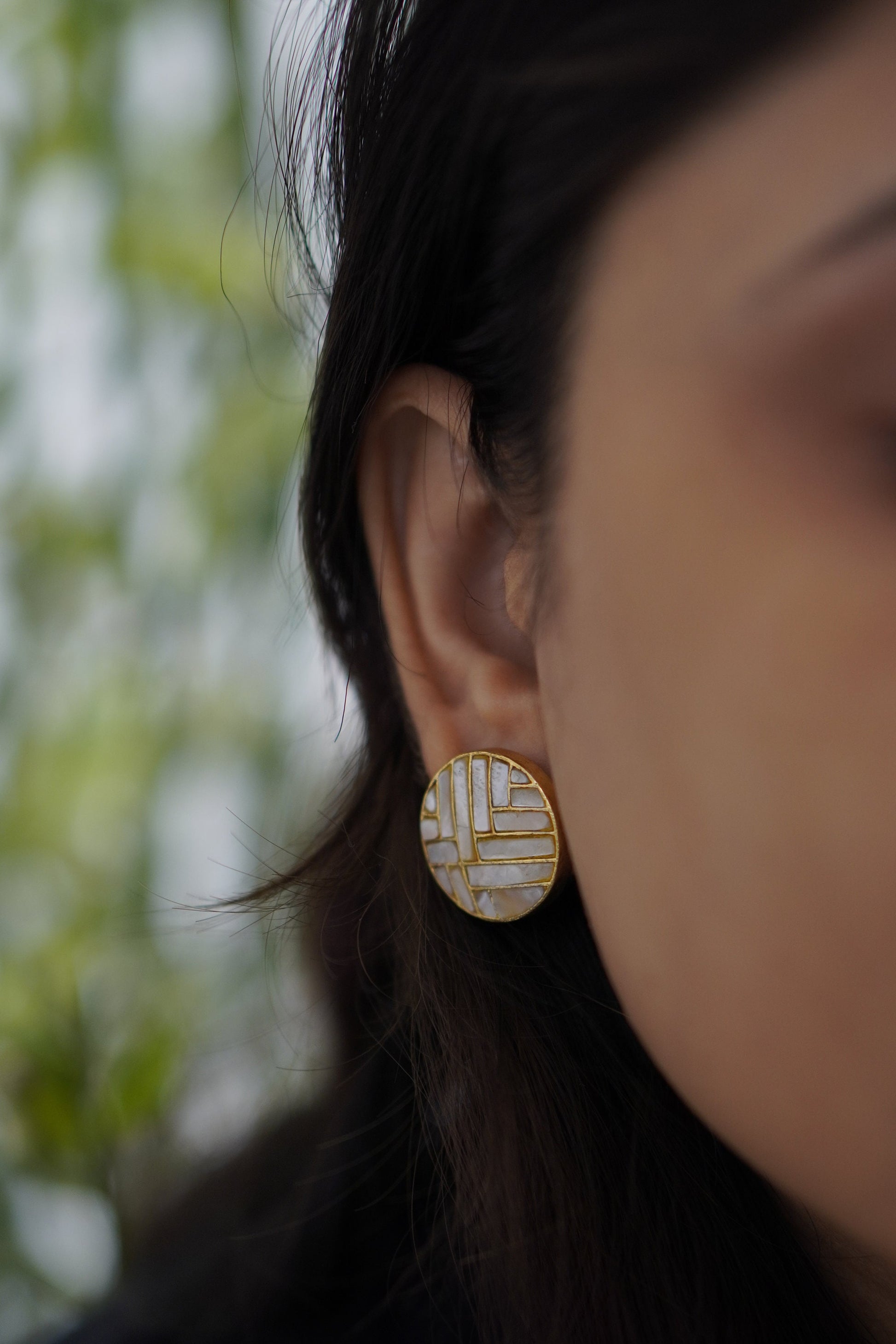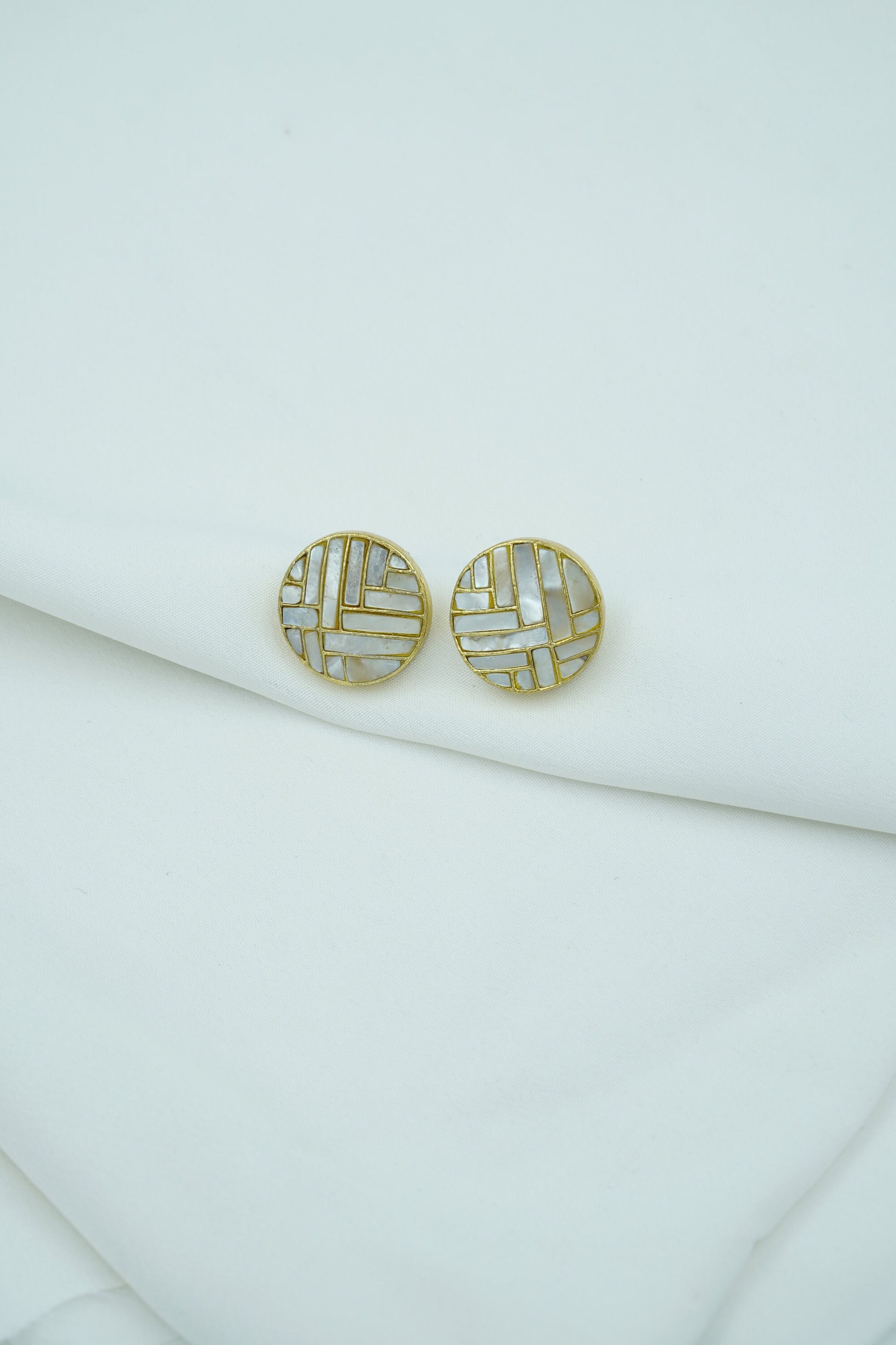 A reflection of modern elegance with a traditional soul, Noor studs bring together geometric design and natural textures. These round earrings feature a mosaic of mother-of-pearl inlays outlined in golden detailing, offering a refined statement that's perfect for every occasion from boardrooms to brunches.