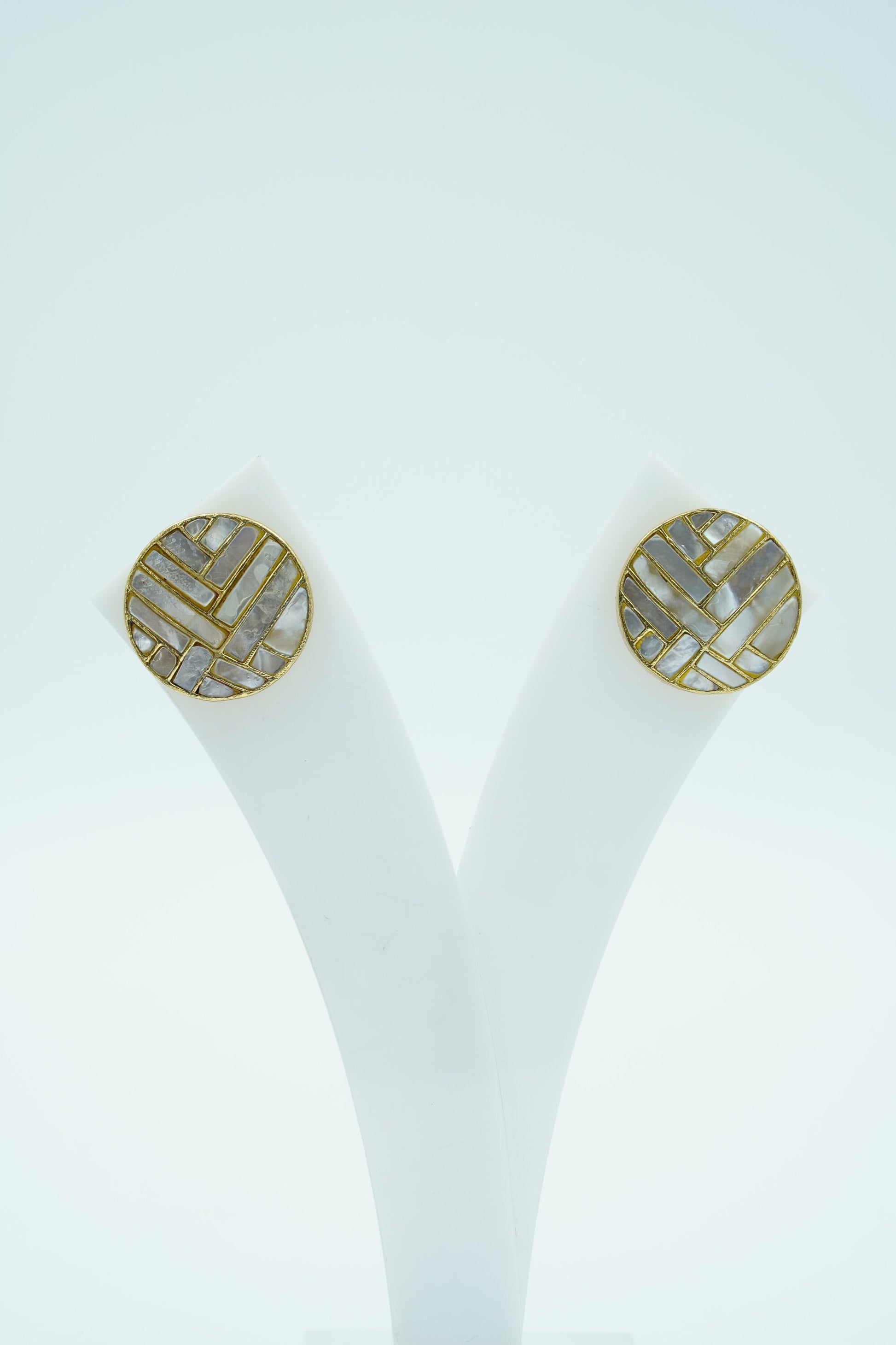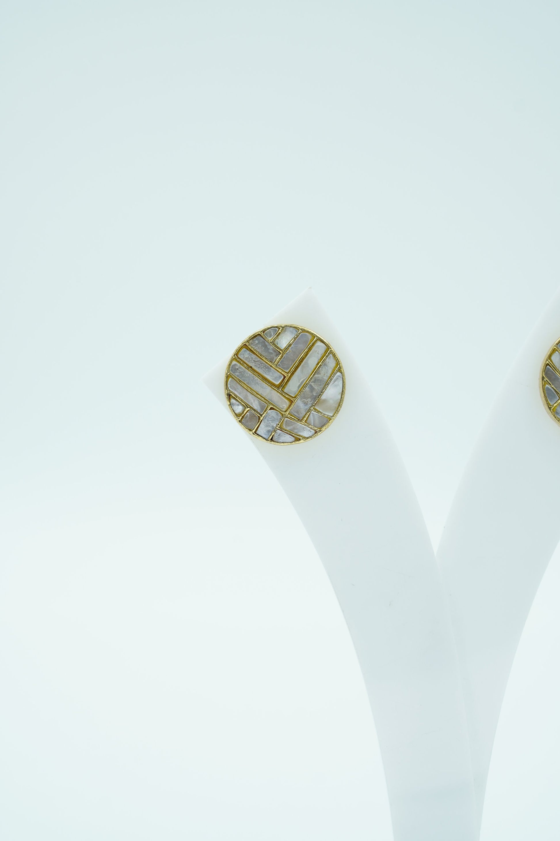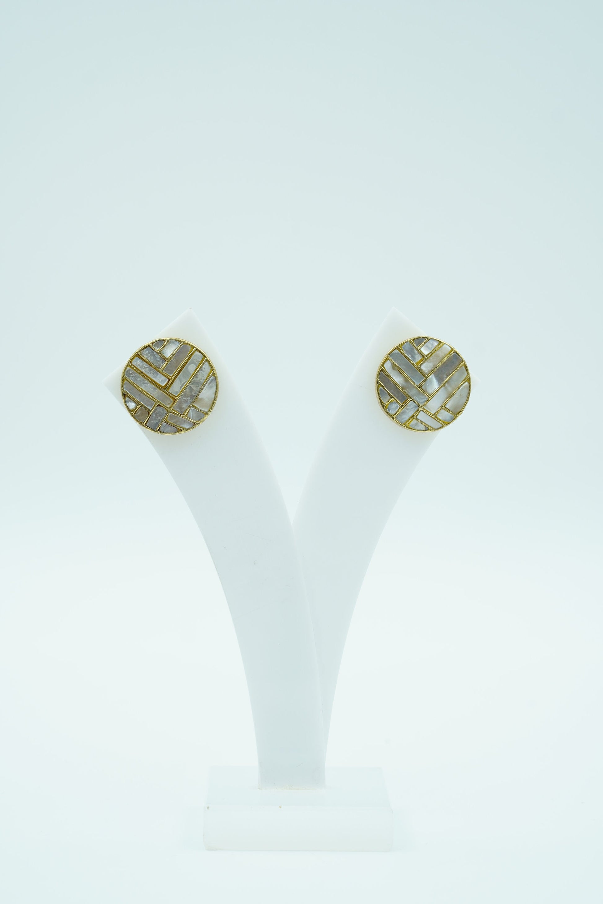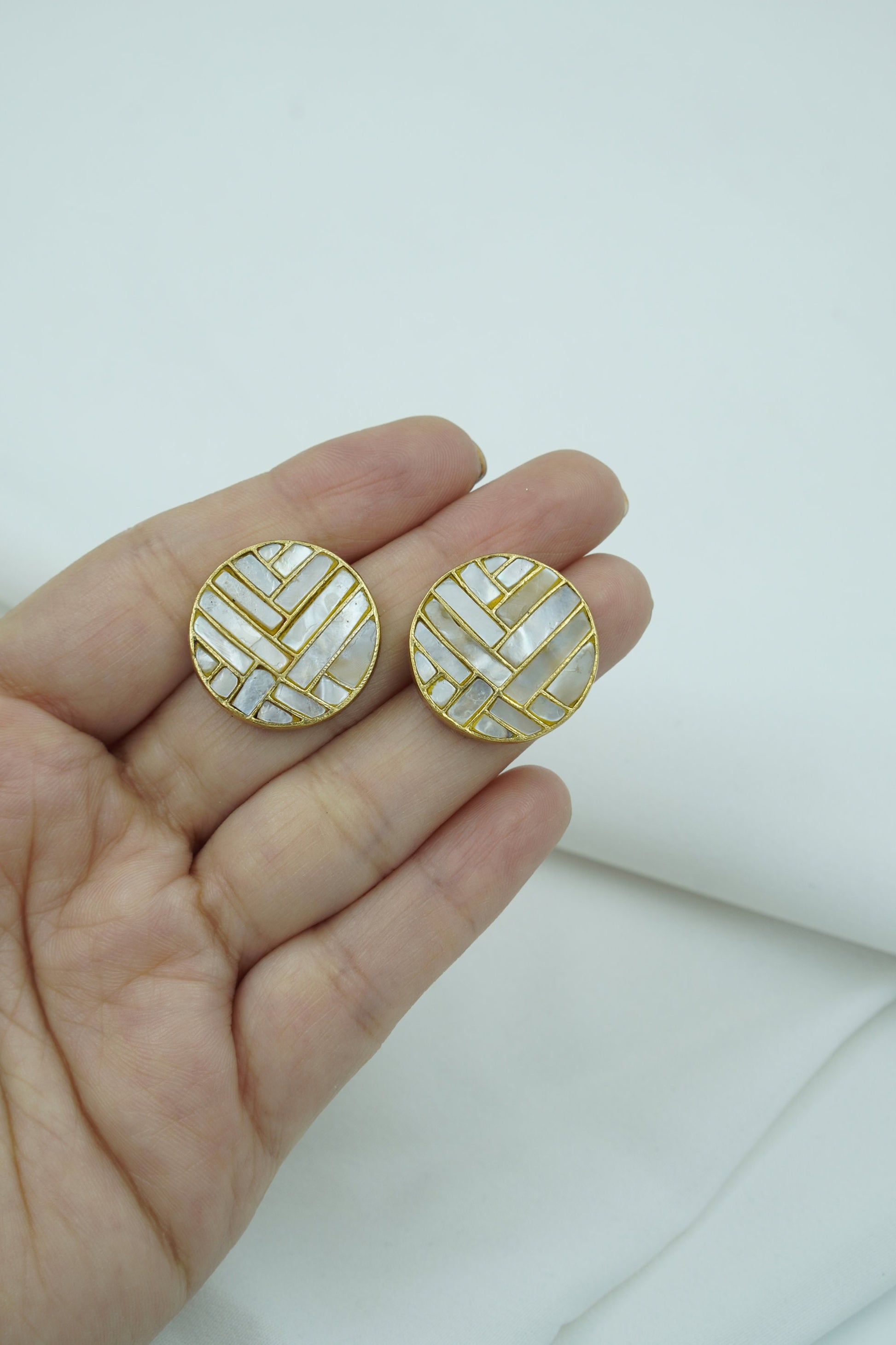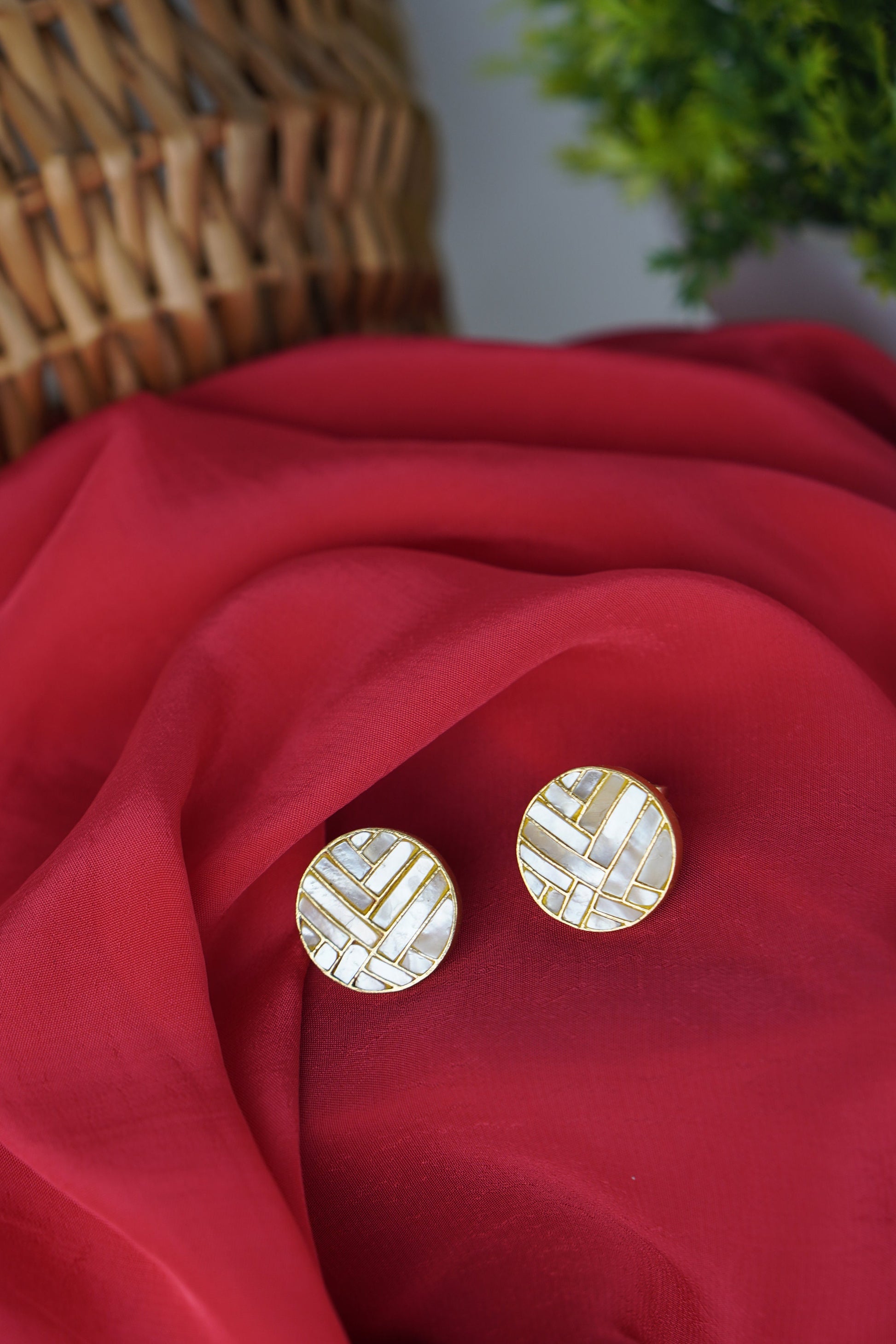 A reflection of modern elegance with a traditional soul, Noor studs bring together geometric design and natural textures. These round earrings feature a mosaic of mother-of-pearl inlays outlined in golden detailing, offering a refined statement that's perfect for every occasion from boardrooms to brunches.