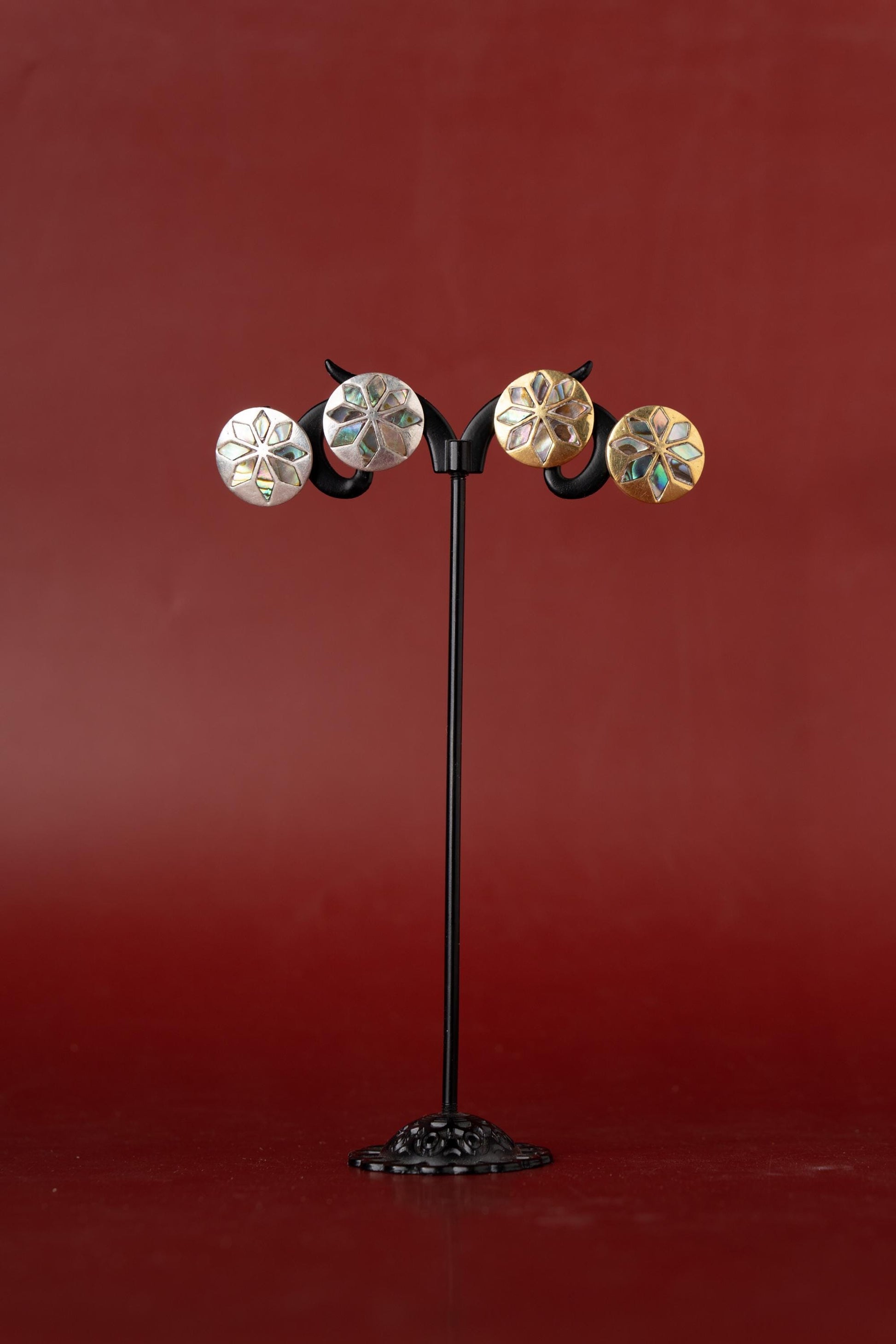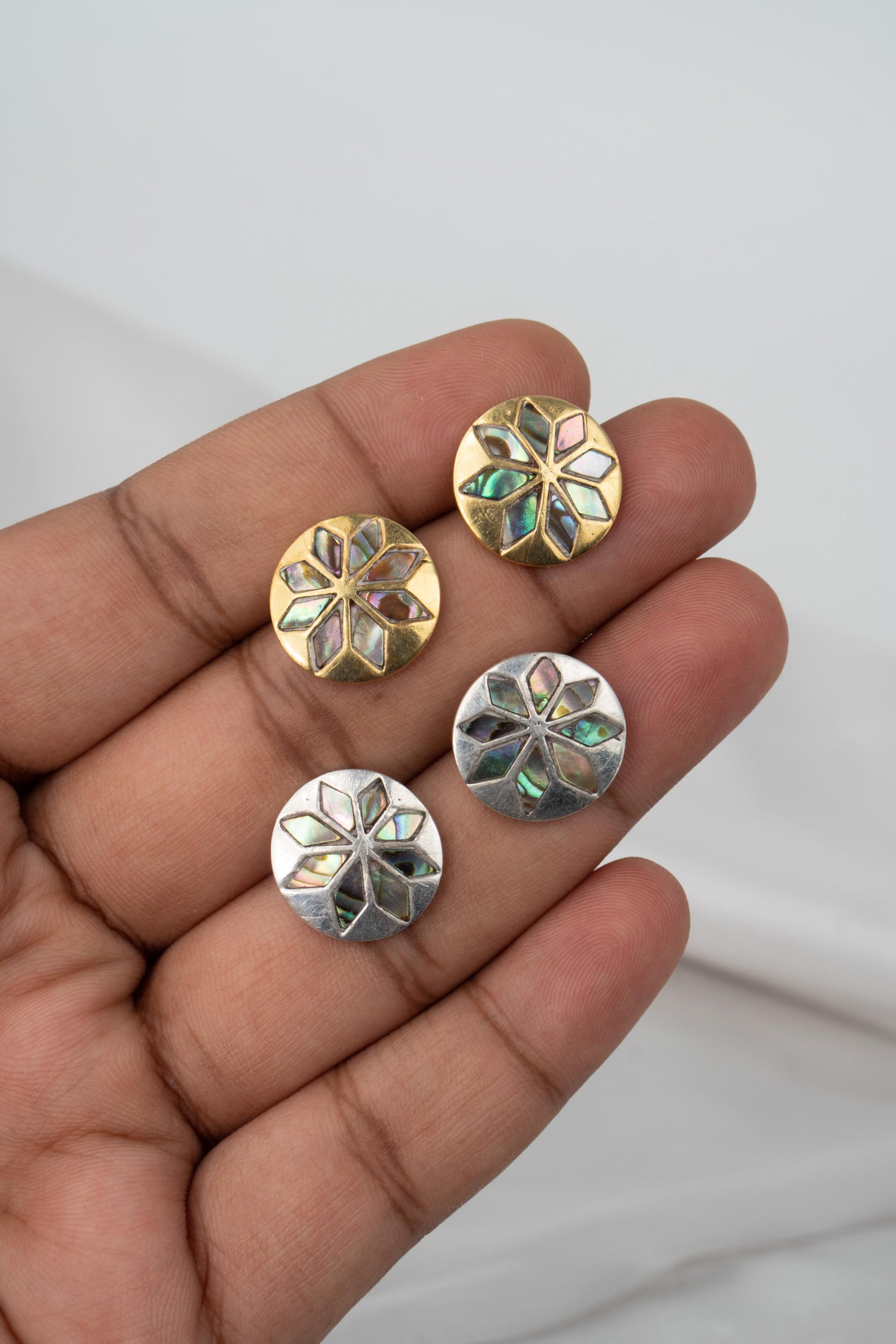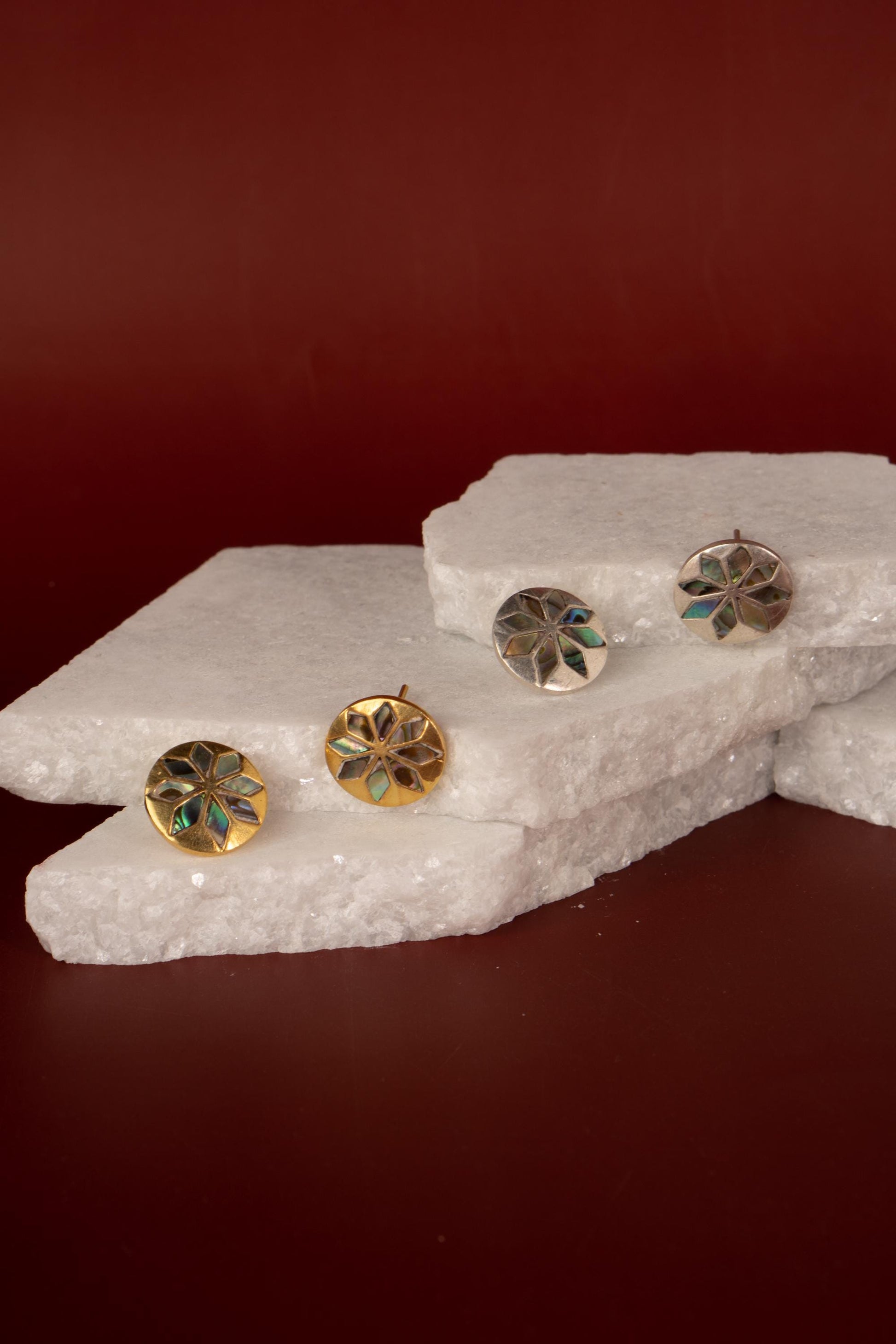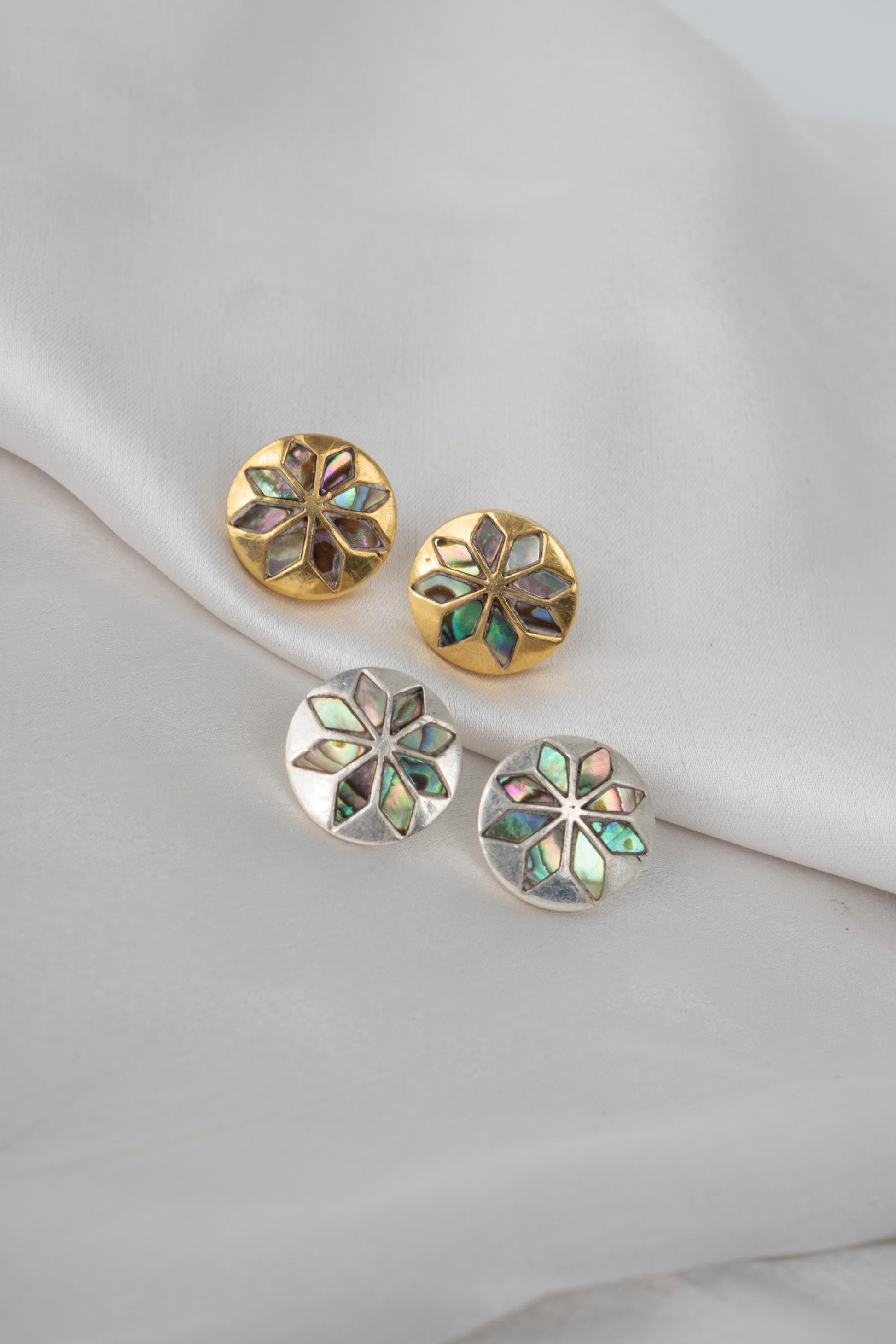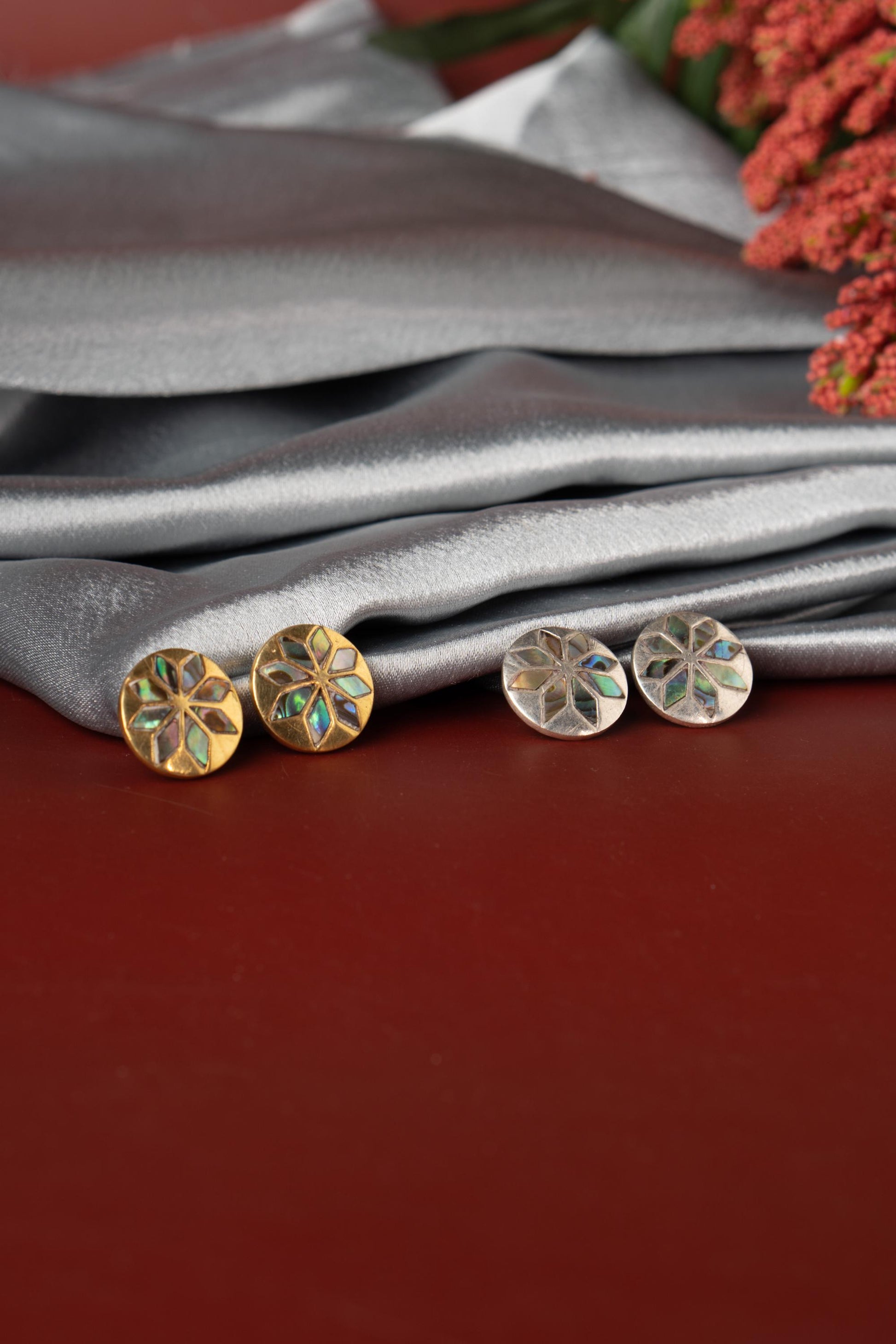 A tribute to natural elegance, the Irisa earrings are round mosaic studs that feature luminous mother-of-pearl inlays arranged in a star-floral motif. The iridescent shades shift beautifully in the light, reflecting your inner glow. Available in both gold and silver tones, these earrings blend timeless style with contemporary finesse.