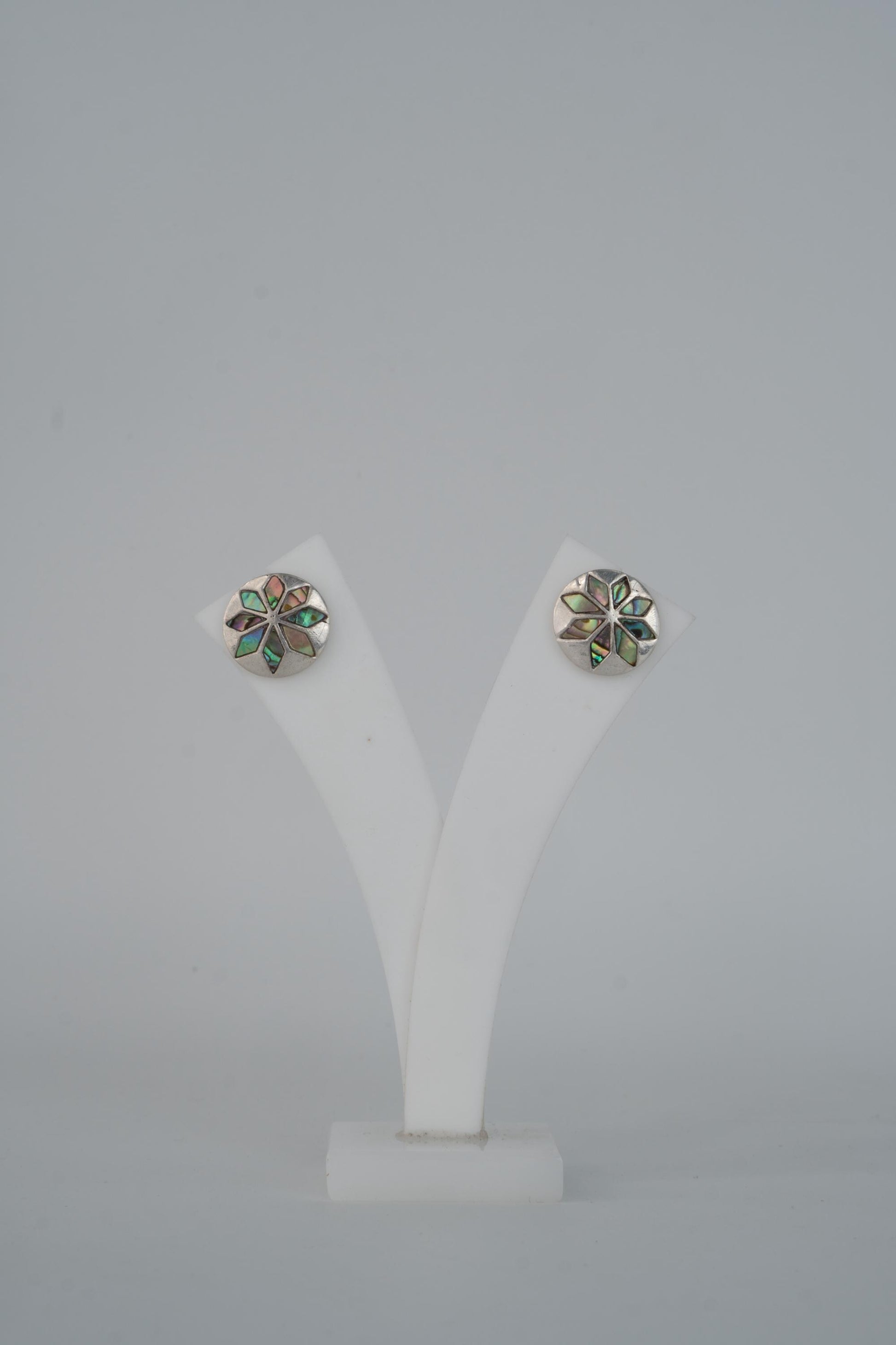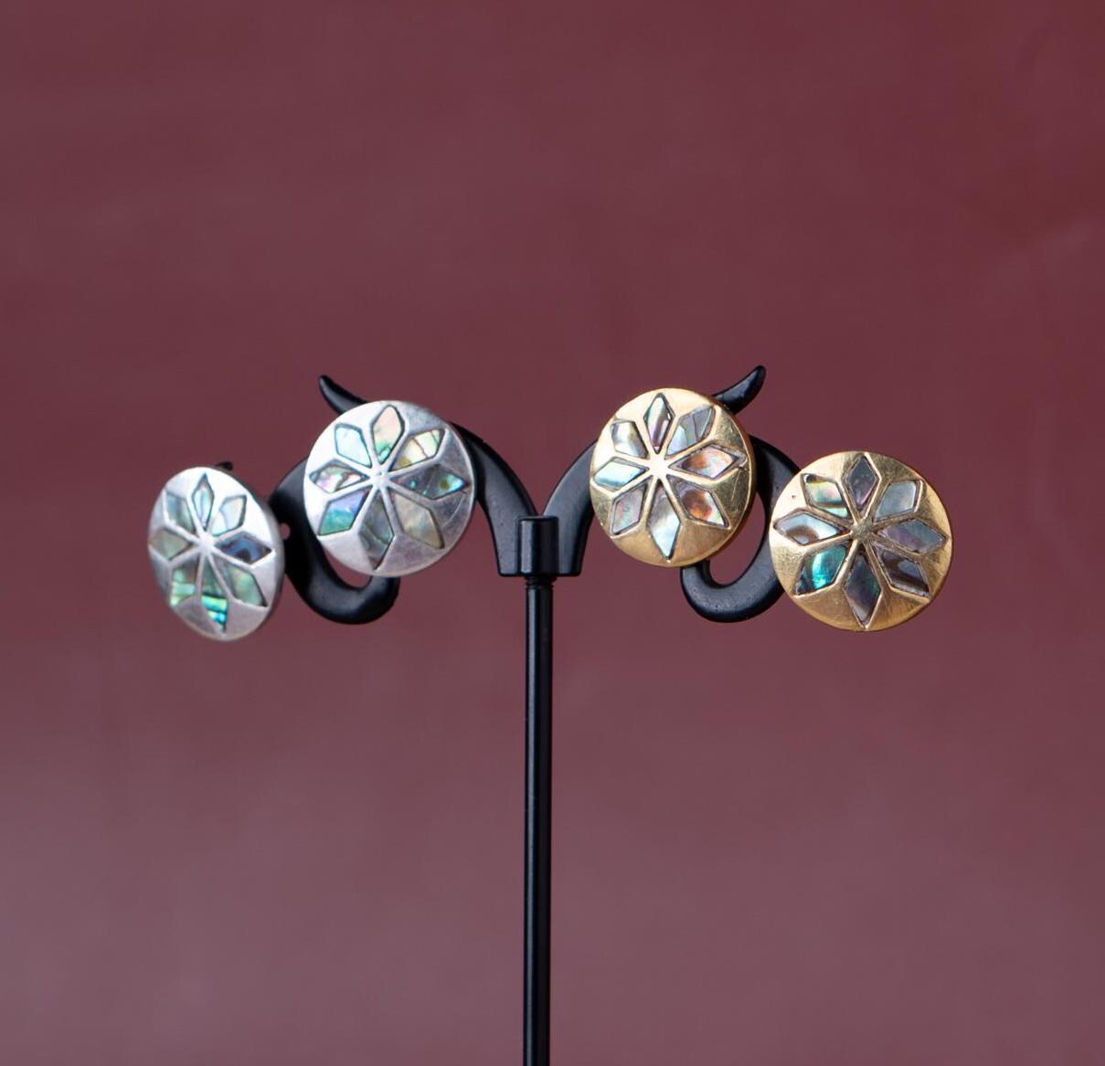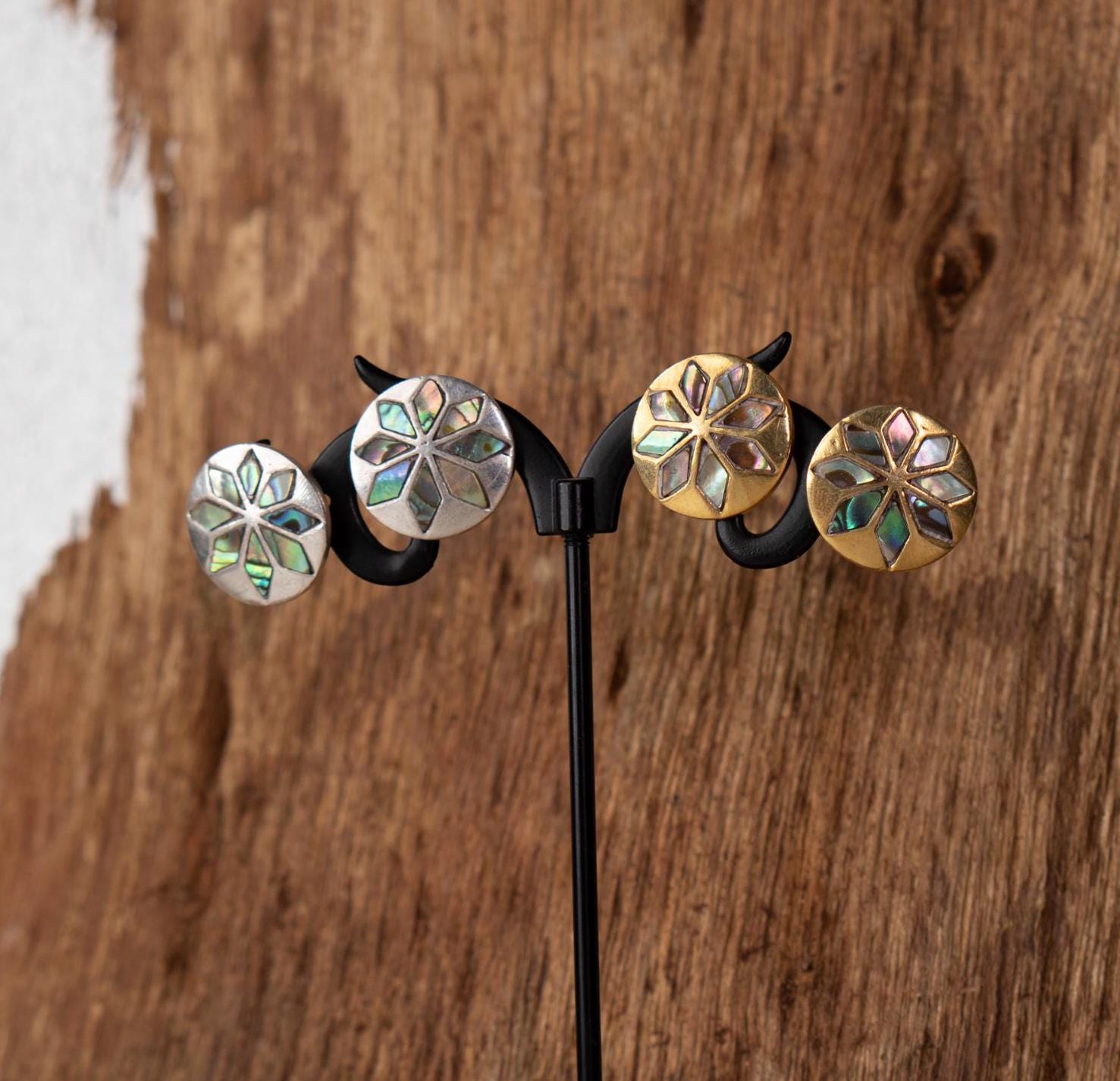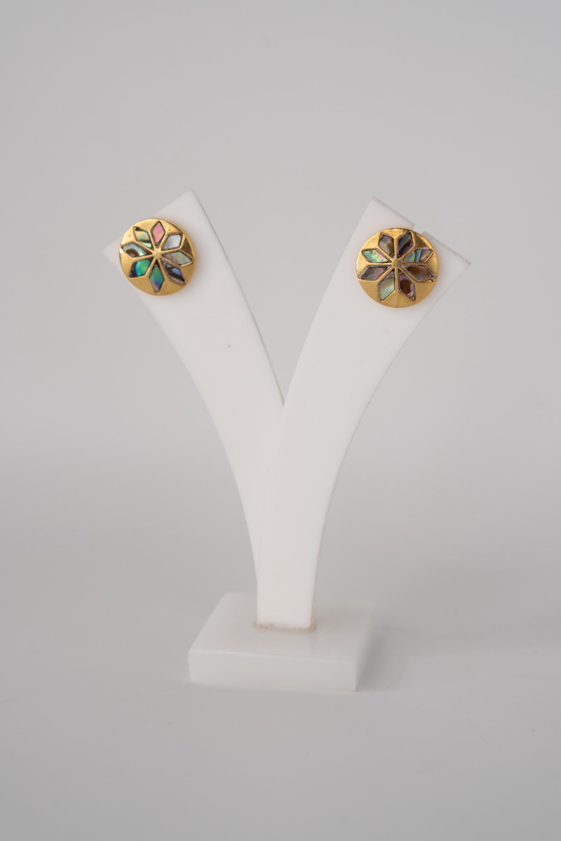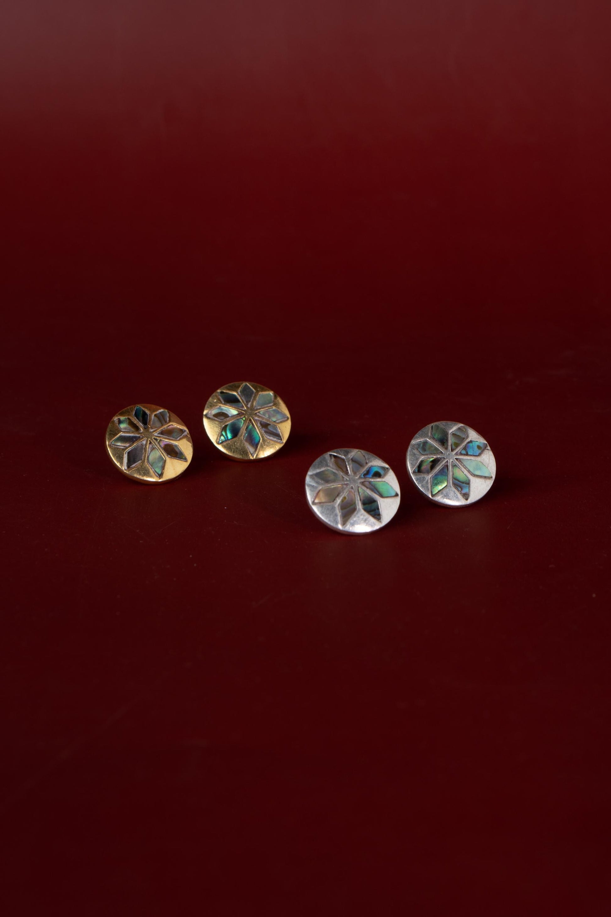A tribute to natural elegance, the Irisa earrings are round mosaic studs that feature luminous mother-of-pearl inlays arranged in a star-floral motif. The iridescent shades shift beautifully in the light, reflecting your inner glow. Available in both gold and silver tones, these earrings blend timeless style with contemporary finesse.