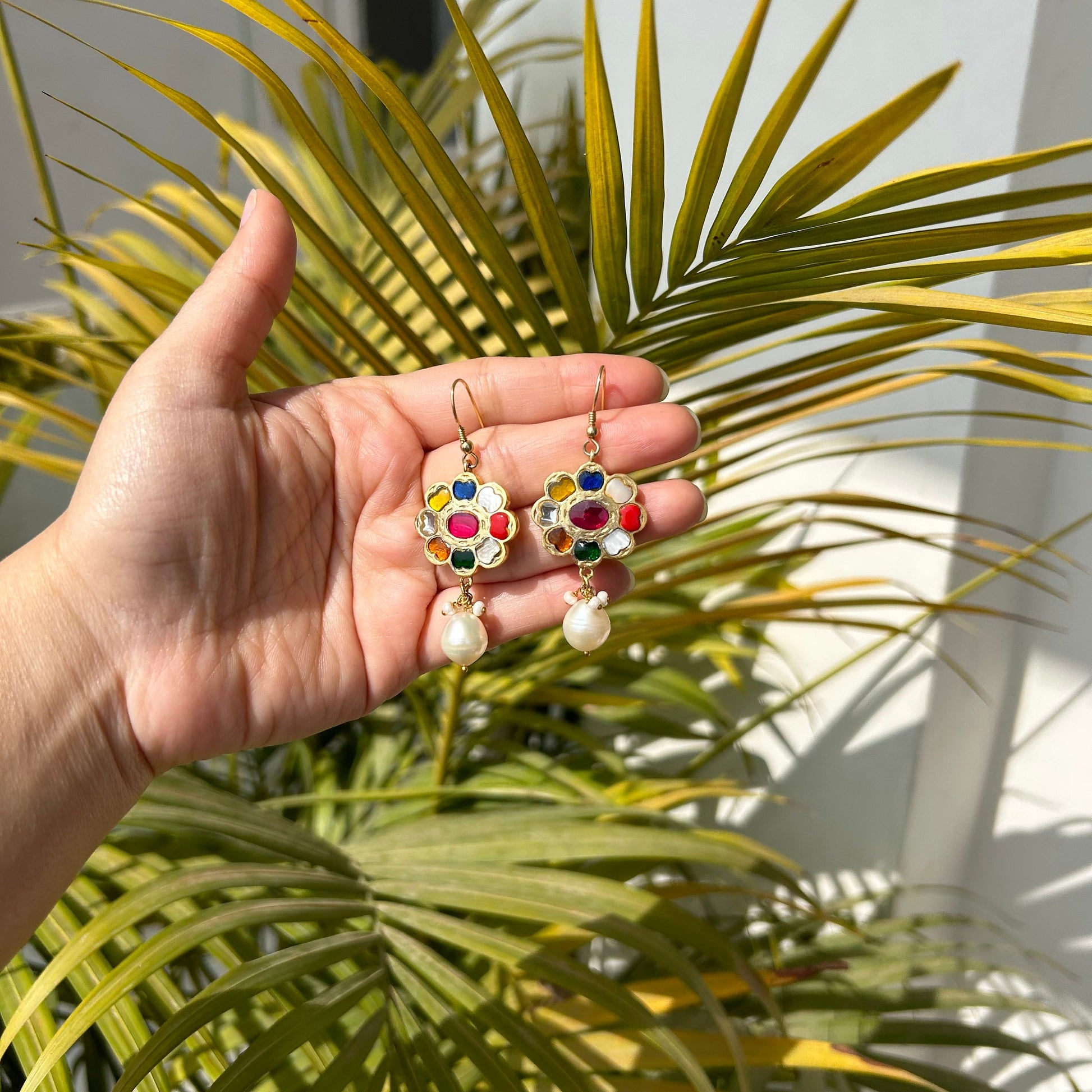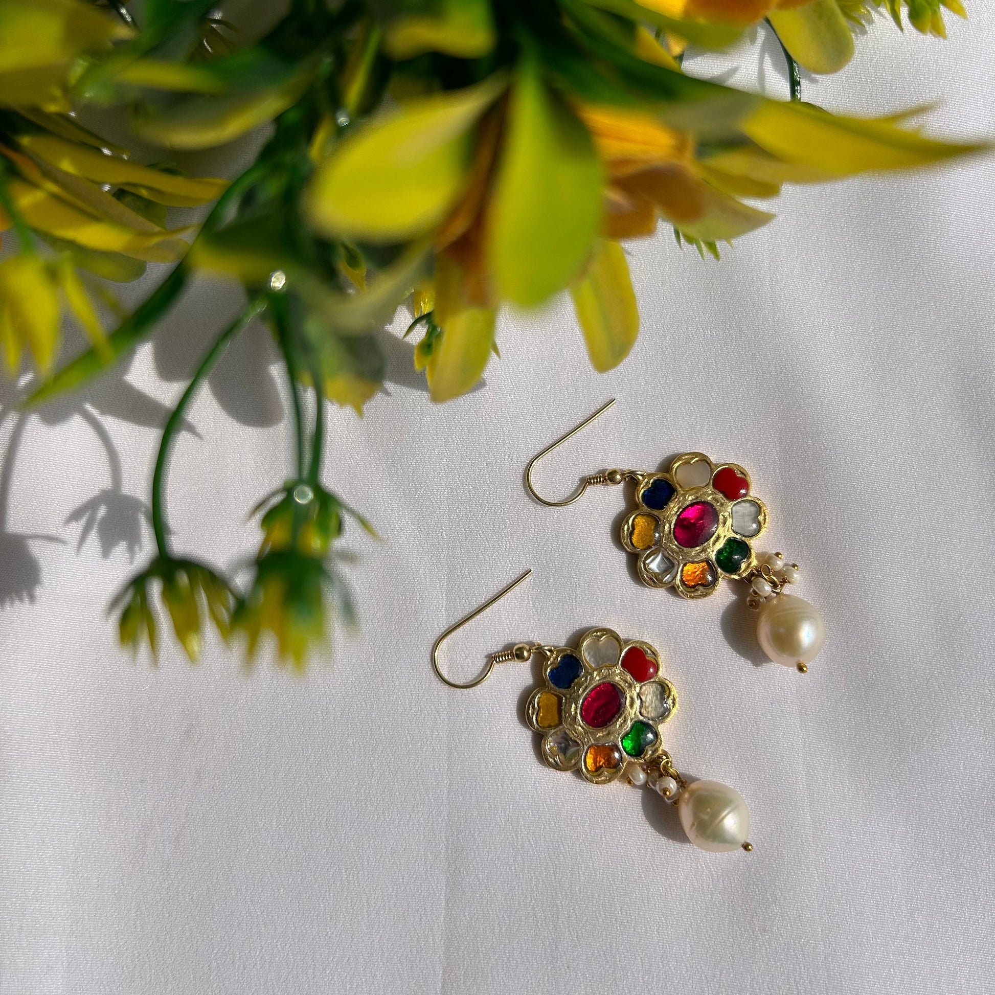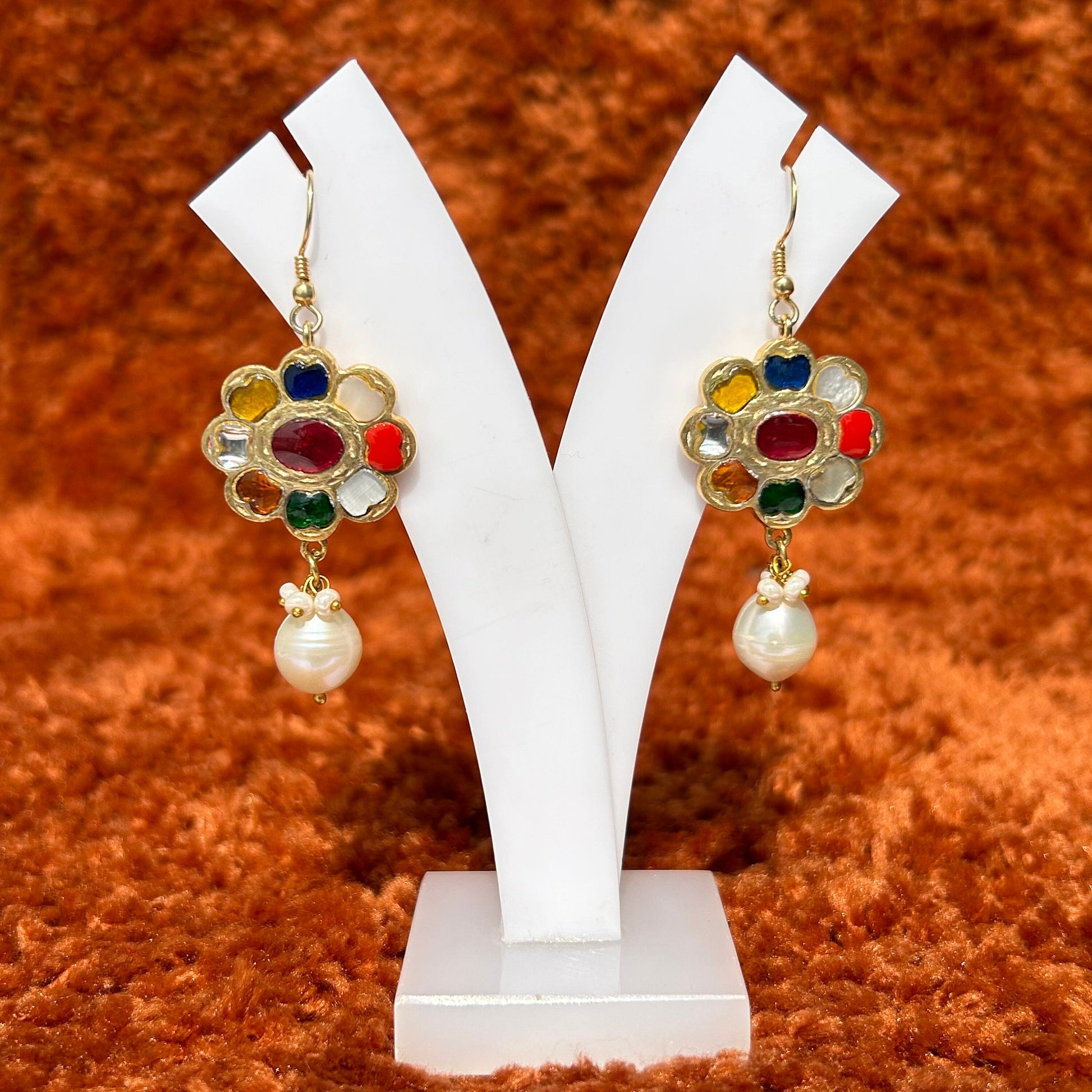 Adorn yourself in celestial elegance with Ratnavali, a radiant pair of Navratna earrings featuring the traditional arrangement of nine sacred gemstones, each representing a cosmic force. Set in a rich gold-finish frame, these earrings embody timeless Indian heritage, blending spiritual significance with stylish sophistication.