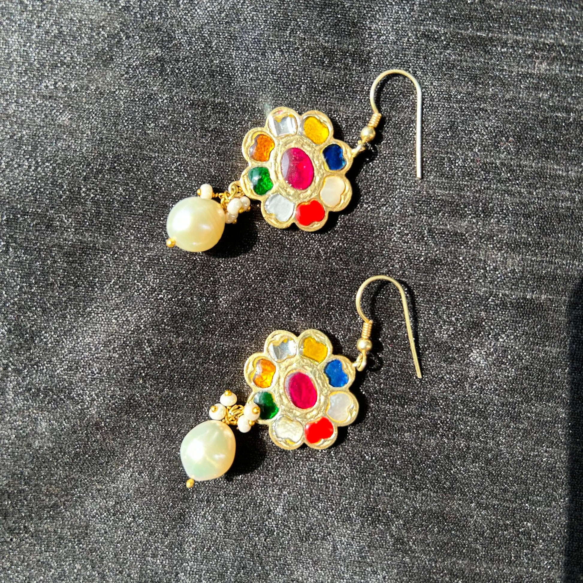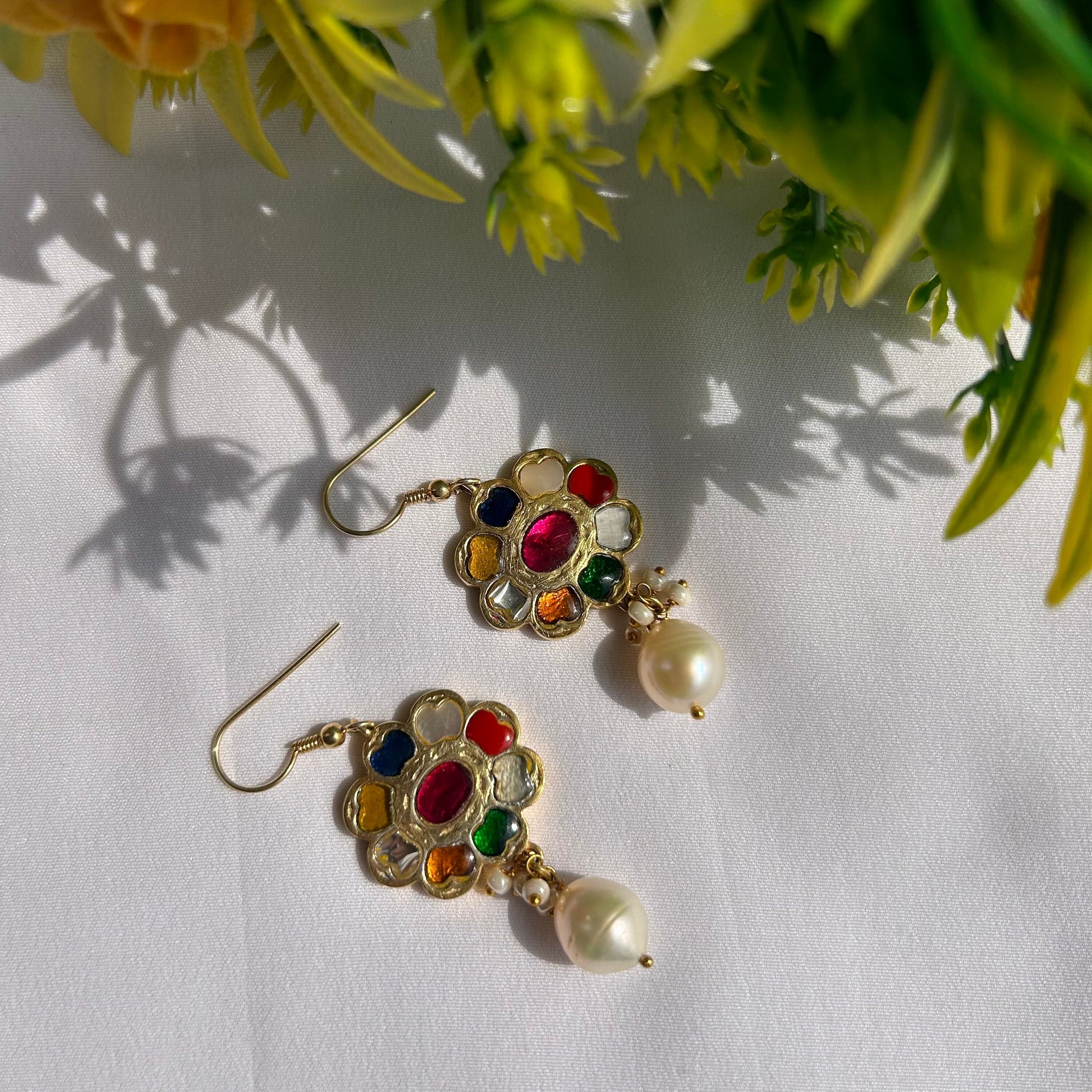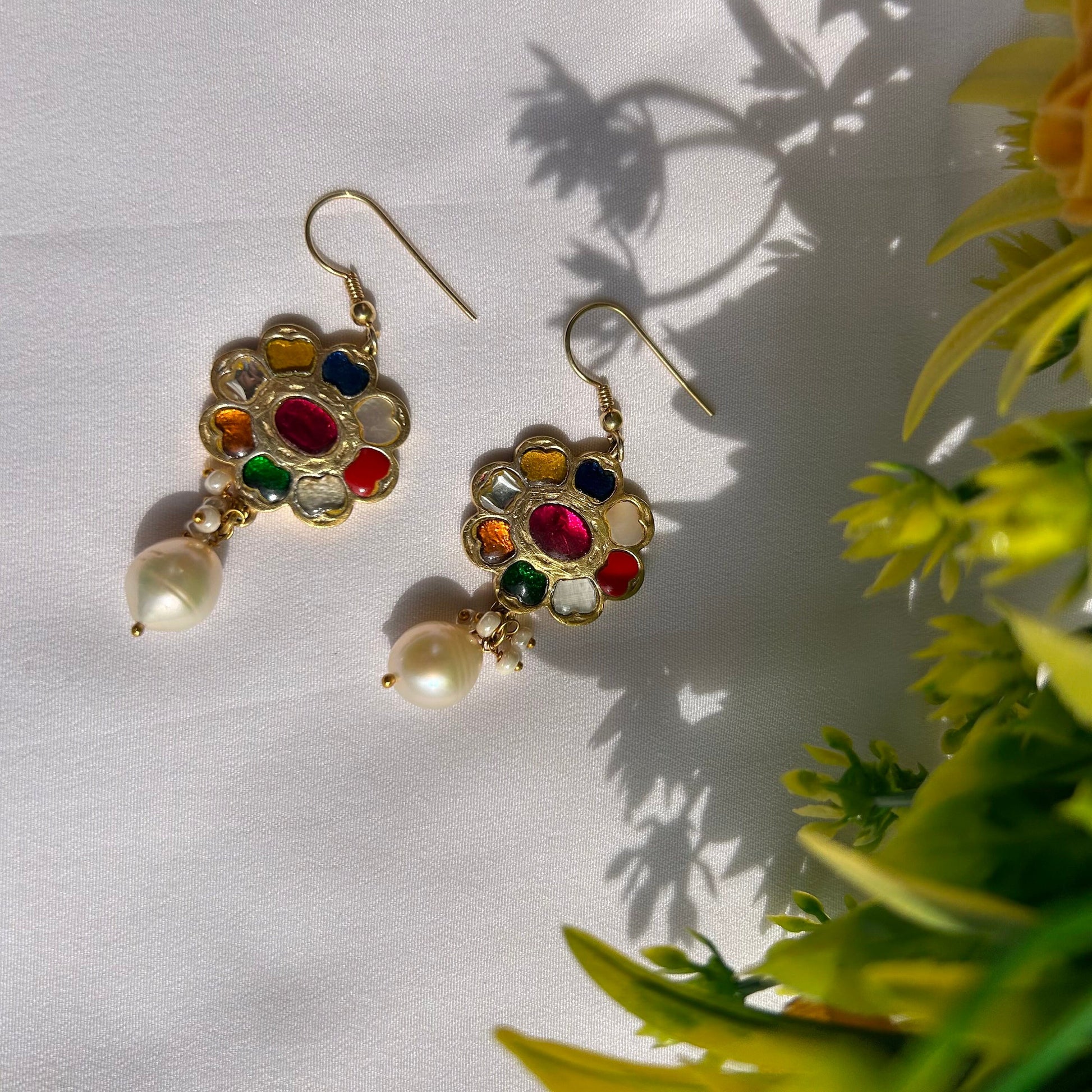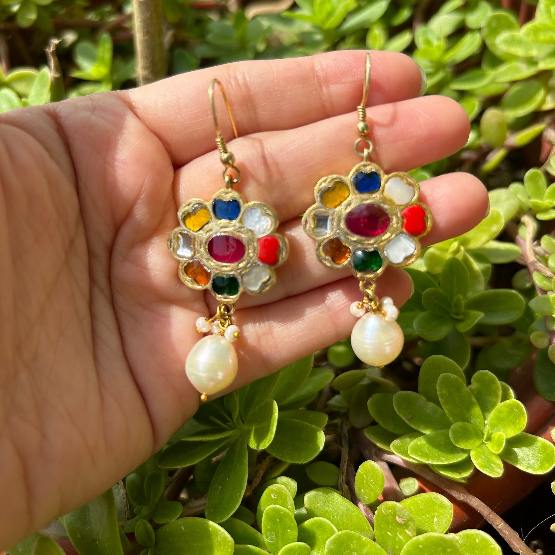Adorn yourself in celestial elegance with Ratnavali, a radiant pair of Navratna earrings featuring the traditional arrangement of nine sacred gemstones, each representing a cosmic force. Set in a rich gold-finish frame, these earrings embody timeless Indian heritage, blending spiritual significance with stylish sophistication.