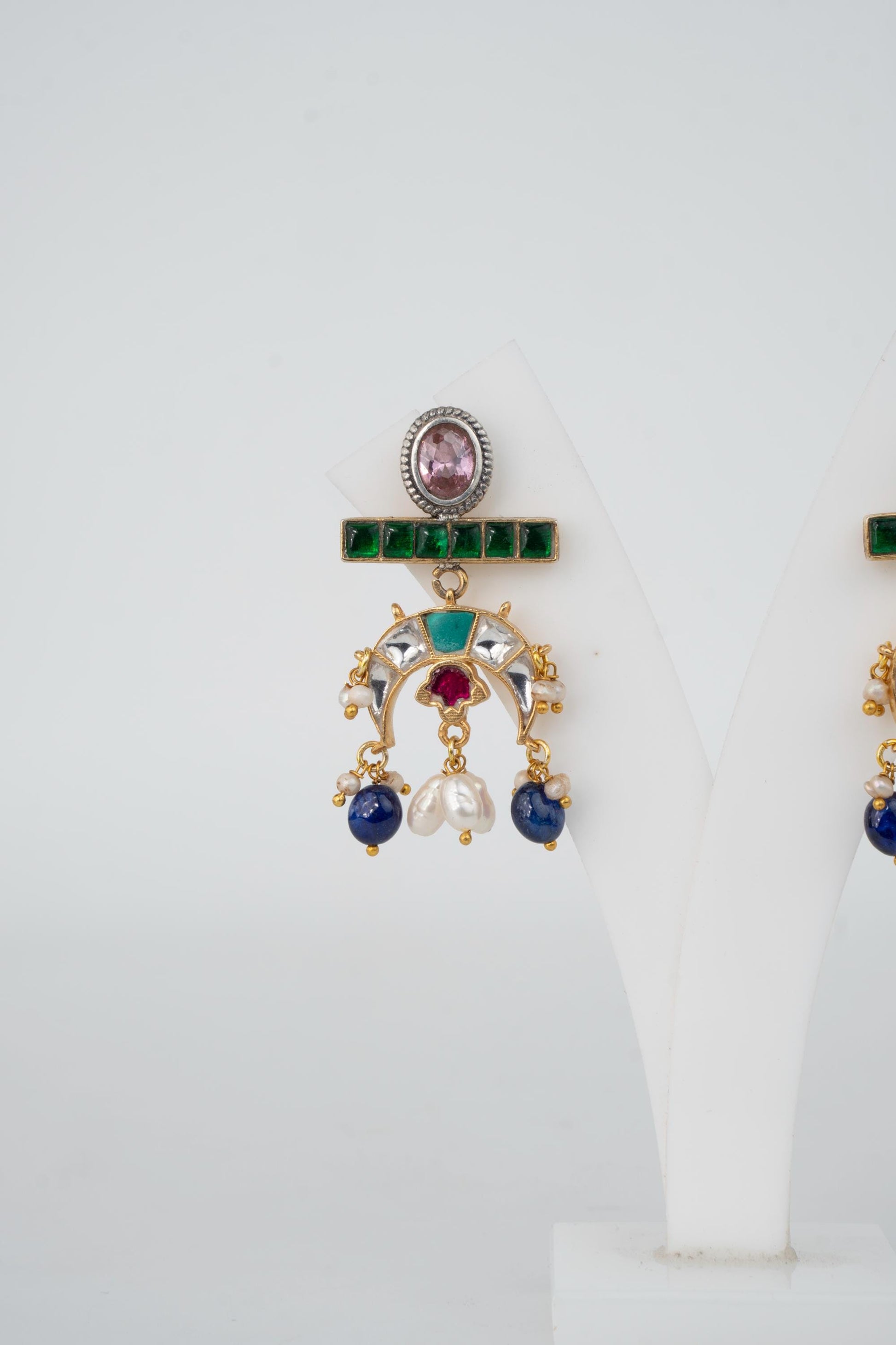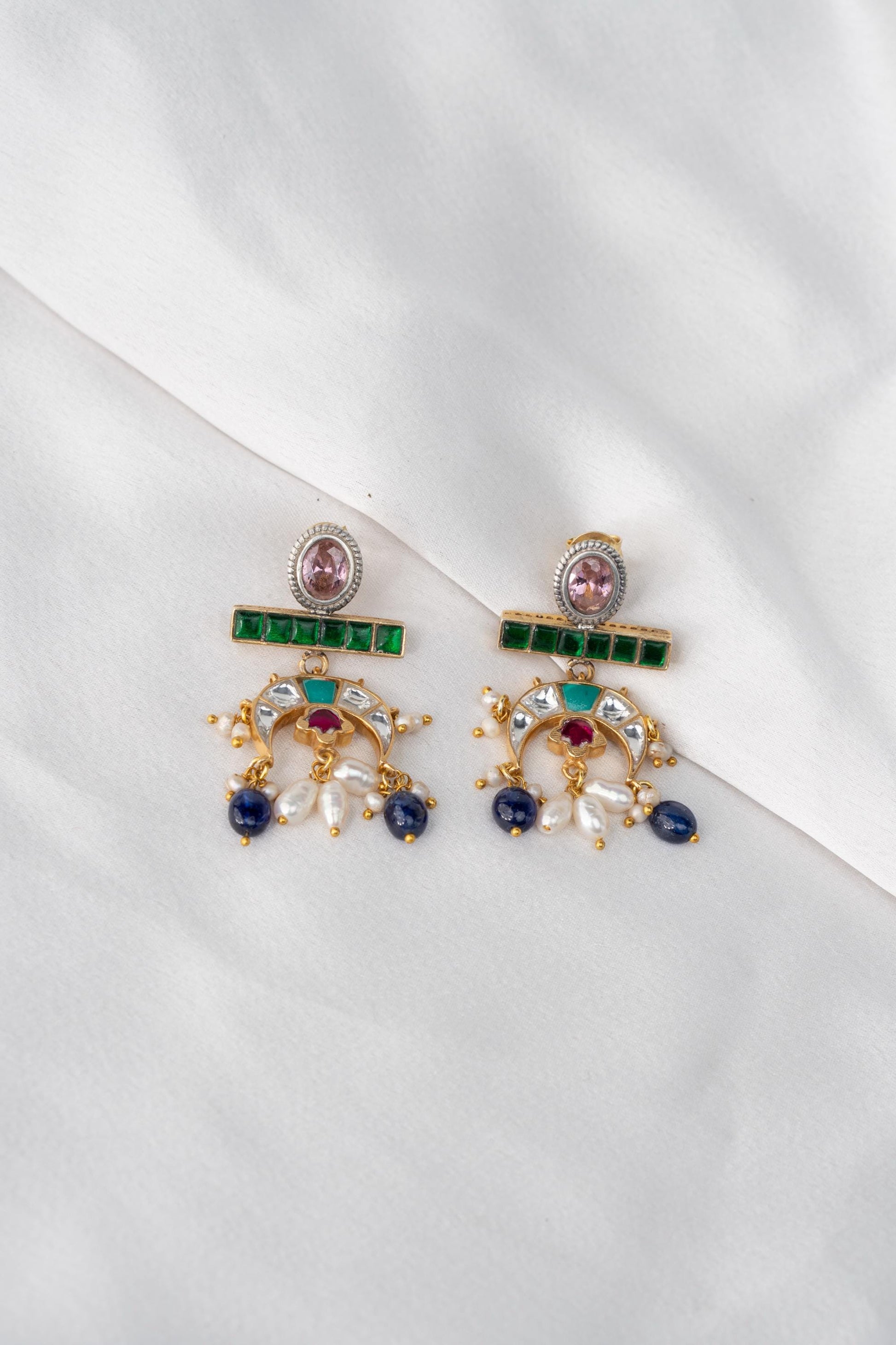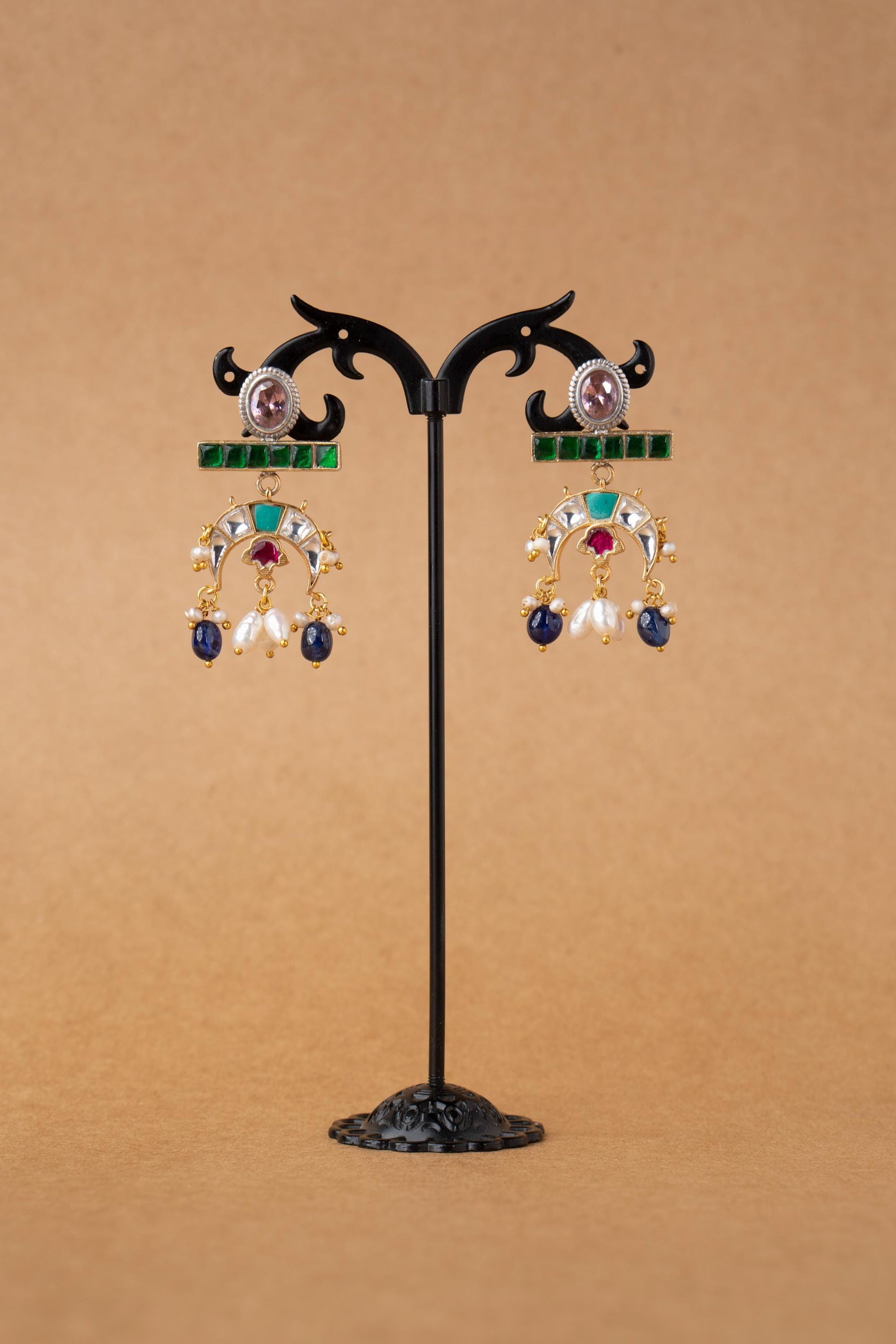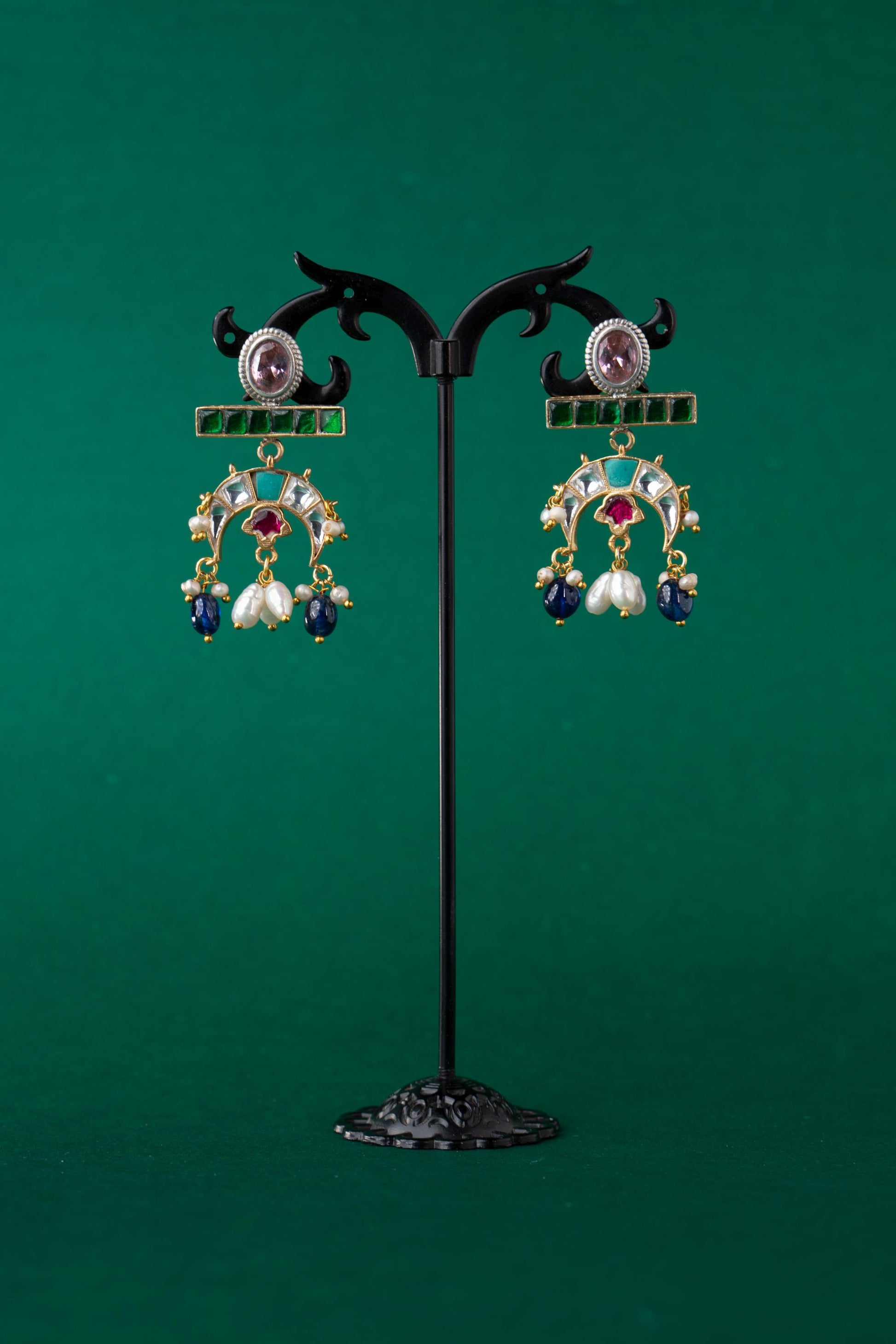 Flowing with elegance and adorned in regal hues, Tarangini is a celebration of movement and melody. These crescent-shaped earrings feature an exquisite mix of green, sapphire blue, ruby red, and pearl-white stones reminiscent of river waves shimmering under moonlight. Perfect for festive nights, sangeets, and evening gatherings where you want to shine with poise and color.