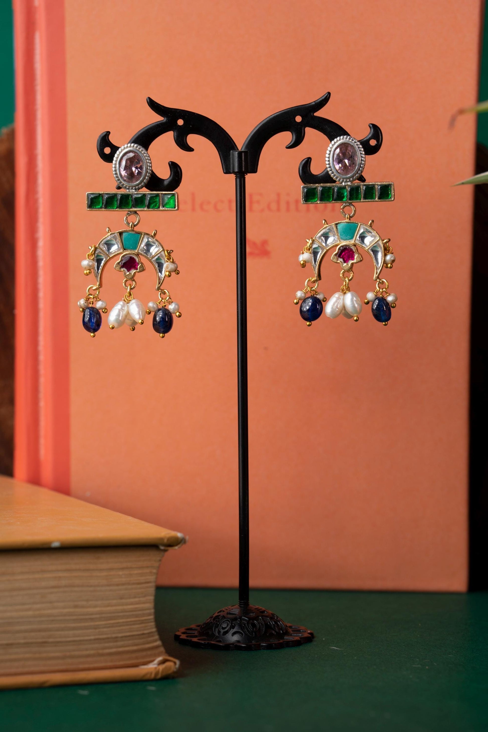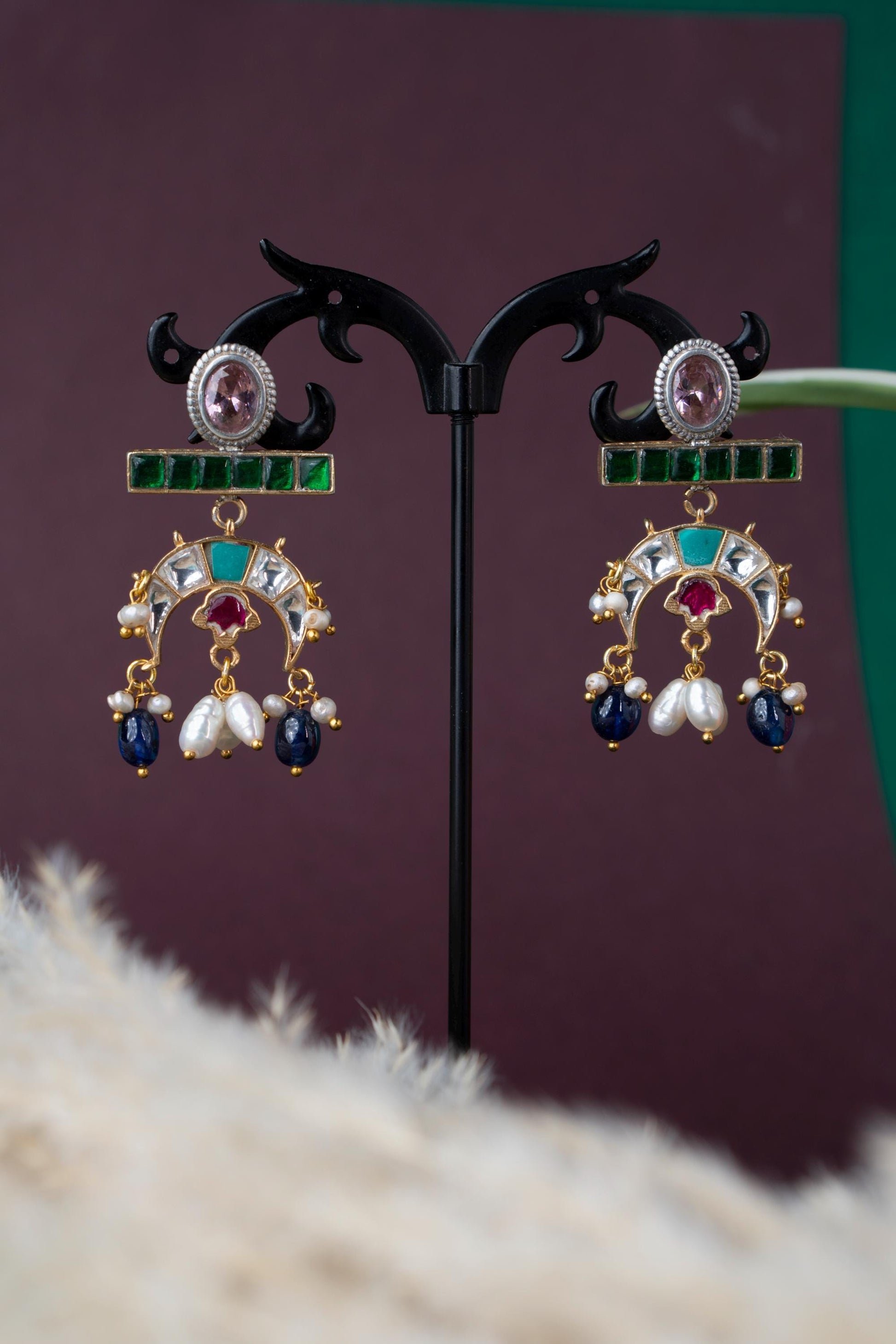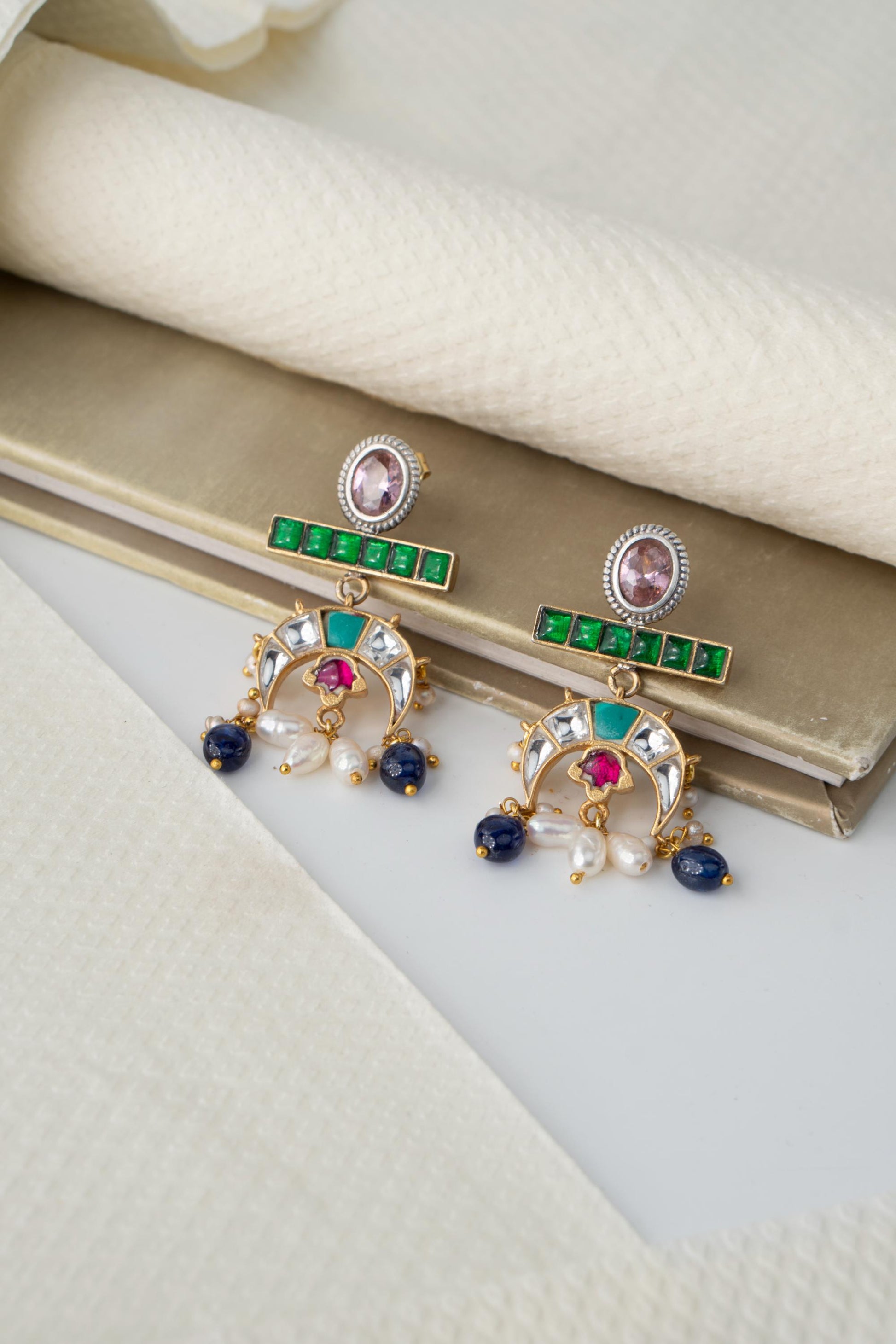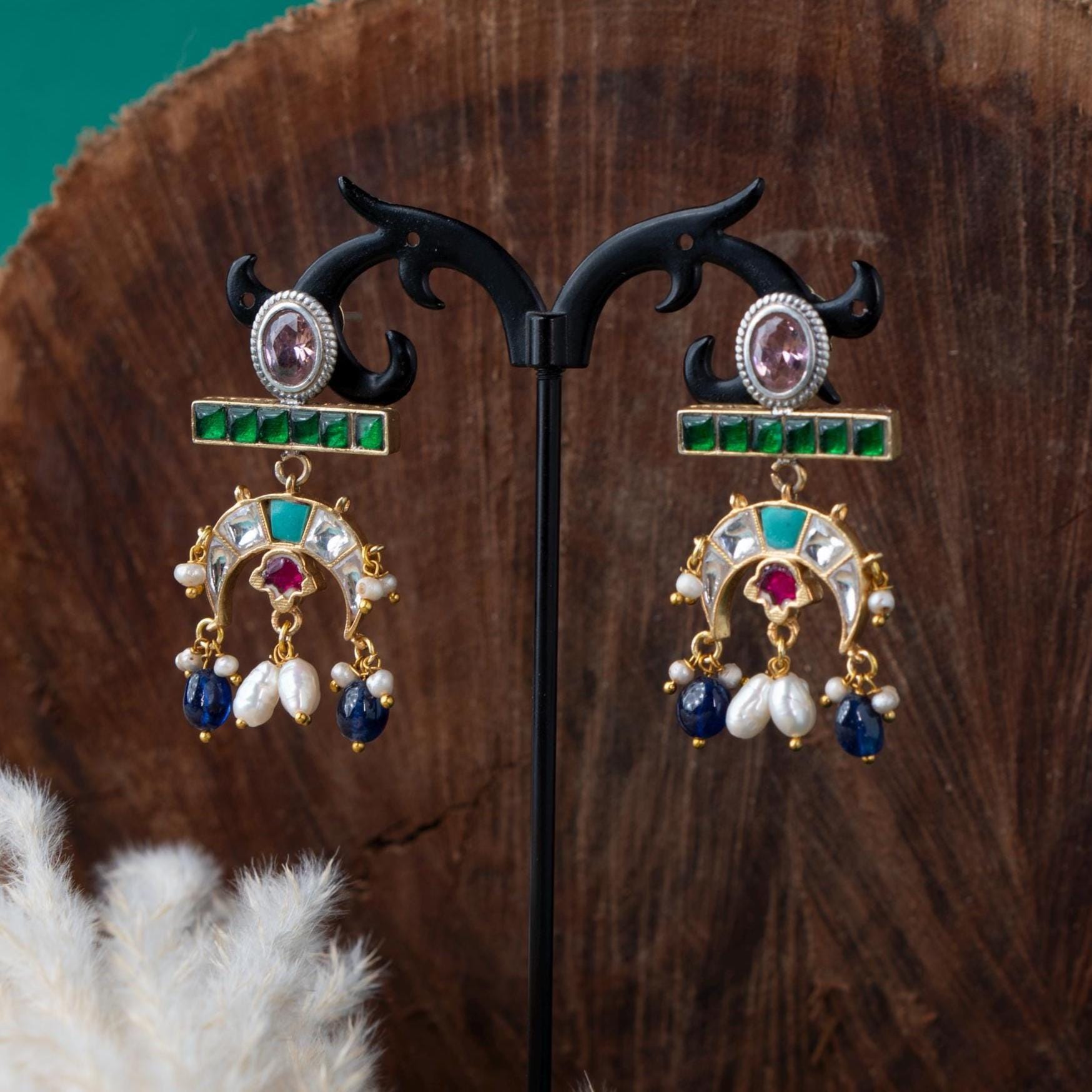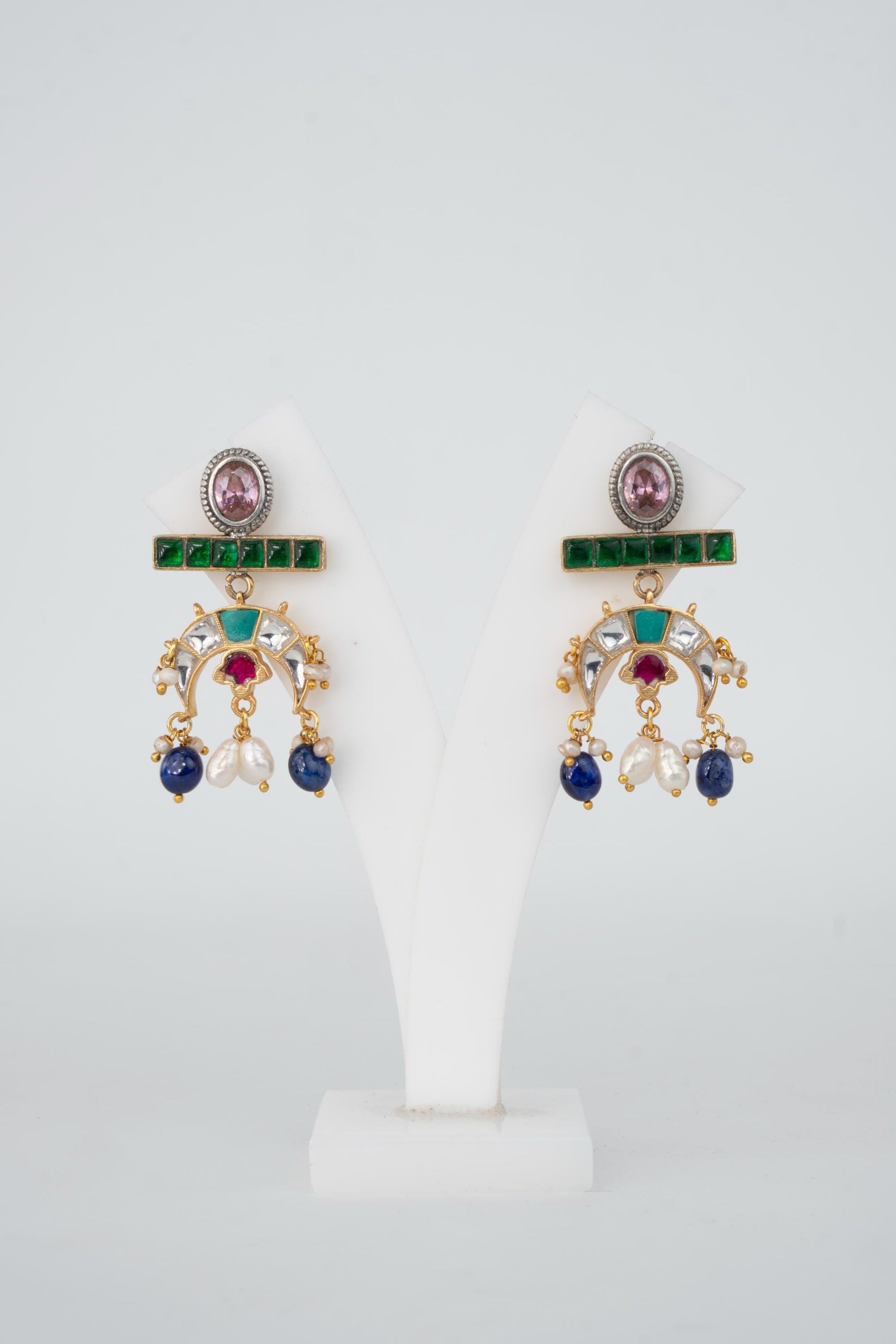 Flowing with elegance and adorned in regal hues, Tarangini is a celebration of movement and melody. These crescent-shaped earrings feature an exquisite mix of green, sapphire blue, ruby red, and pearl-white stones reminiscent of river waves shimmering under moonlight. Perfect for festive nights, sangeets, and evening gatherings where you want to shine with poise and color.