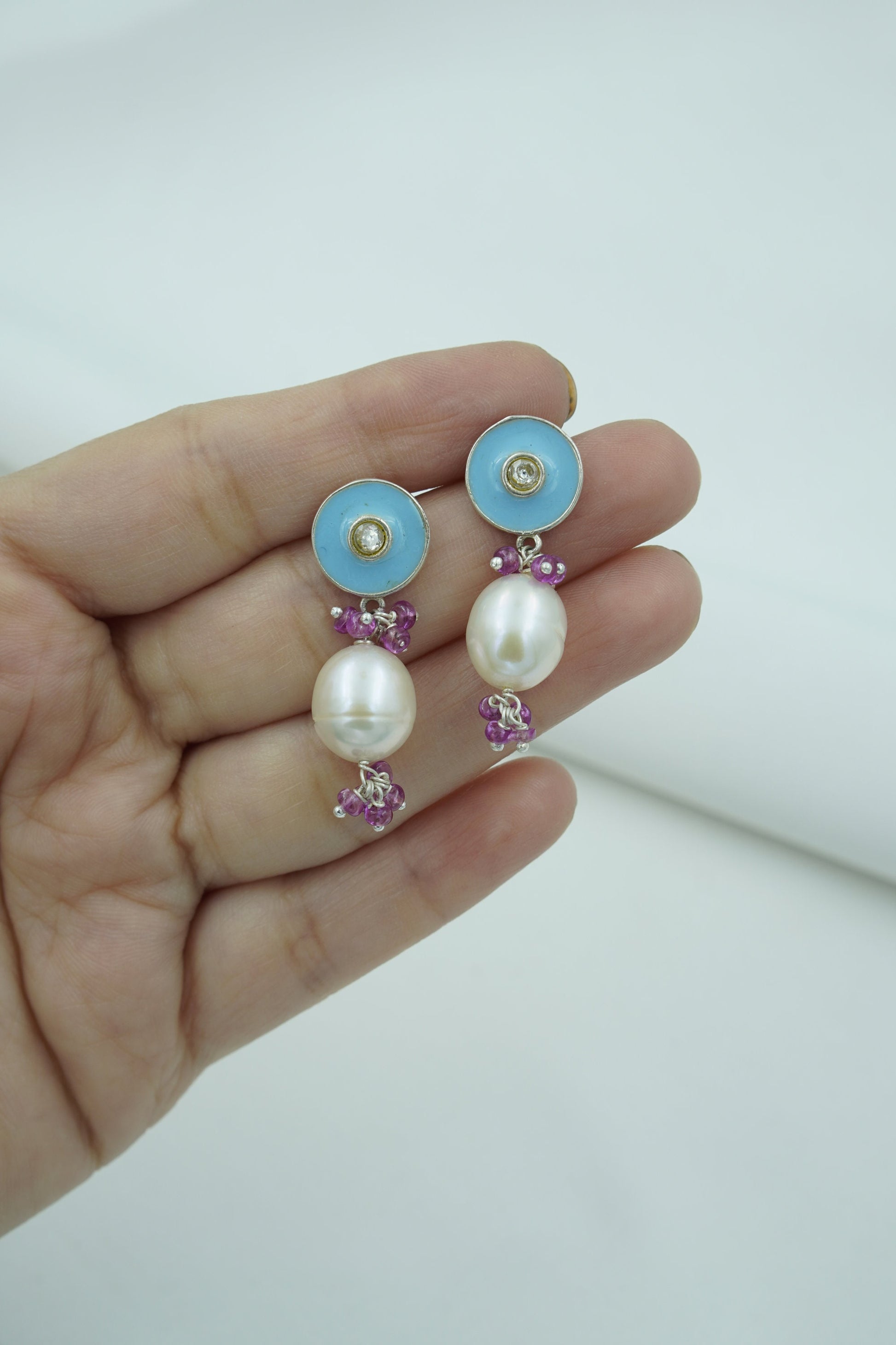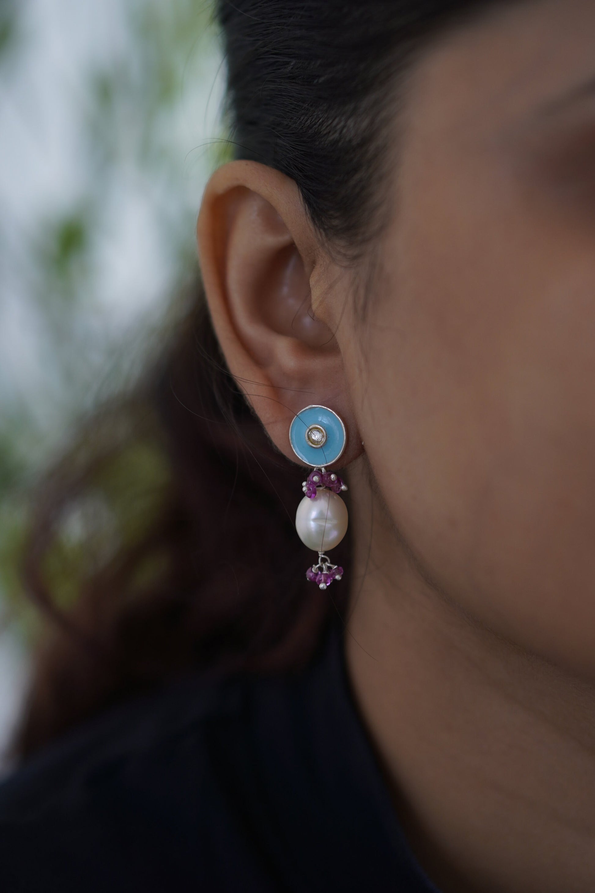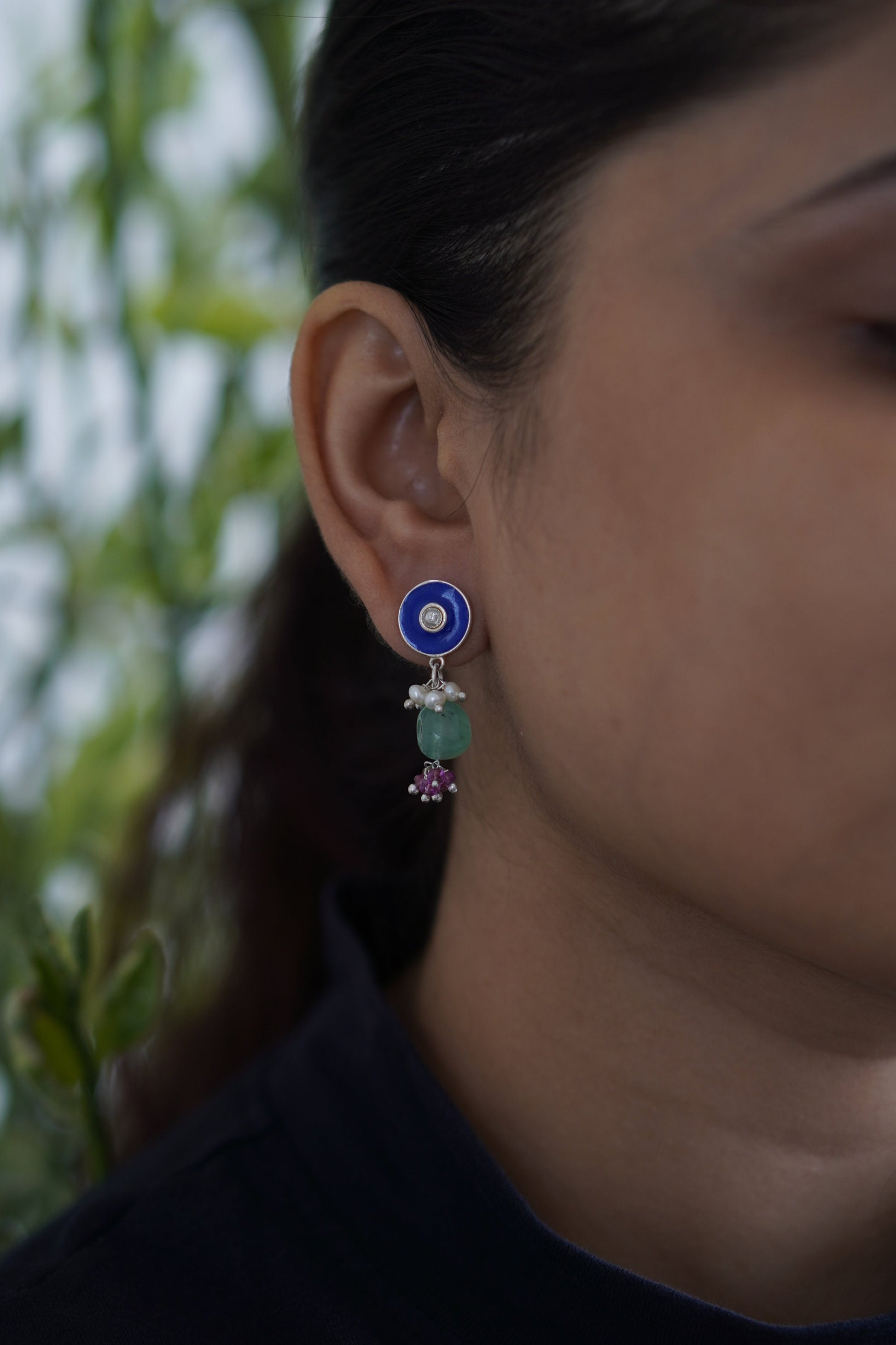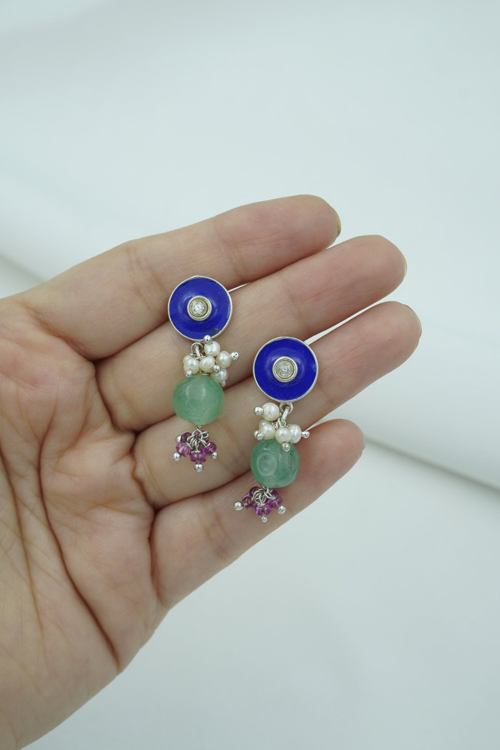 Add a burst of color and culture to your look with Neelpushpa, a stunning pair of enamel stud earrings that flow into clusters of lustrous pearls and gemstone beads. The vivid blue or turquoise enamel top glows with a central sparkle, while the dangling stones and vibrant accents bring movement and charm.