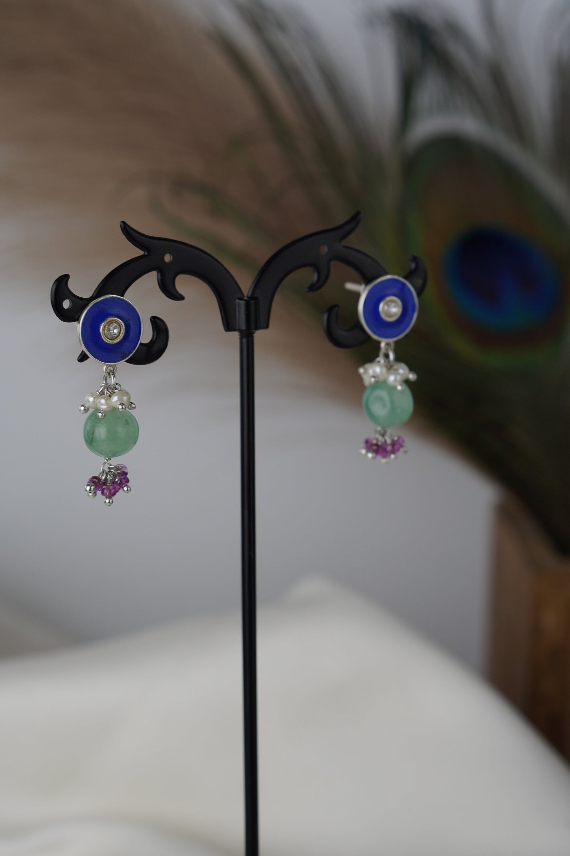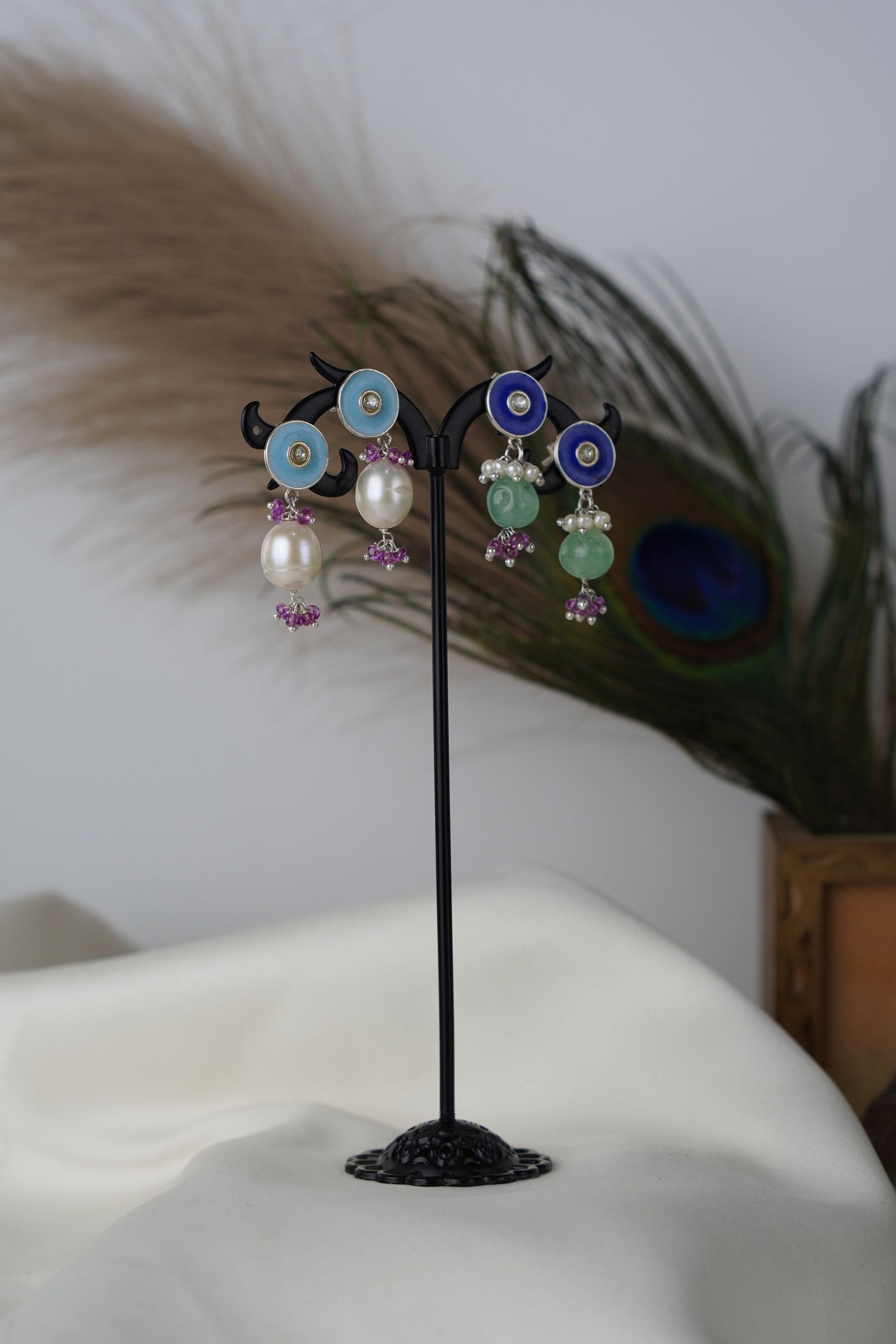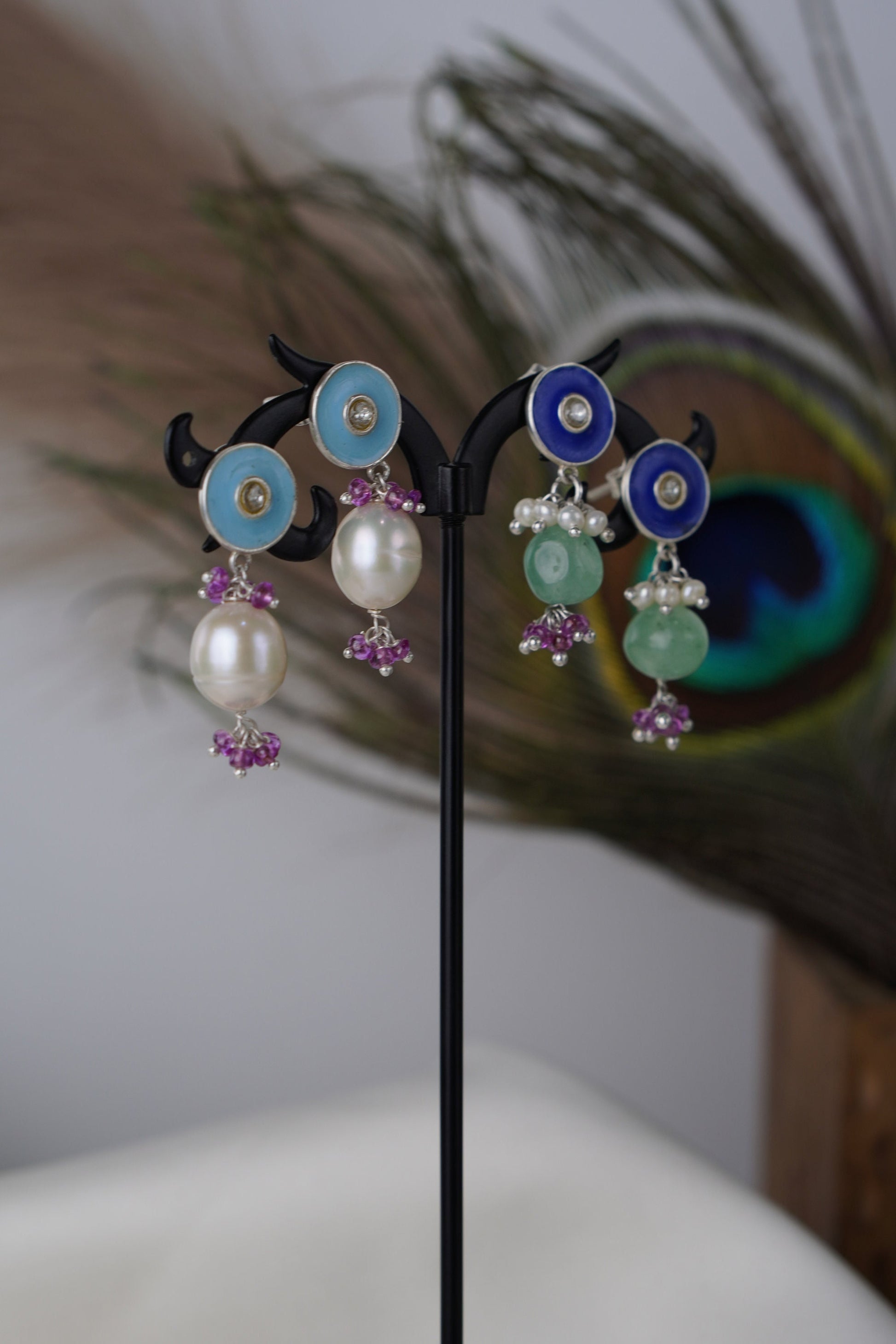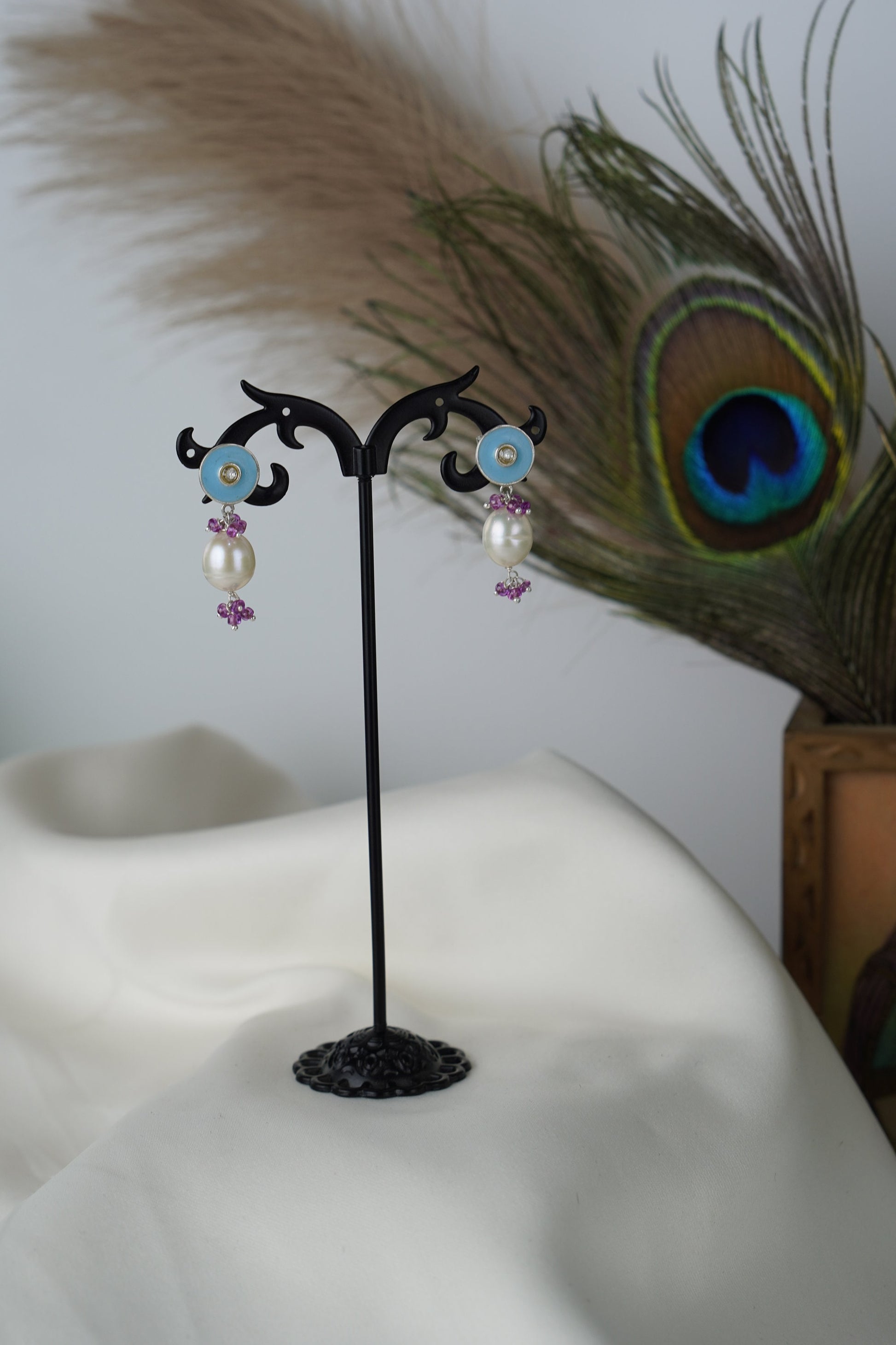 Add a burst of color and culture to your look with Neelpushpa, a stunning pair of enamel stud earrings that flow into clusters of lustrous pearls and gemstone beads. The vivid blue or turquoise enamel top glows with a central sparkle, while the dangling stones and vibrant accents bring movement and charm.