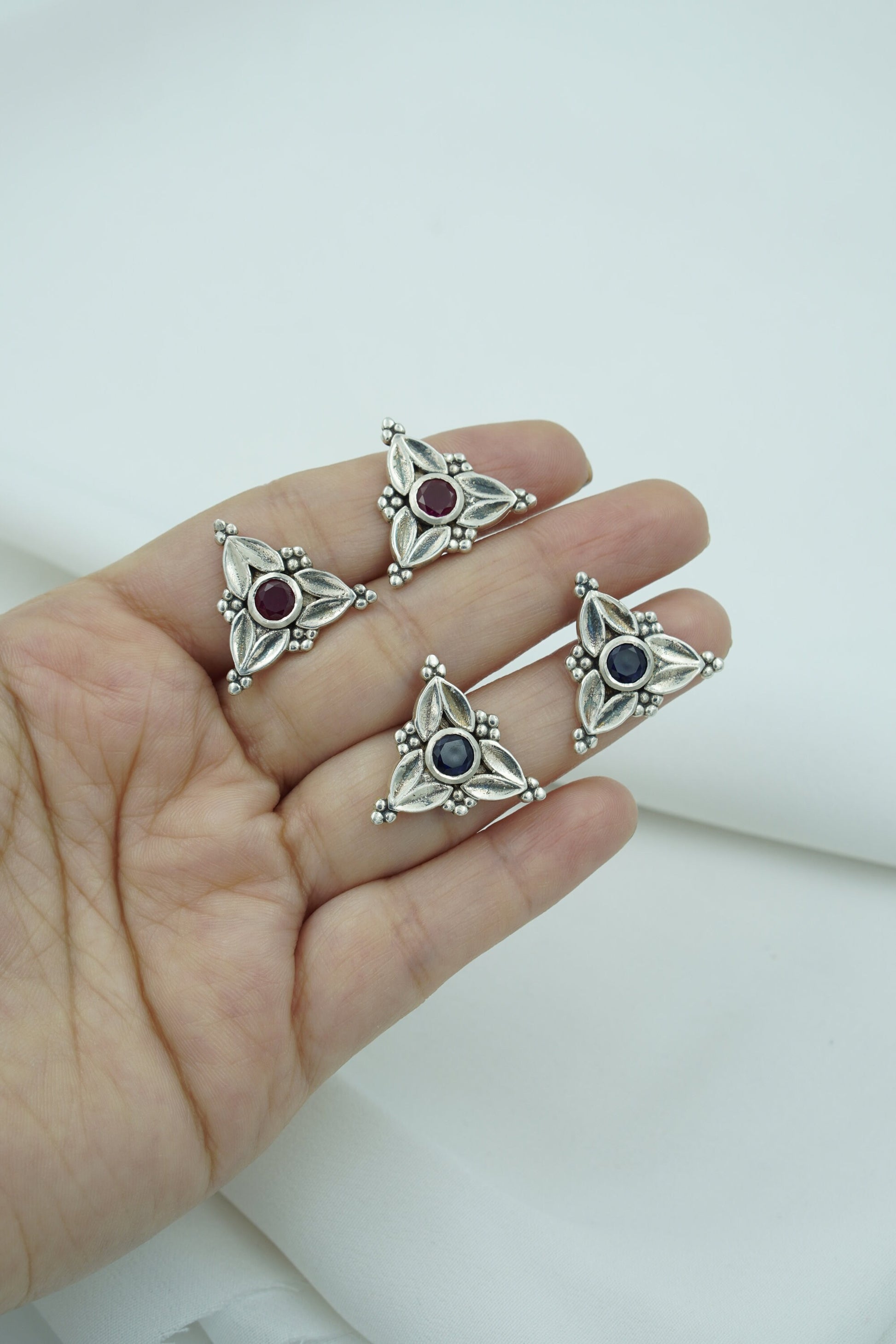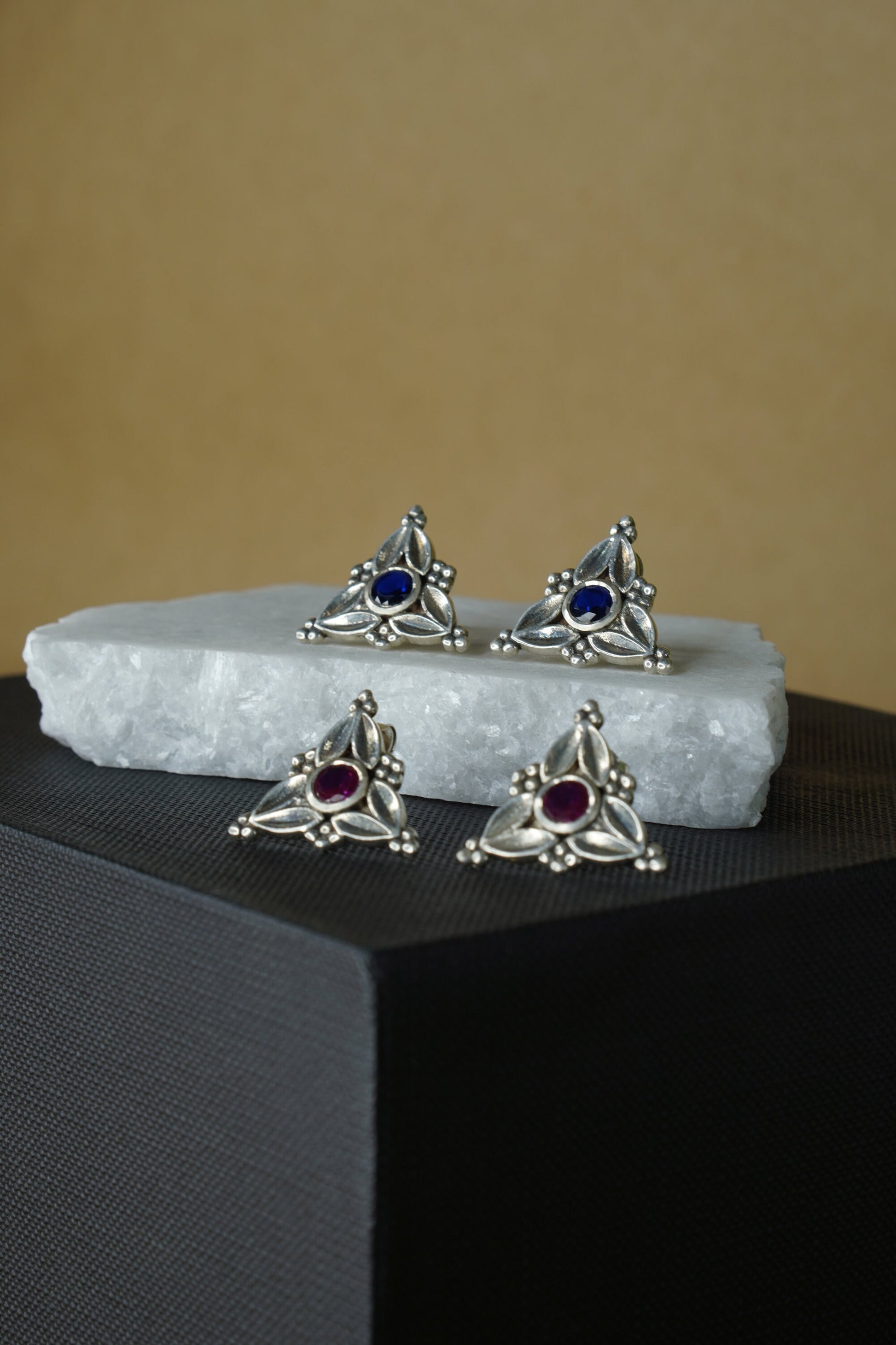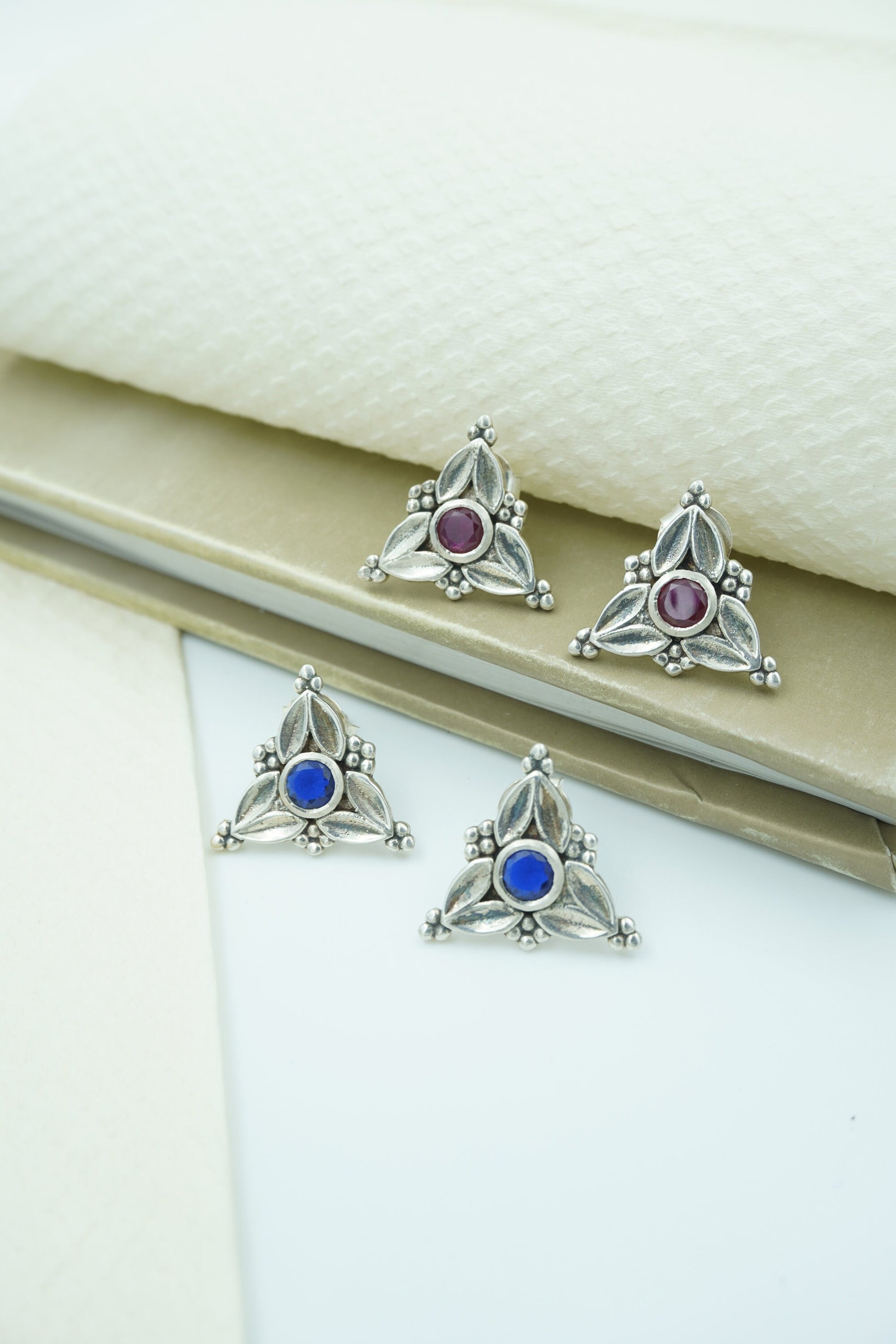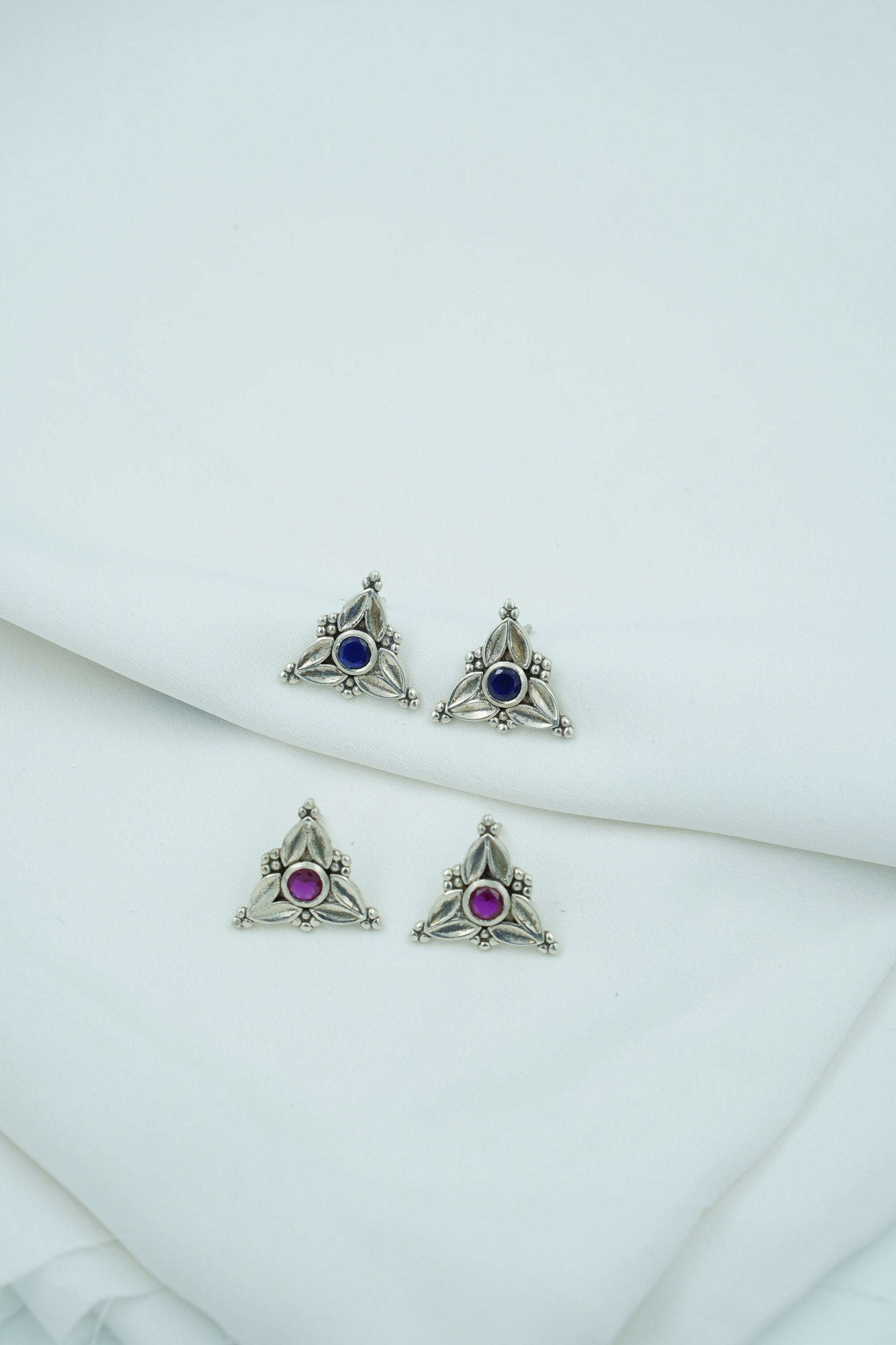 Elevate your everyday elegance with Trisha, a stunning fusion of heritage-inspired design and contemporary flair. These triangle earrings feature a striking arrangement of red, blue, black, and white hues set in antique-finished silver. Compact yet bold, the Trisha Studs bring effortless charm and a pop of color to any outfit, be it ethnic or Indo-western.