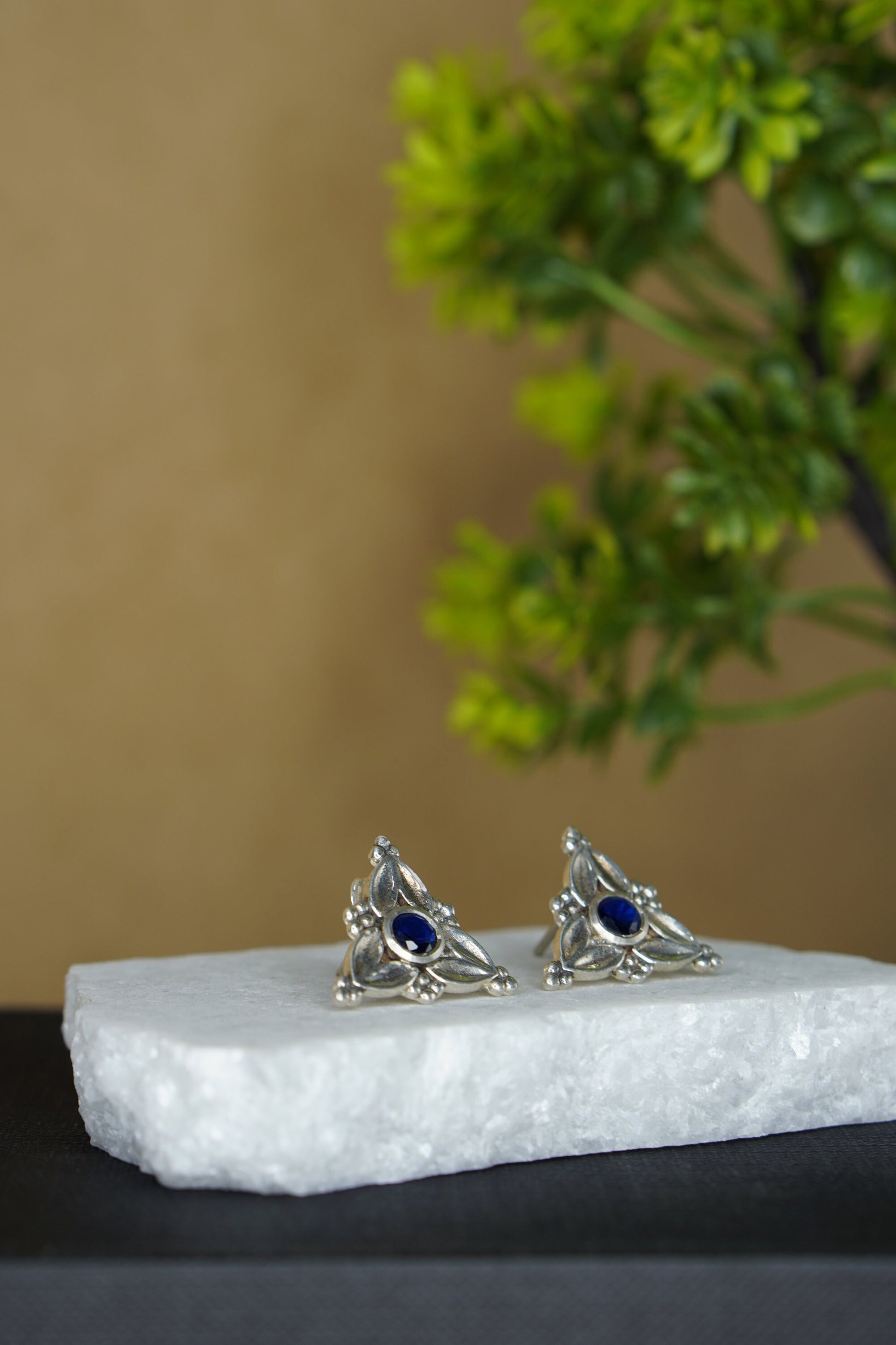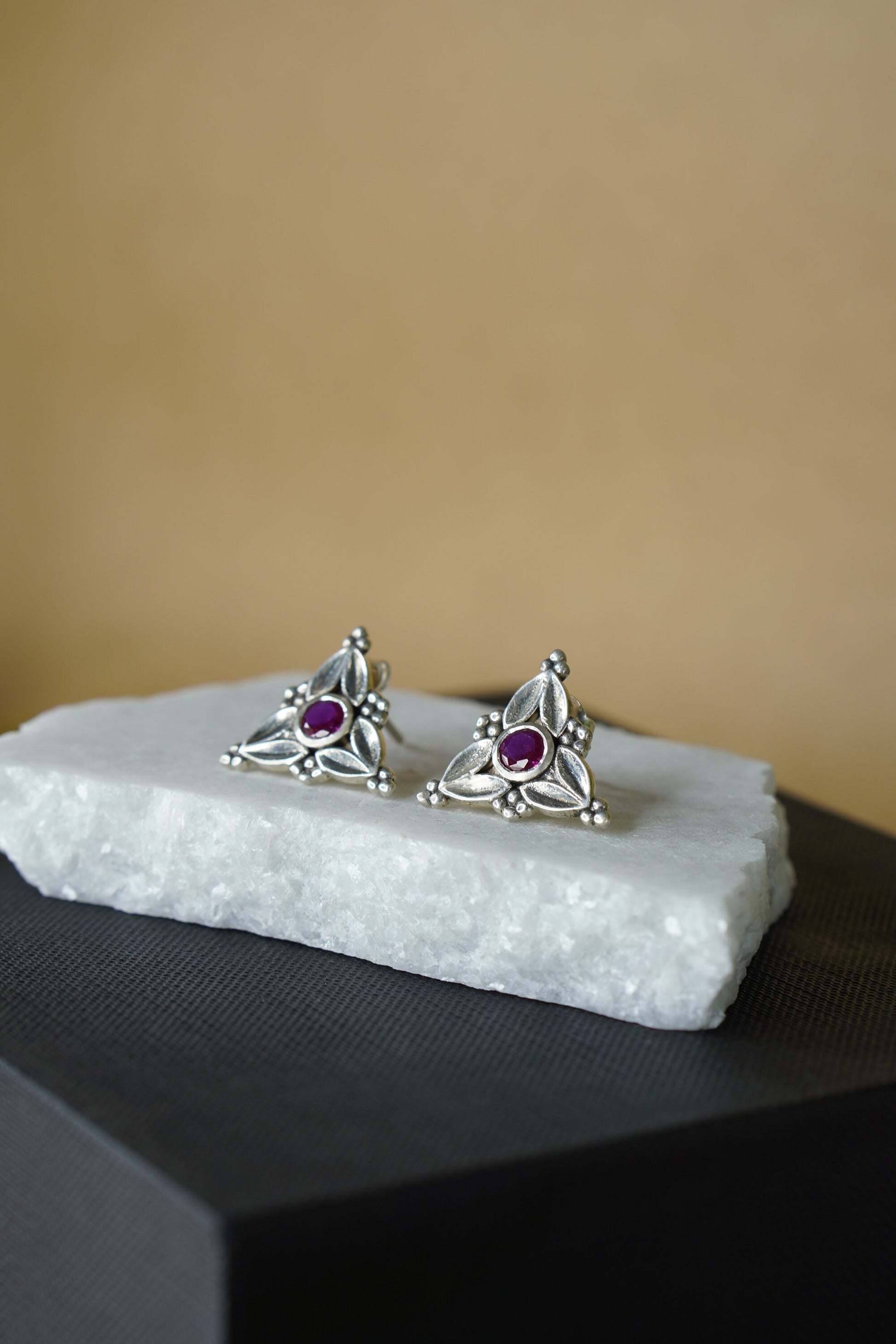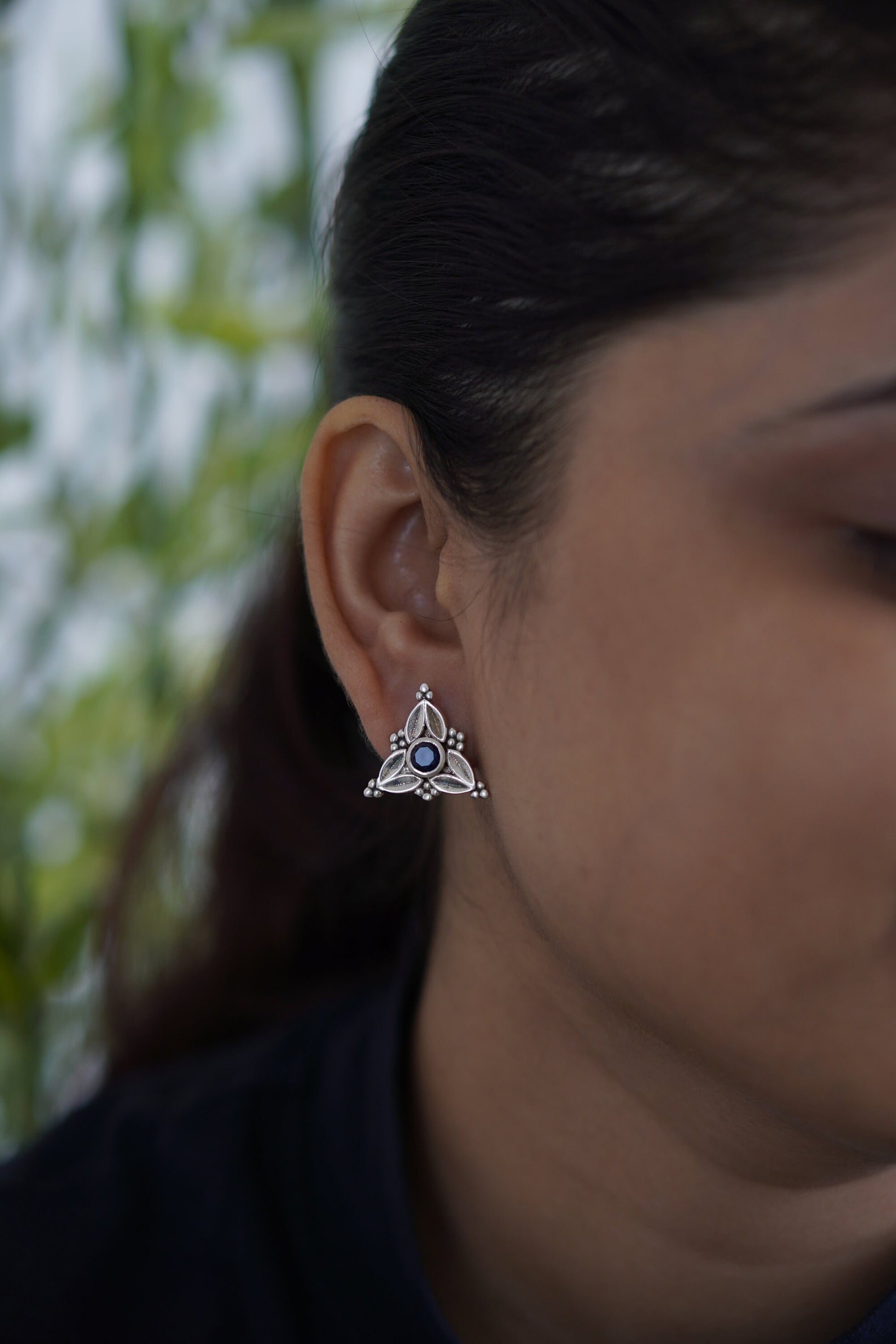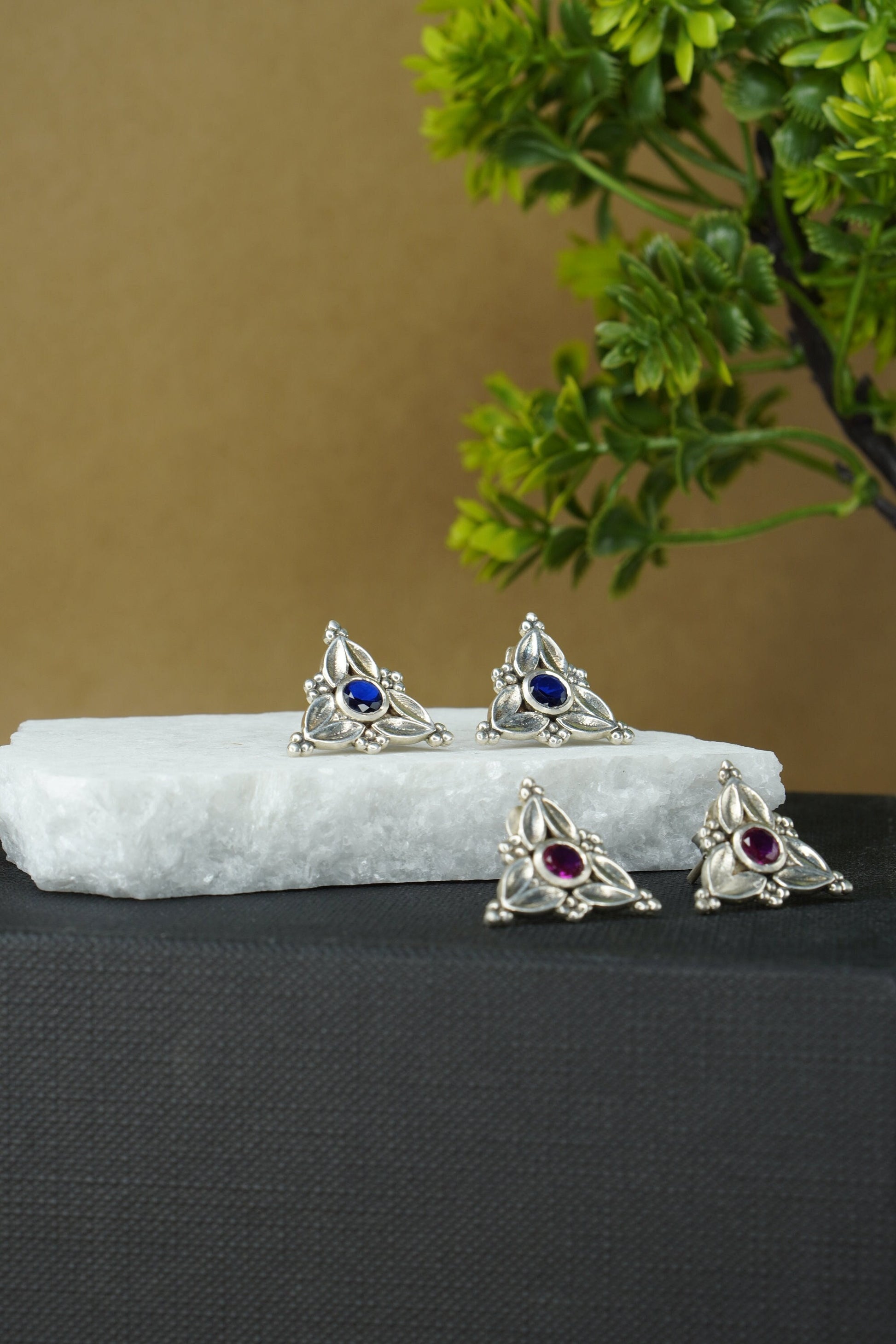 Elevate your everyday elegance with Trisha, a stunning fusion of heritage-inspired design and contemporary flair. These triangle earrings feature a striking arrangement of red, blue, black, and white hues set in antique-finished silver. Compact yet bold, the Trisha Studs bring effortless charm and a pop of color to any outfit, be it ethnic or Indo-western.