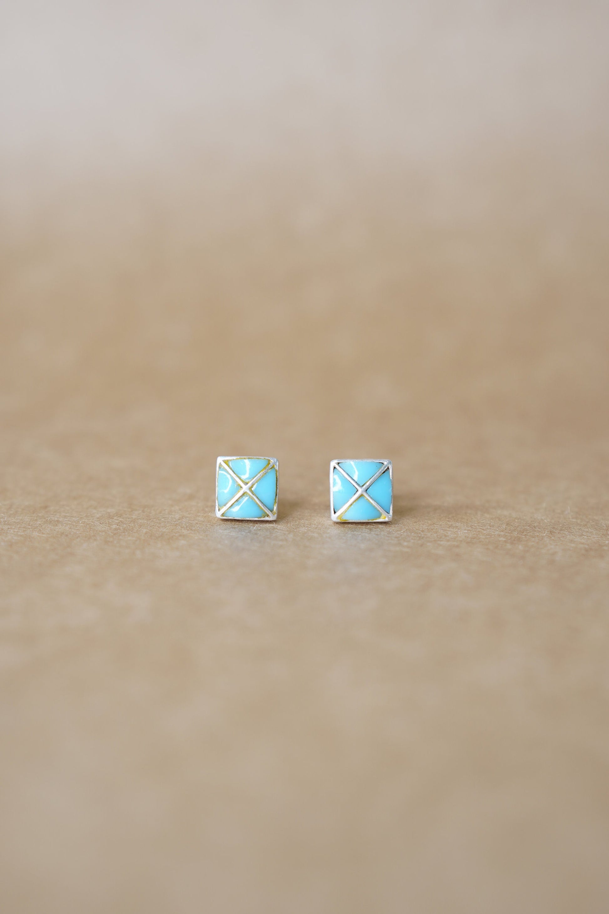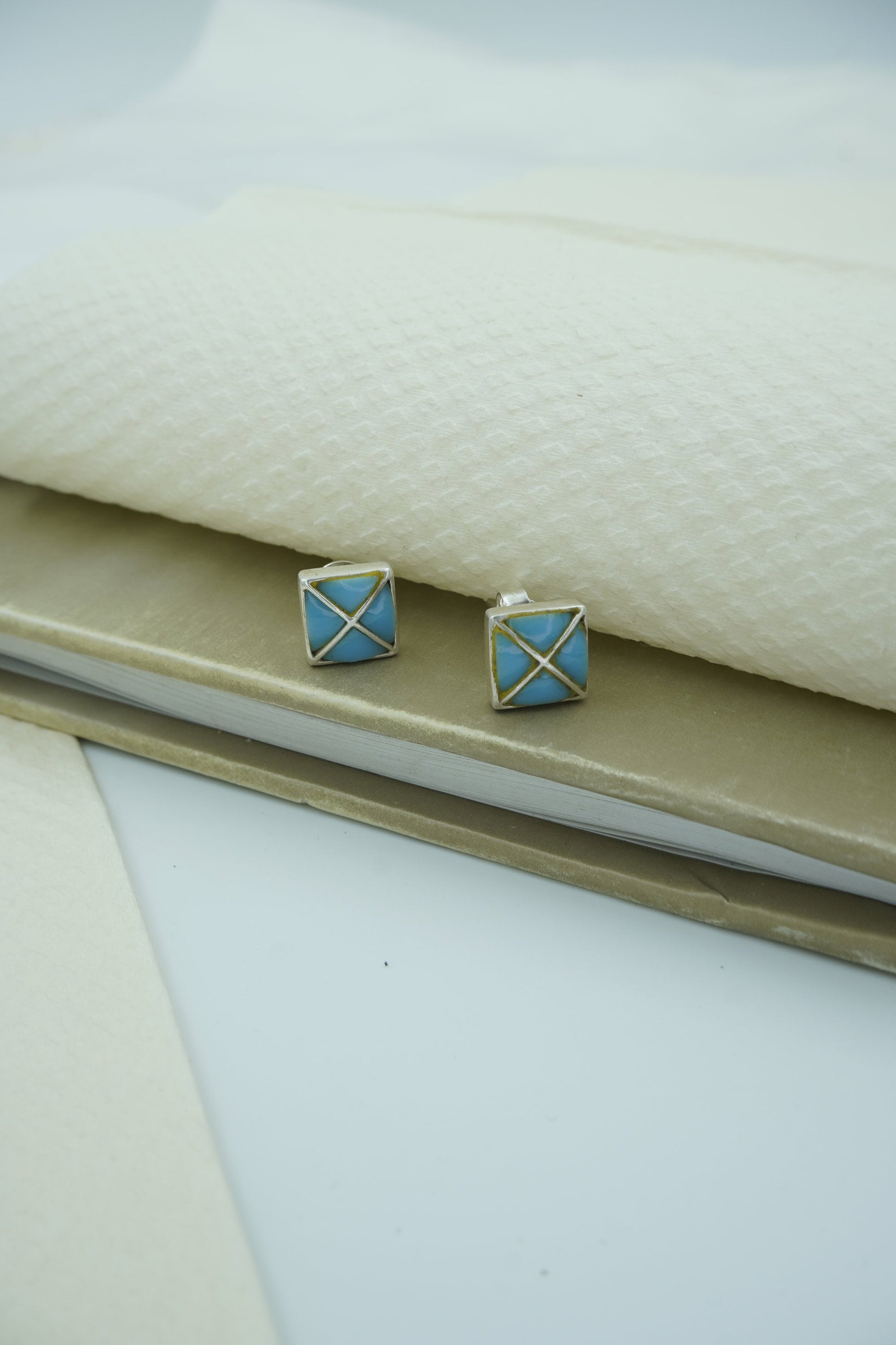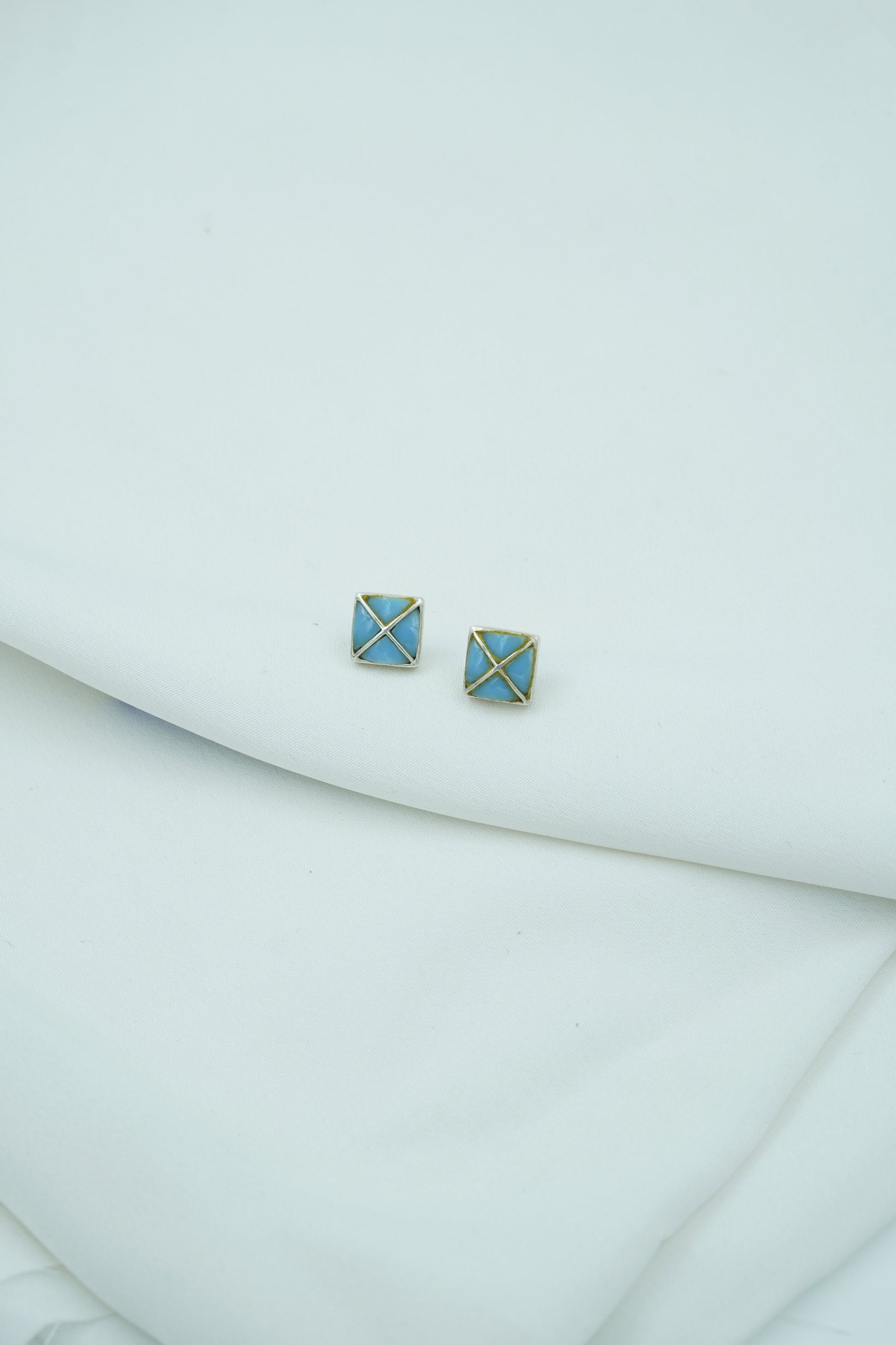 Let your style take flight with AVI, a minimalist pair of square stud earrings inspired by the serenity of open skies. Crafted with sky-blue enamel and sleek gold-toned crisscross lines, these earrings are as light and uplifting as a breath of fresh air. Compact in size yet striking in design, AVI is a celebration of clarity, balance, and subtle power.