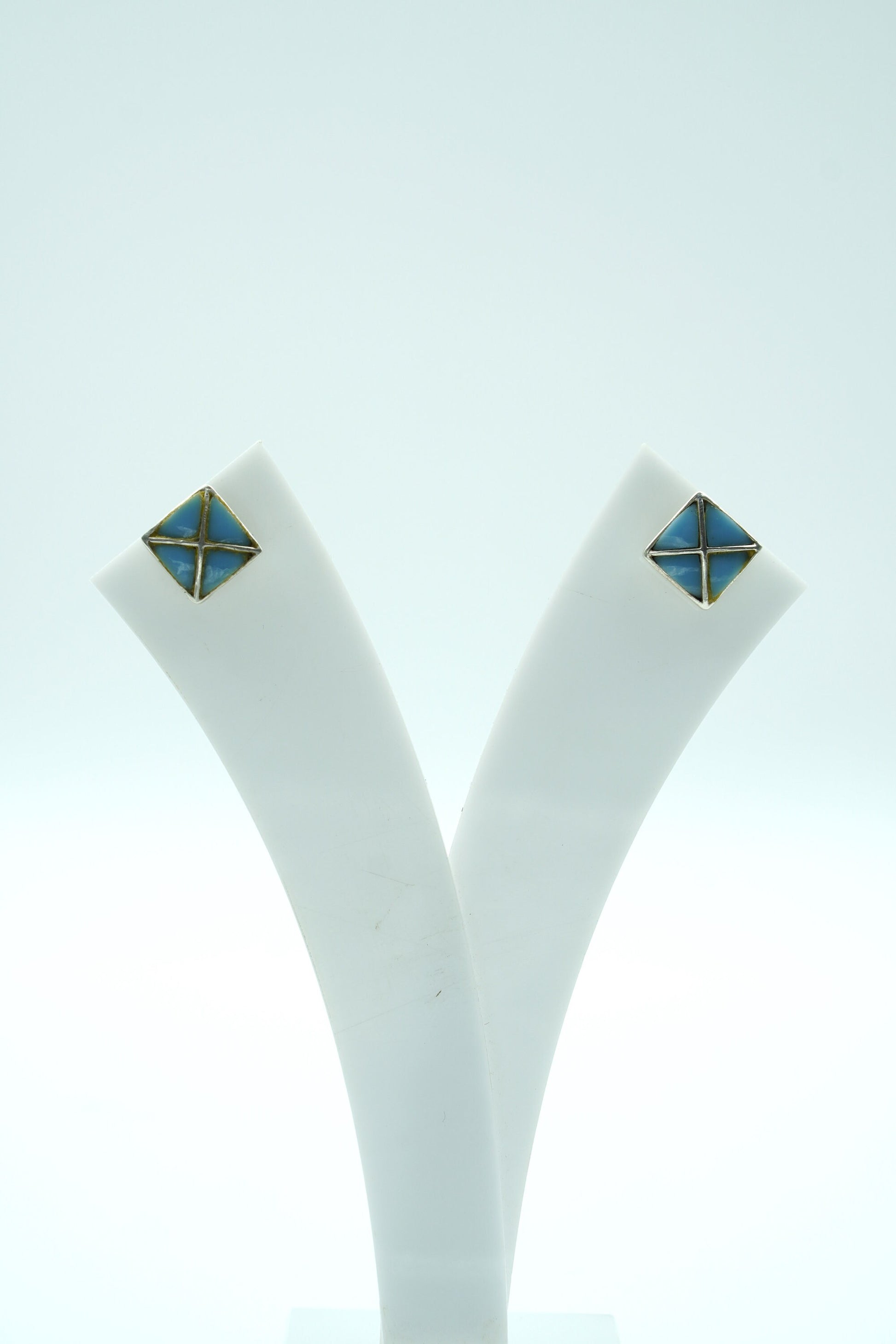 Design: Square stud with geometric cross-line detail.