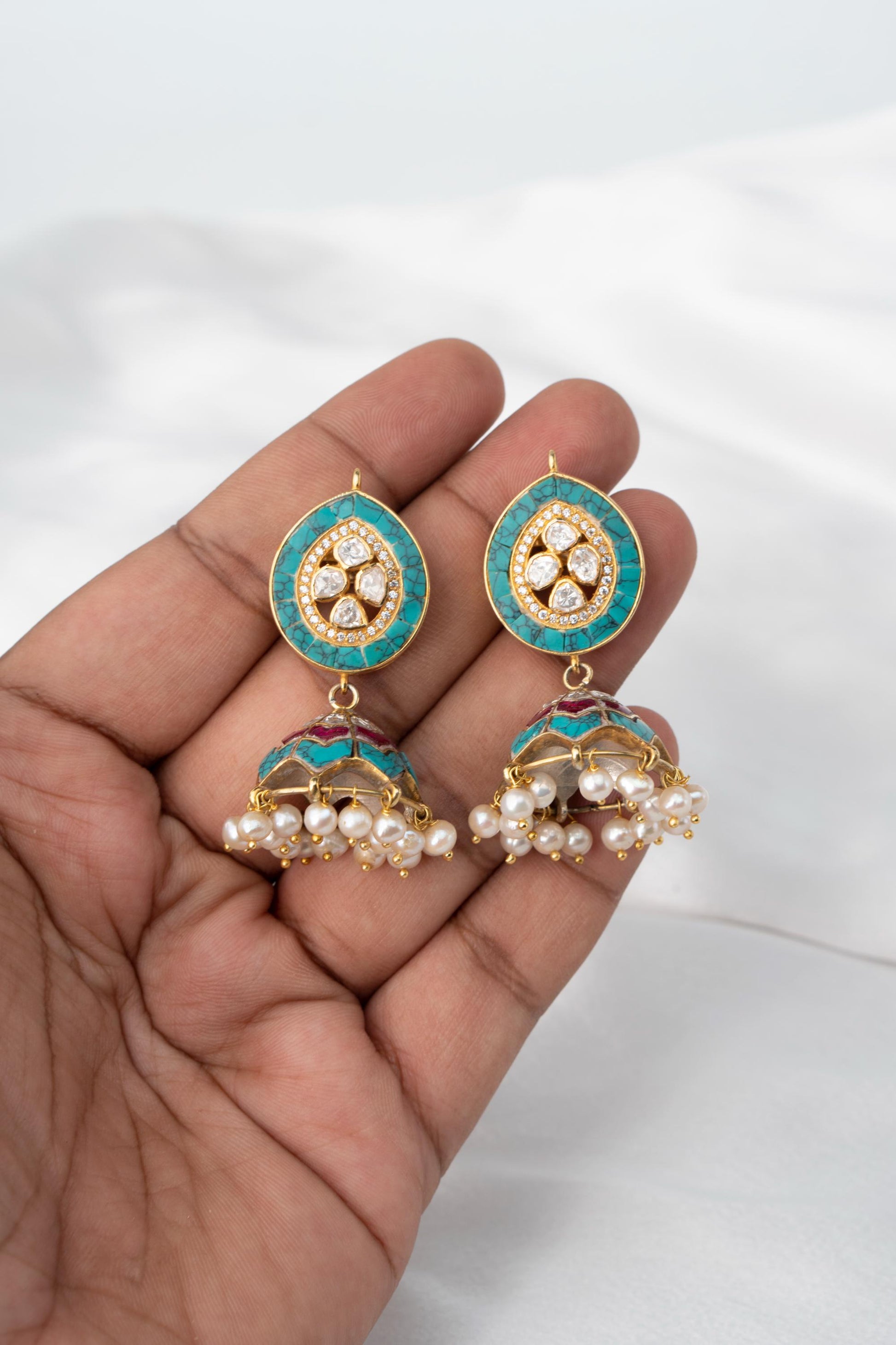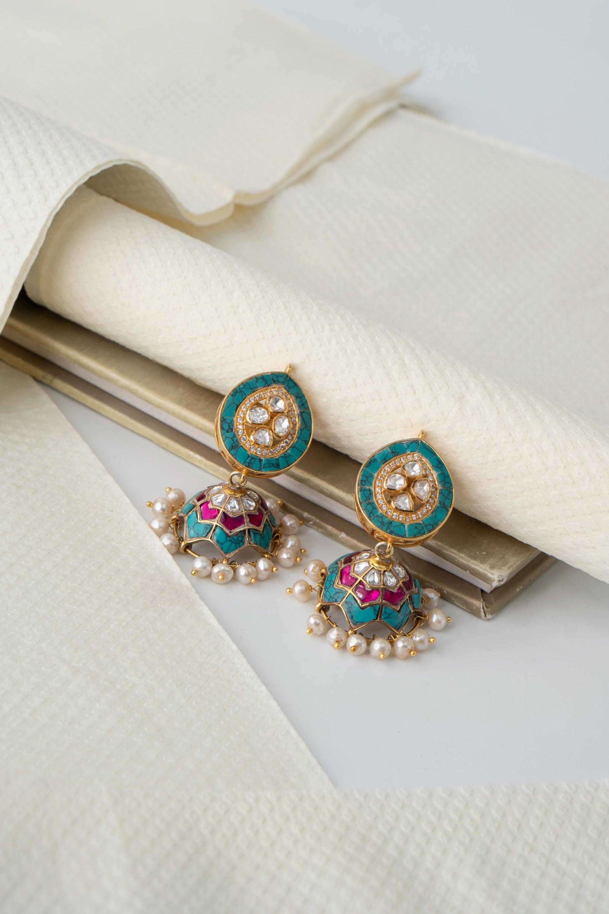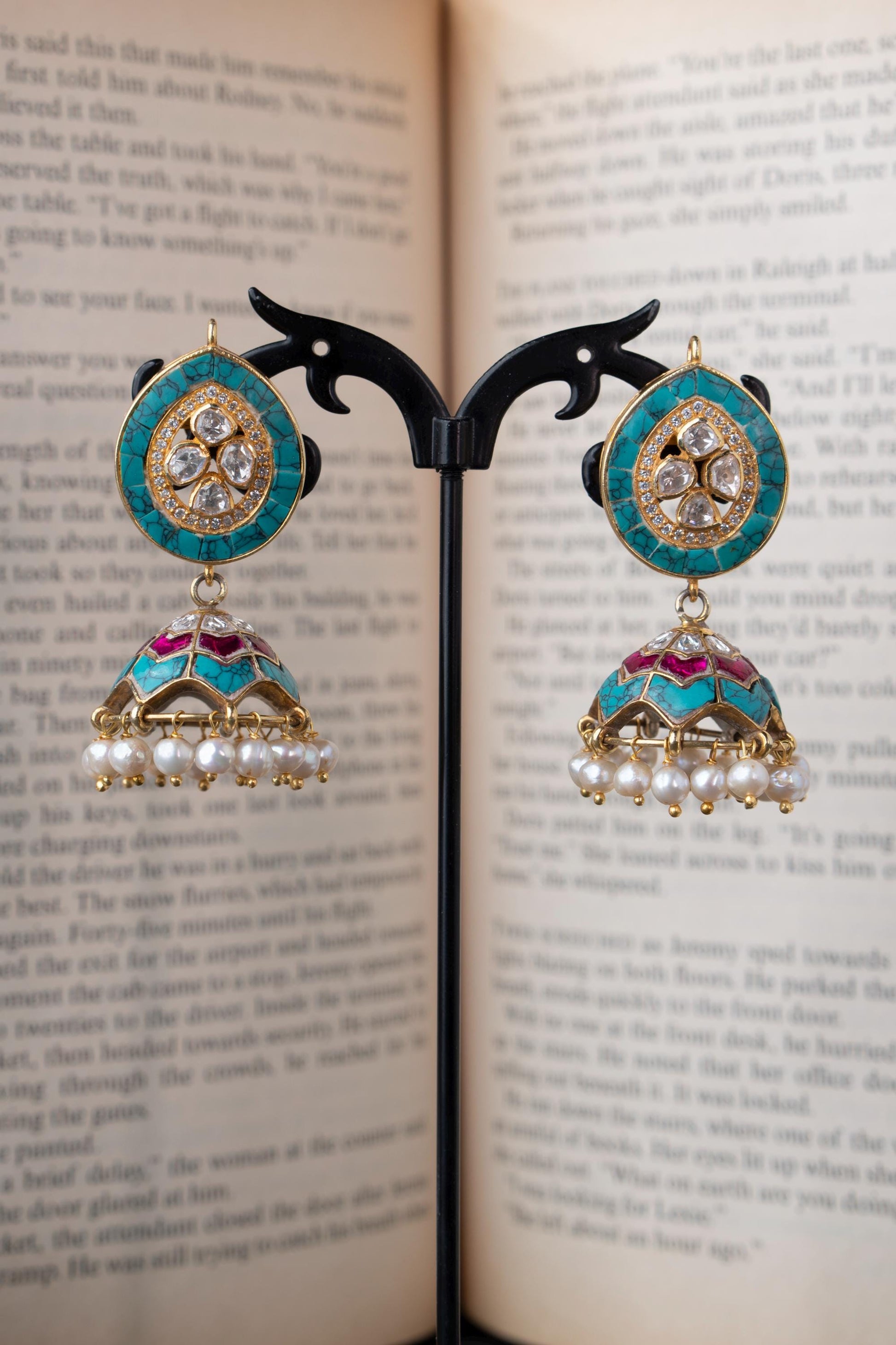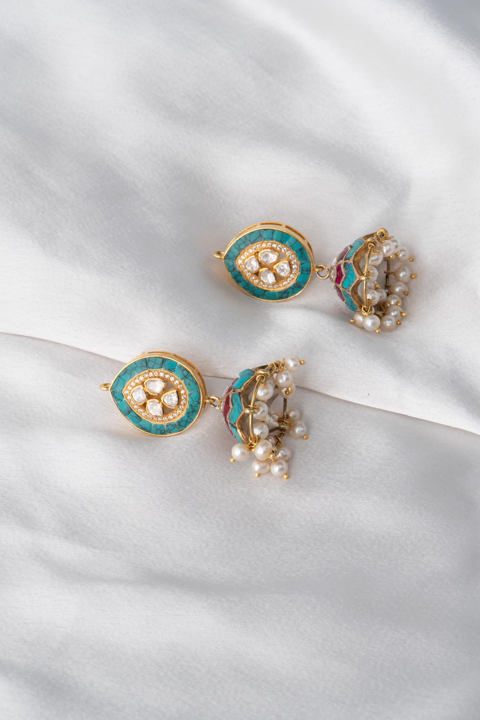 Inspired by the calm and grace of an Indian evening, Saanjh is a captivating pair of handcrafted jhumkas featuring rich turquoise stones, delicate polki stones, and a cascade of ivory pearls. The vibrant color combination of blue, gold, and hints of ruby reflects the mesmerizing palette of dusk skies.