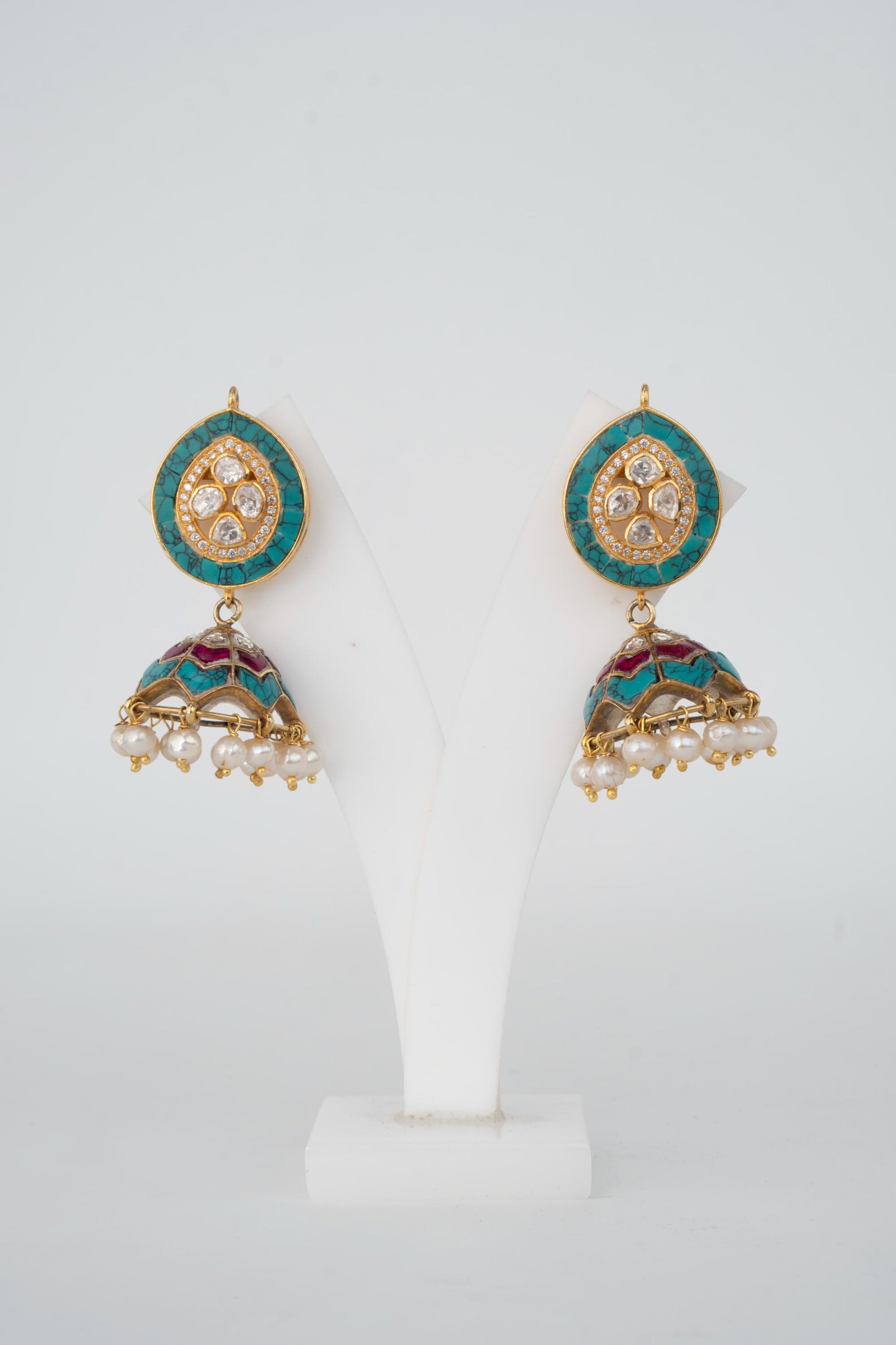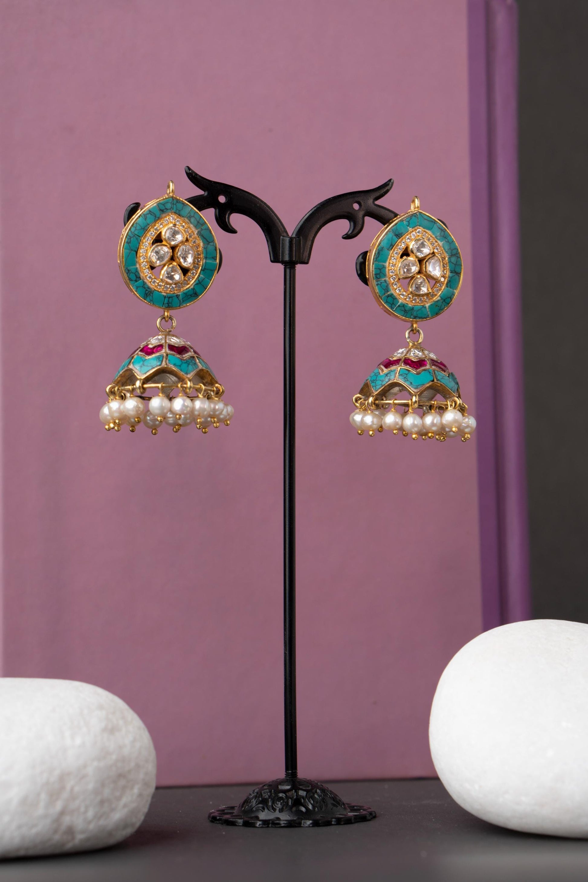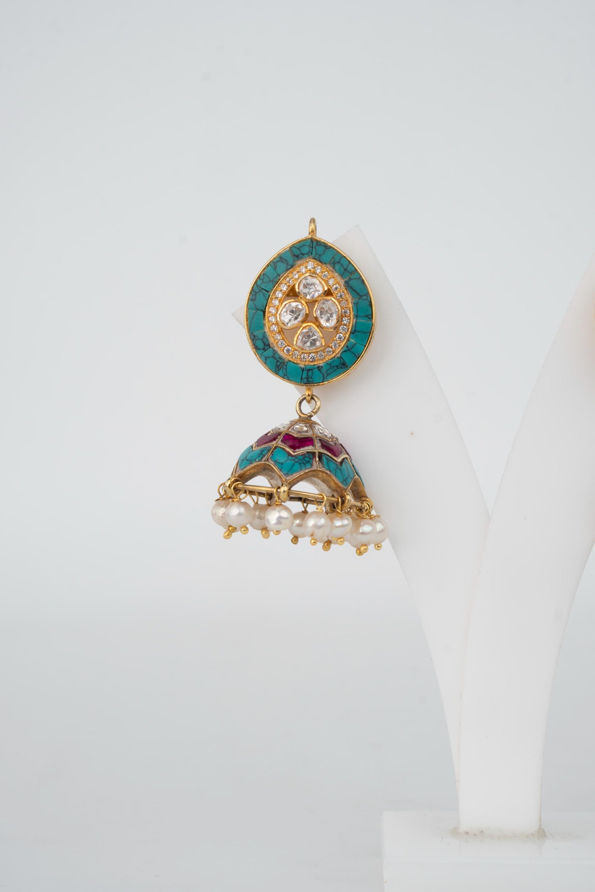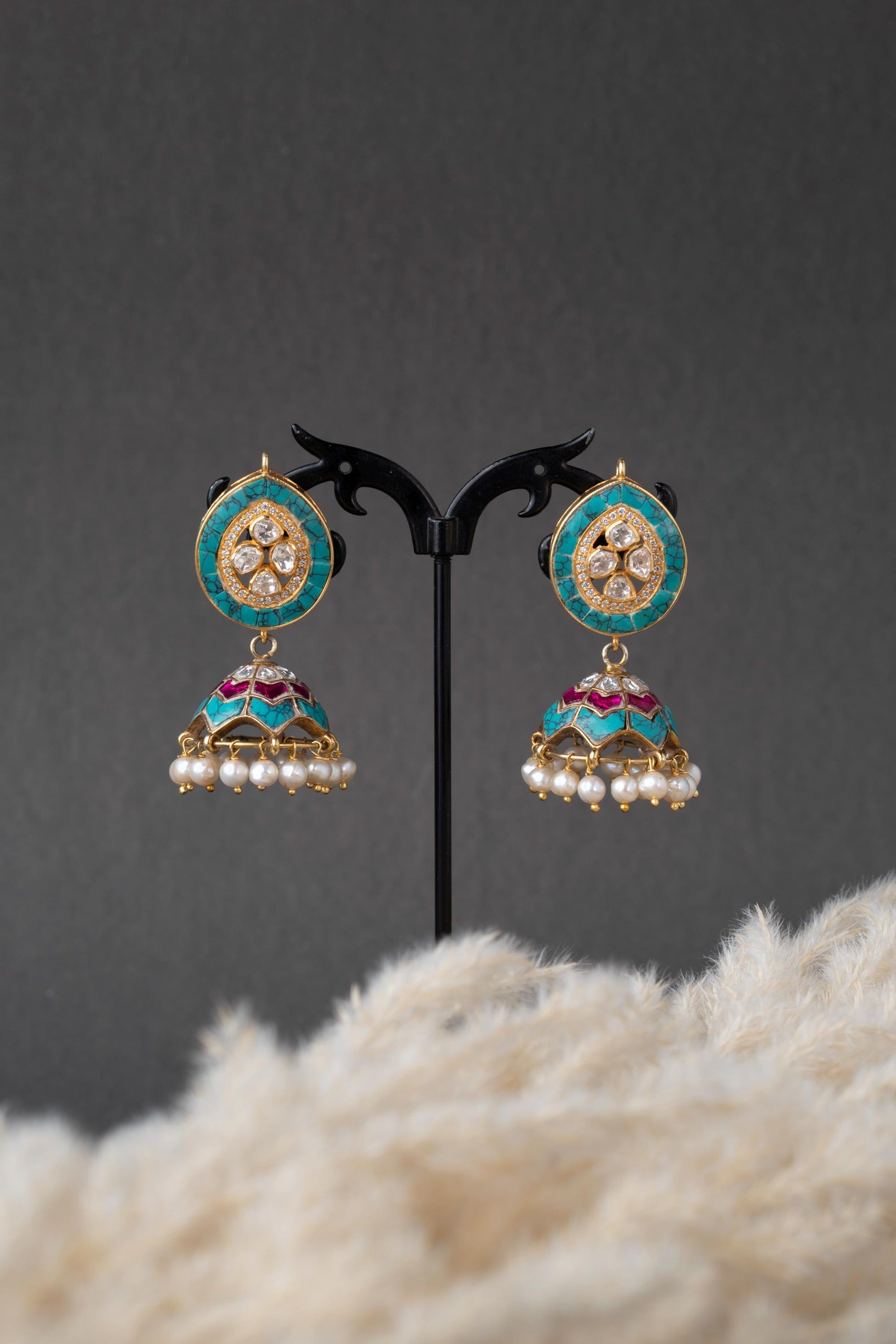 Inspired by the calm and grace of an Indian evening, Saanjh is a captivating pair of handcrafted jhumkas featuring rich turquoise stones, delicate polki stones, and a cascade of ivory pearls. The vibrant color combination of blue, gold, and hints of ruby reflects the mesmerizing palette of dusk skies.